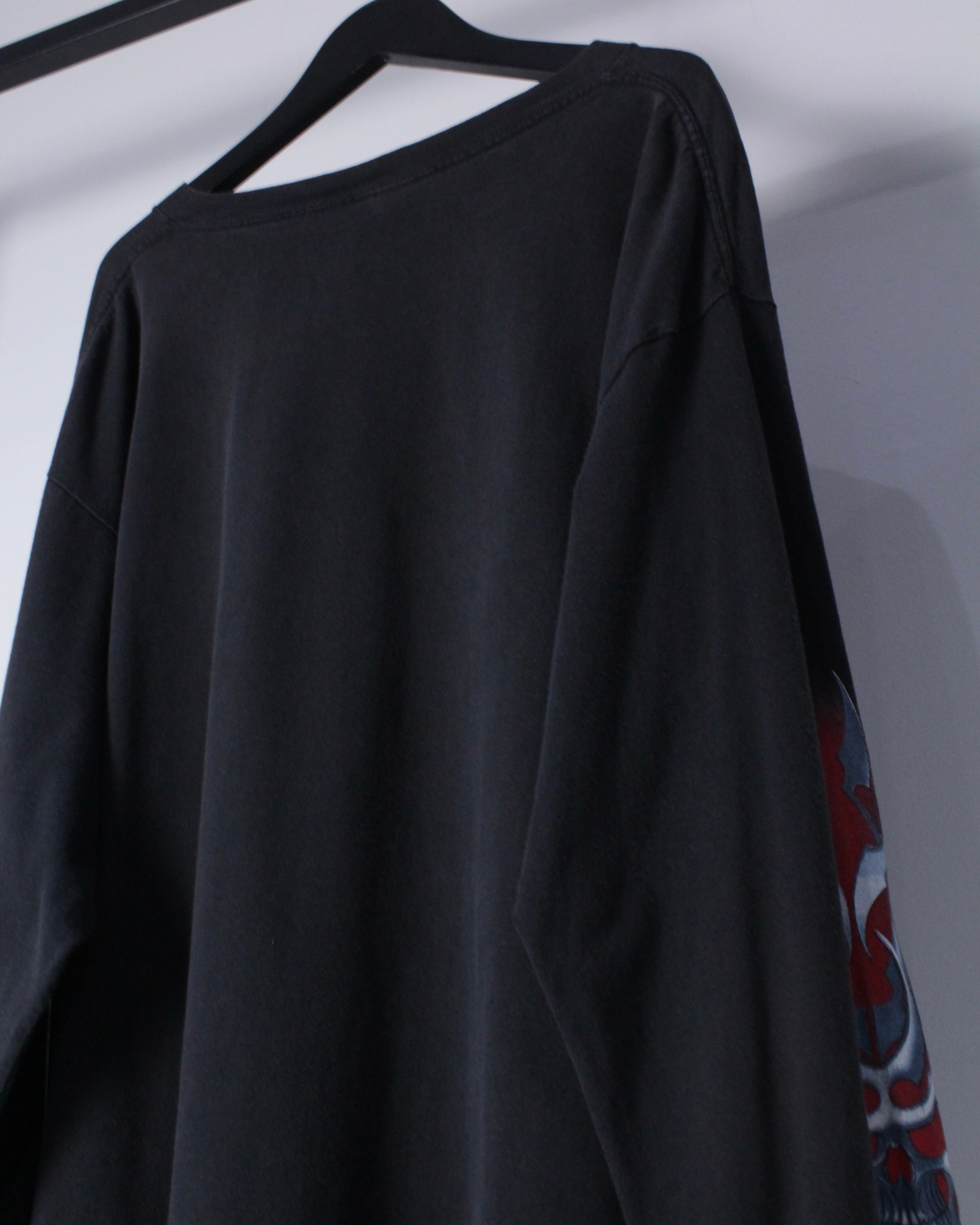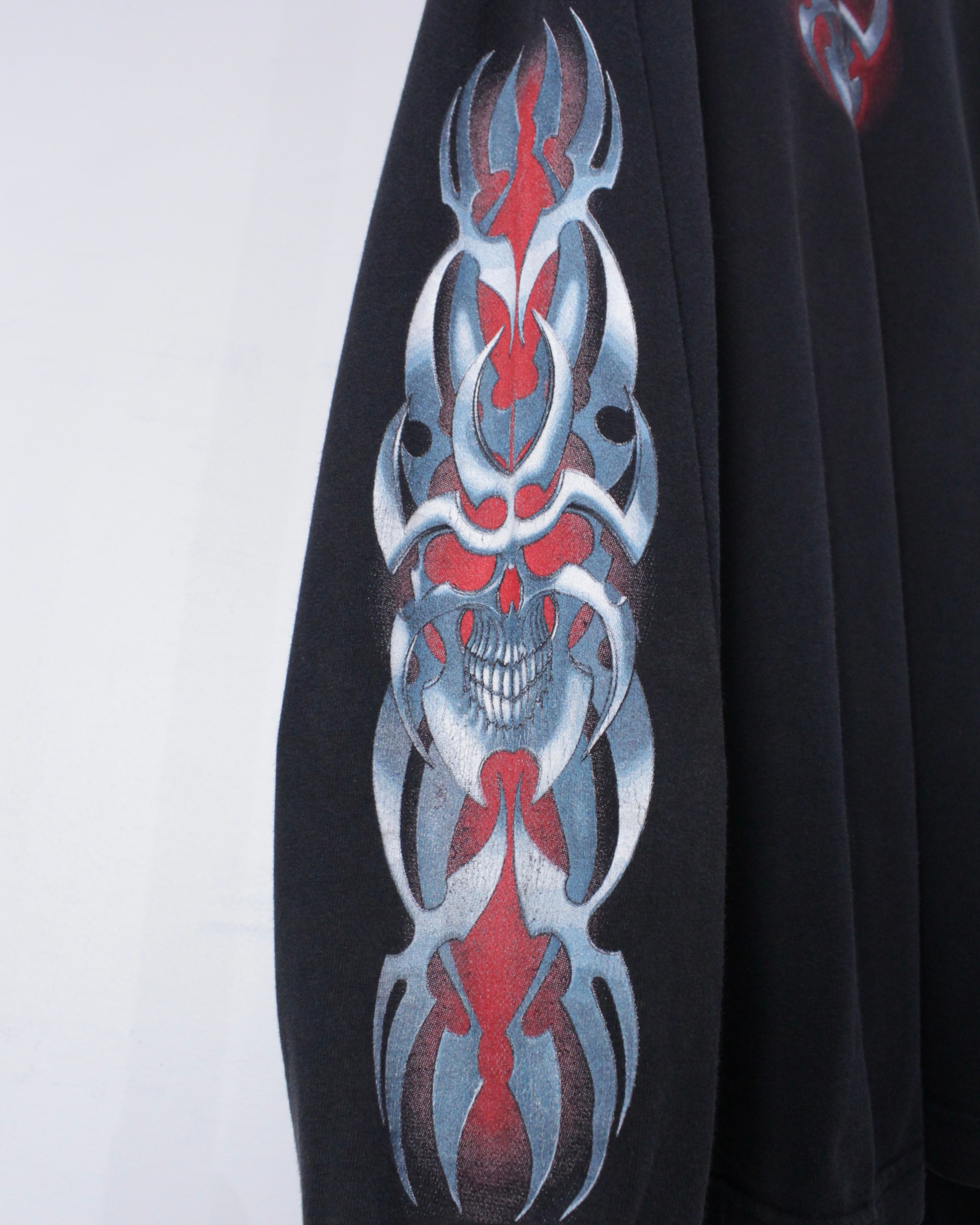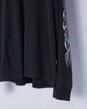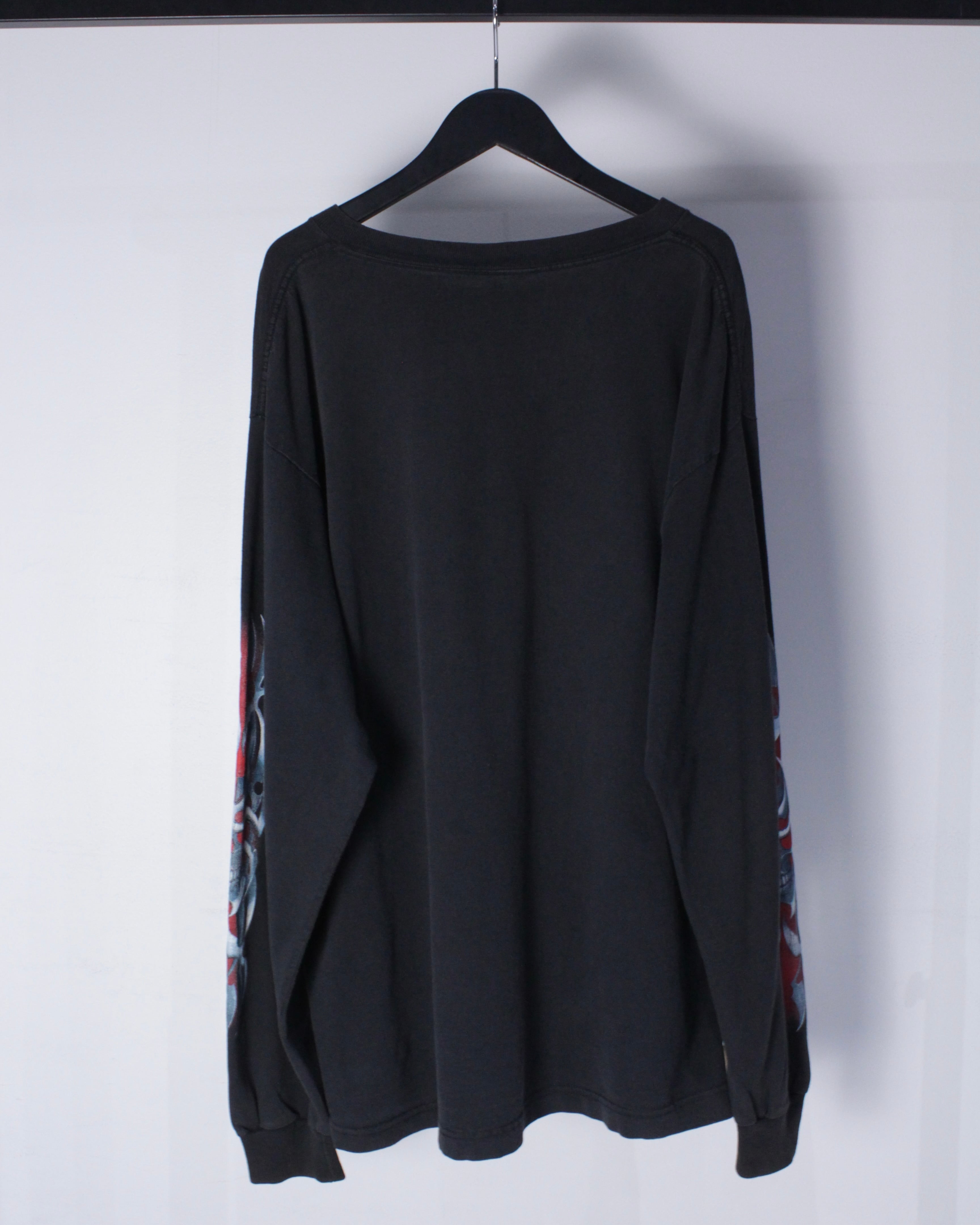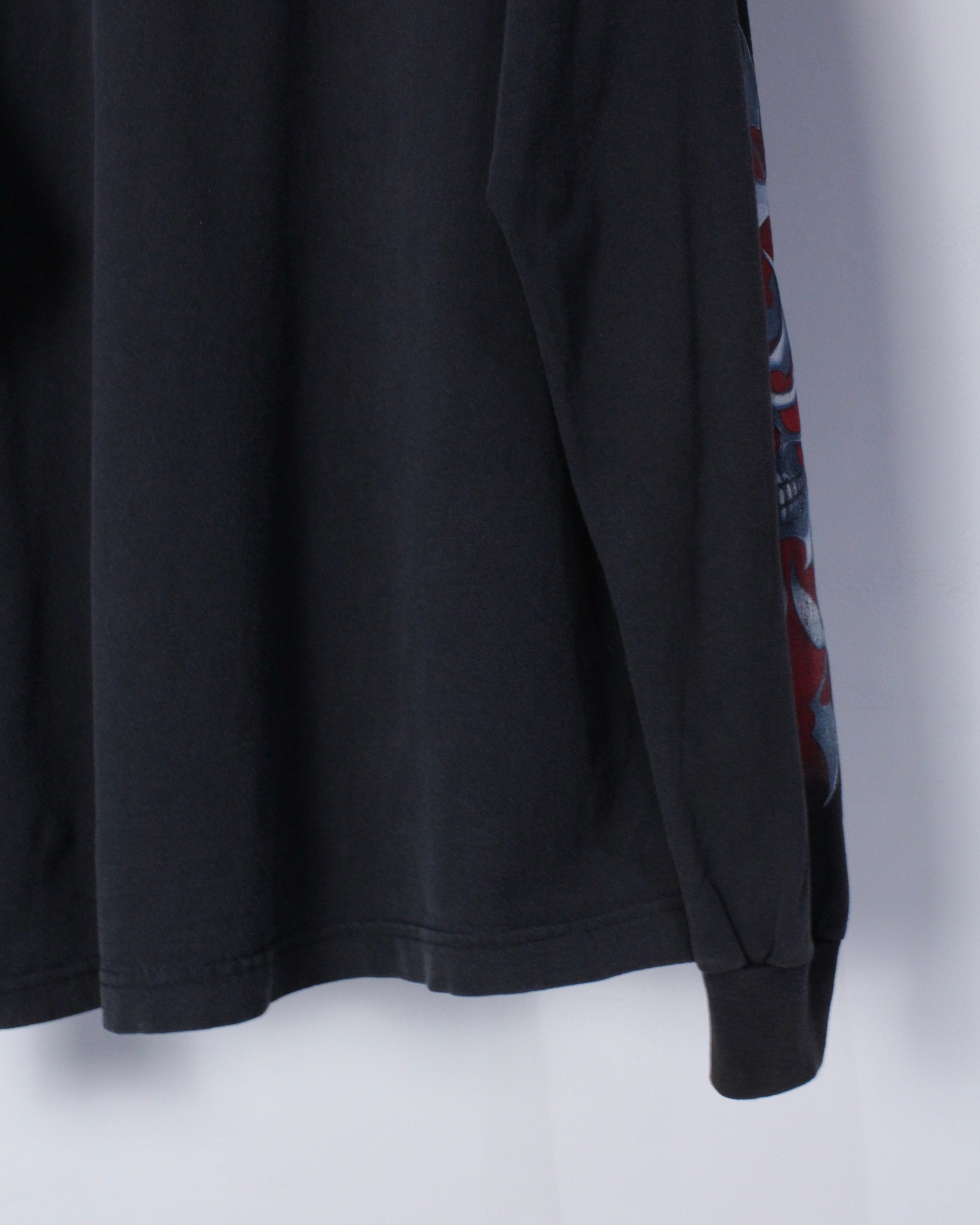フェードブラックのボディに、フロント、アームにトライバルなスカル風のデザインをプリントで載せたロンT。