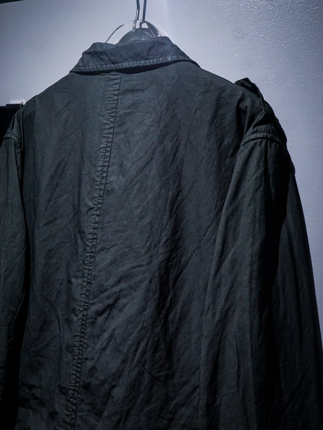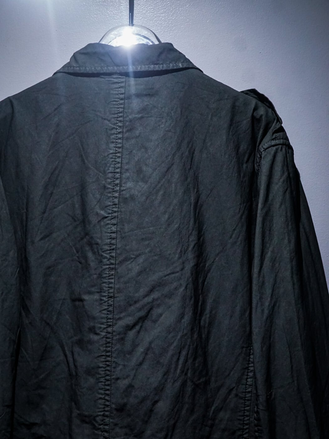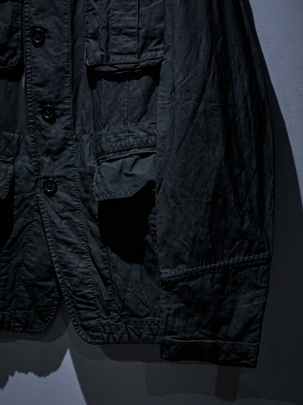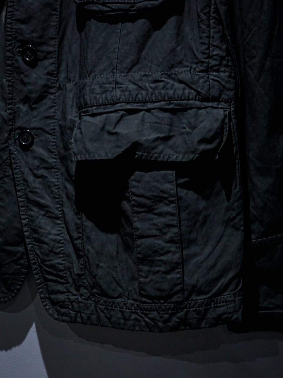 コーティング加工が施された独特な表情を見せる生地をボディに使用し、マルチなポケットデザインを施した1着。