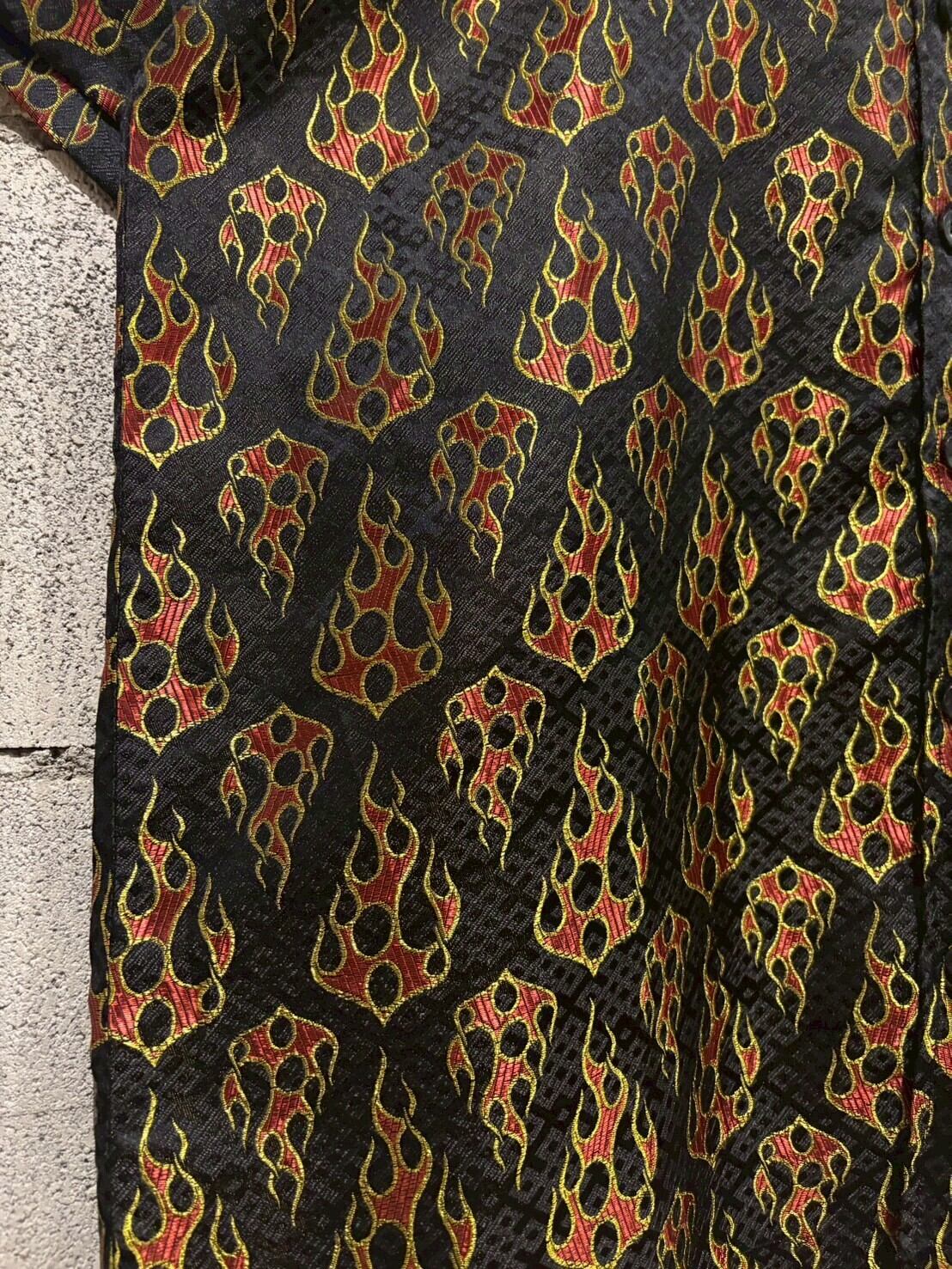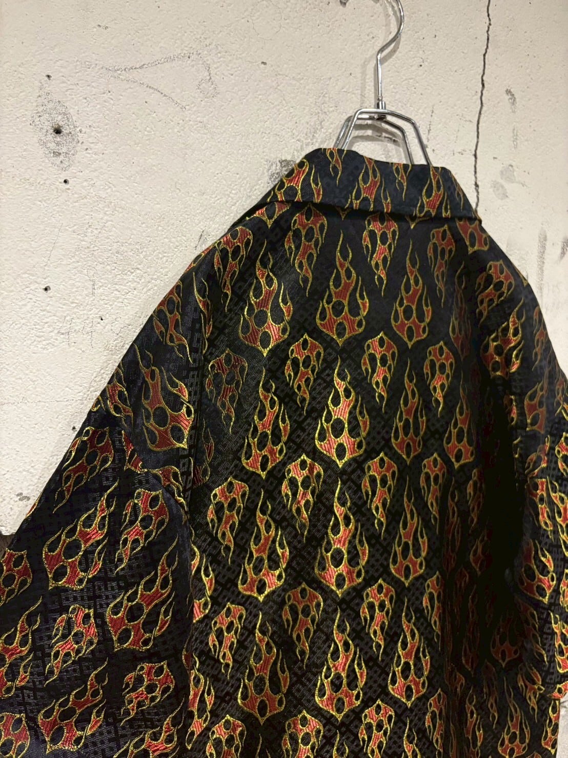 深みのあるブラックのボディに、メタリックな光沢を放つ糸で炎が表現され、存在感を抜群に放つ1着に。