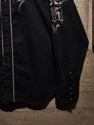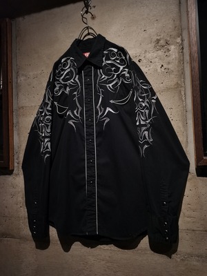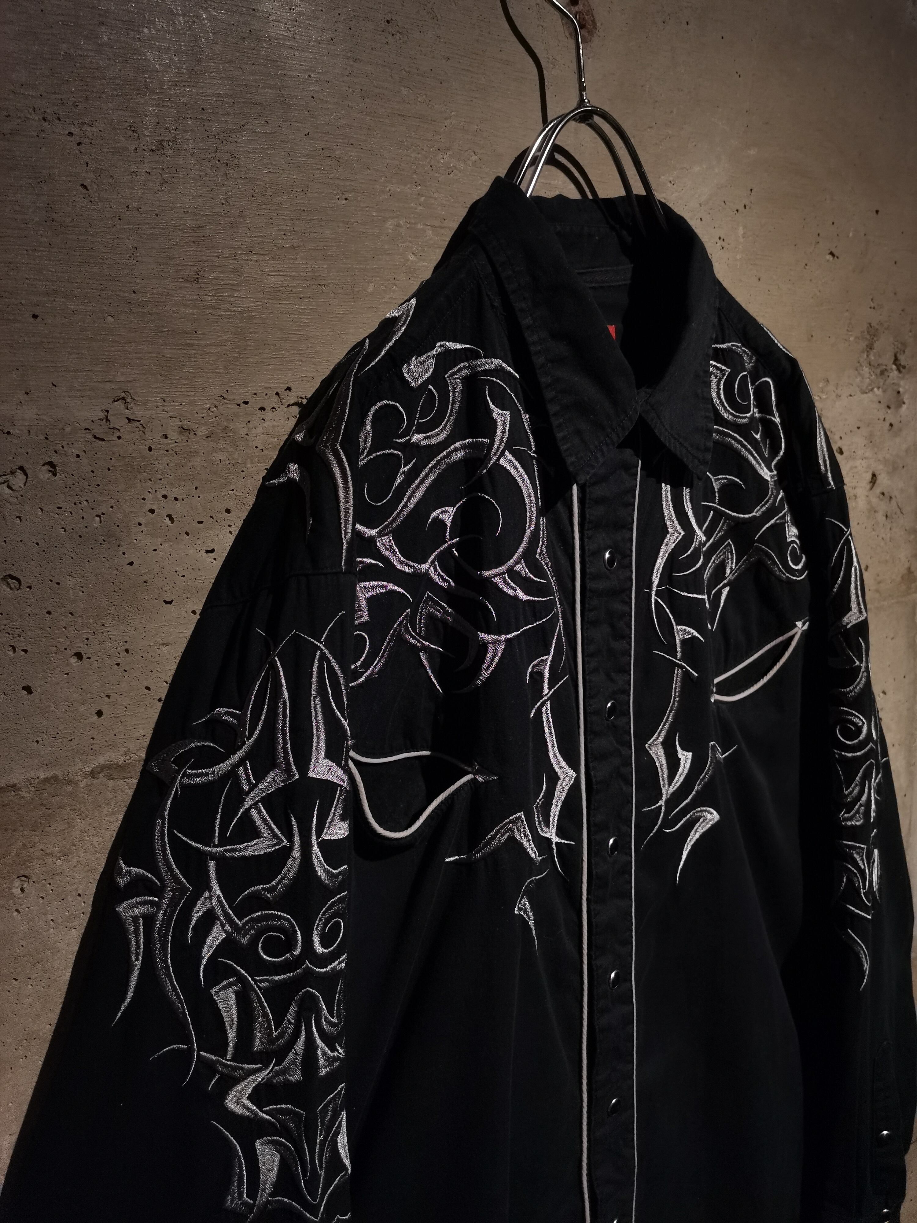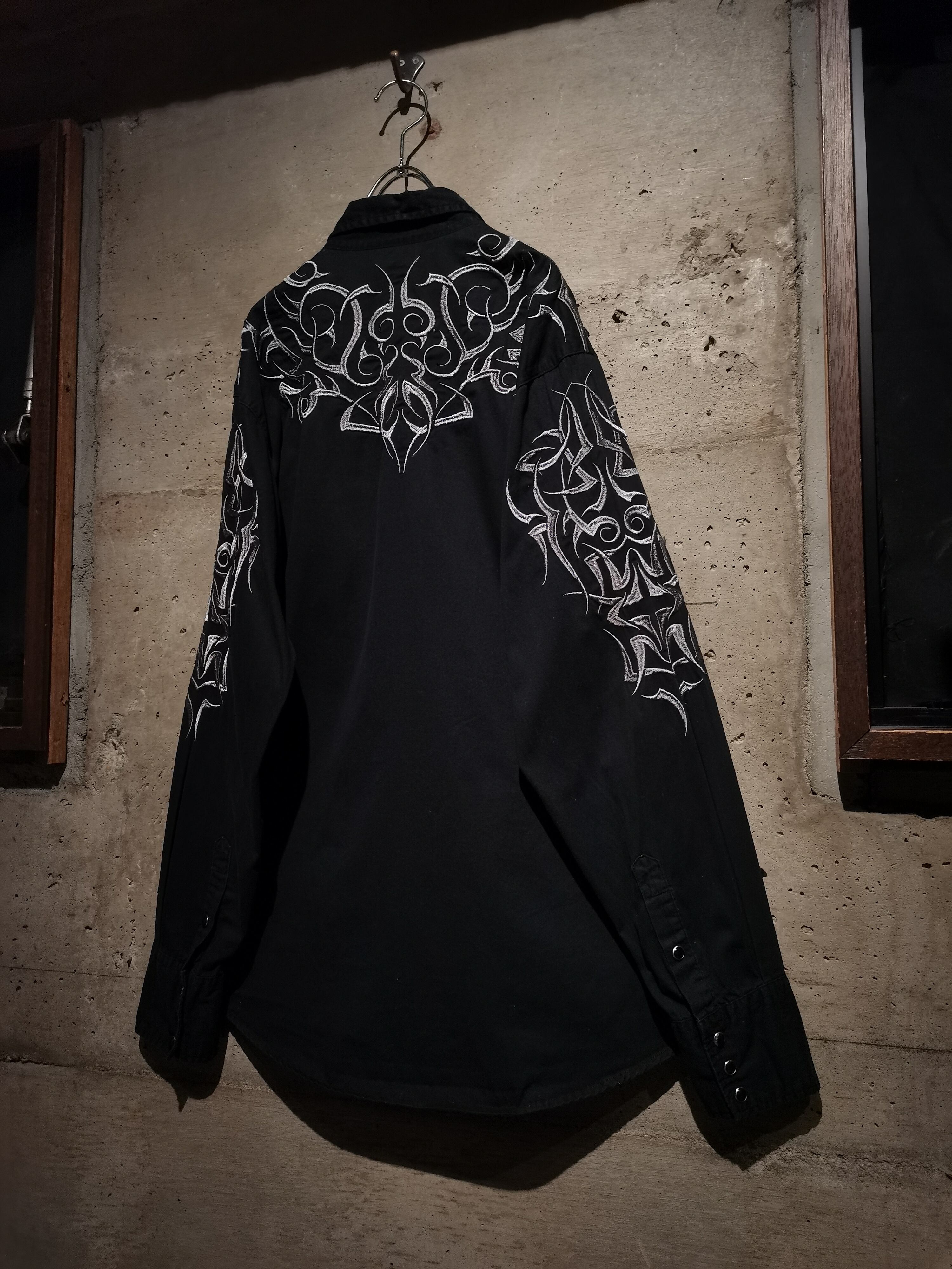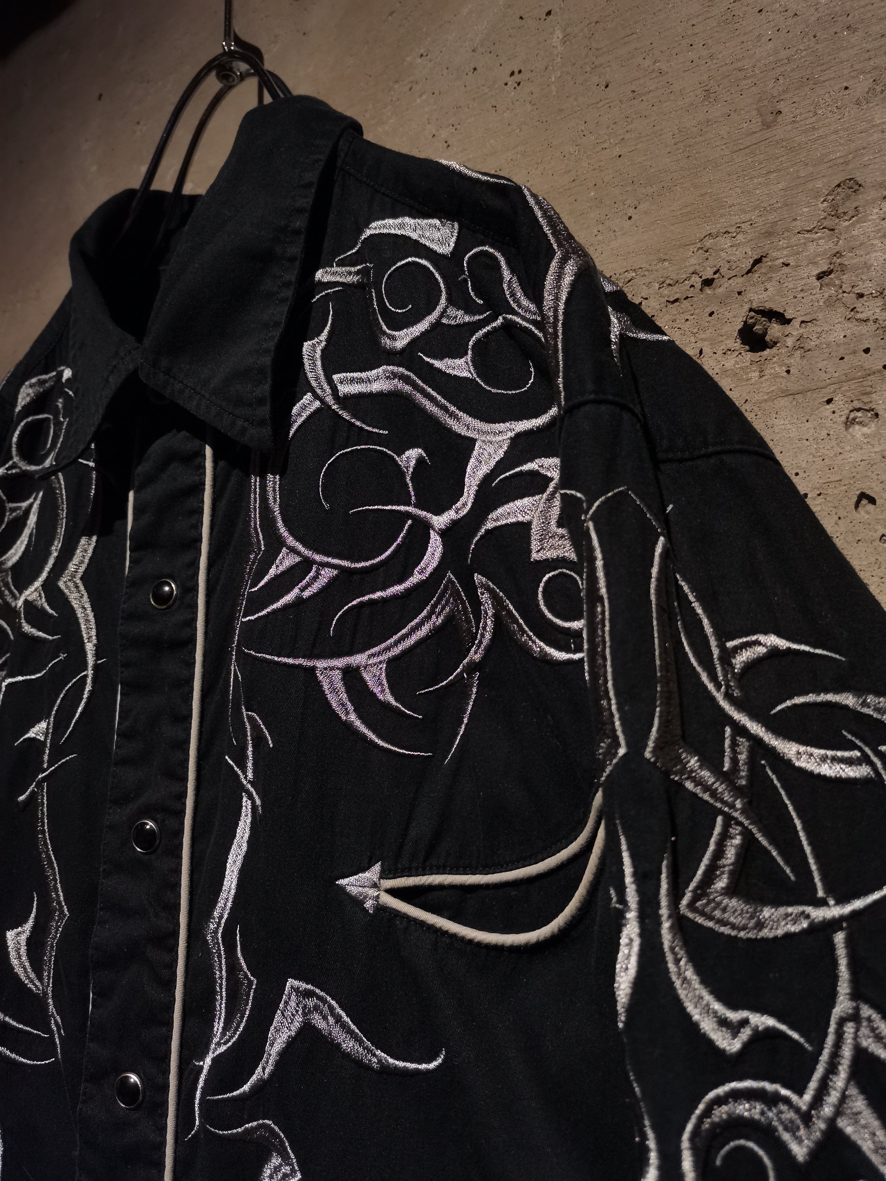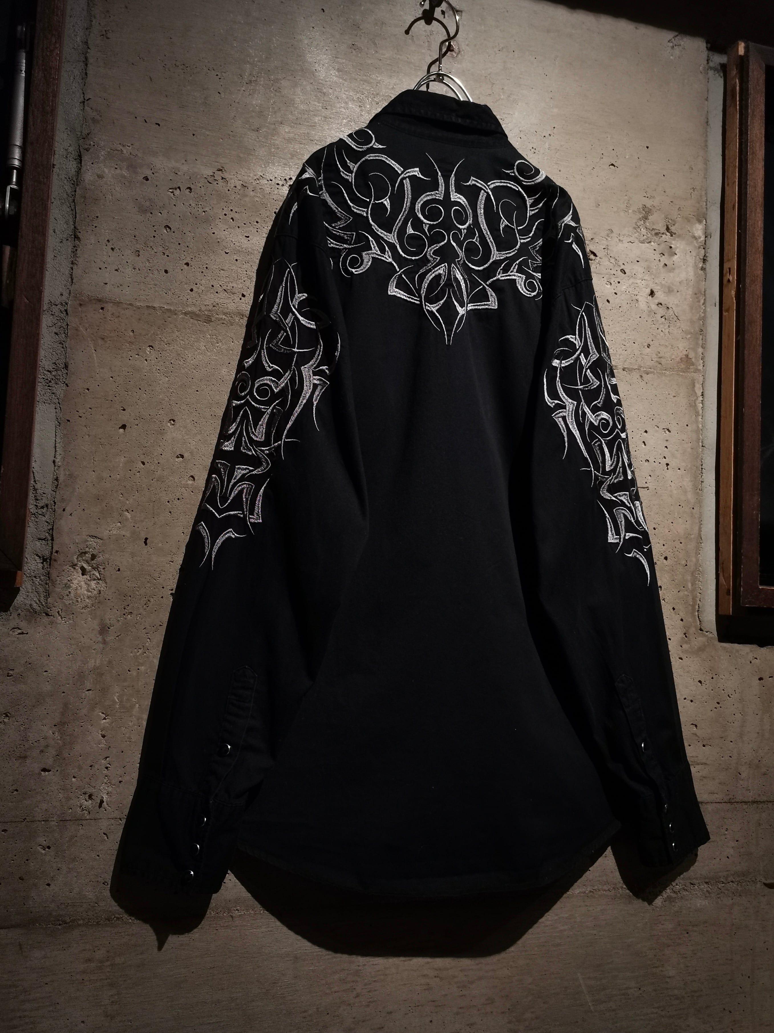 ブラックのボディをベースに、前後のヨーク、アームにトライバル調の刺繍を刻み込んだスペシャルなウエスタンシャツ。