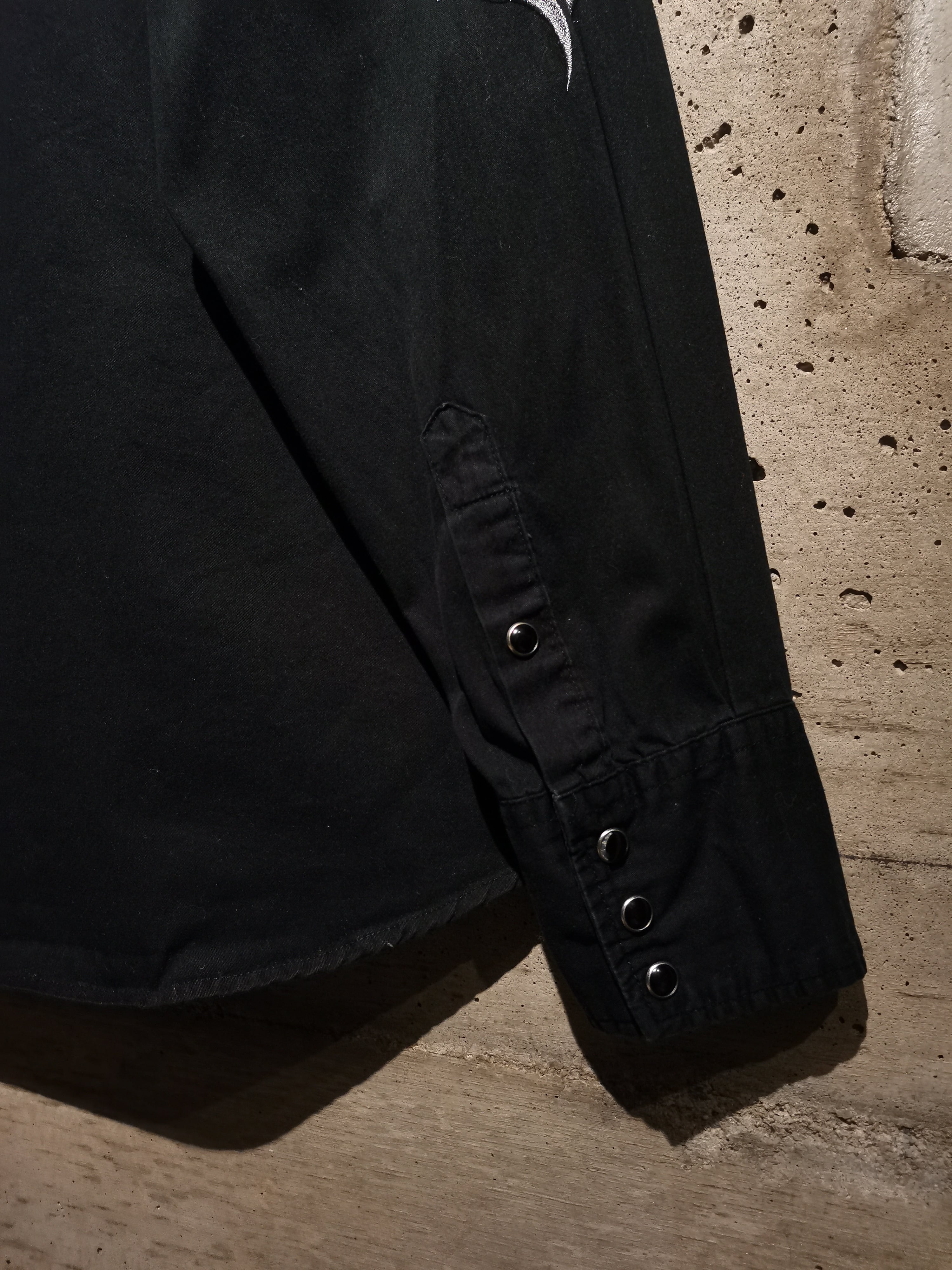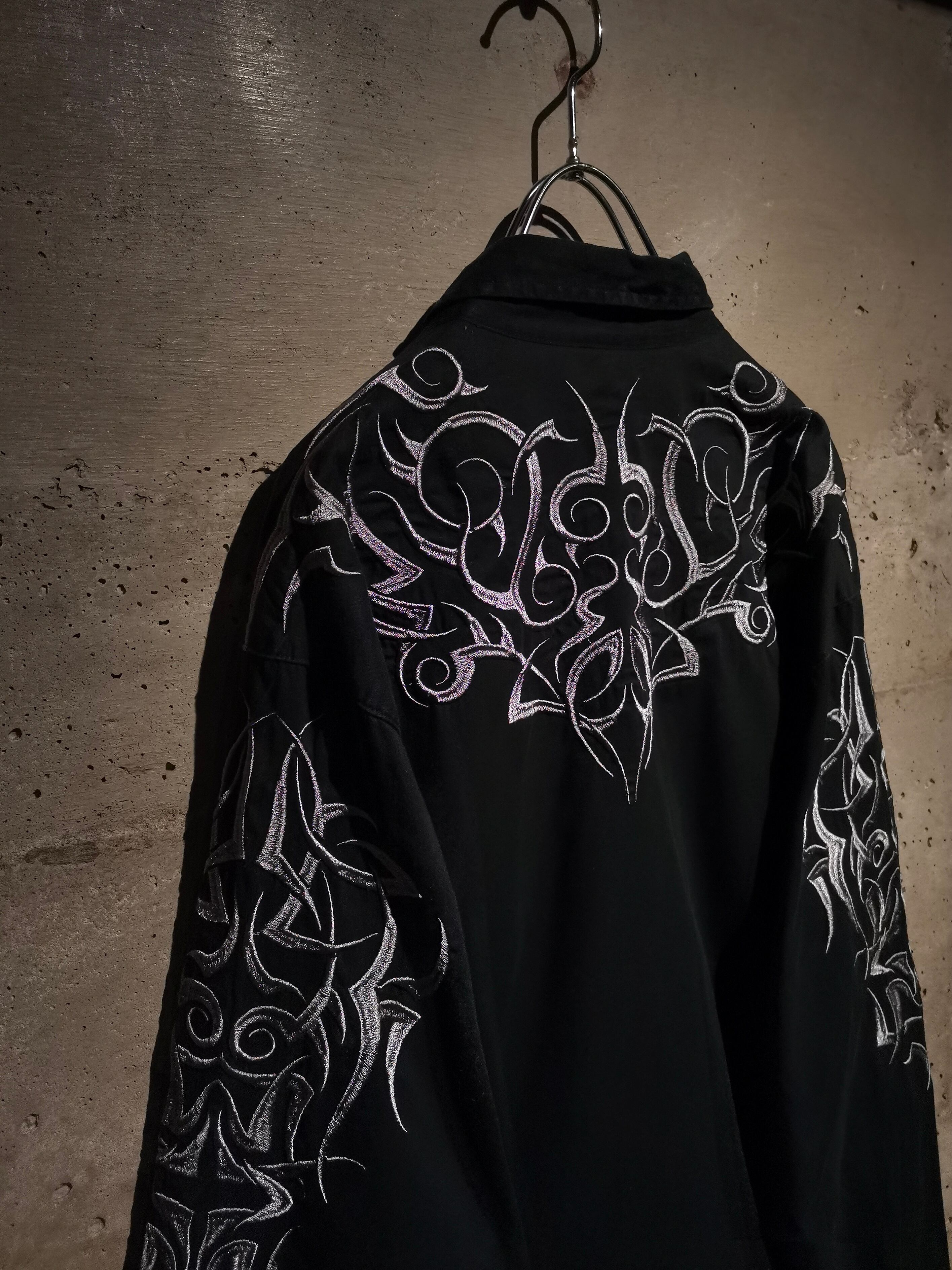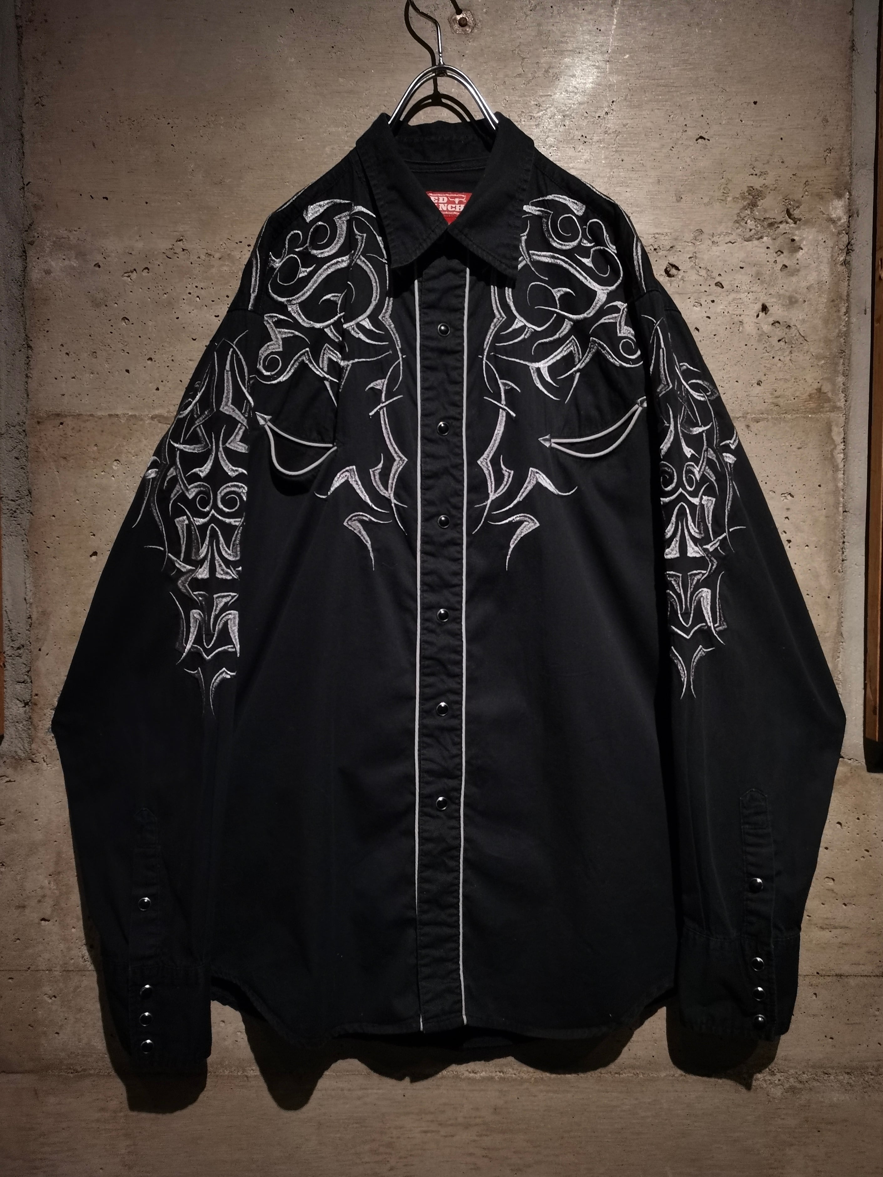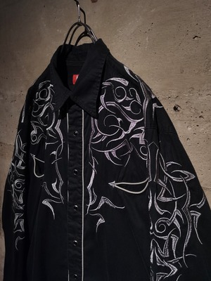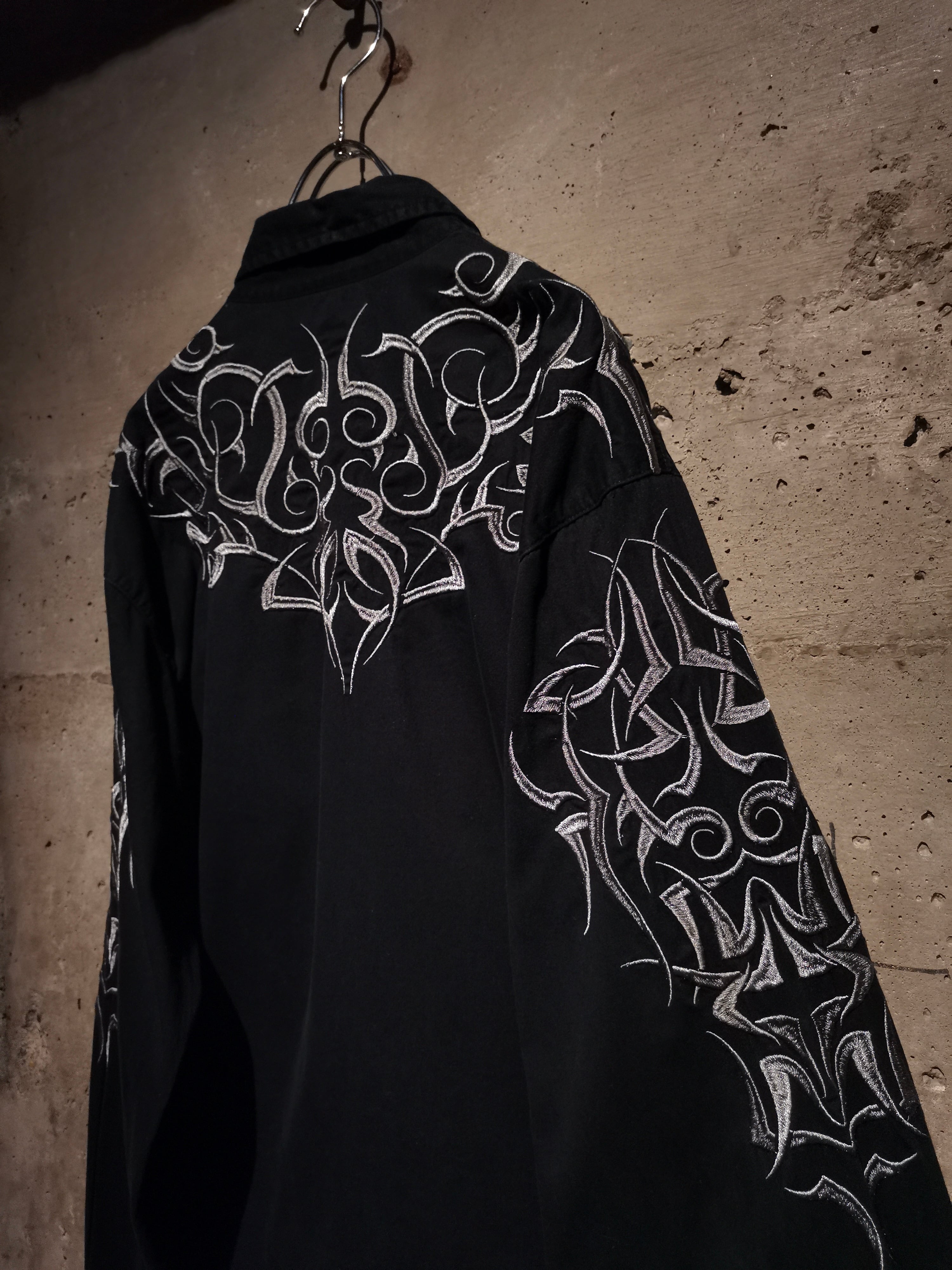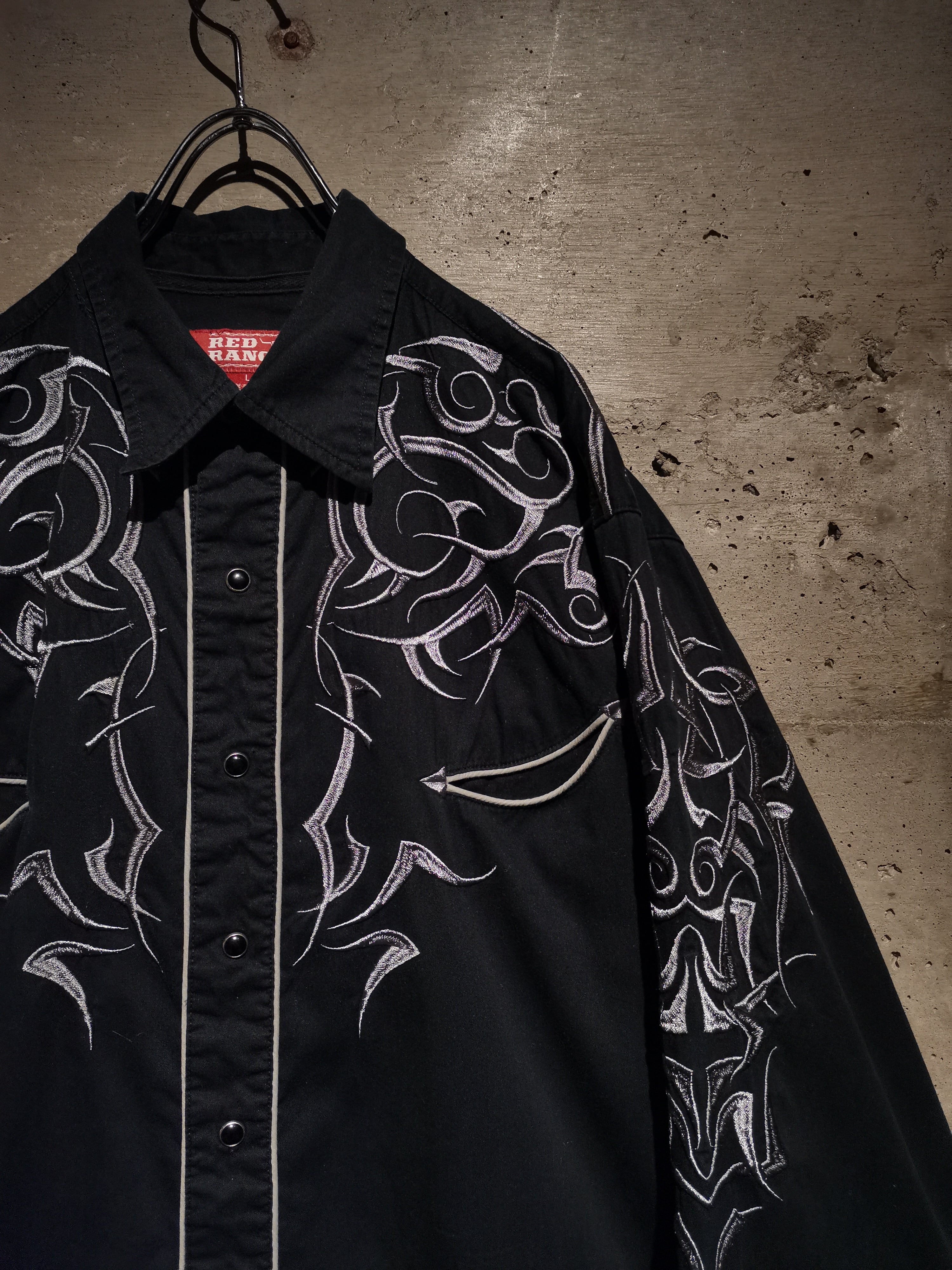 ブラックのボディをベースに、前後のヨーク、アームにトライバル調の刺繍を刻み込んだスペシャルなウエスタンシャツ。