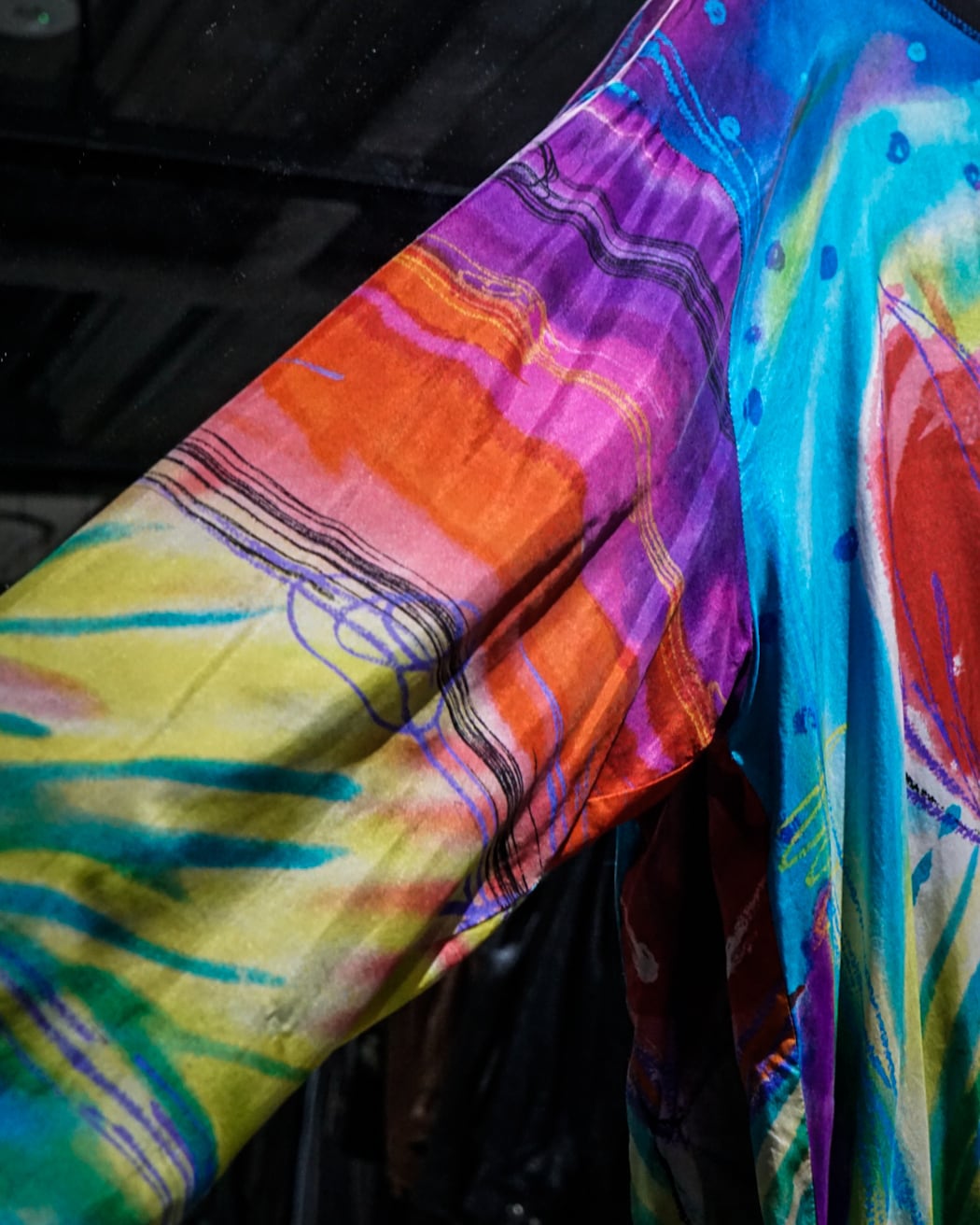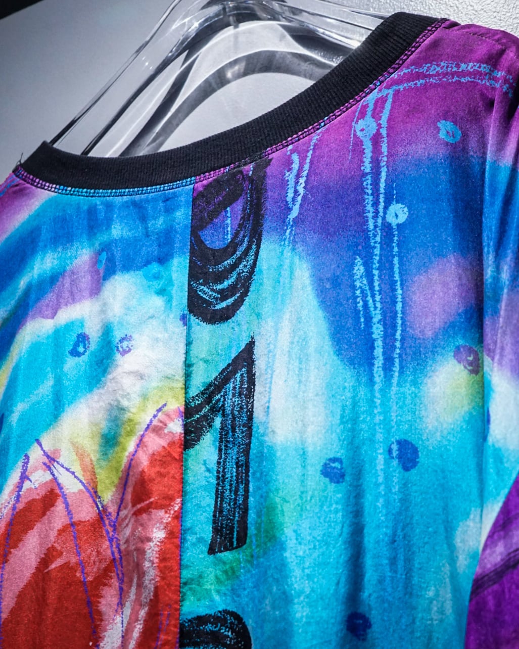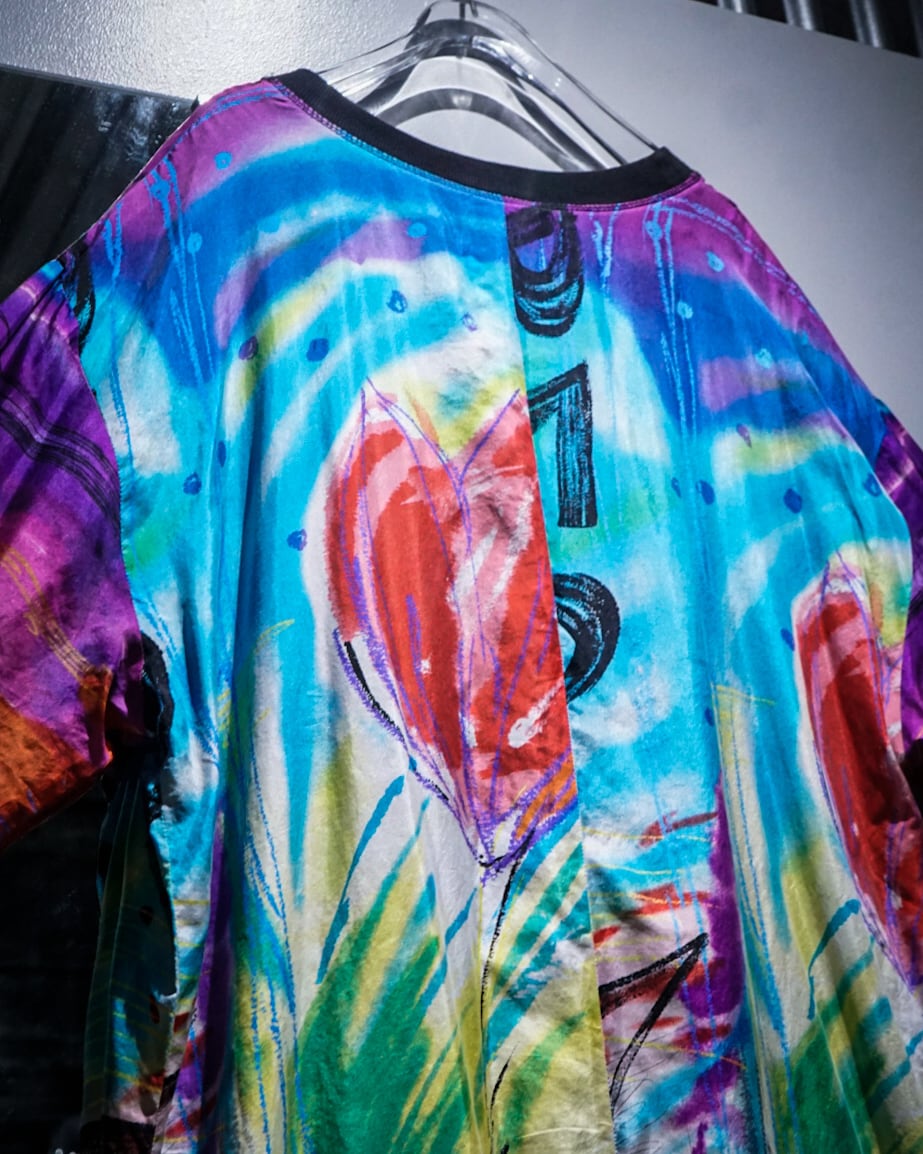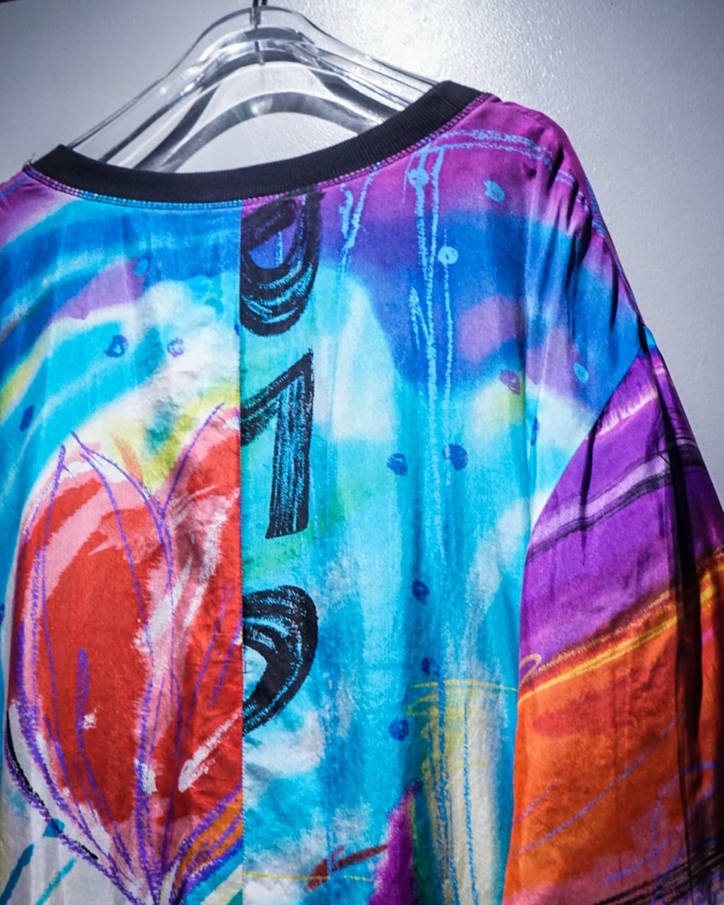 フワッとエアリーなシルクを用いたボディに、サイケデリックな落書き風のデザインを落とし込んだプルオーバー。