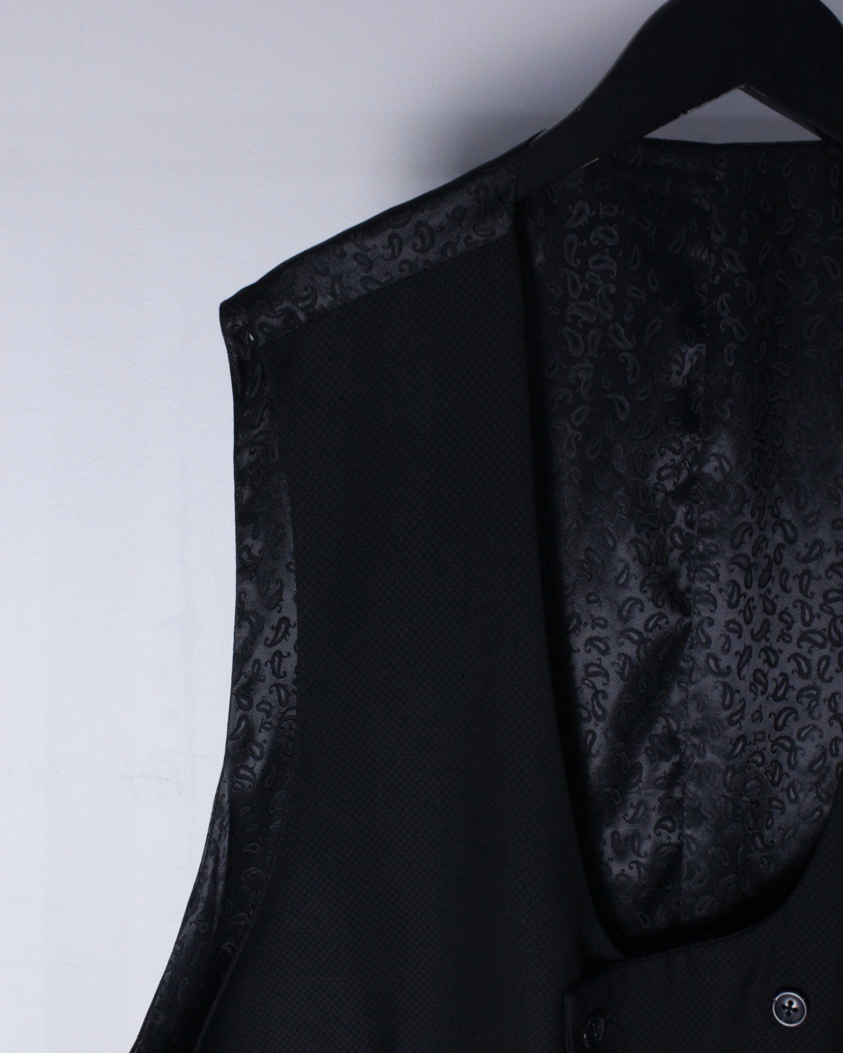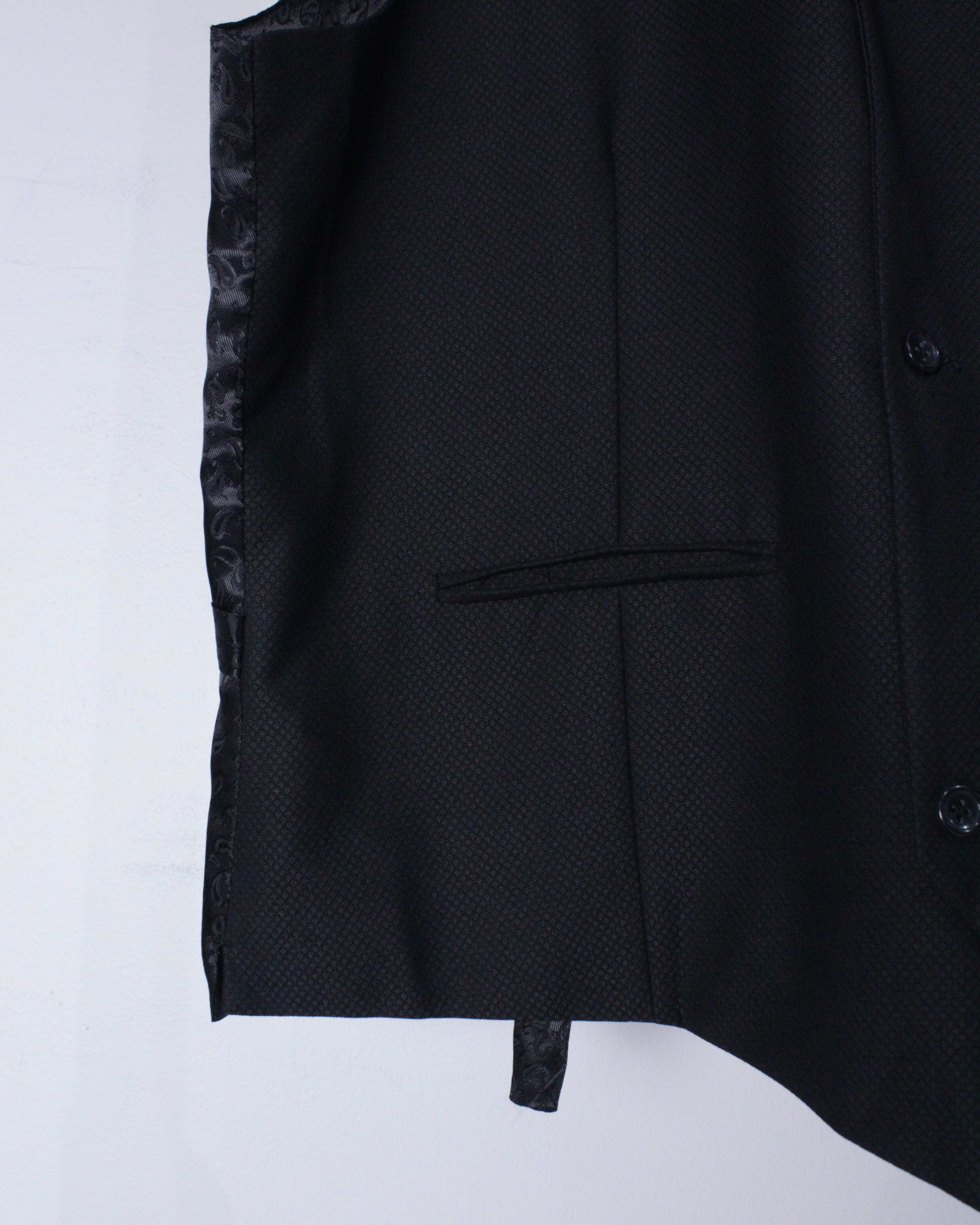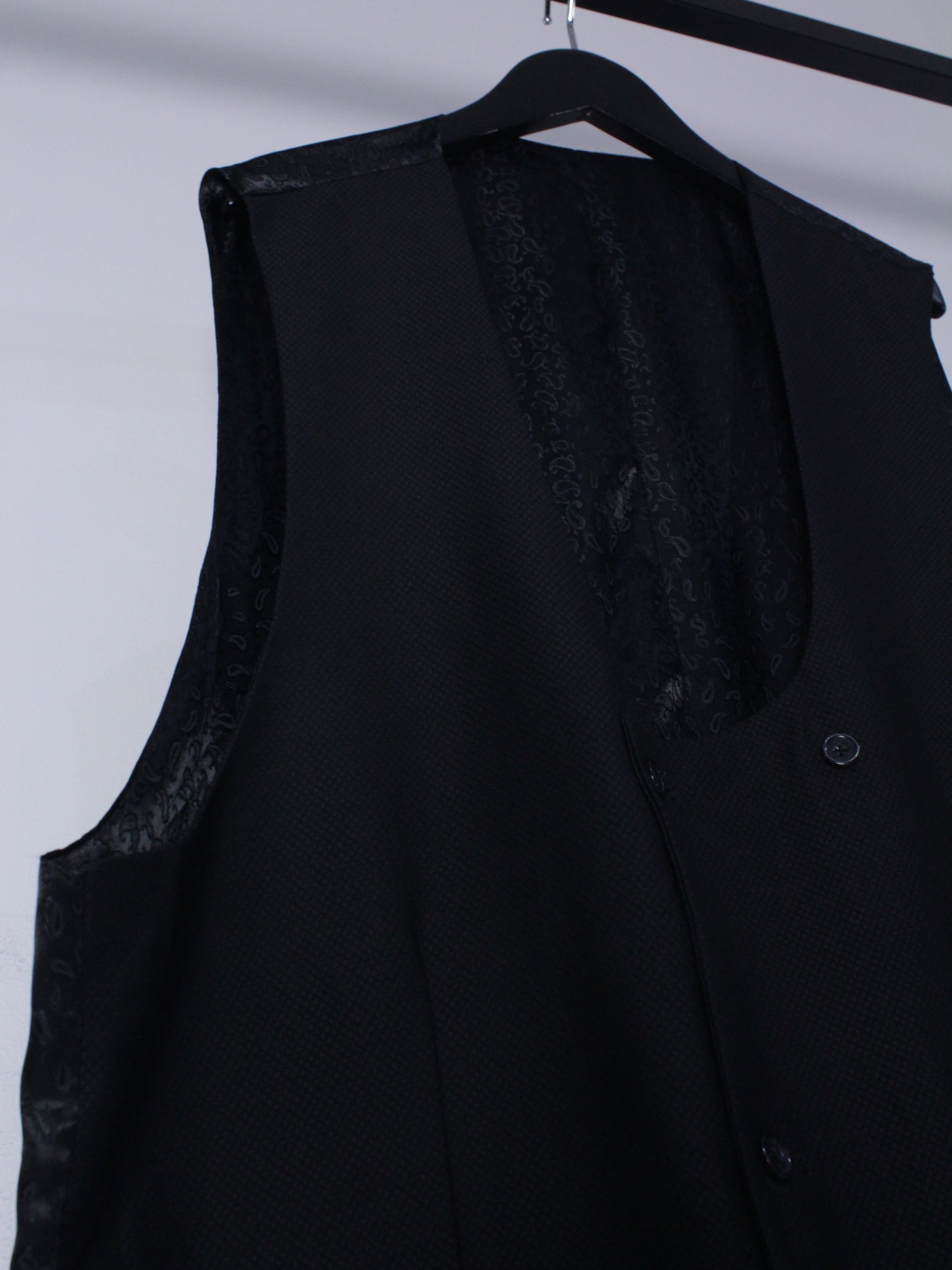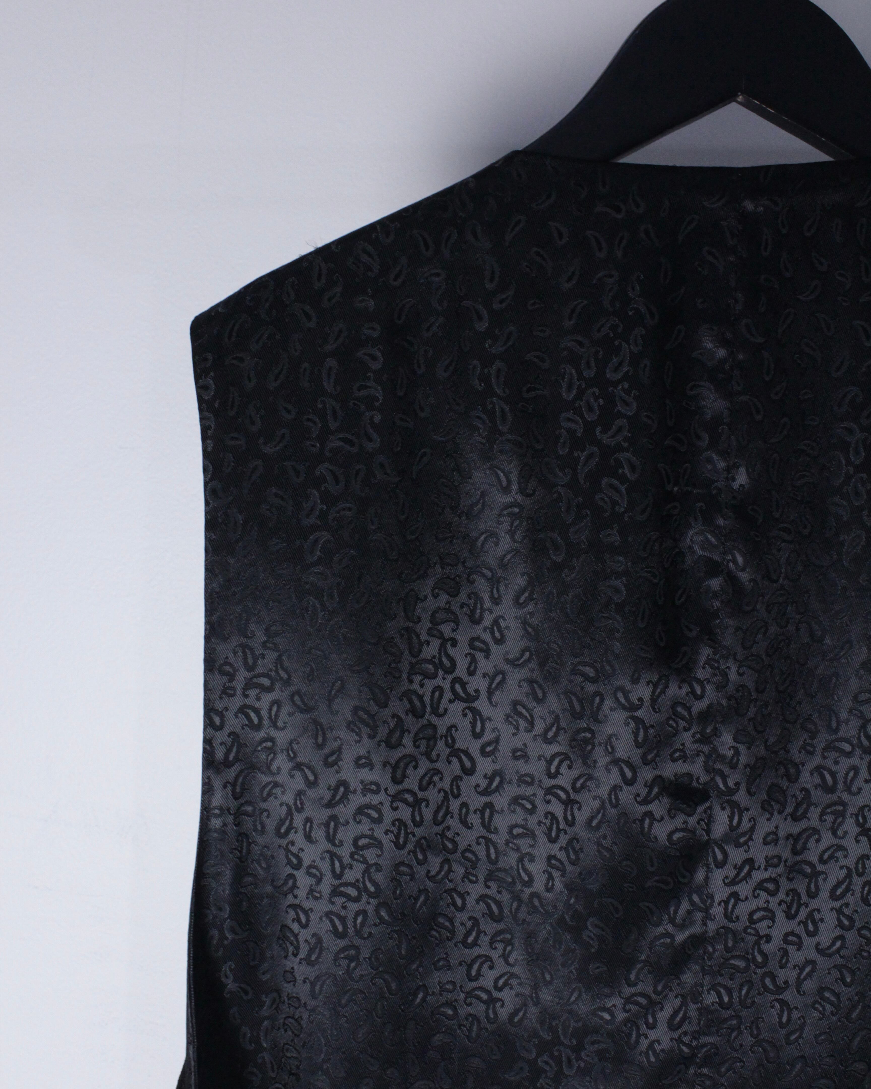 ブラックのボディをベースに、背面にペイズリー柄を載せたテキスタイルを切り替えたベスト。