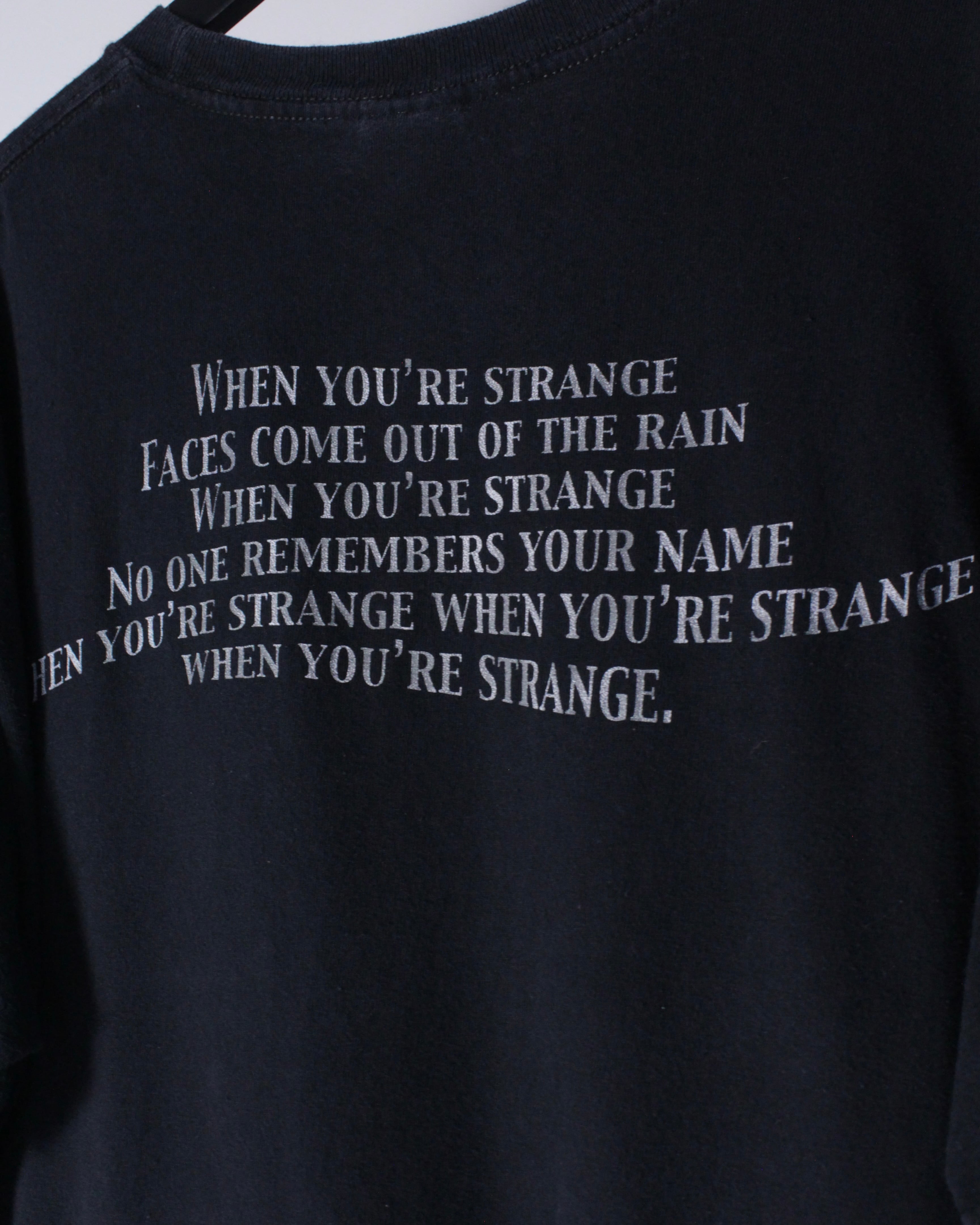 フロントにはそんなアイコニックなモリソンがステージで横たわっている様子、楽曲"People Are Strange"の歌詞を背面にプリントした1着。