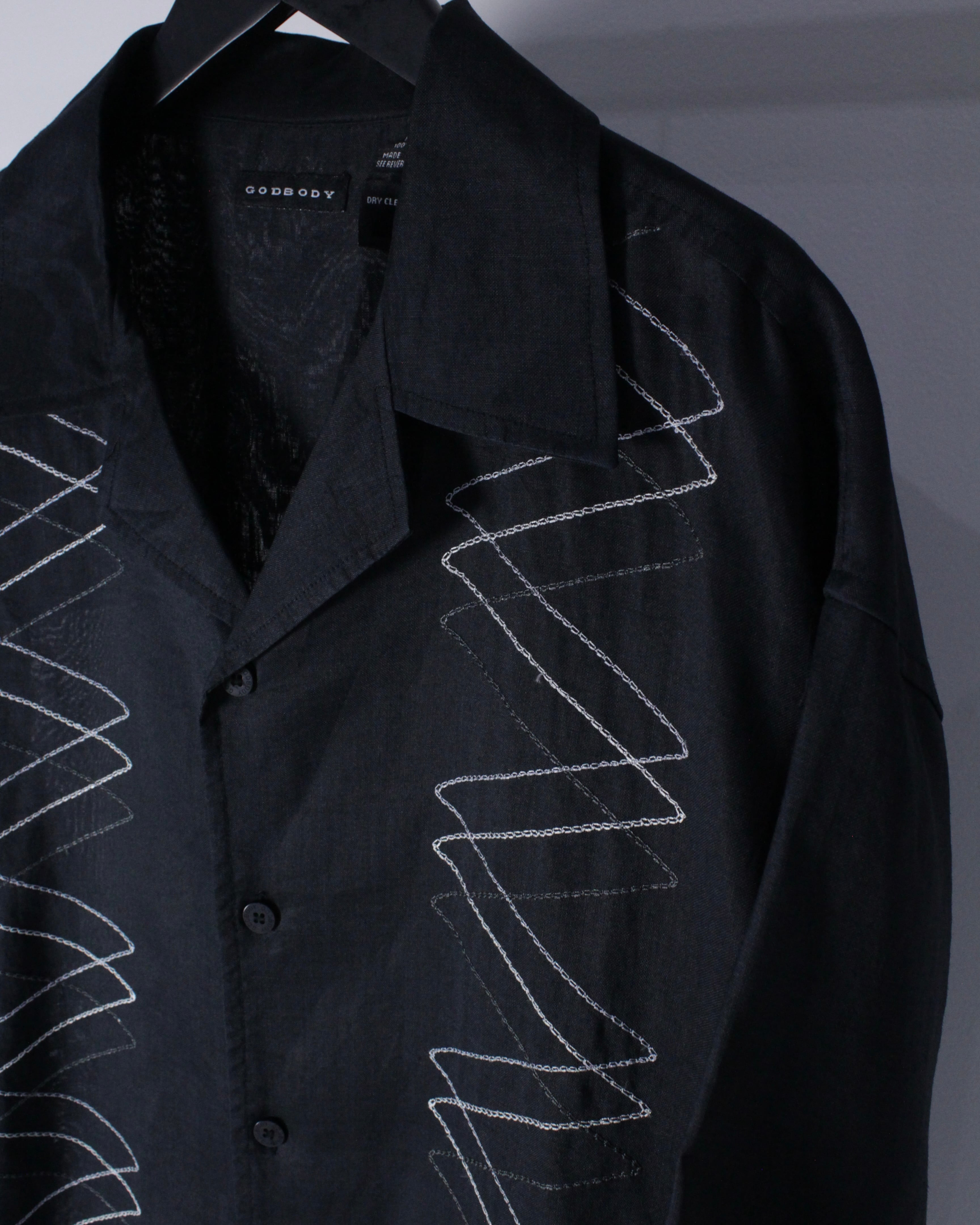 シルバー×白のチェーンステッチで表現されたジグザグが立体感を演出しつつ、上質なリネン特有のハリ感、光沢も非常に美しい、、、着込むほど体に馴染む天然素材で、デザインだけでなく経年変化もお楽しみいただけます。