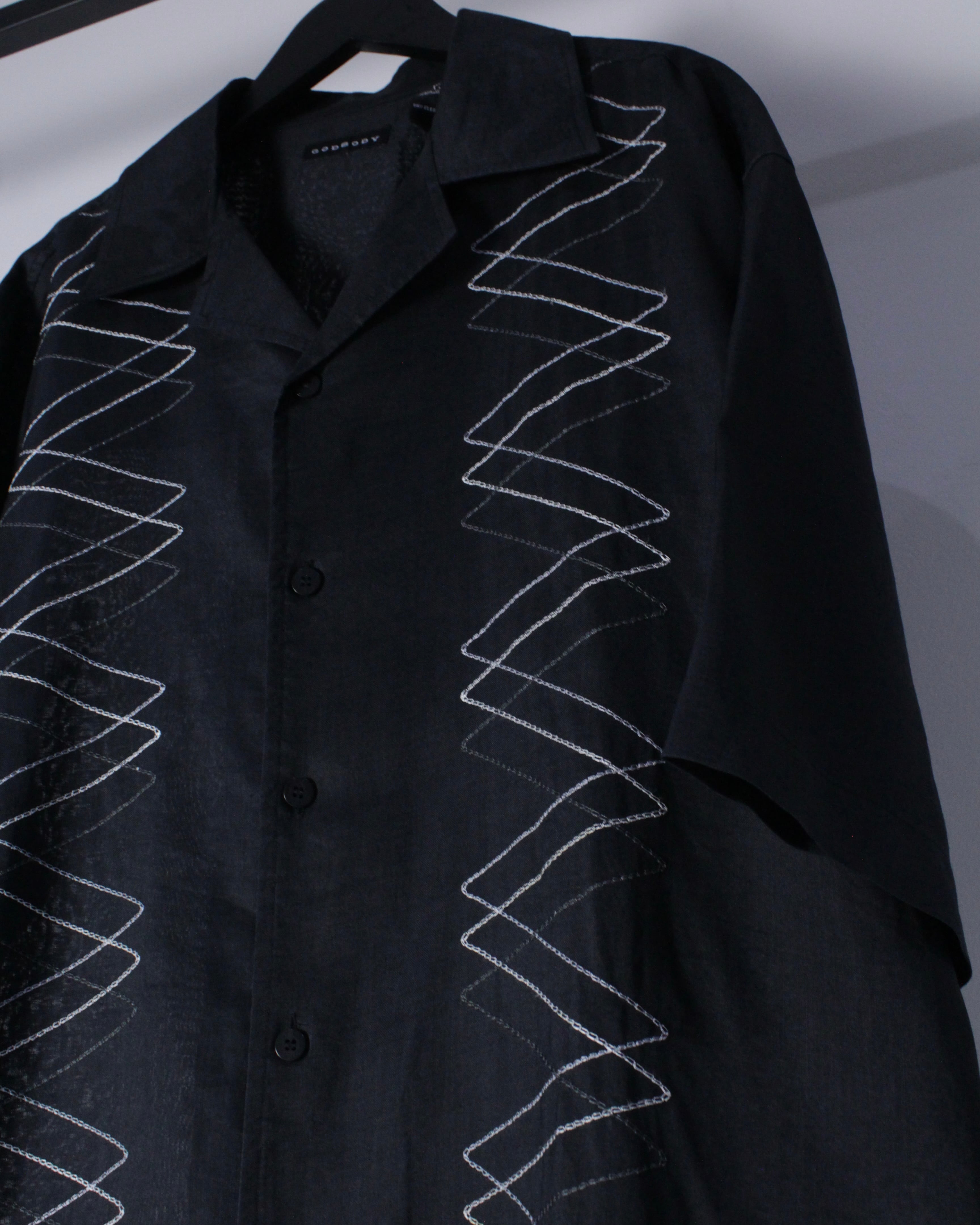 ヴィンテージにおいて稀少性の高いブラックリネン100%のボディに、ジグザグ状にステッチを叩いた半袖シャツ。