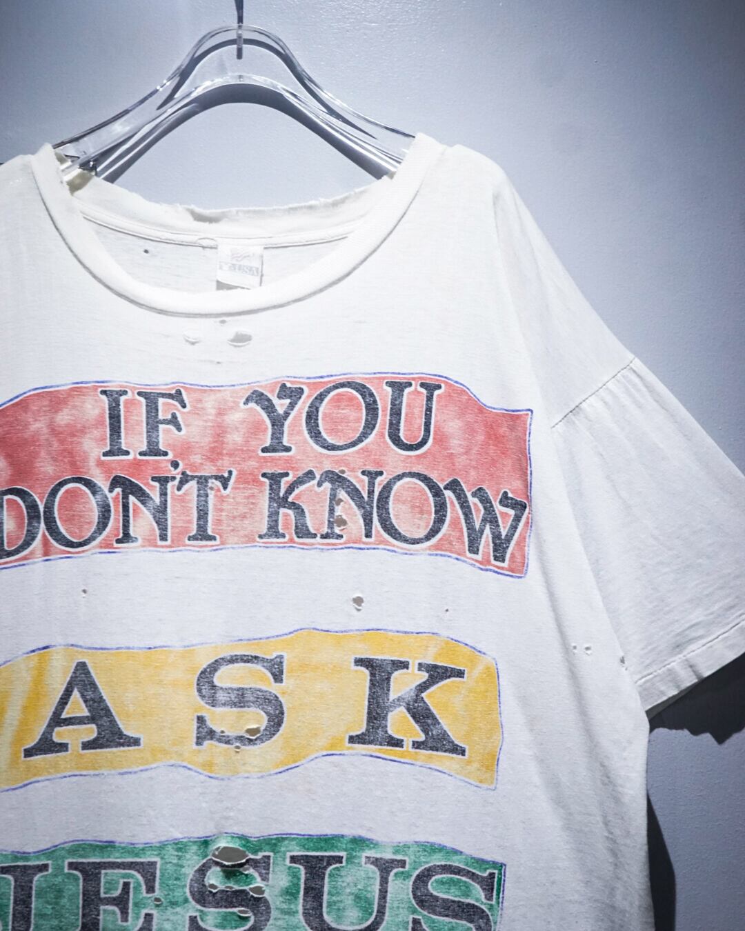 "If You Don't Know Ask Jesus (分からなければイエスに聞け)"とフロントに大きくプリントされたTシャツ。