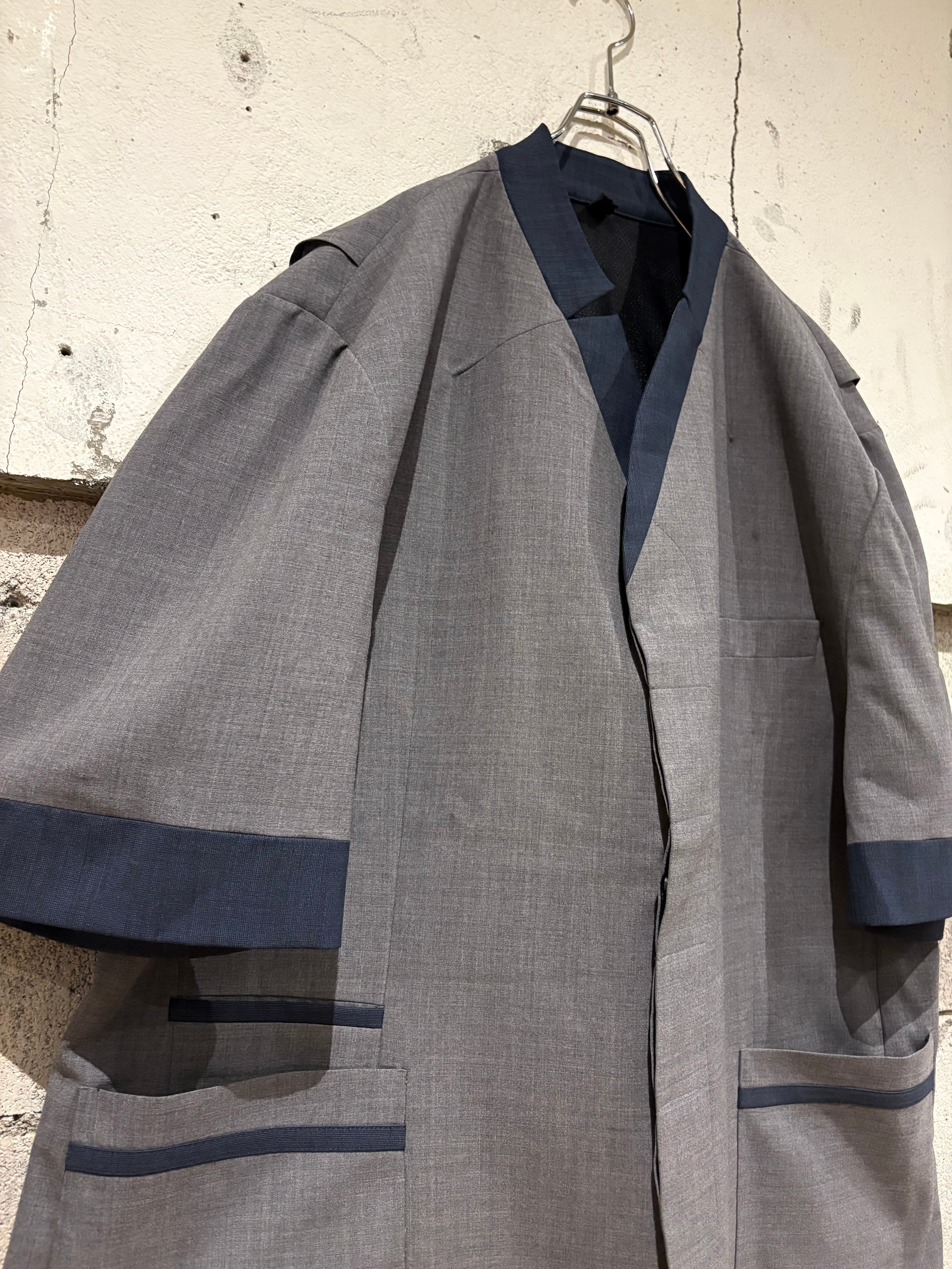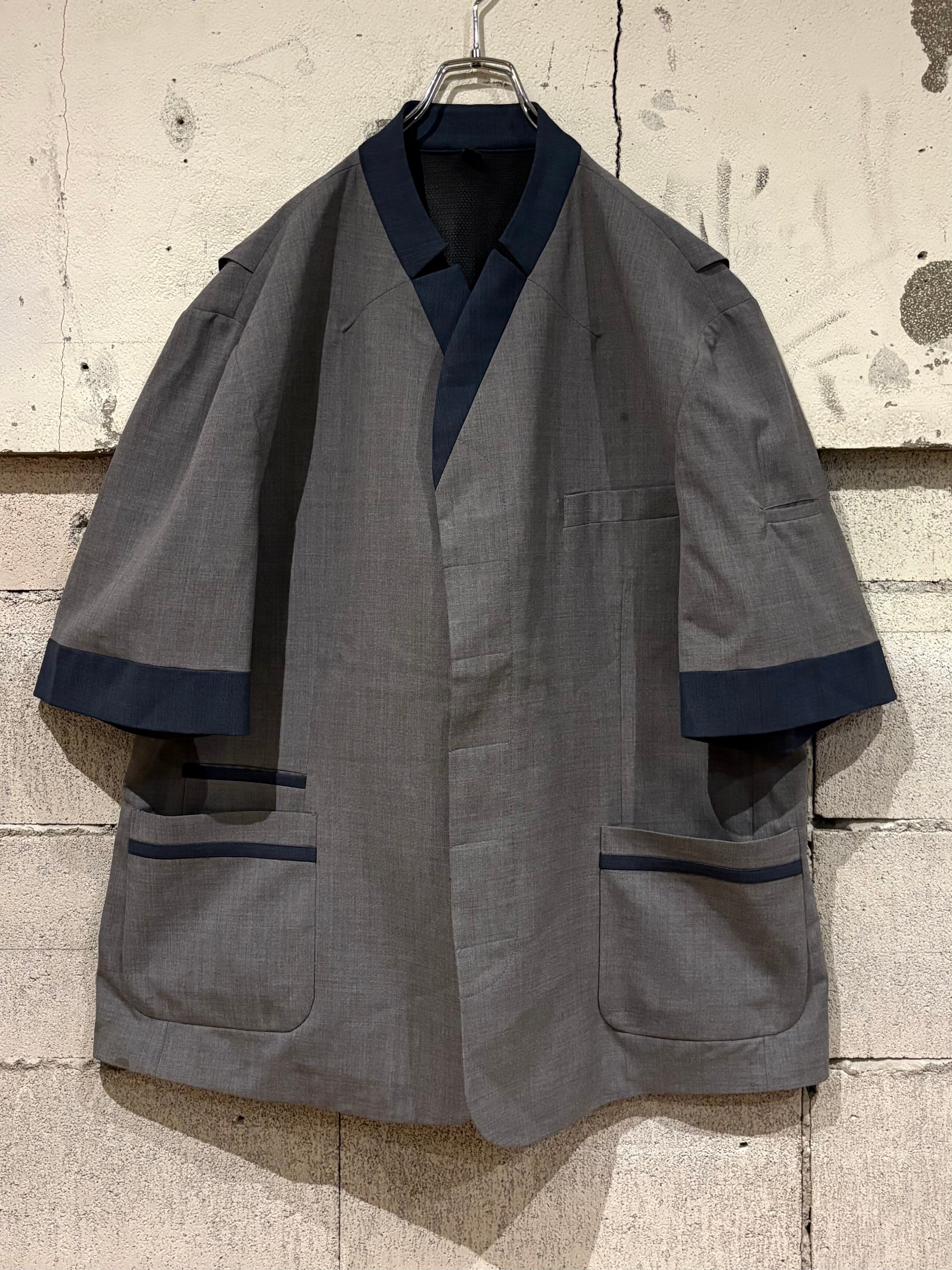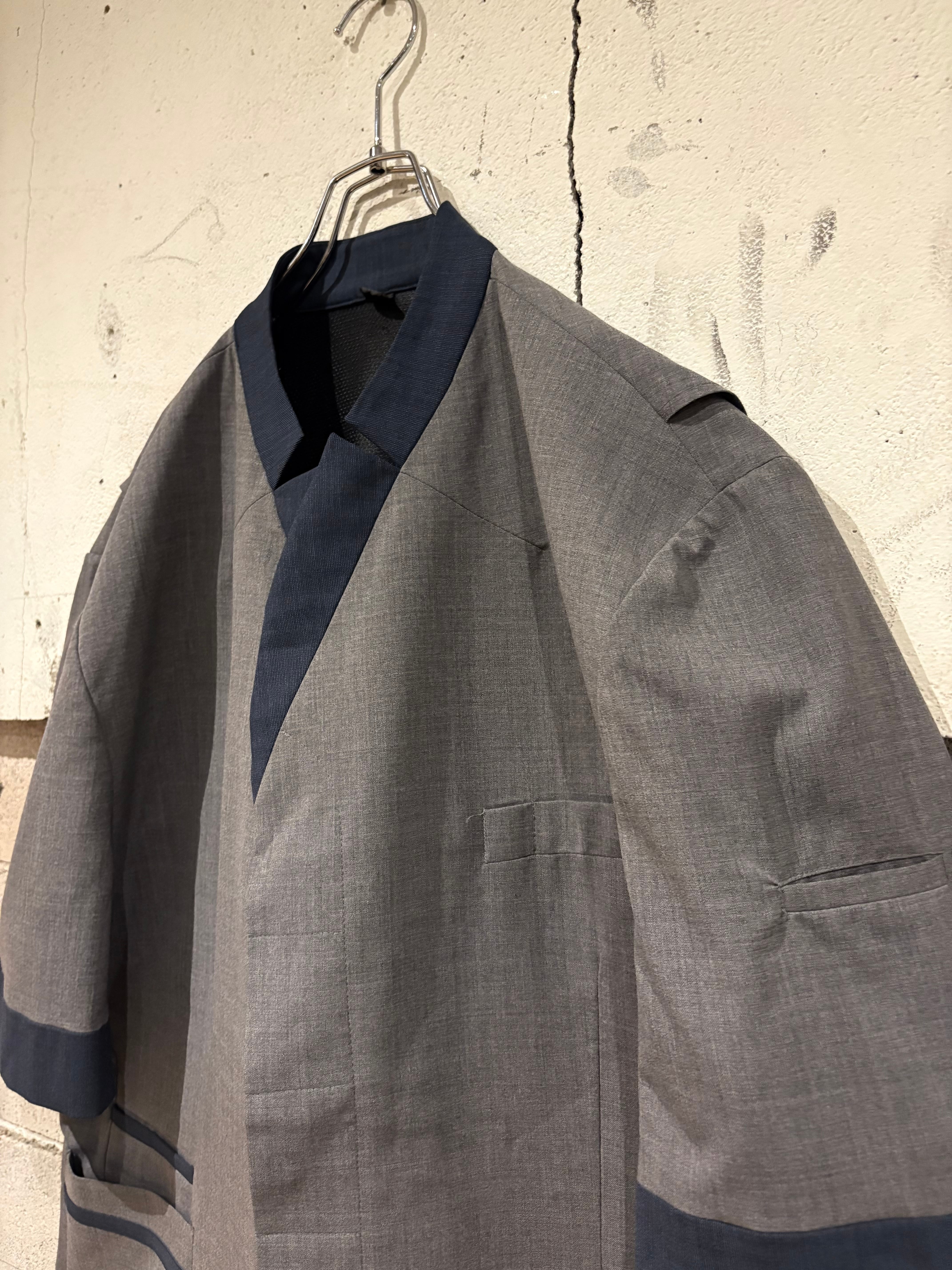 グレー×ネイビーのカラーリングをベースとし、変形的なデザインに仕上げられた半袖テーラードジャケット。