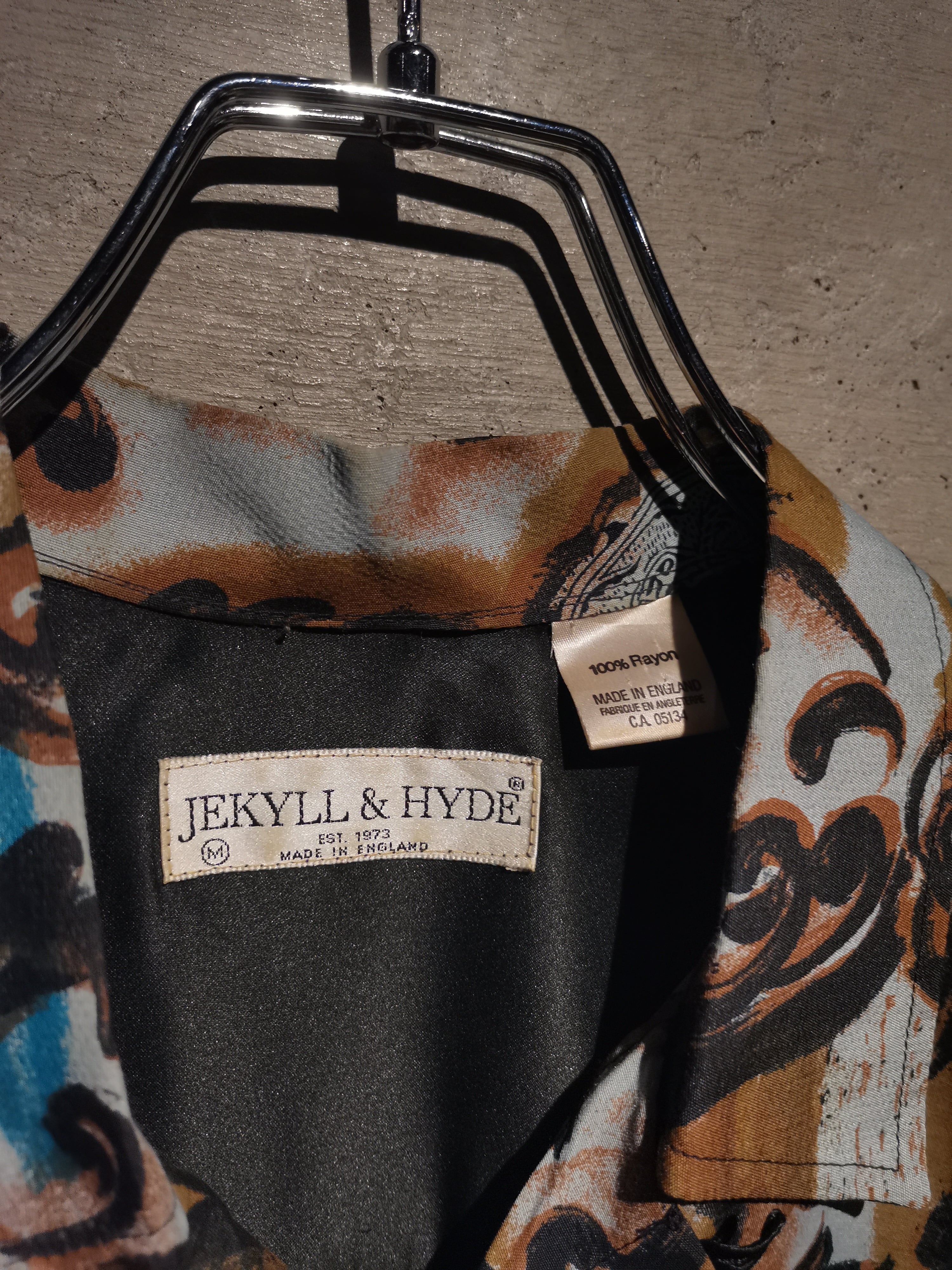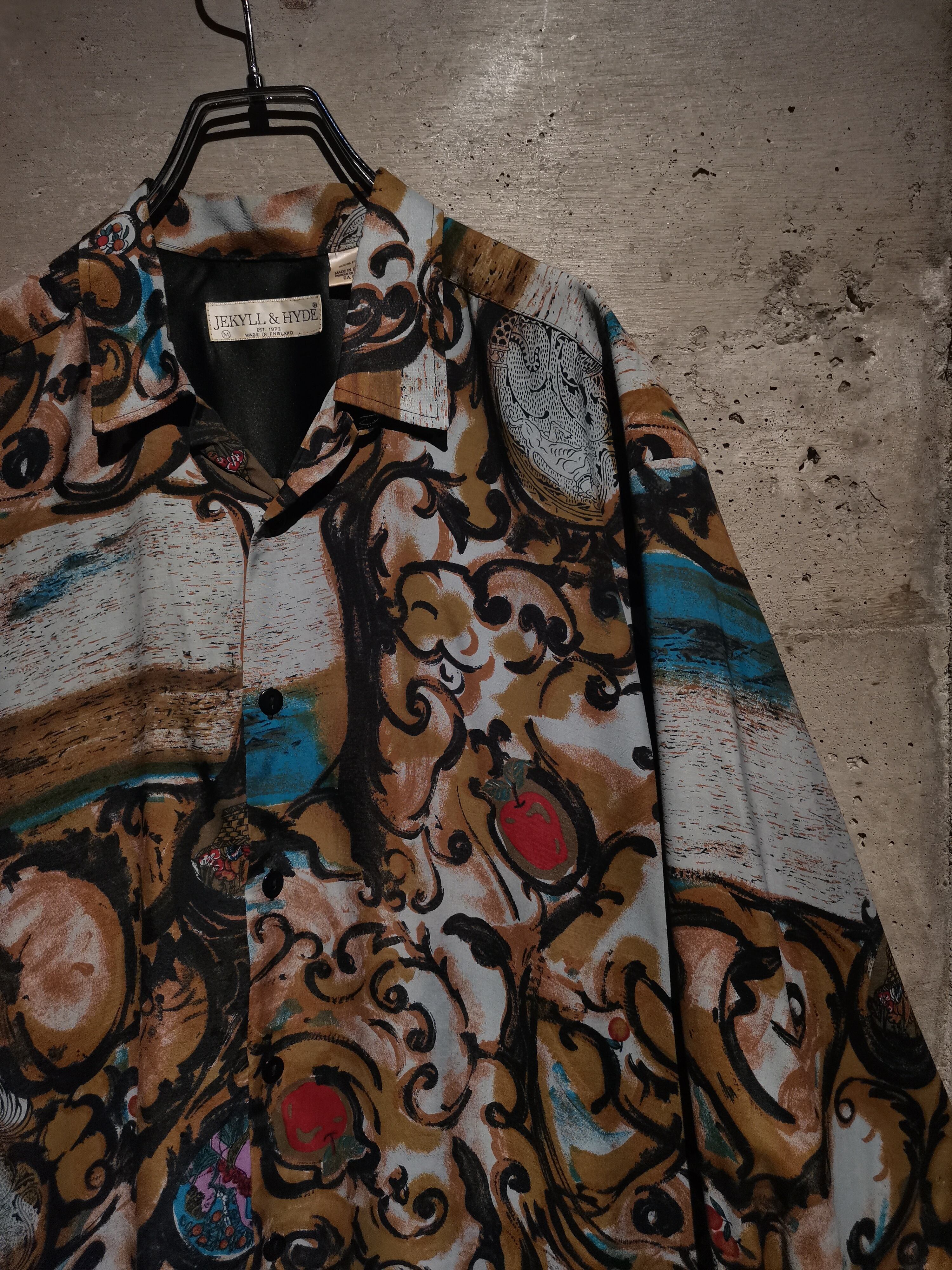 ツルッと滑らかな質感に仕上げられた、レーヨン素材をボディに使用し、アーティスティックな柄模様を載せた、イングランド製のオープンカラーシャツ。