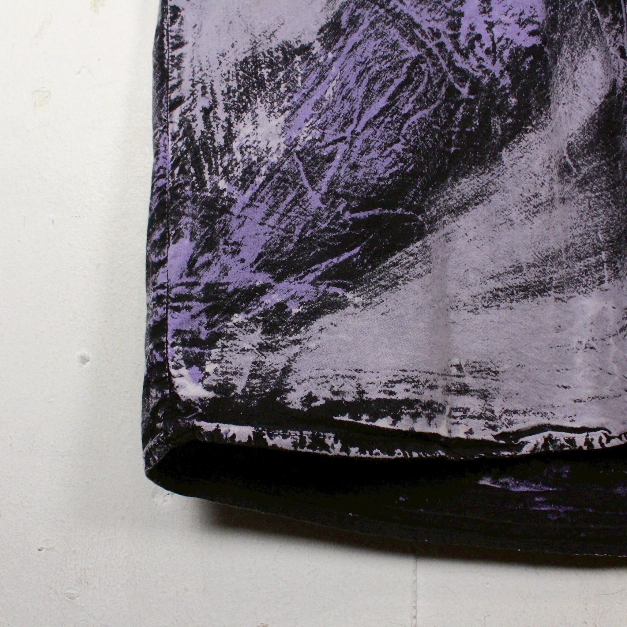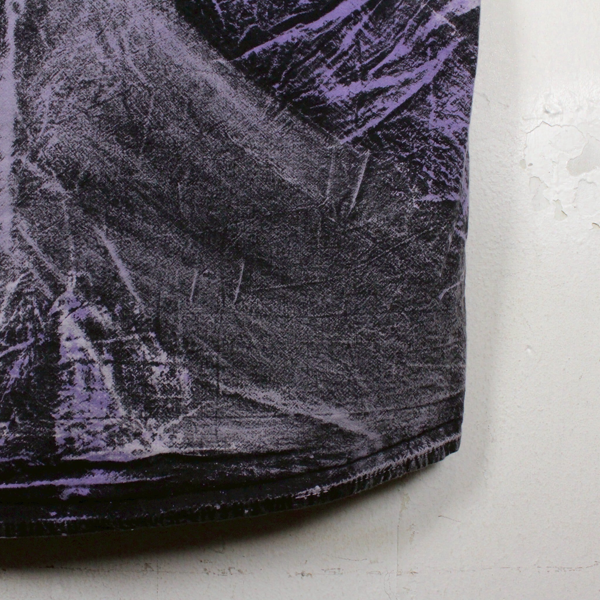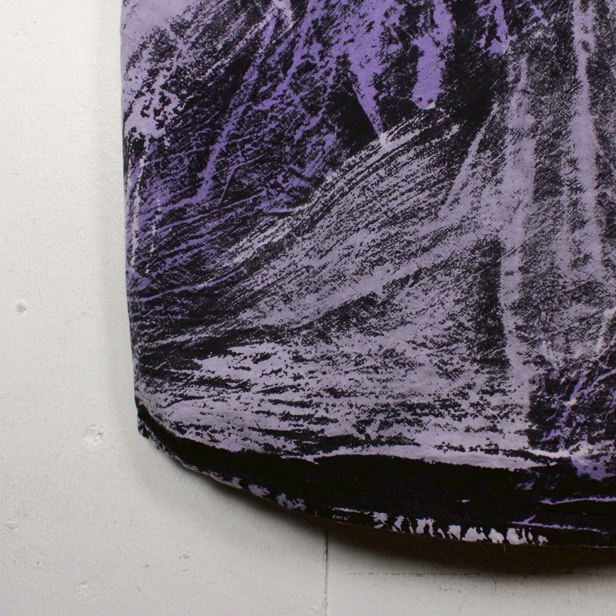 ブラックのコットンボディに染めのように紫のプリントを全体に施した半袖シャツ。