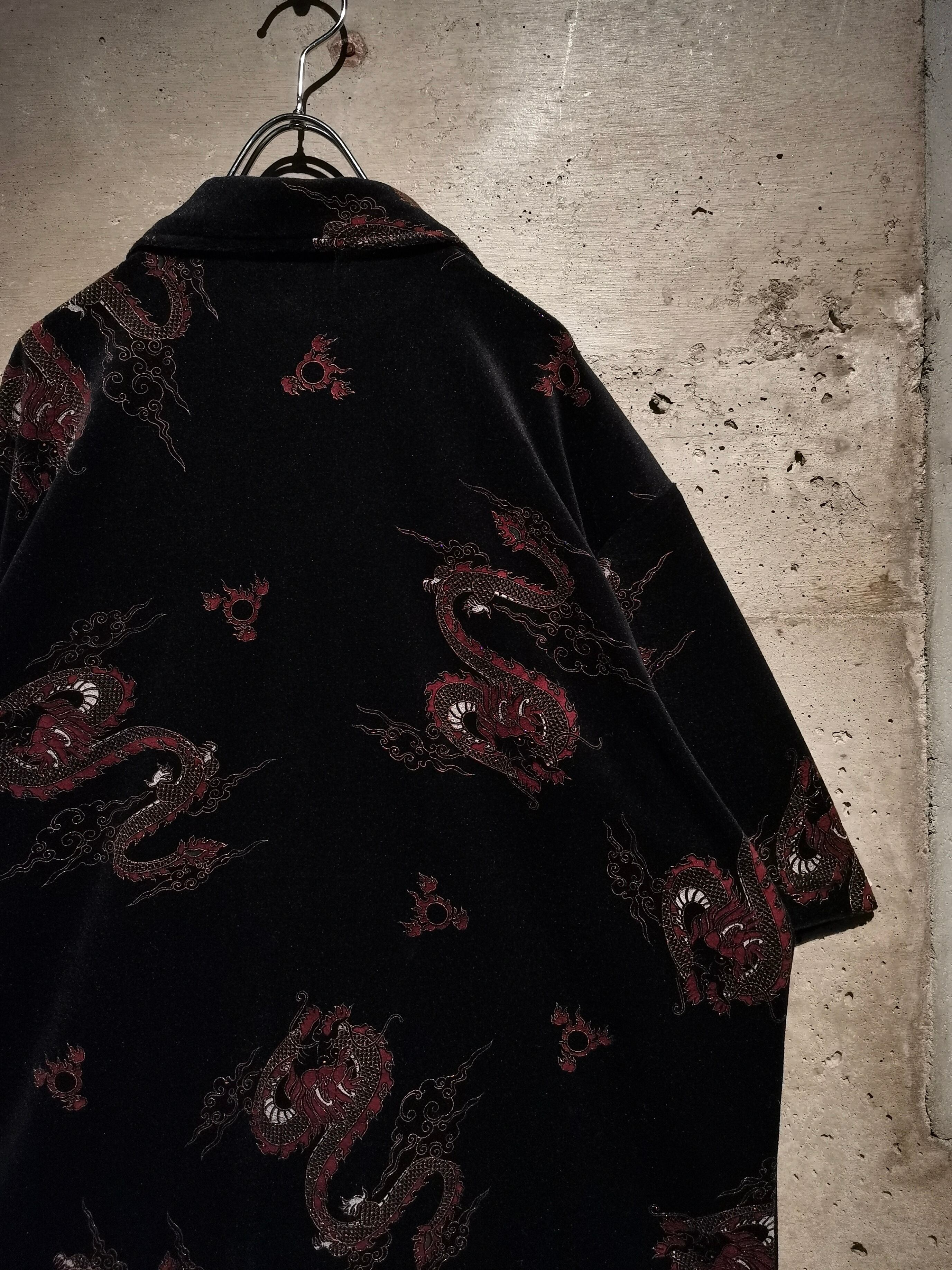 鈍い光沢が美しいブラックベロアをボディに用い、全体に龍のプリントを載せた半袖オープンカラーシャツ。