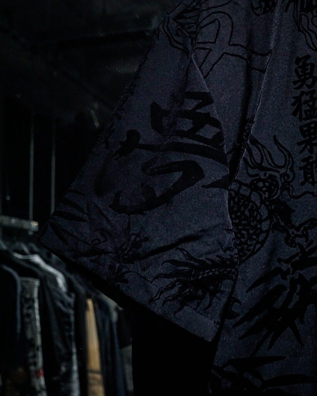 ハリのあるブラックのボディをベースに、フロッキープリントで龍のデザインを落とし込んだ半袖シャツ。