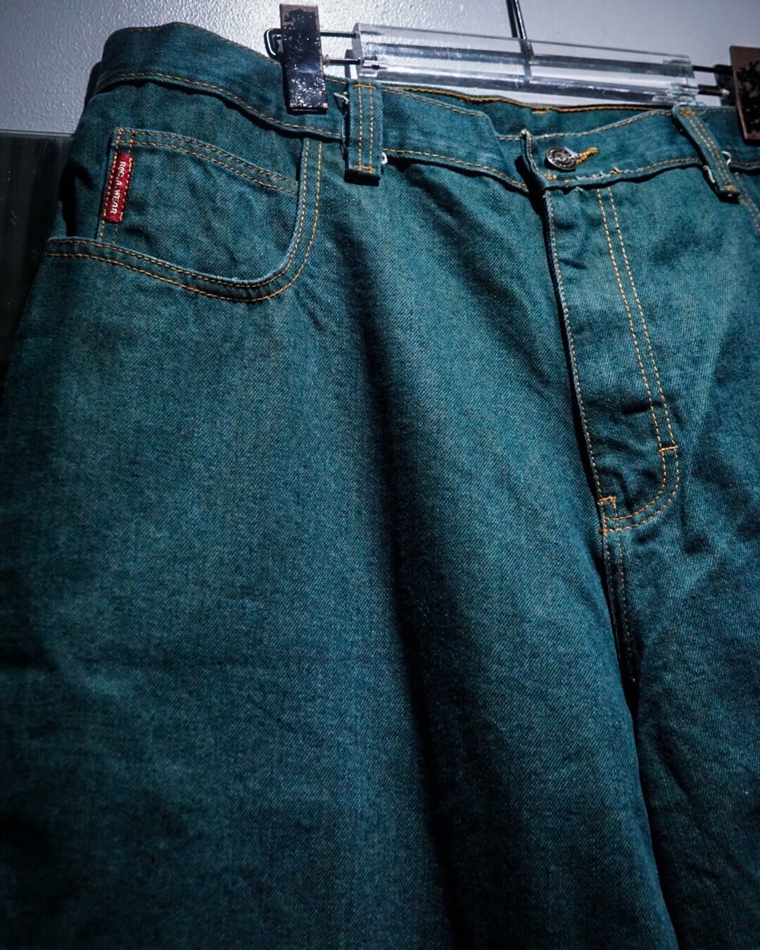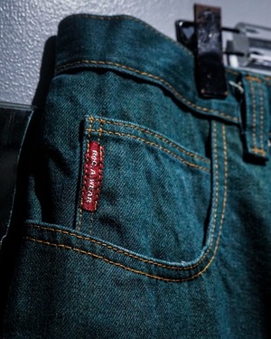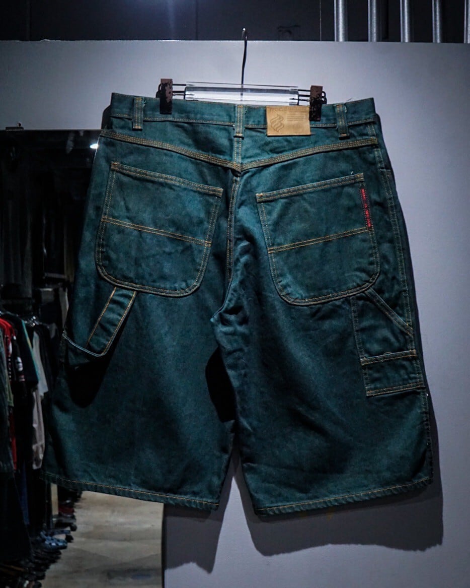 色残りがしっかりとある稀有なグリーンのボディに、黄色のステッチをボディに叩いたペインターデニムショーツ。