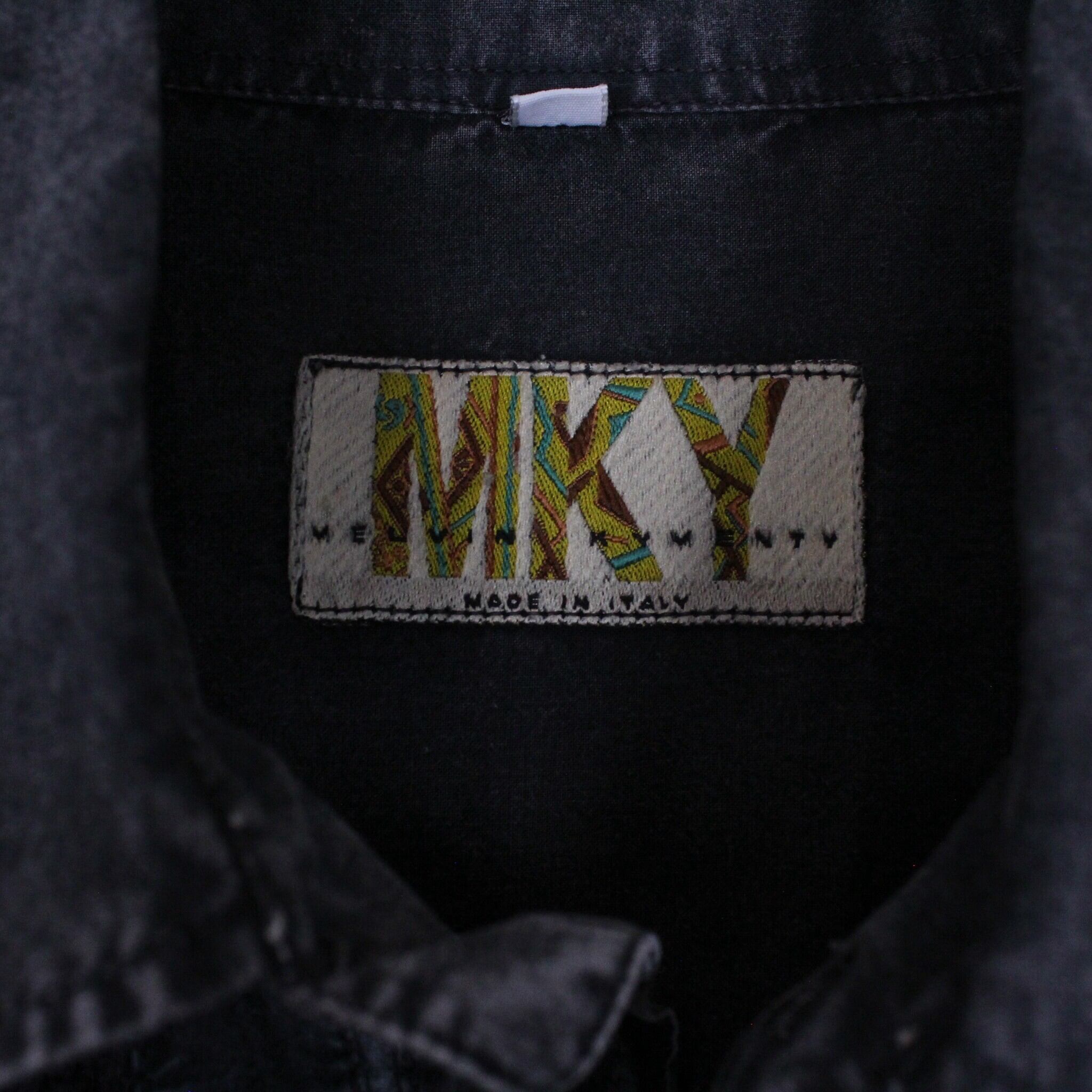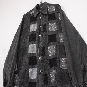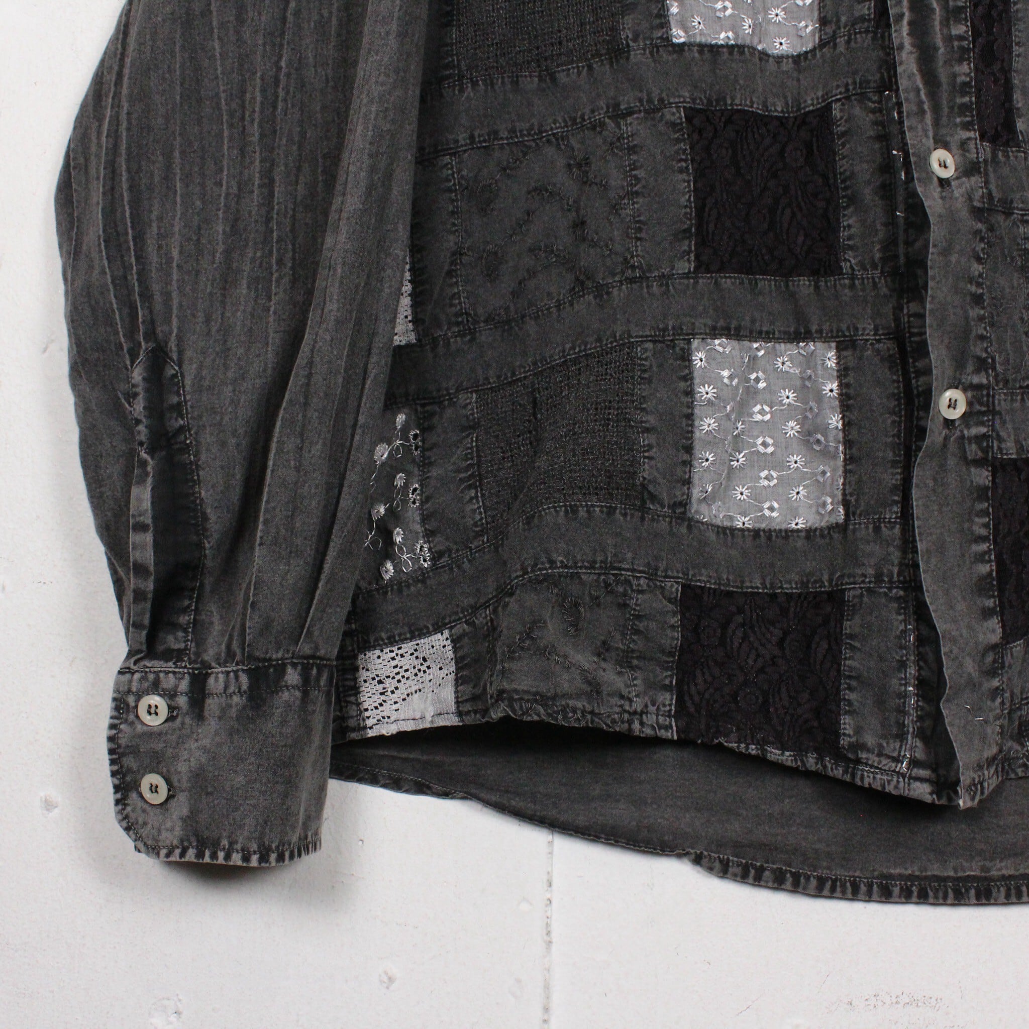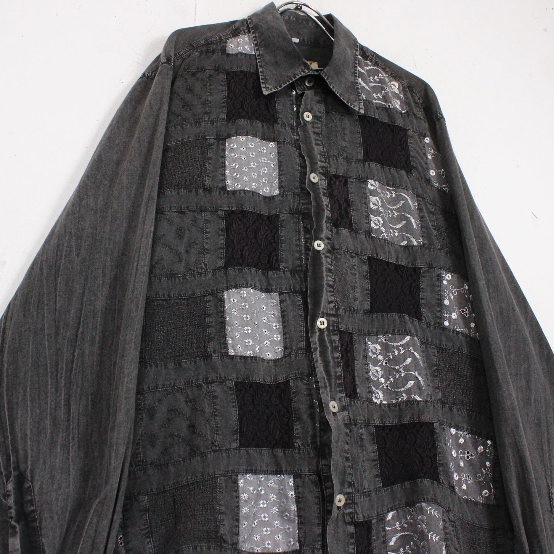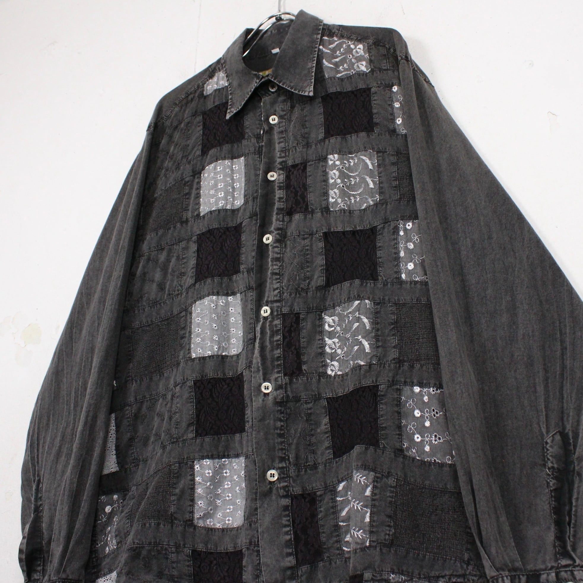 様々な手法によるデザインが施されたシアー生地を用いたパッチワークによって仕上げられた長袖シャツ。
