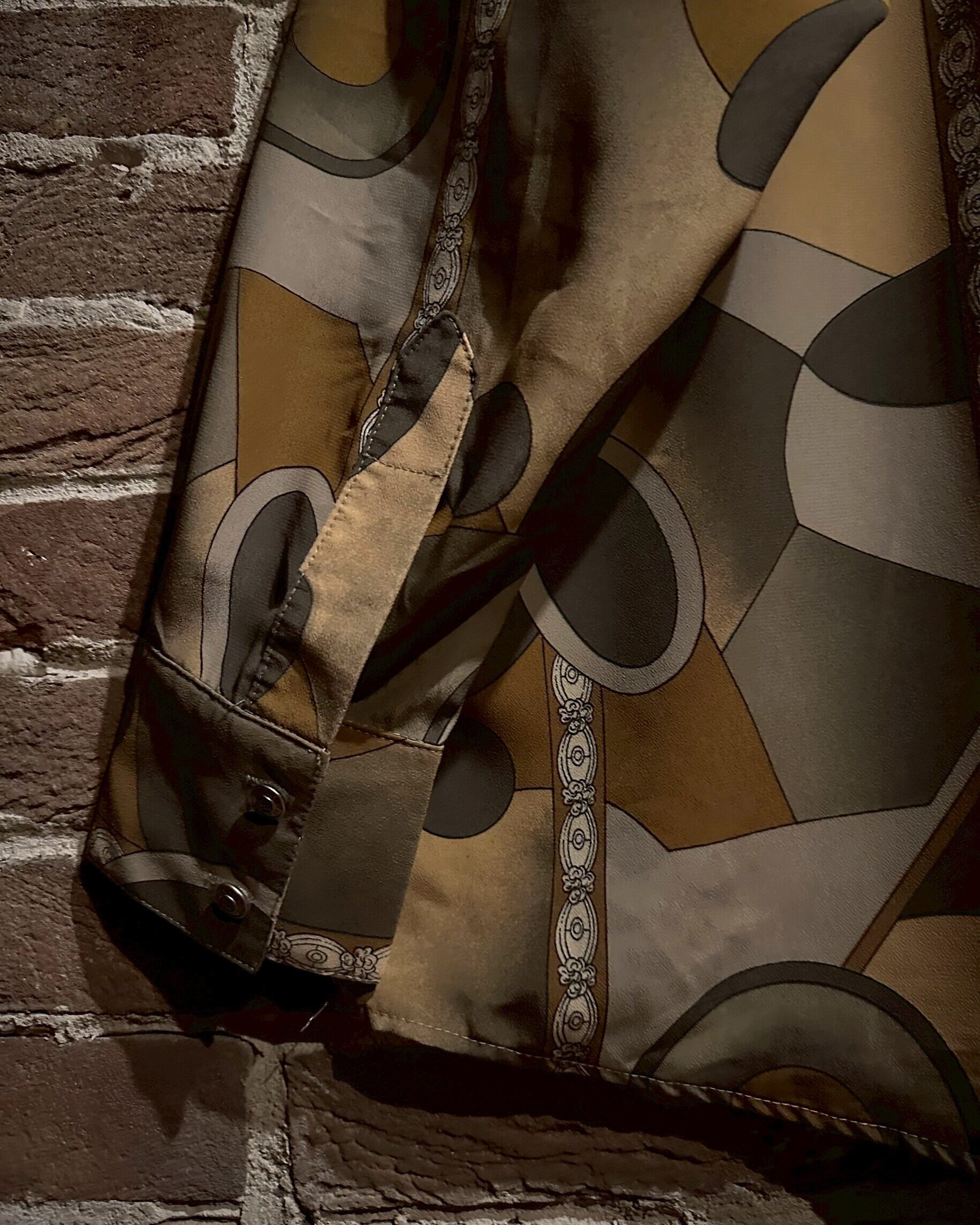 柔らかく滑らかなボディに、幾何学的なアート柄を載せた長袖シャツ。