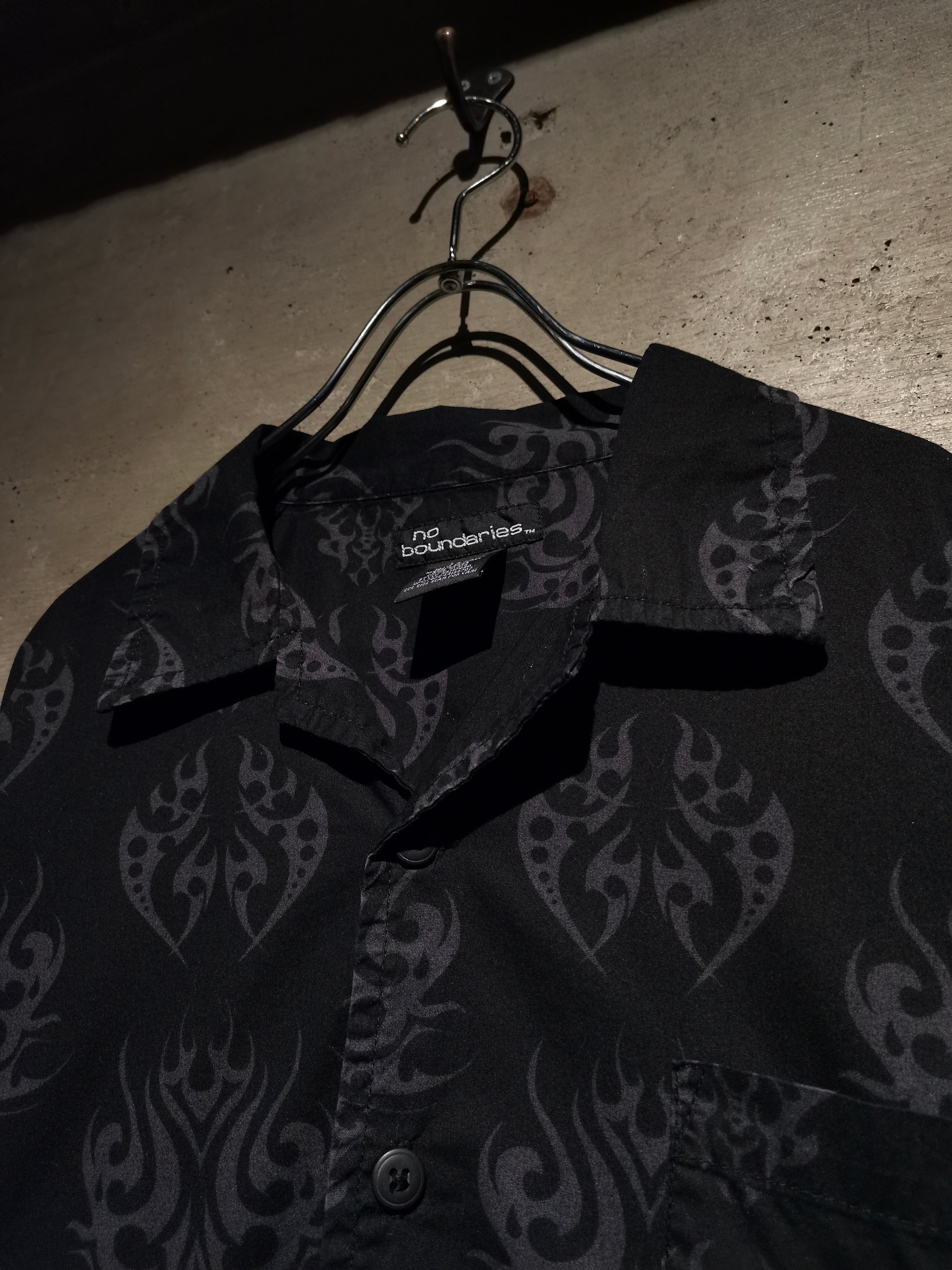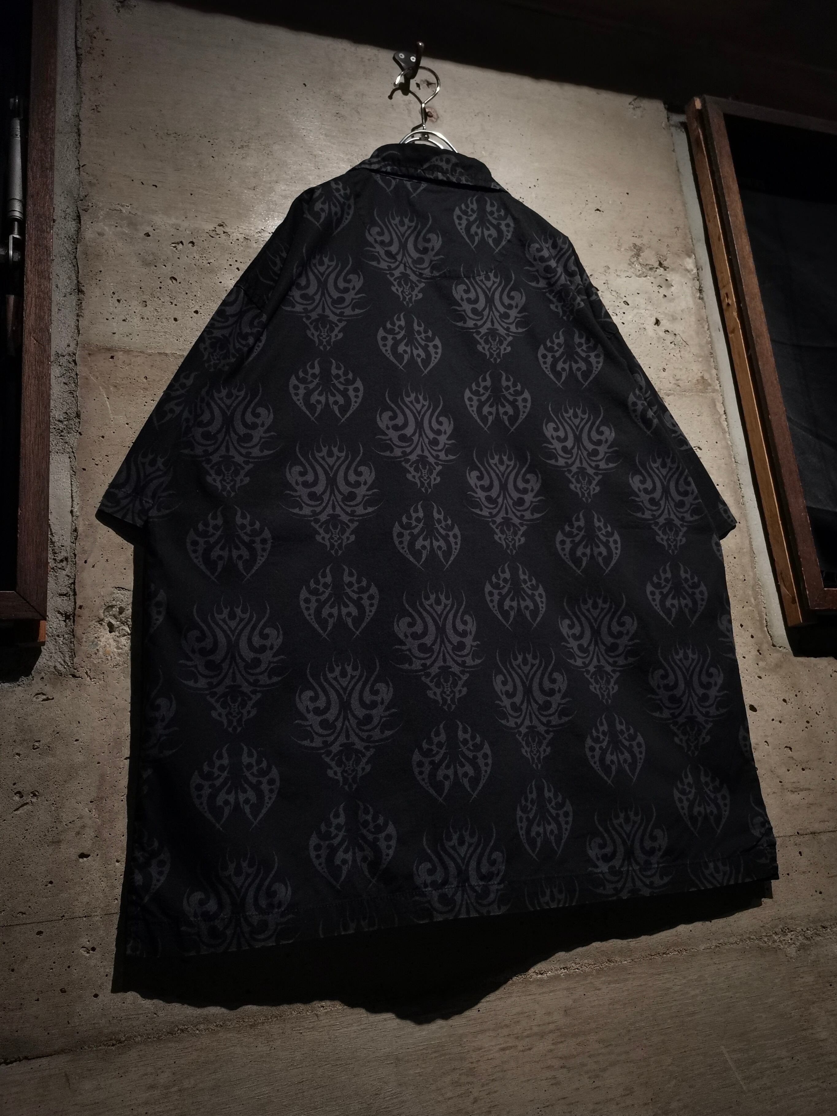 トライバルモチーフをボディ全面に配し、フロントにスケーターのデザインを載せた半袖オープンカラーシャツ。