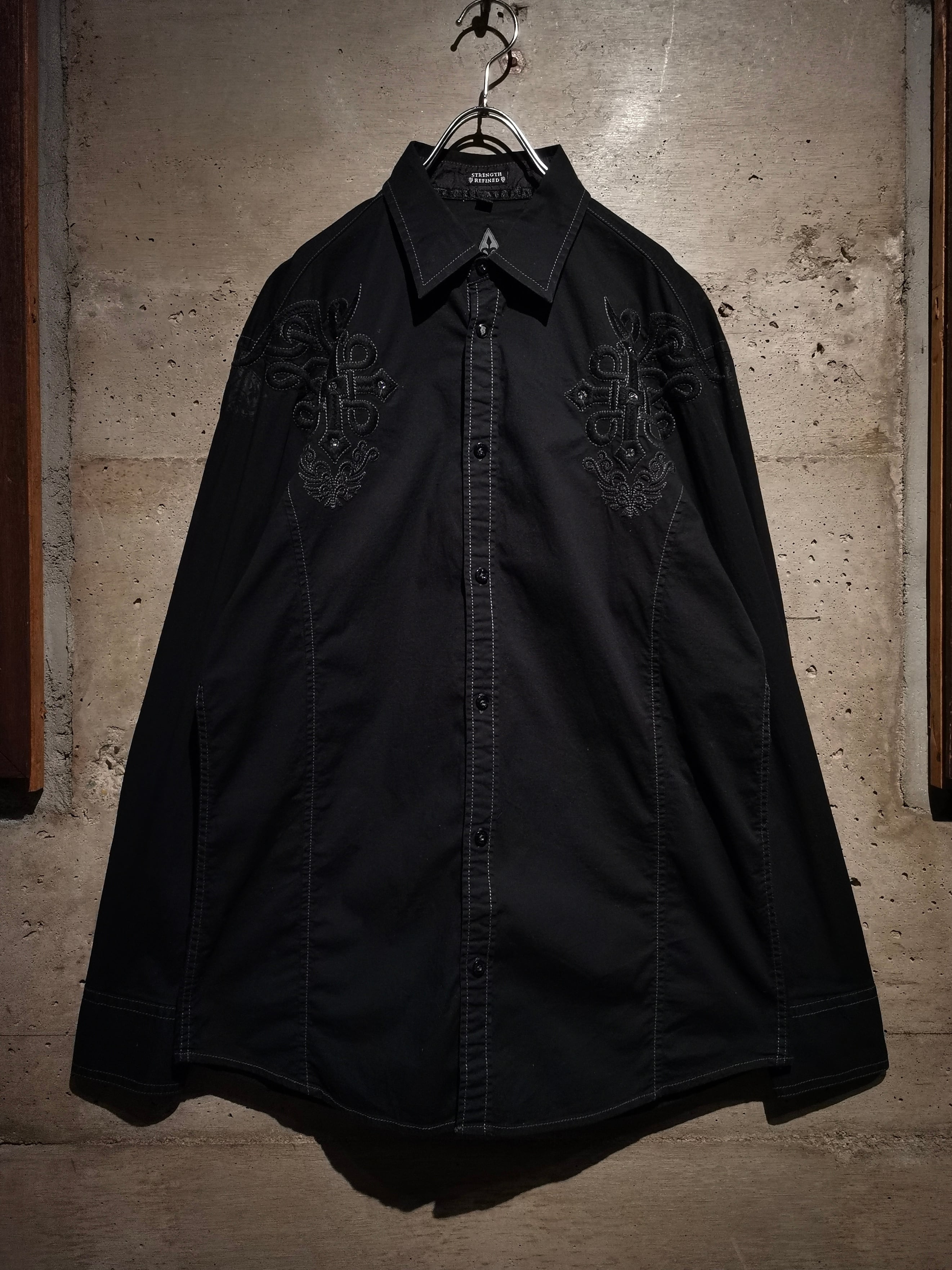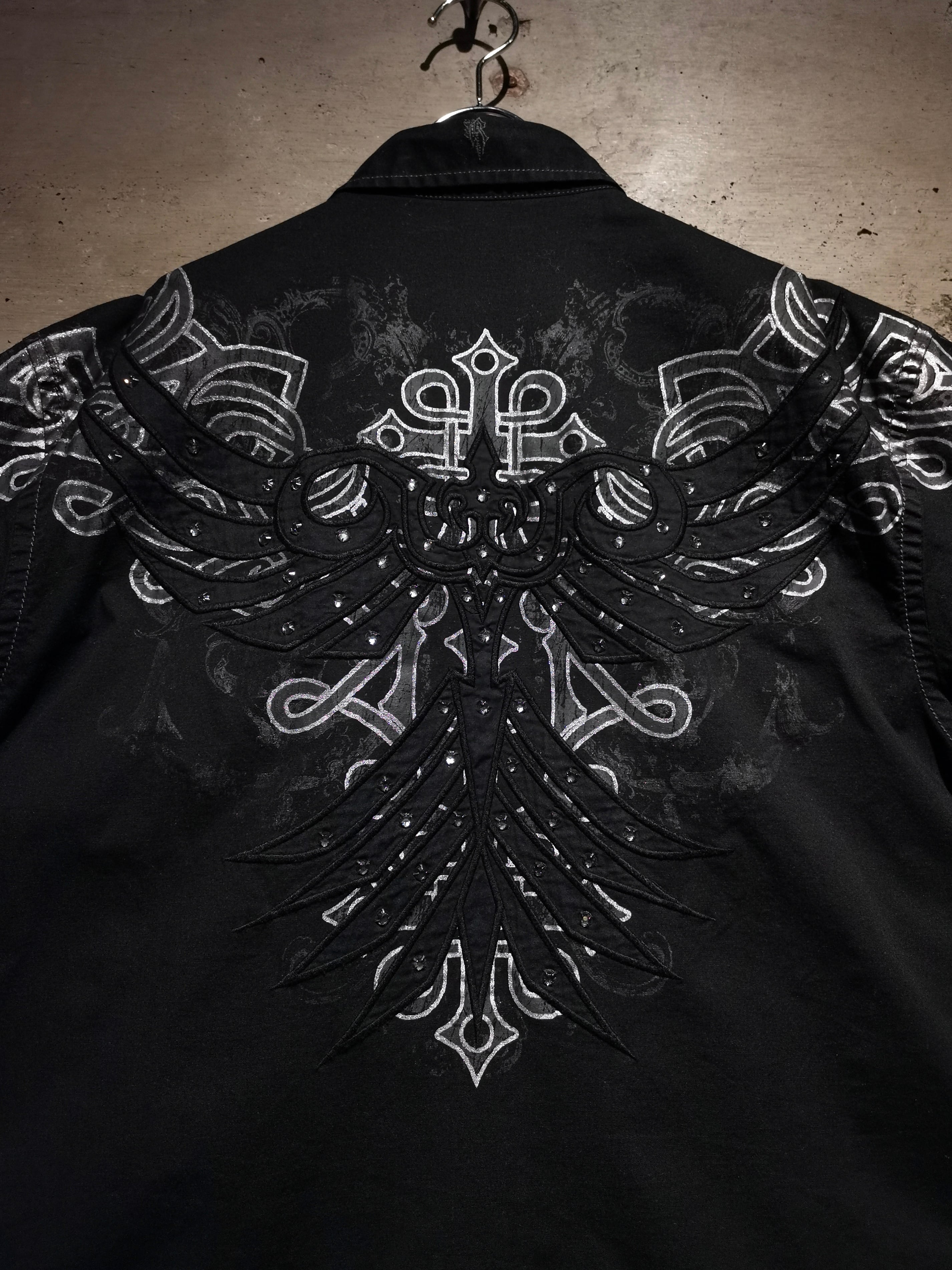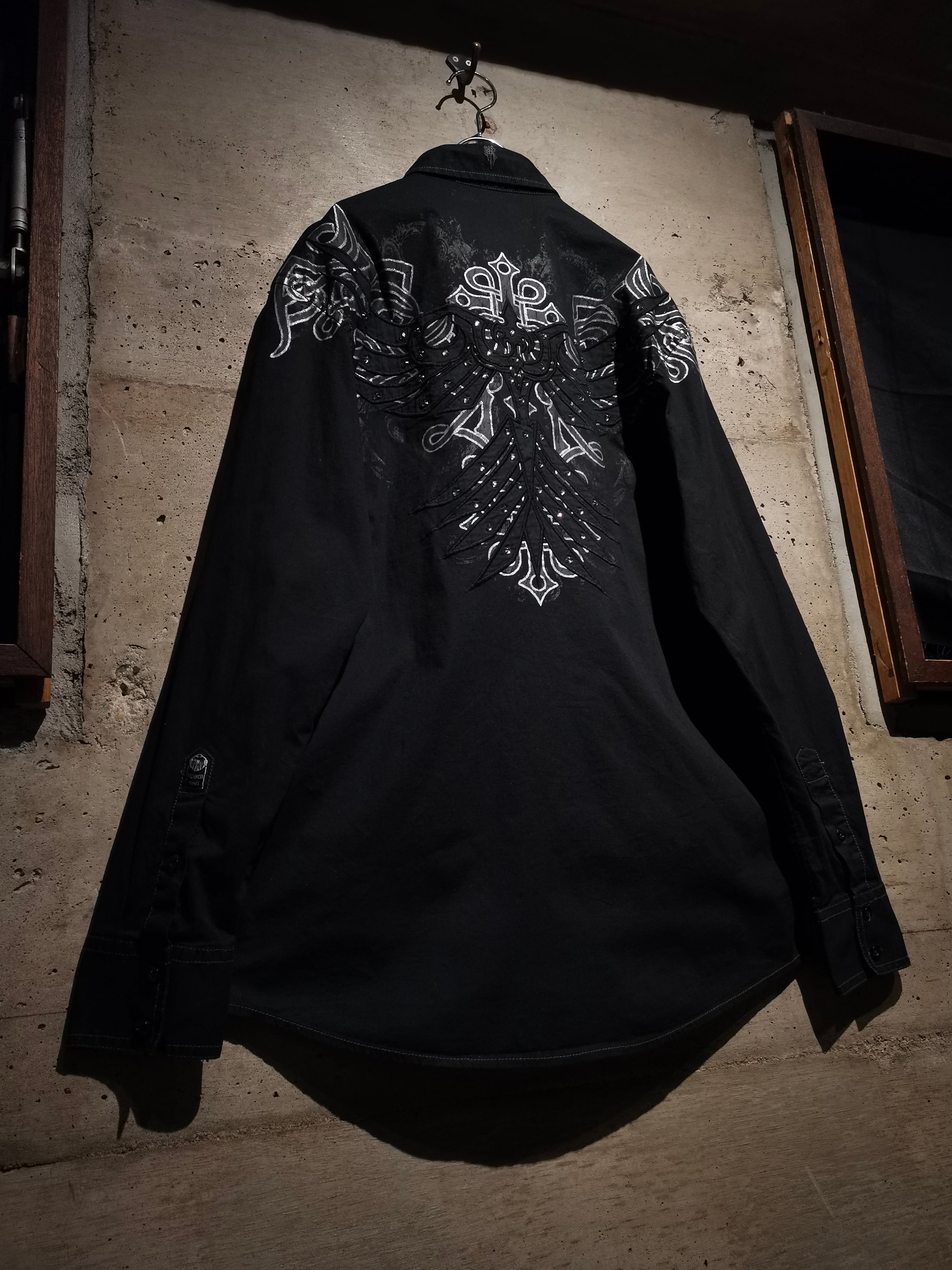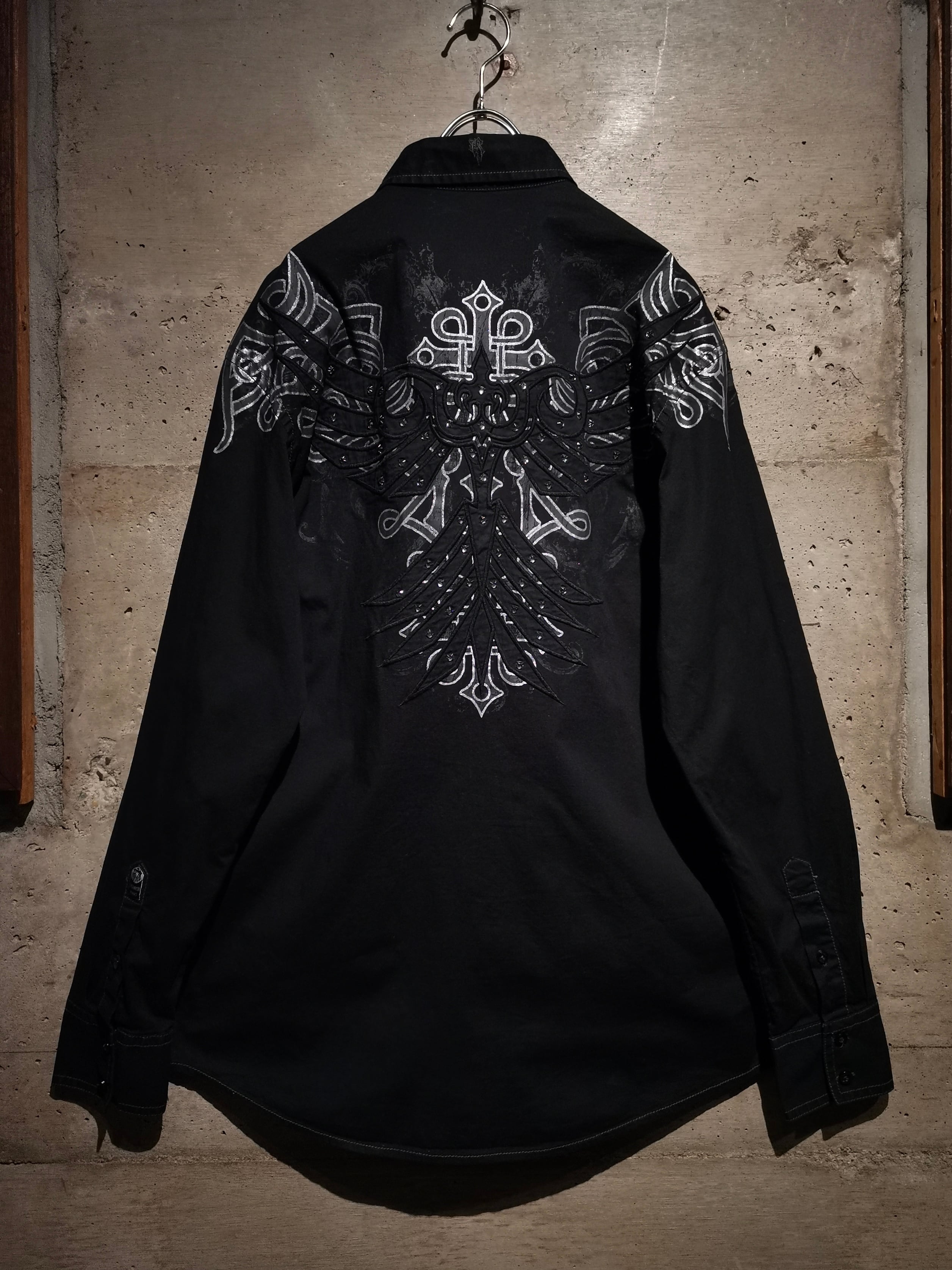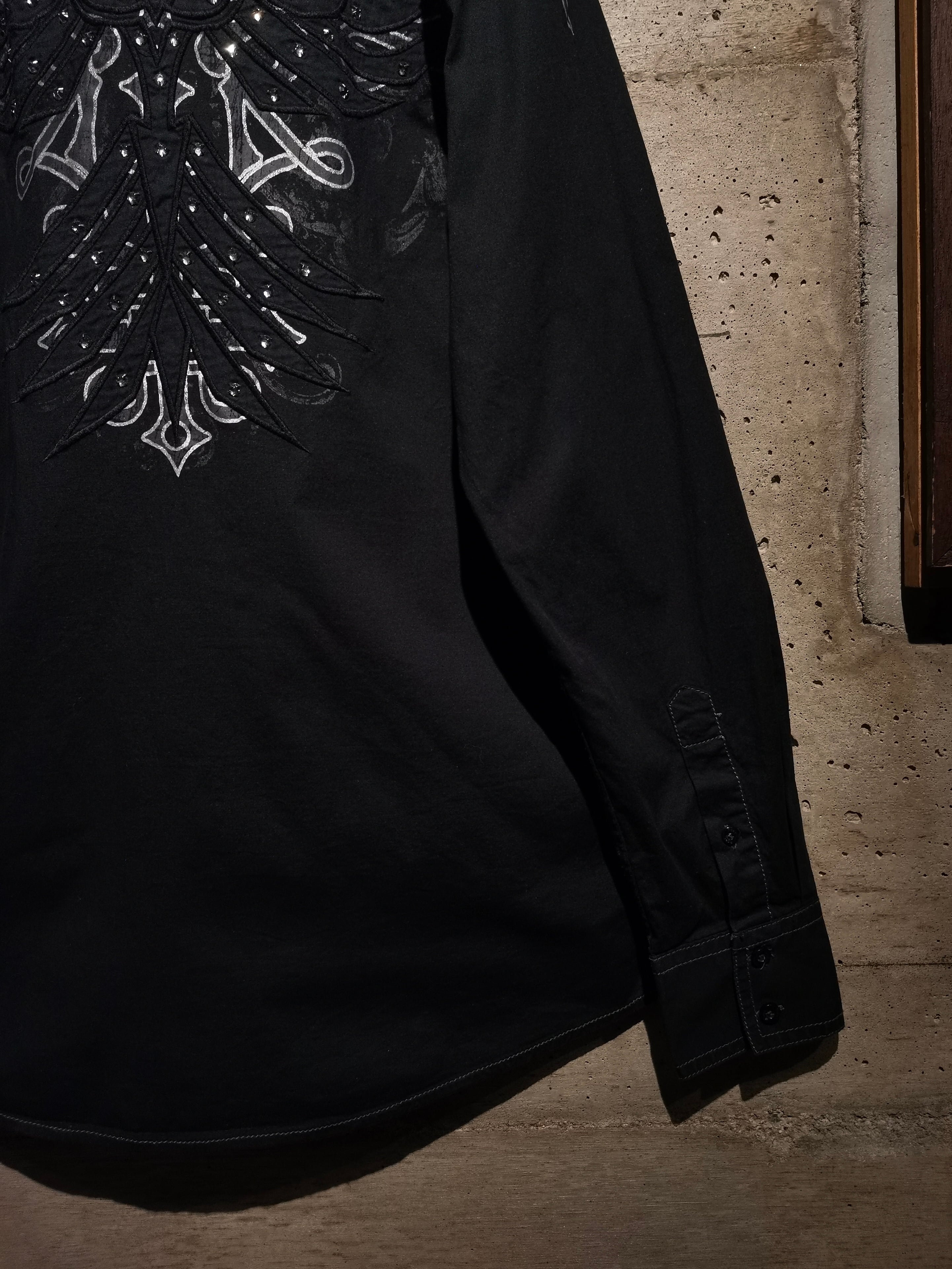 プリント×刺繍によって前背面にトライバル調のゴシックなデザインを載せた"Roar"の長袖シャツ。