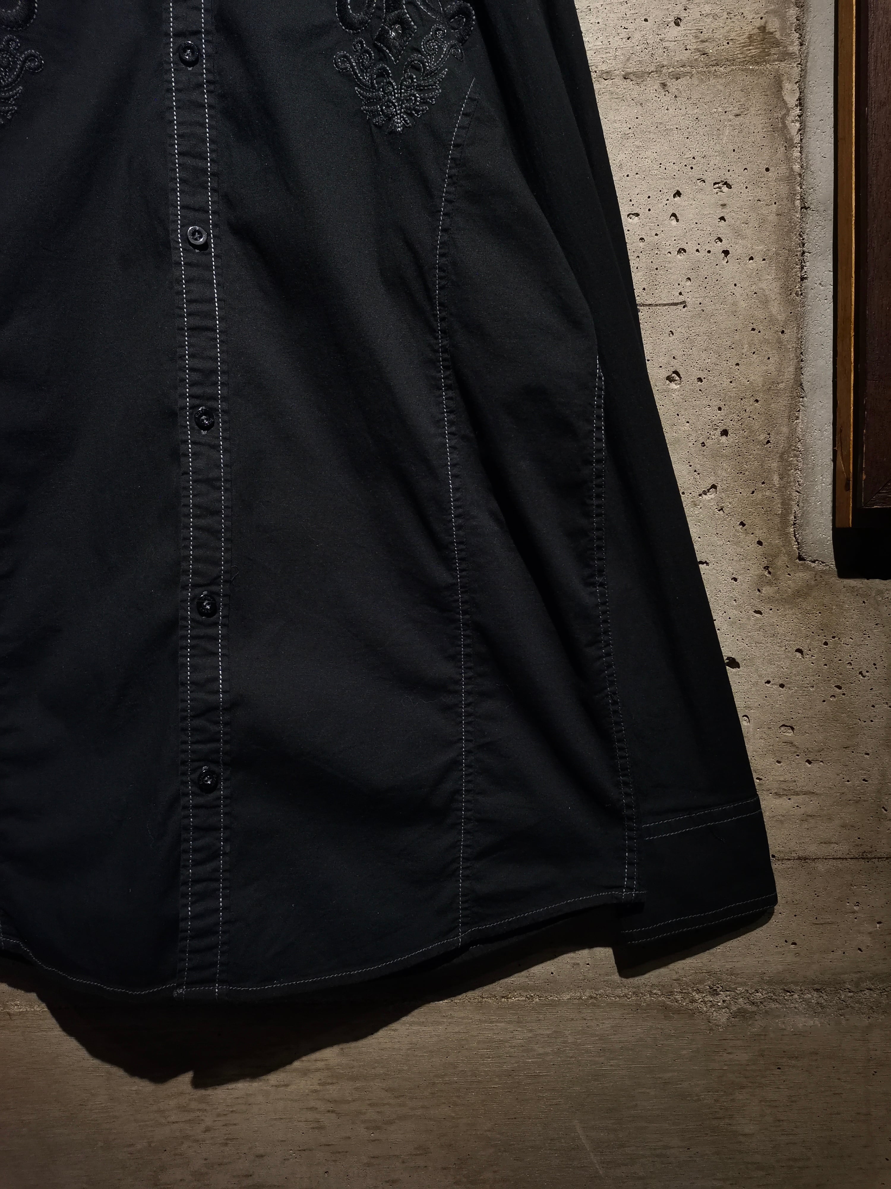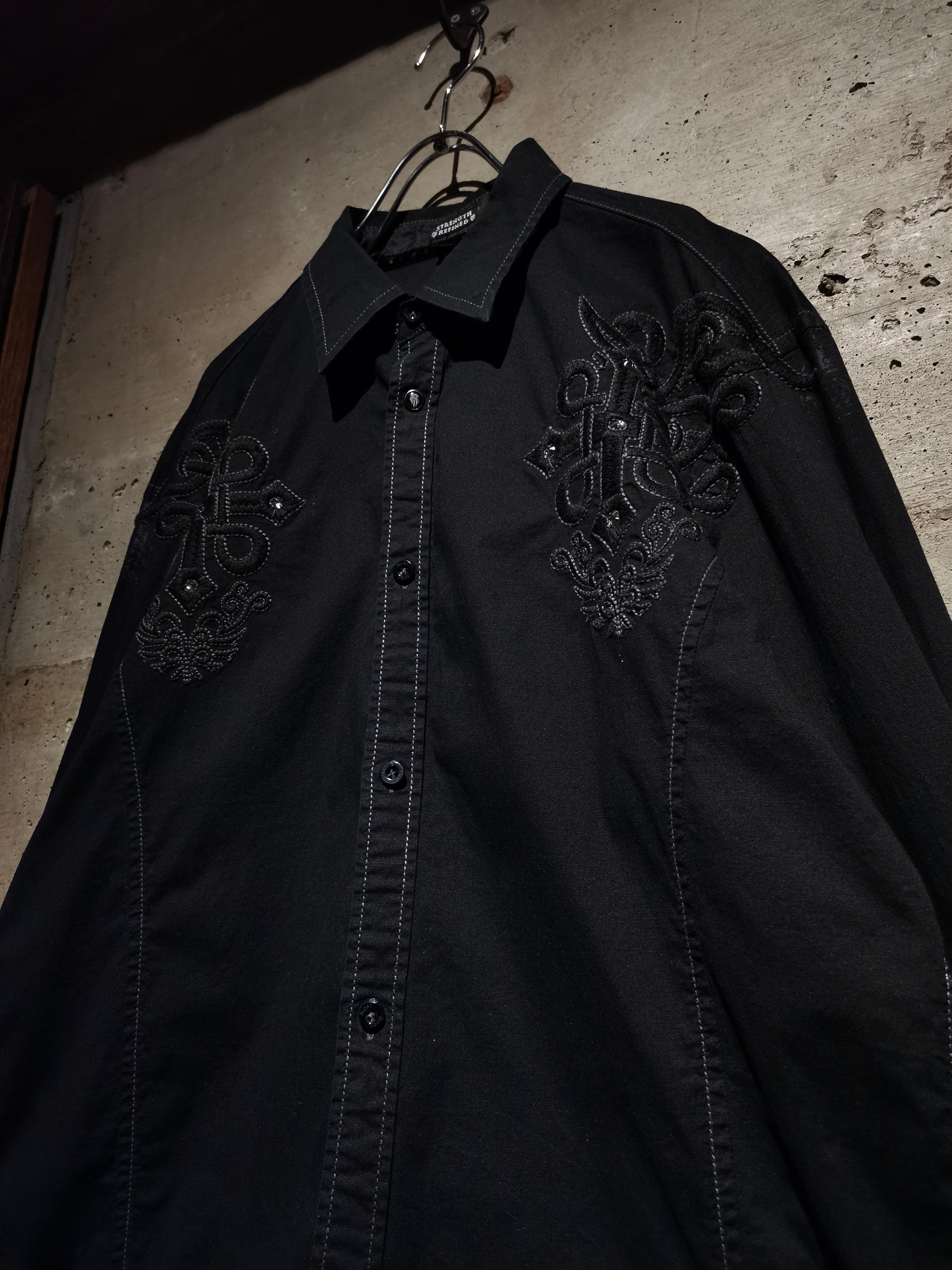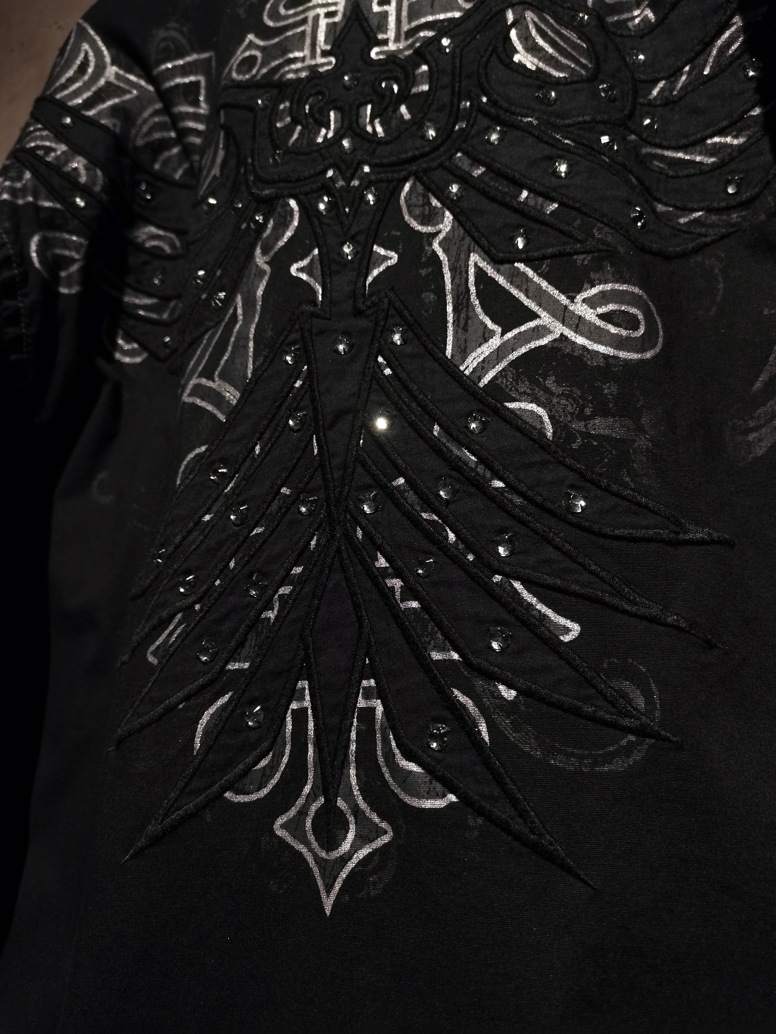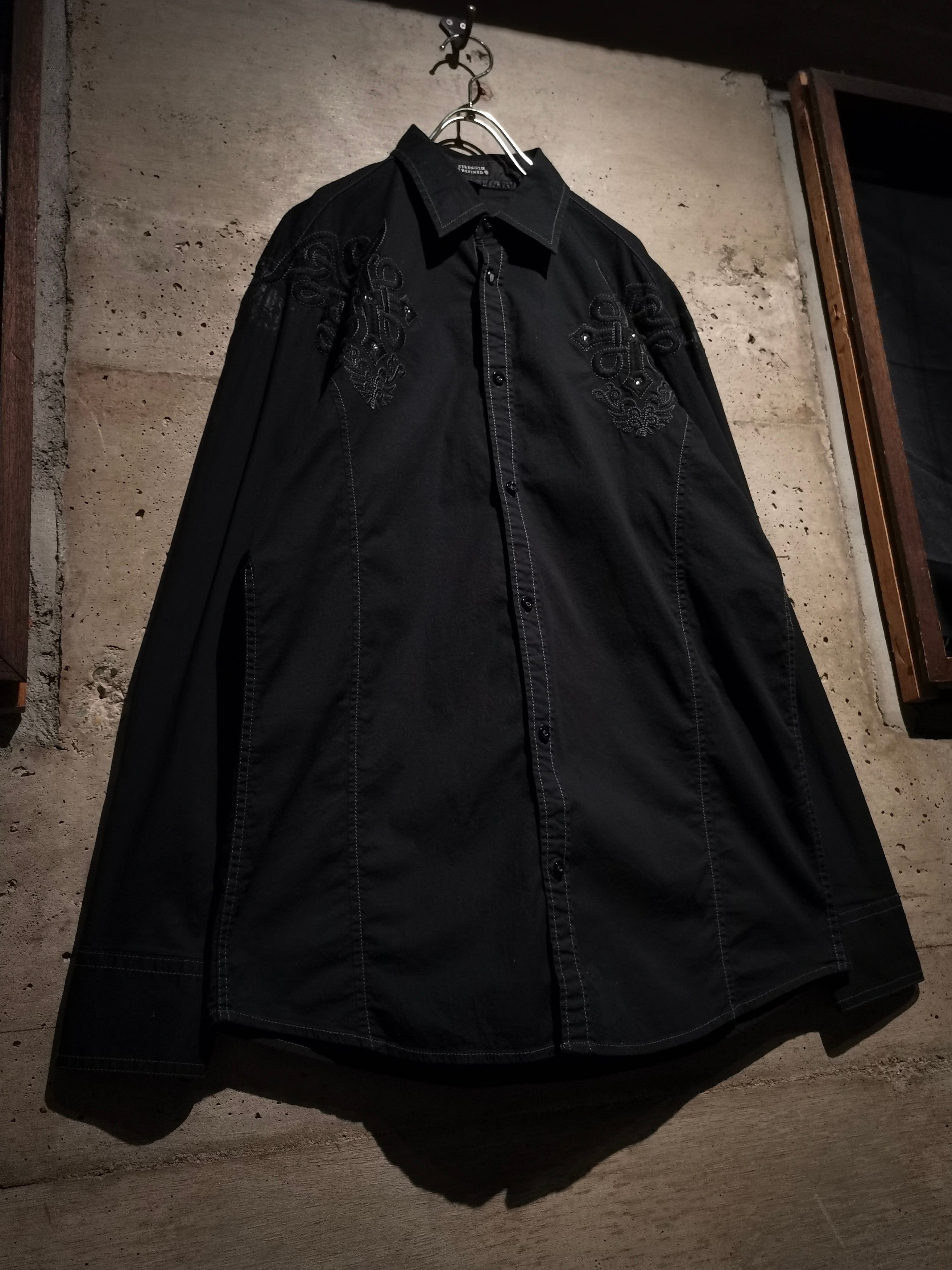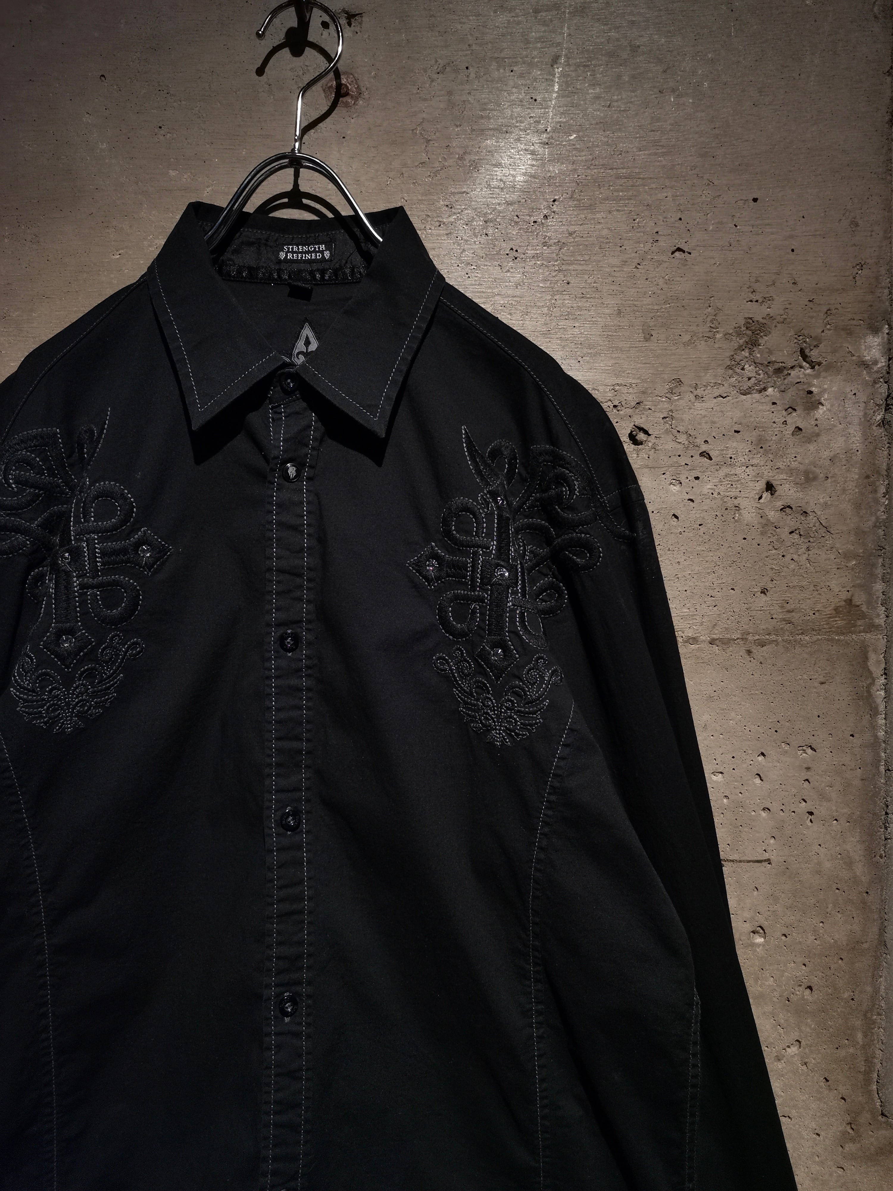 プリント×刺繍によって前背面にトライバル調のゴシックなデザインを載せた"Roar"の長袖シャツ。