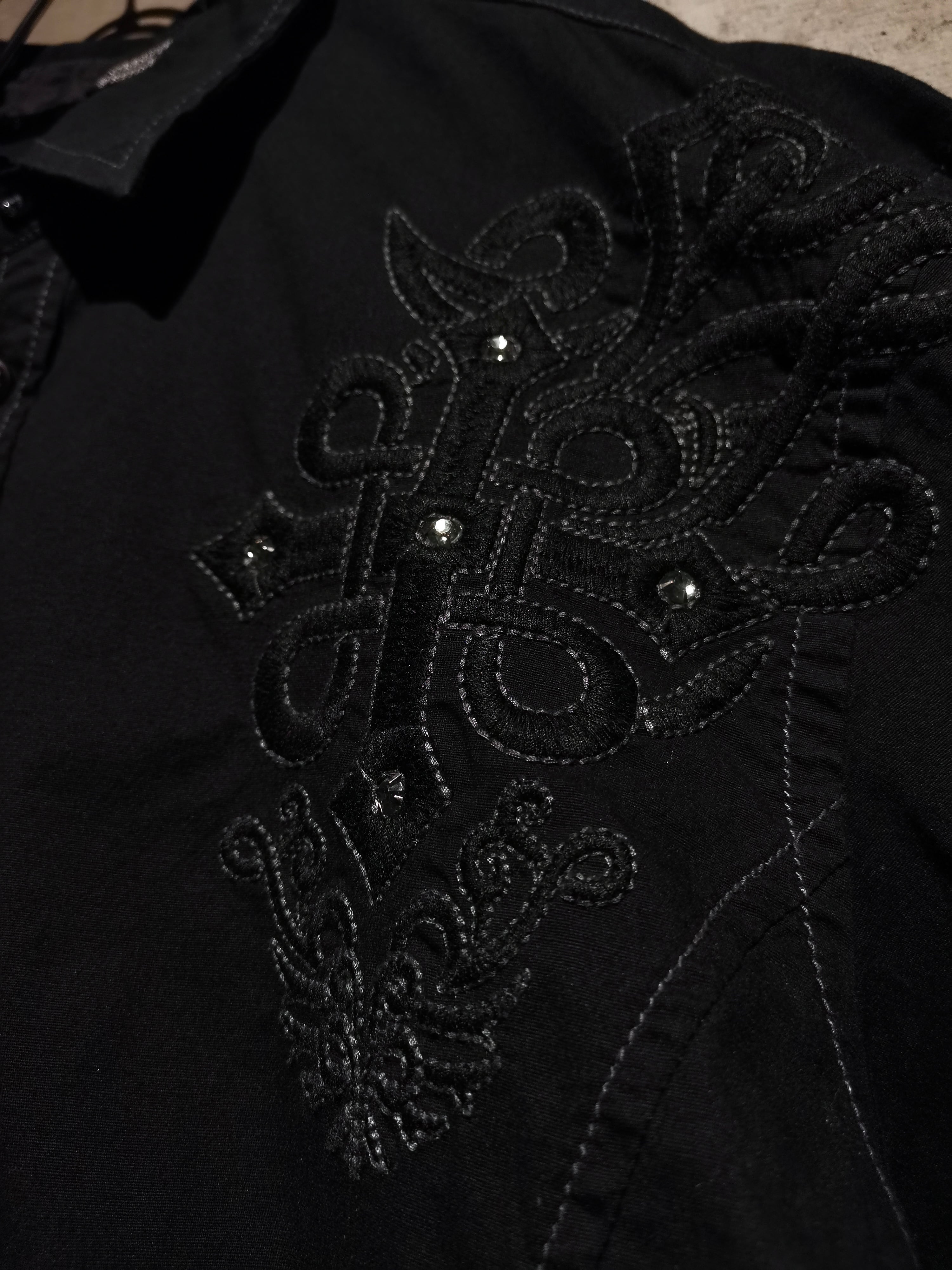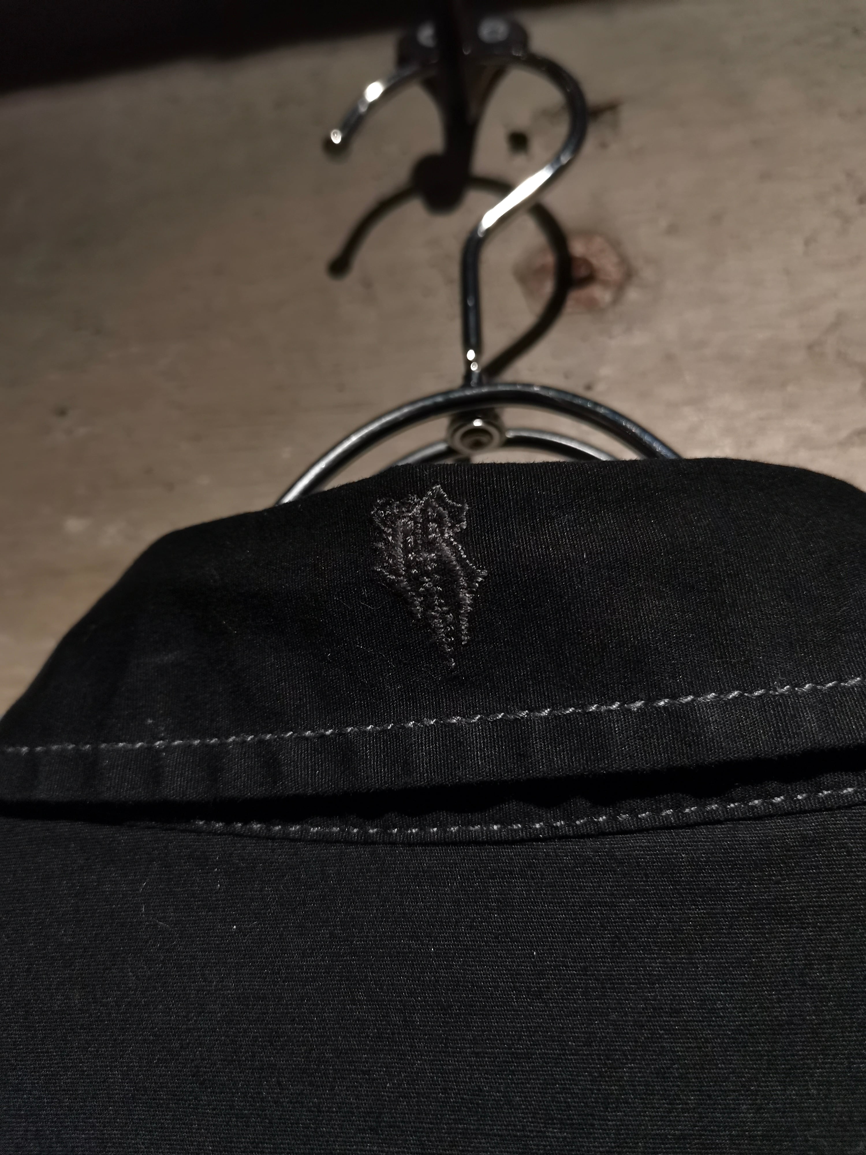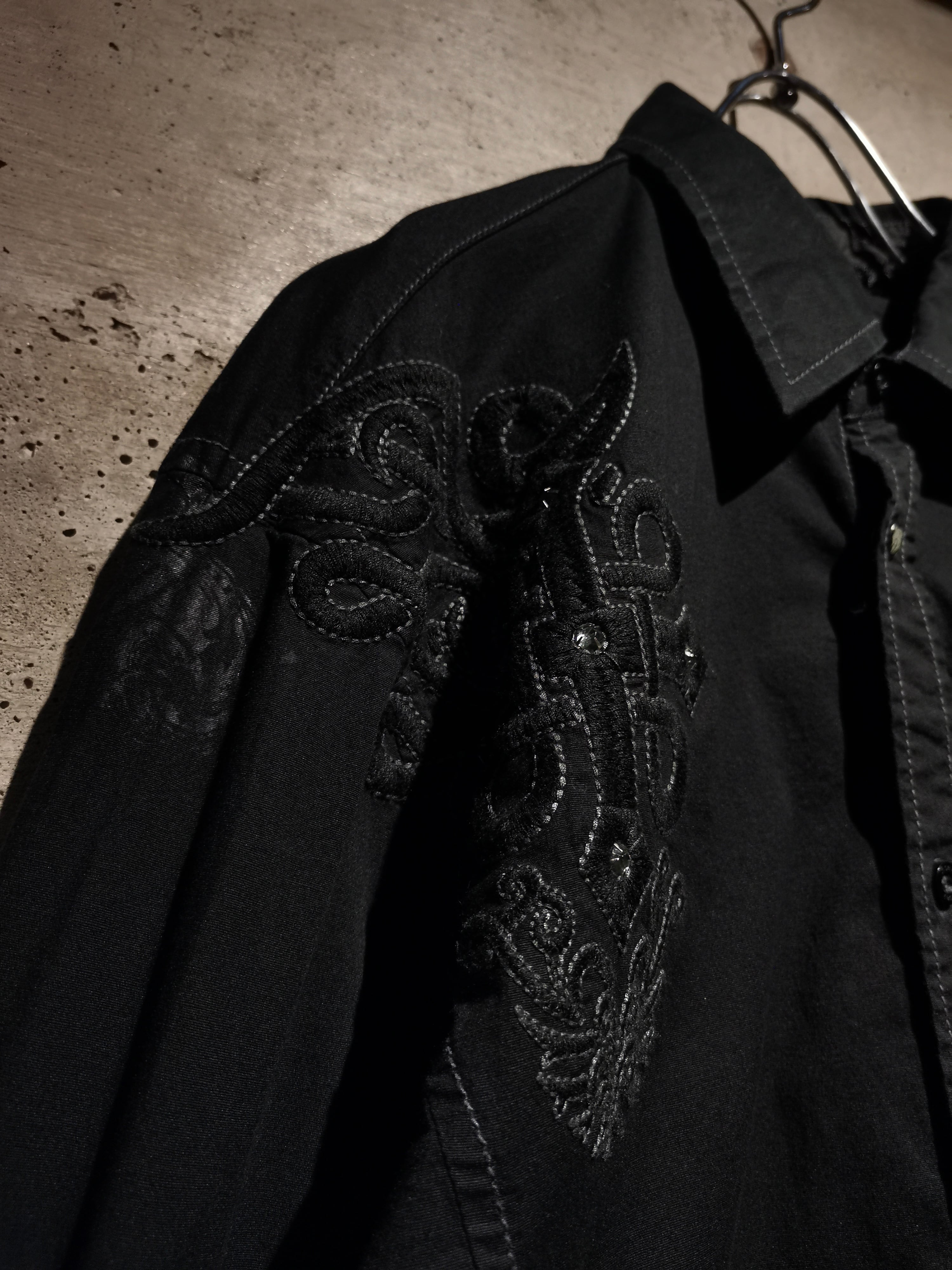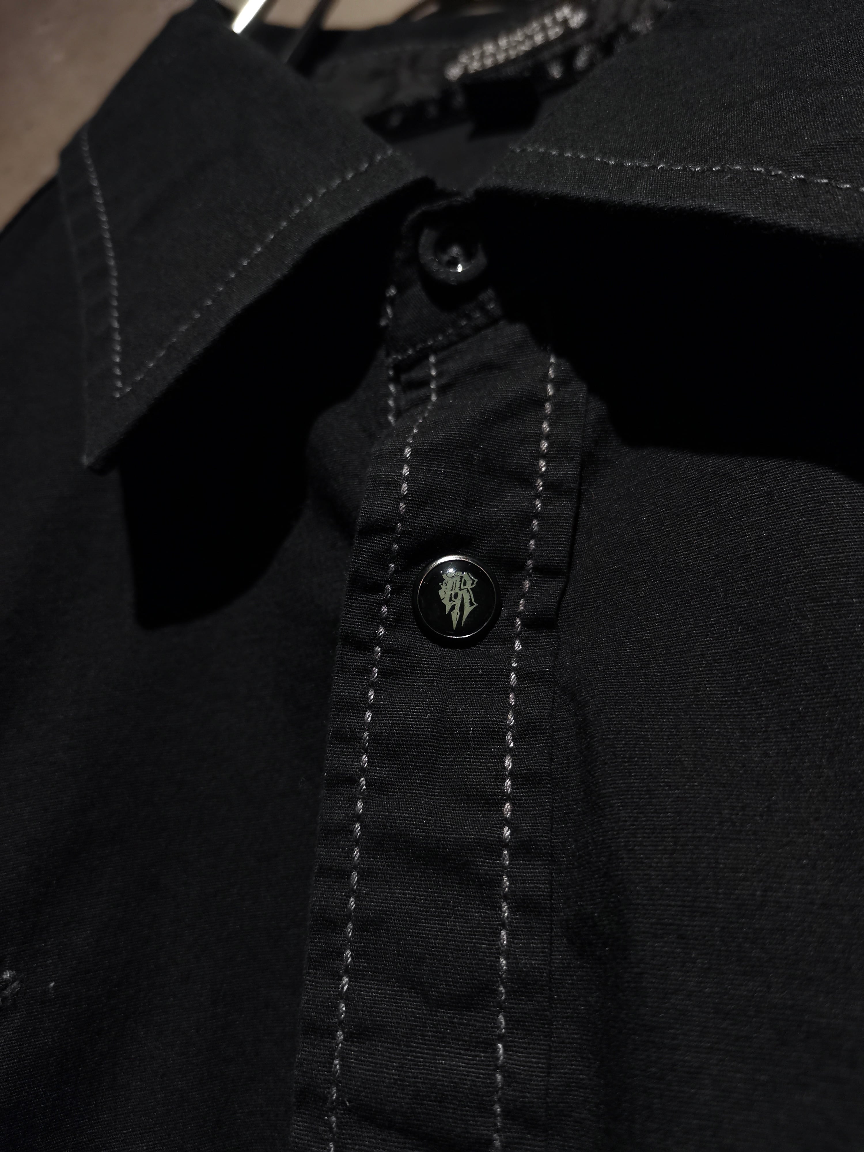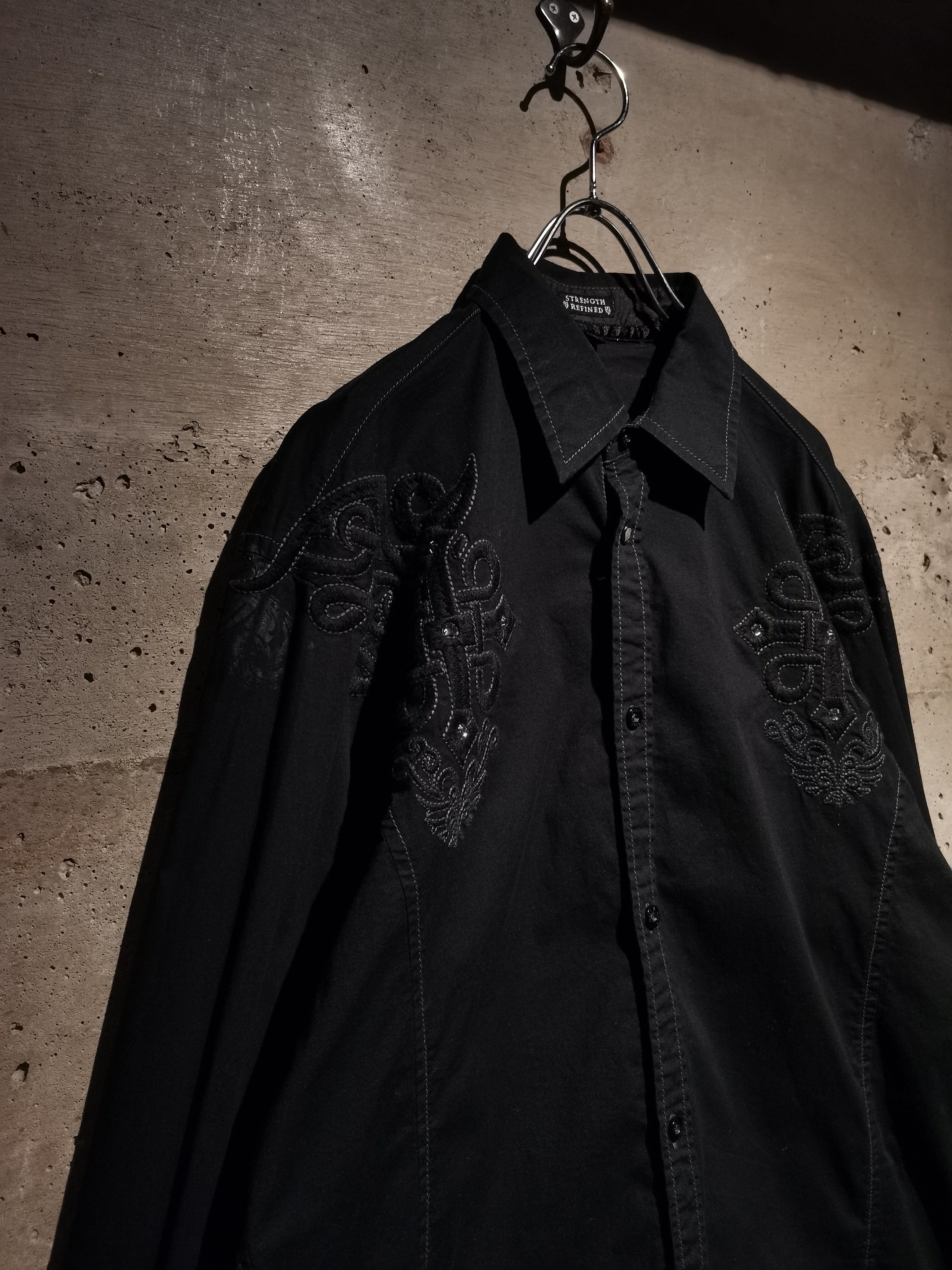 プリント×刺繍によって前背面にトライバル調のゴシックなデザインを載せた"Roar"の長袖シャツ。