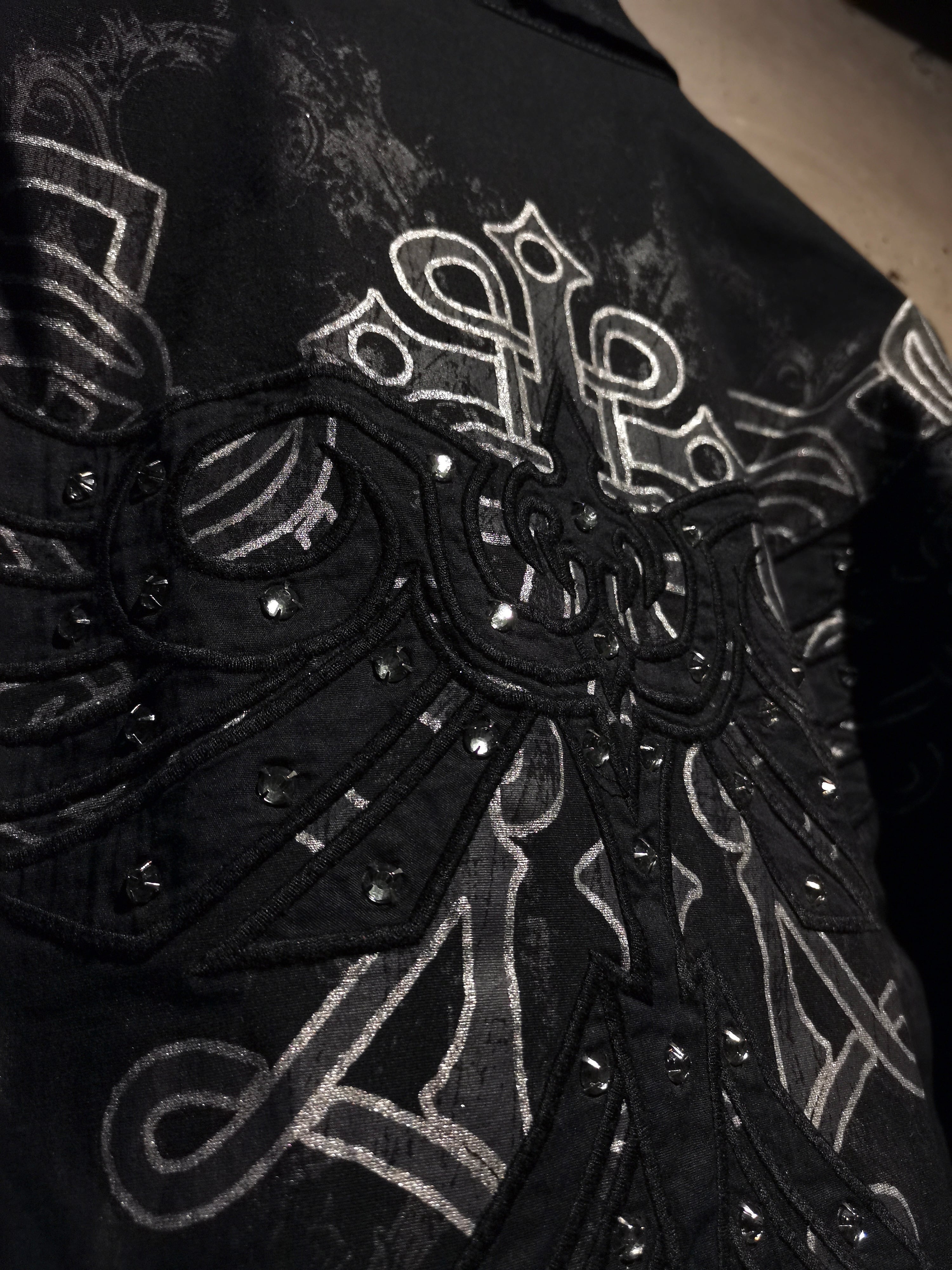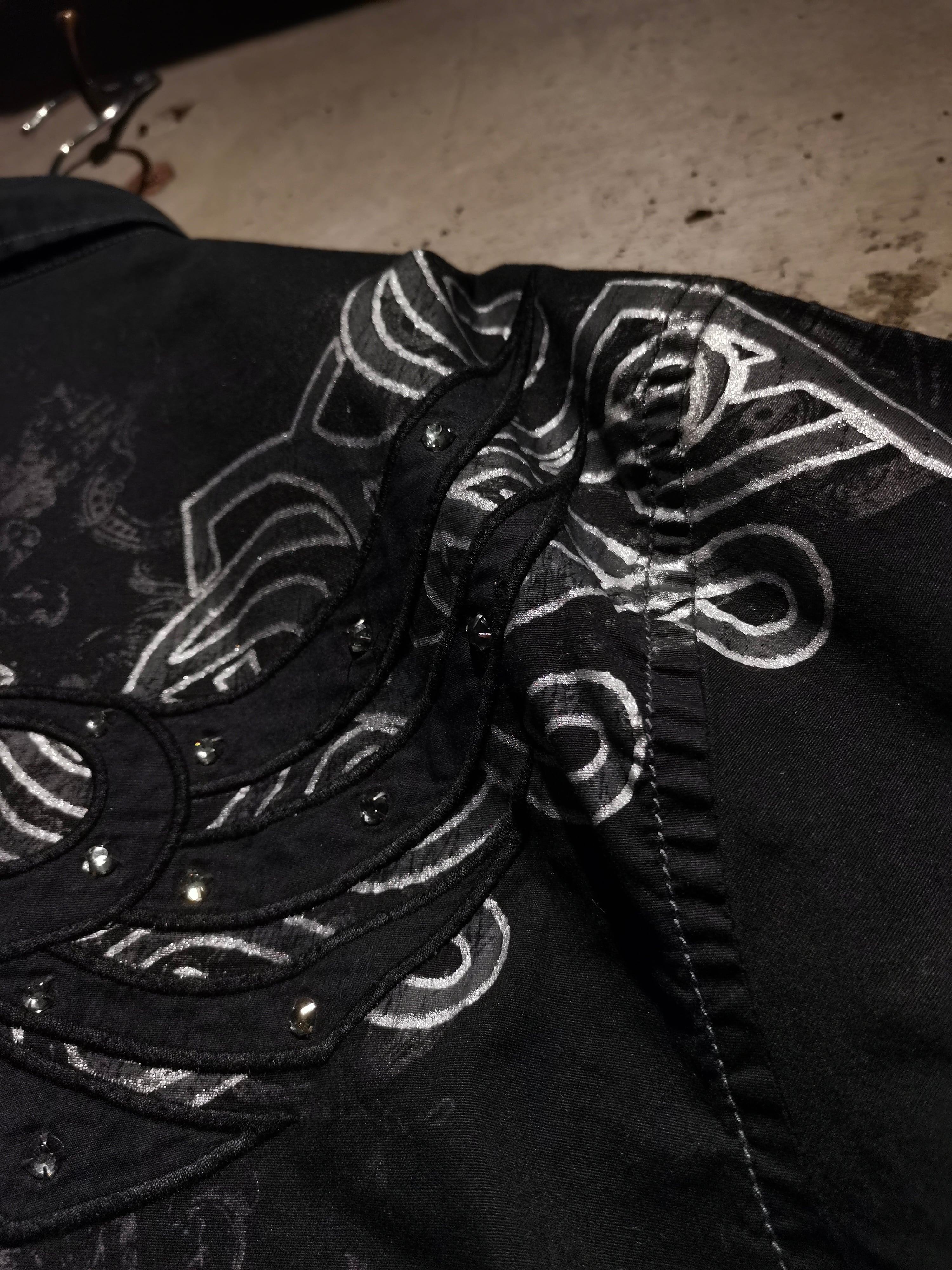 立体的な刺繍やラインストーンの装飾、そして随所に走らせた白のステッチワークによって奥行きのある見栄えを演出。ブラックを基調としたカラーリングながらも抜群の存在感を見せています。