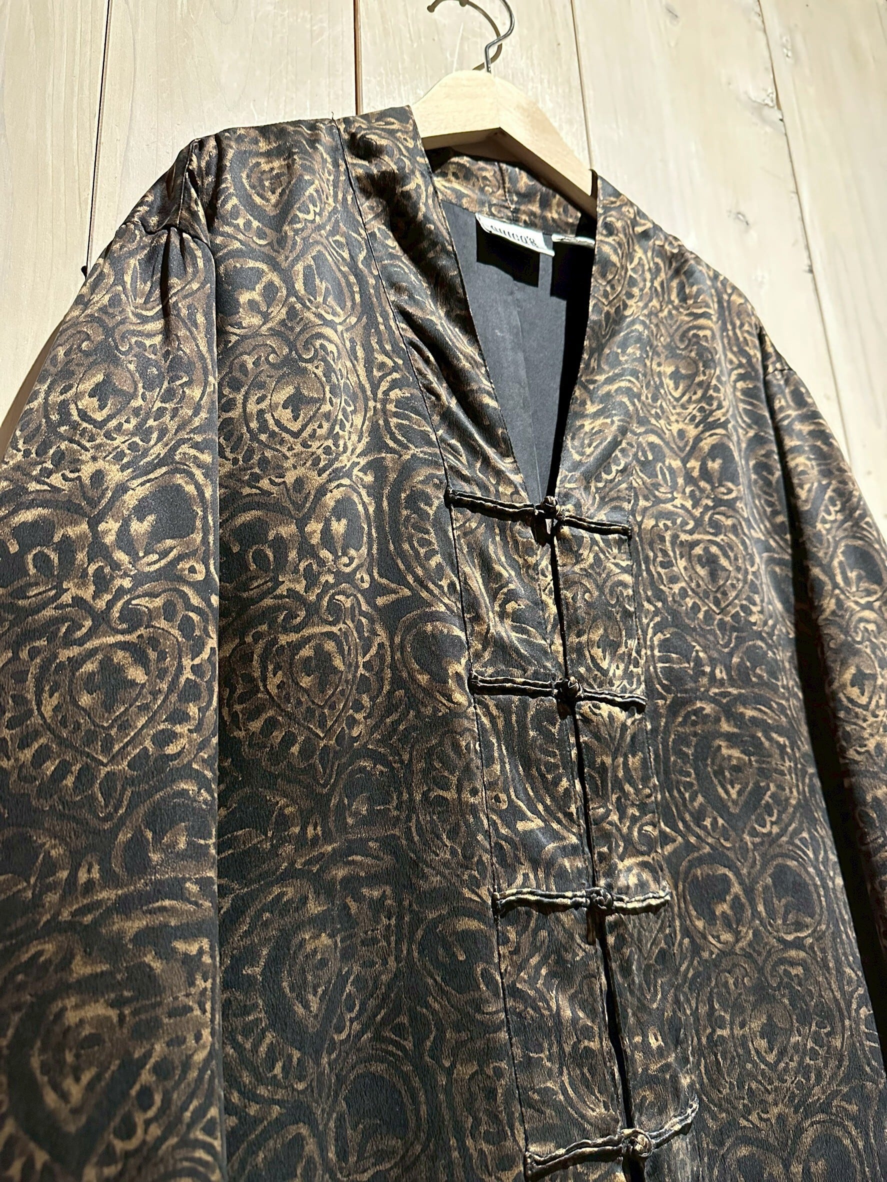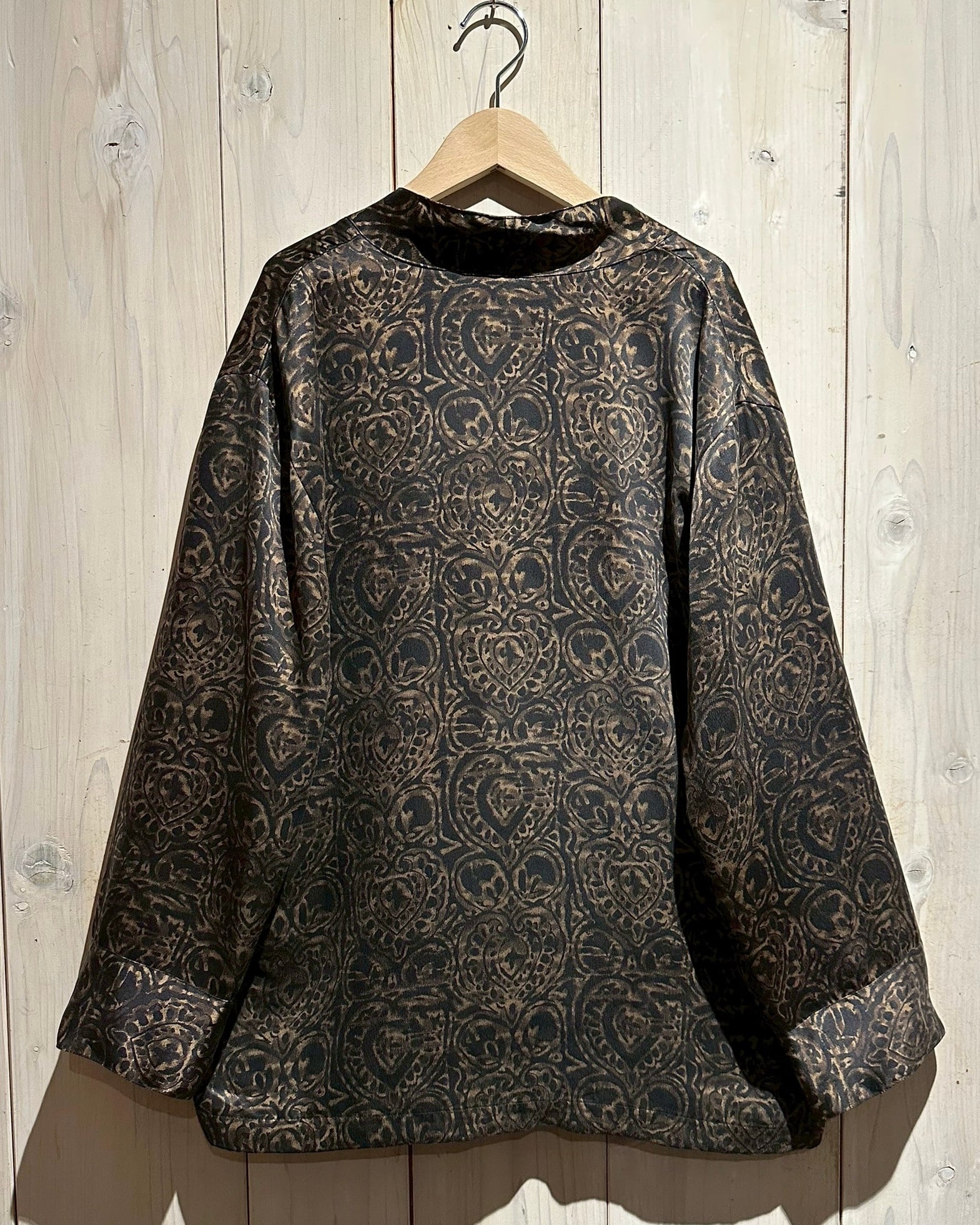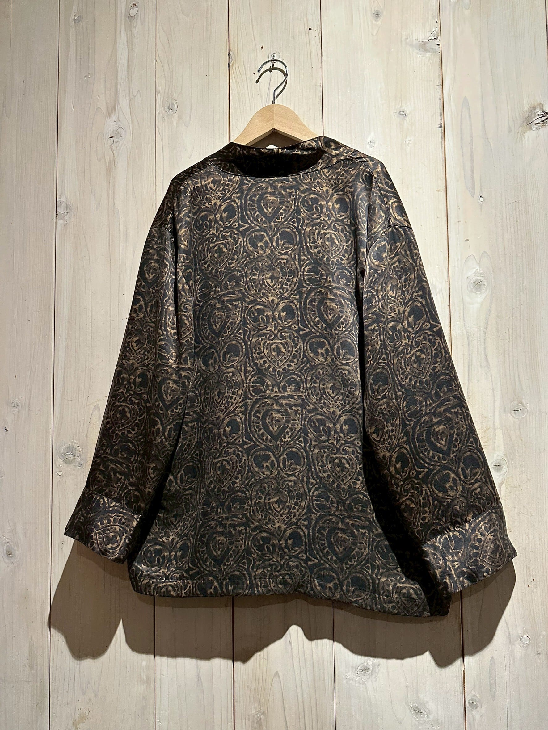 美しいシルクの光沢を帯びたブラックのボディに、ダマスク柄を載せたノーカラーのシャツジャケット。