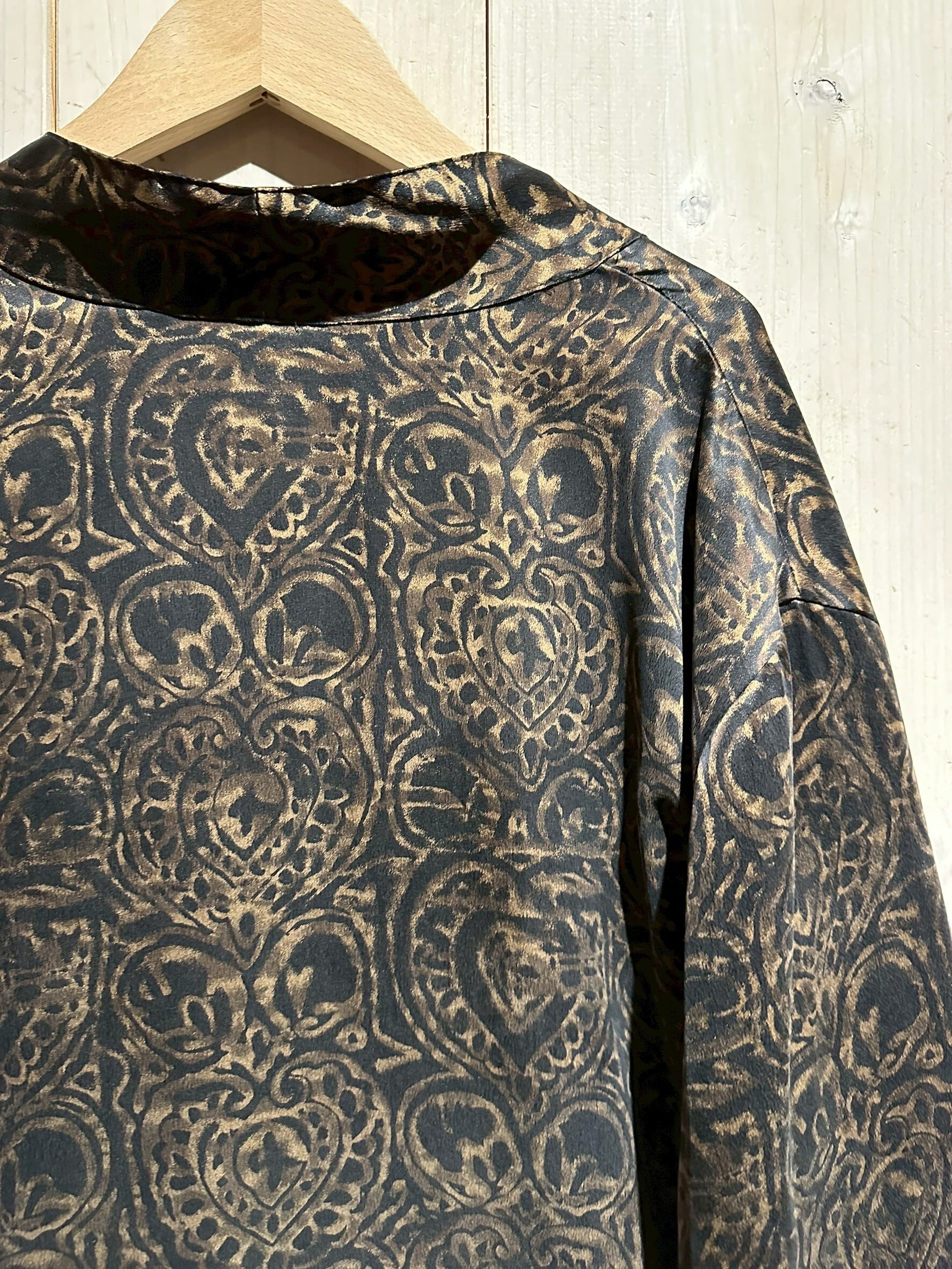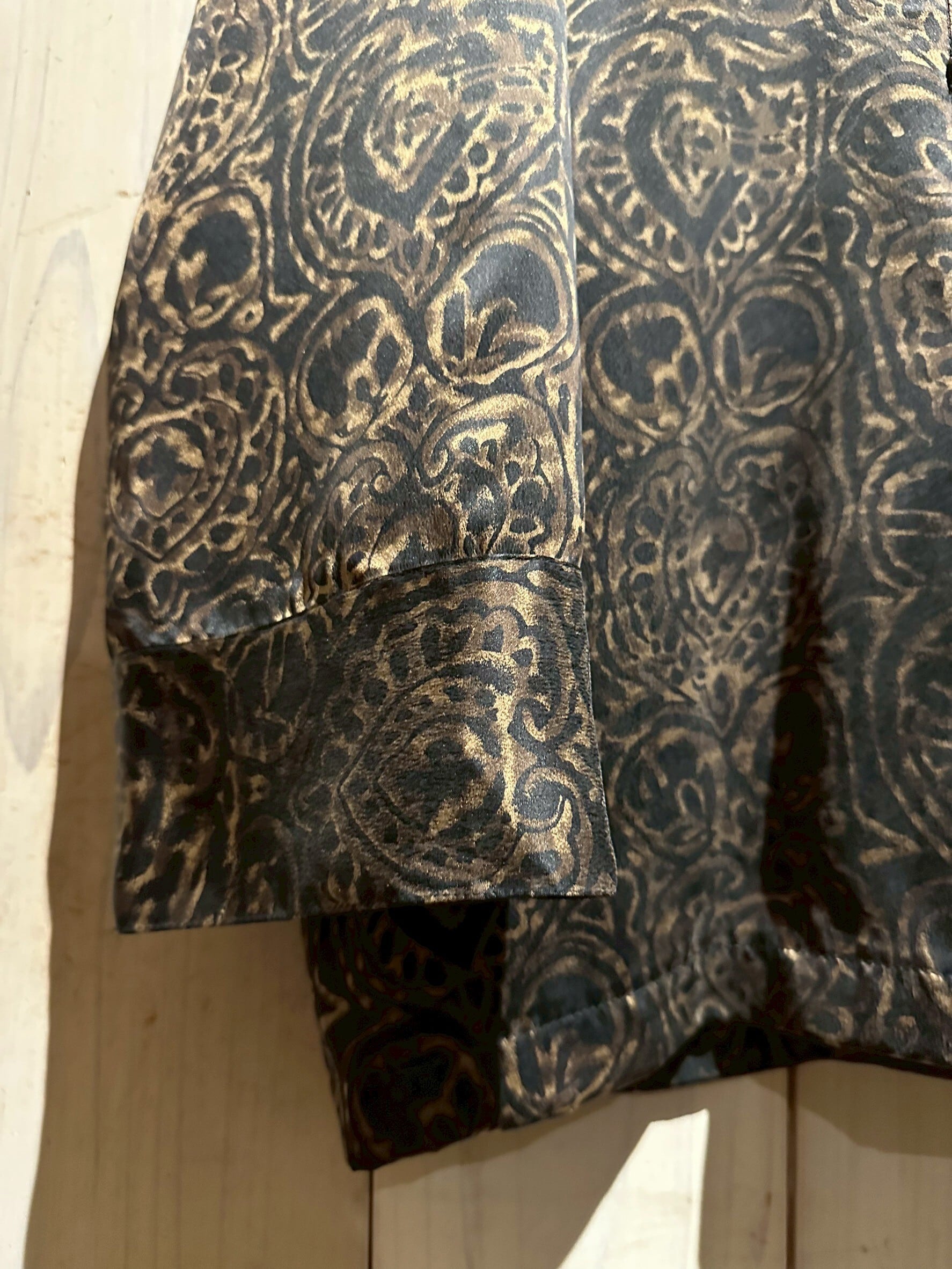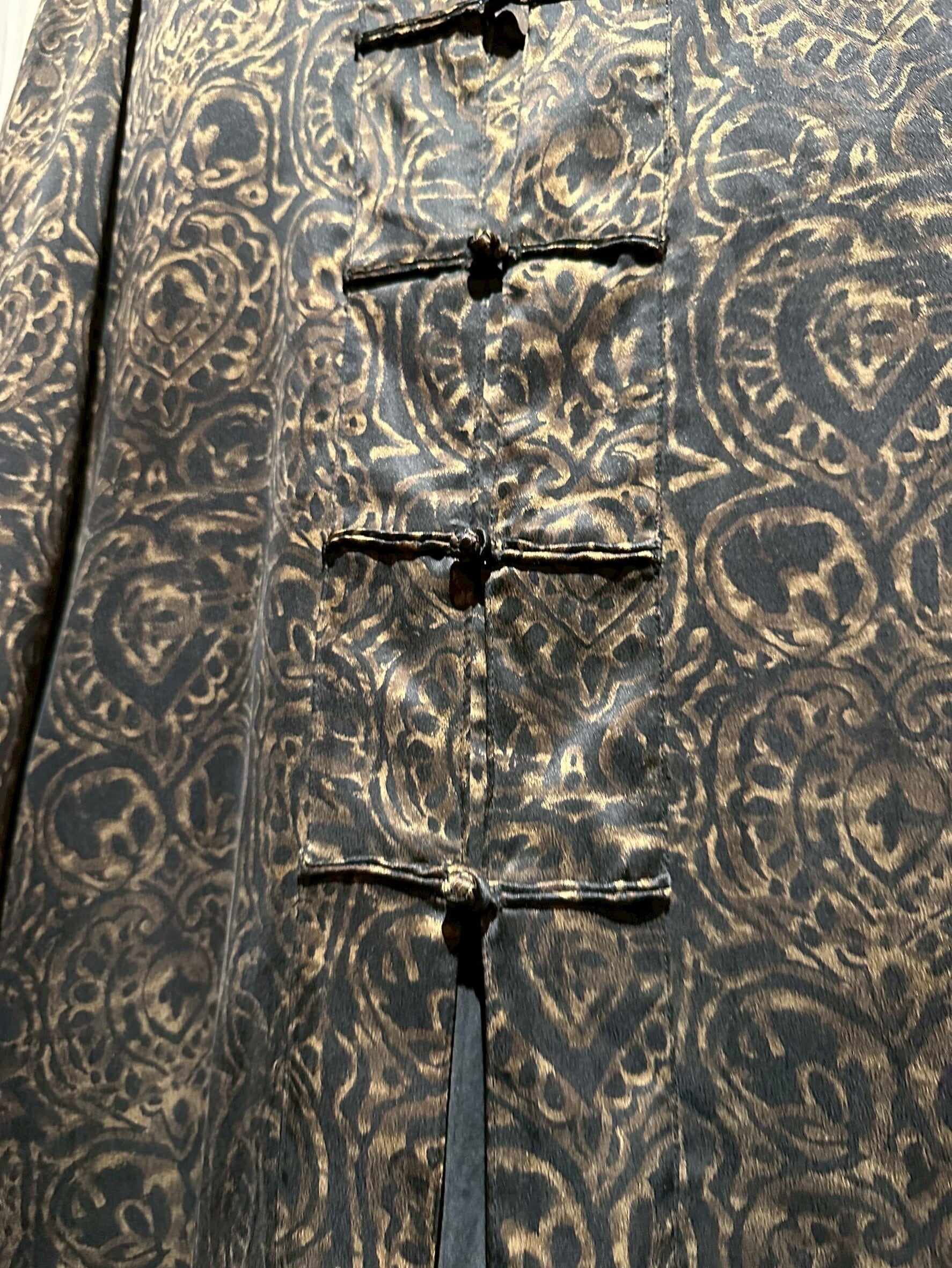 美しいシルクの光沢を帯びたブラックのボディに、ダマスク柄を載せたノーカラーのシャツジャケット。