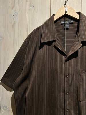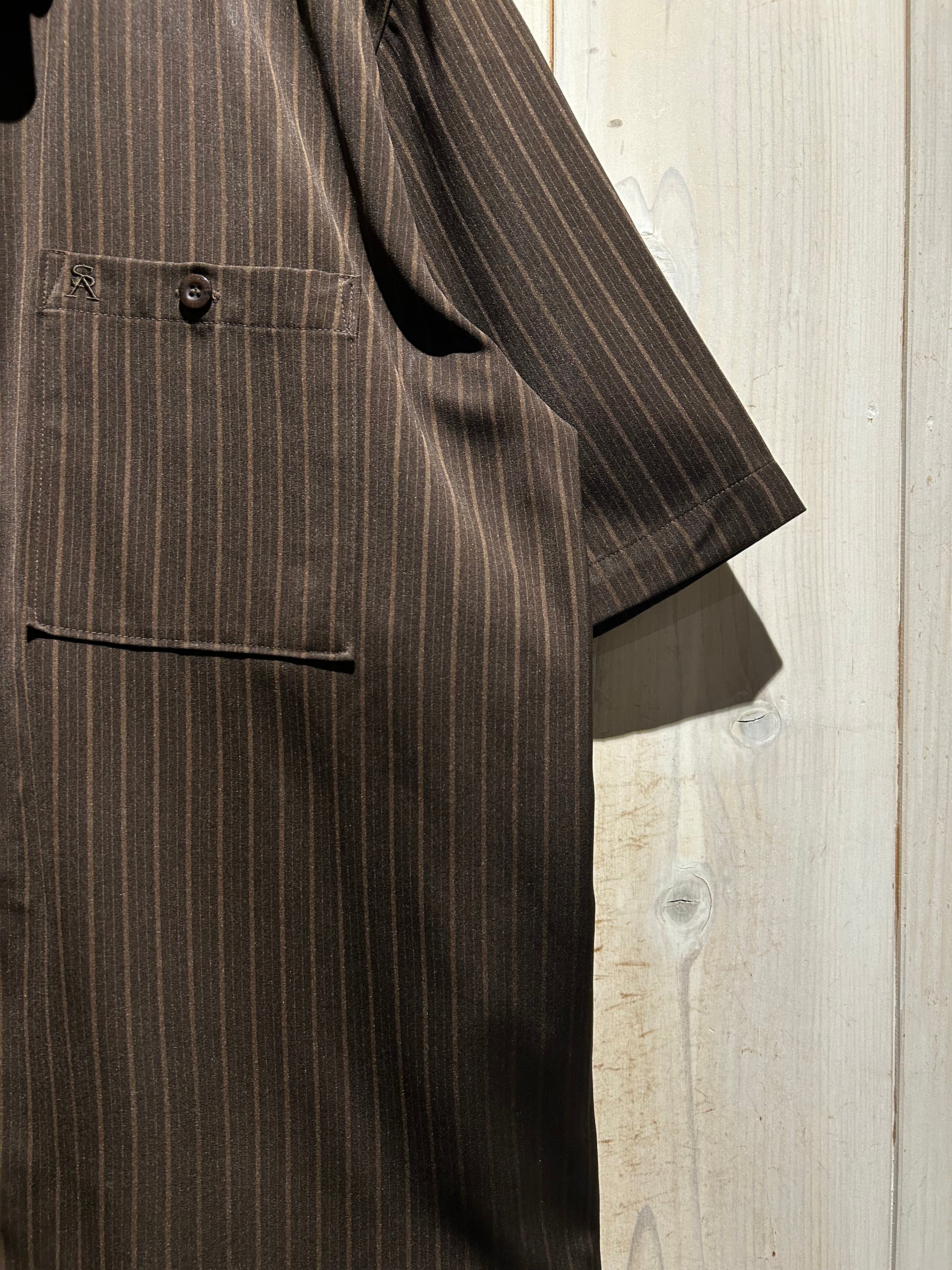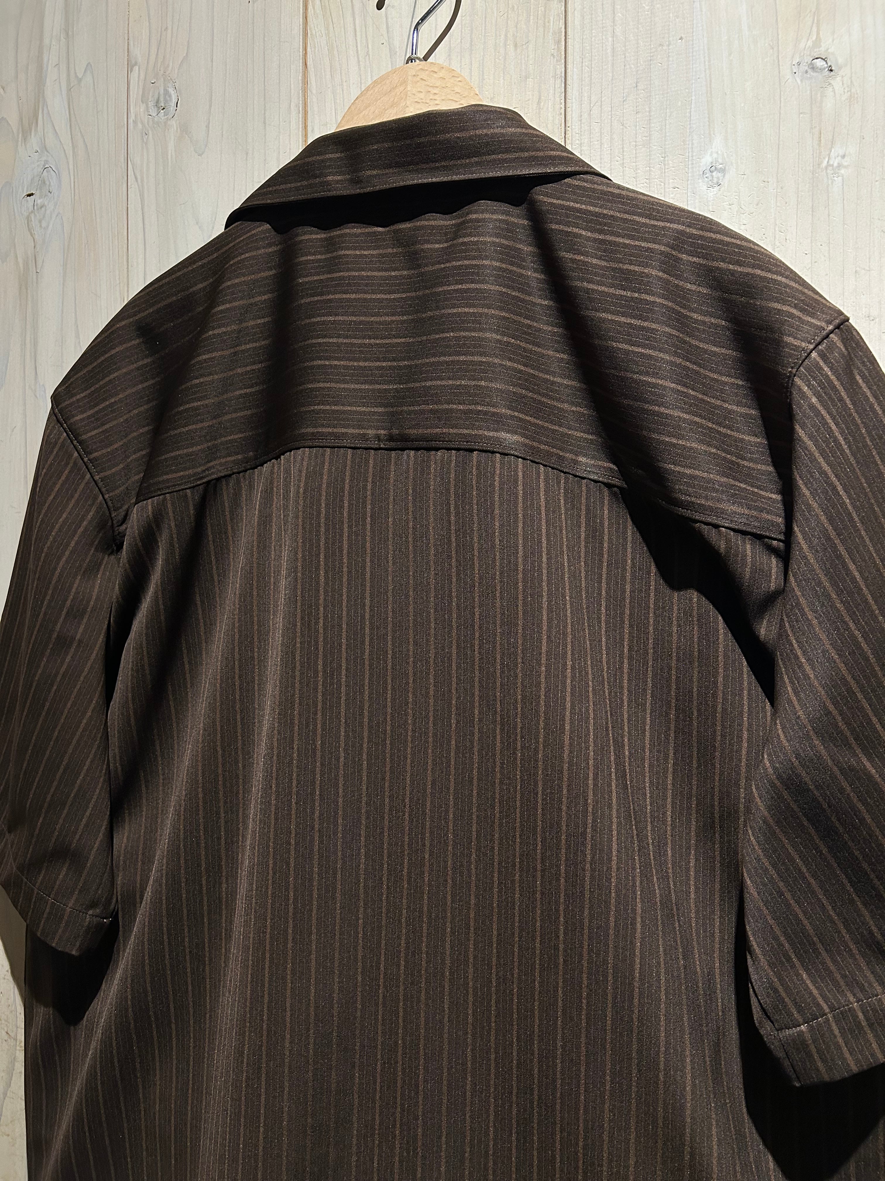 ハリがありながらも柔らかなポリ素材を用いて、ブラウンをベースにストライプ柄を載せた1着。