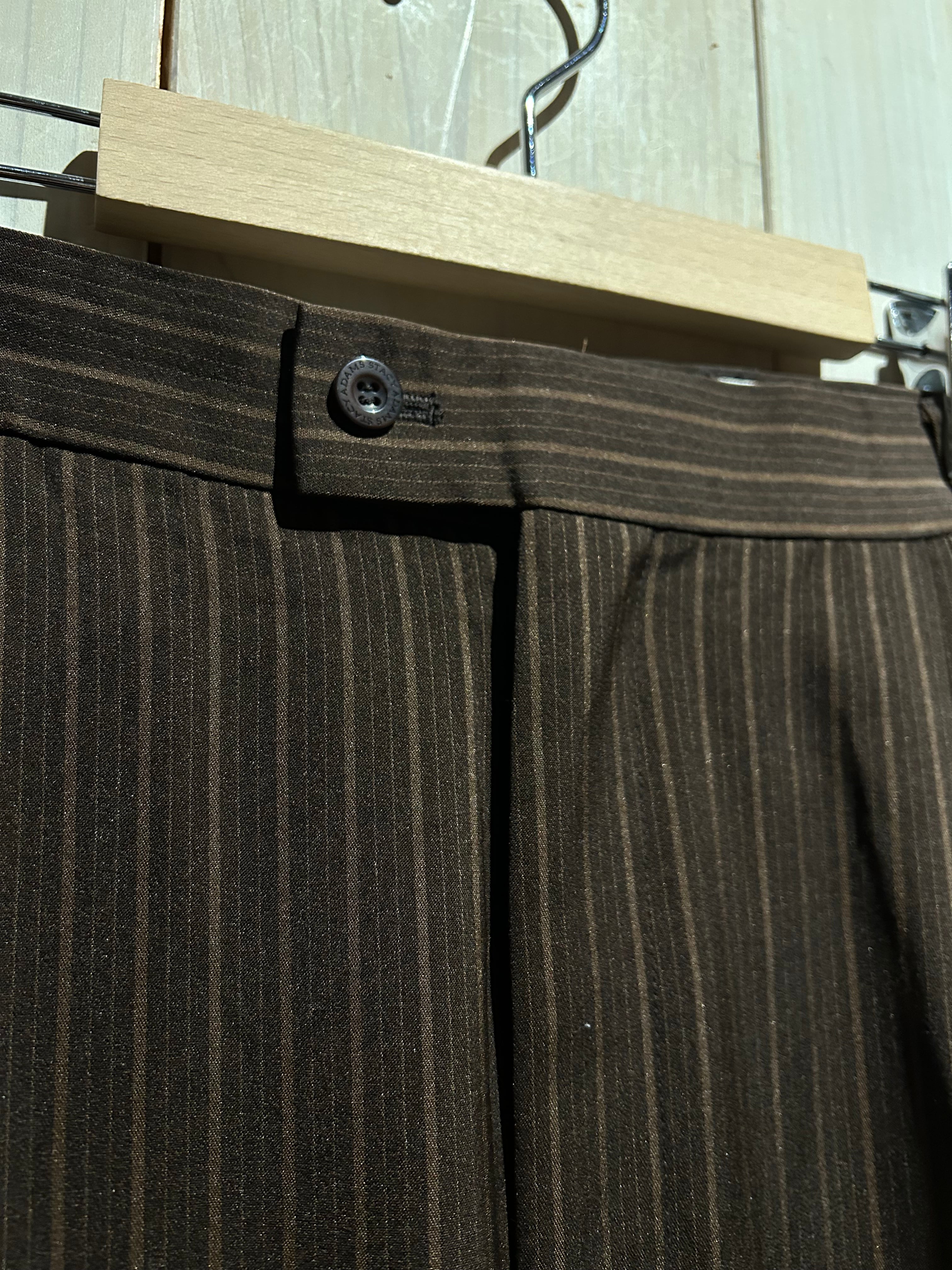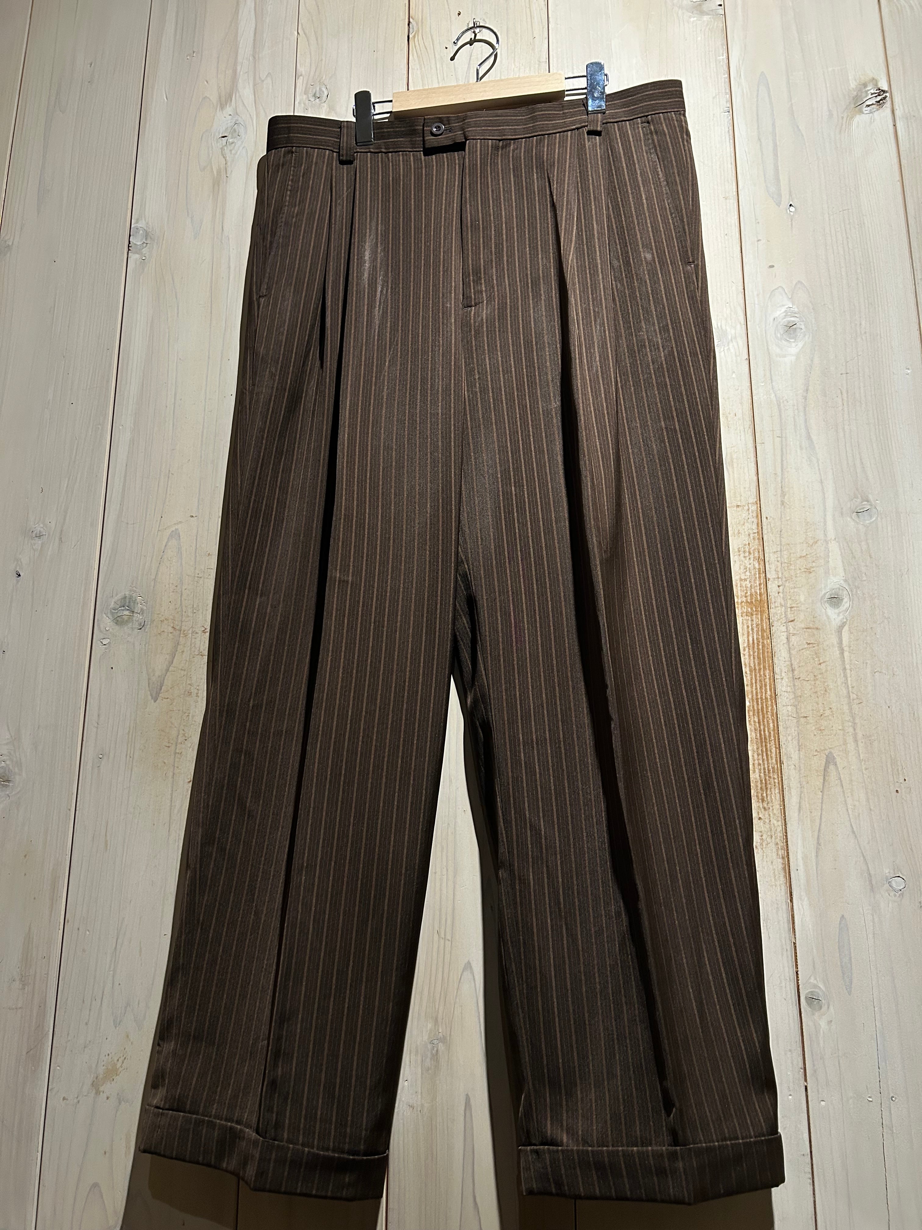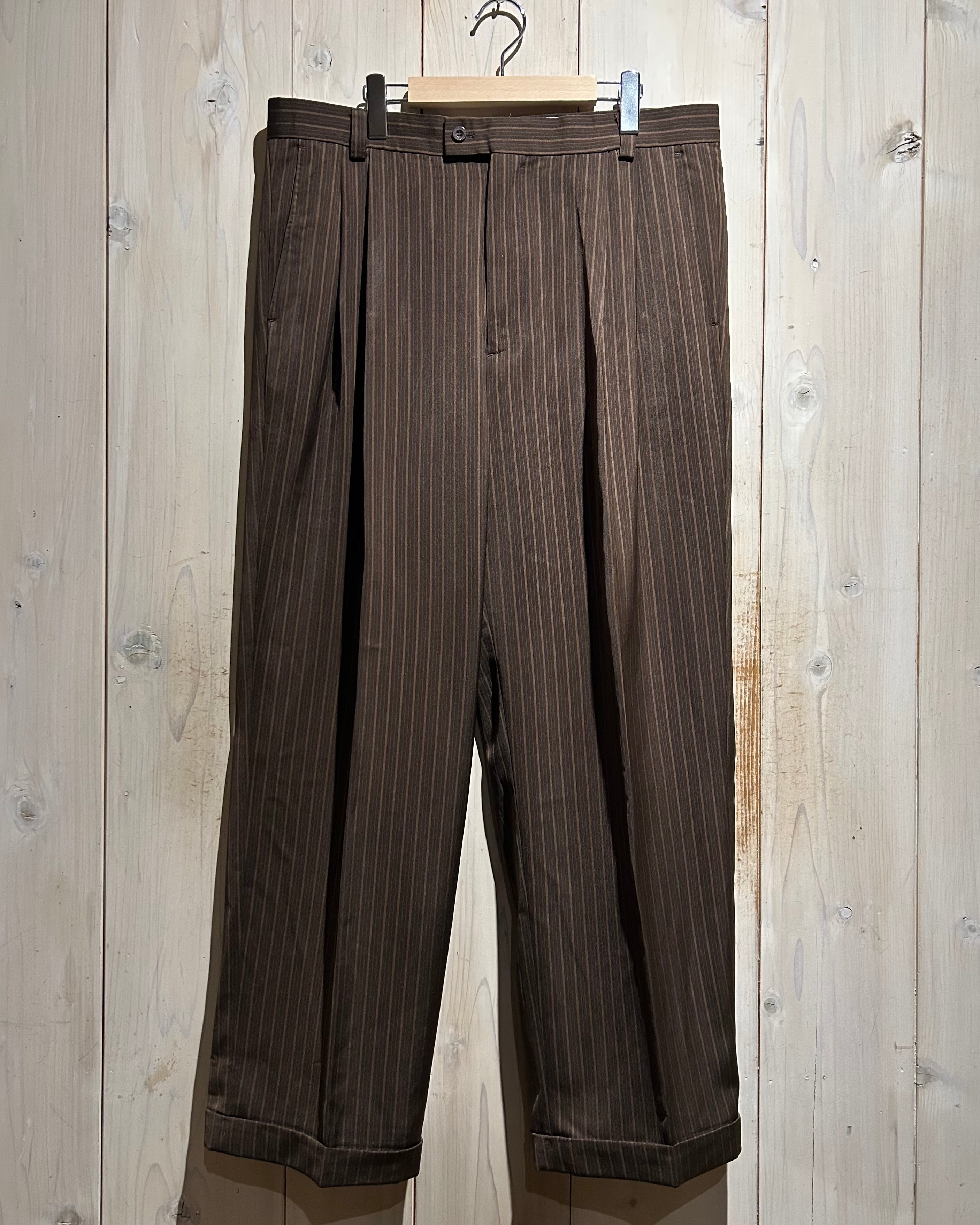 パンツはノータック、ズドンとズートの様にワイドで裾に向けて緩やかに細くなるテーパードシルエット。ウエストをギュッと絞った際のシルエットが非常に美しく、太めのスラックスって今まさに気分ですよね。