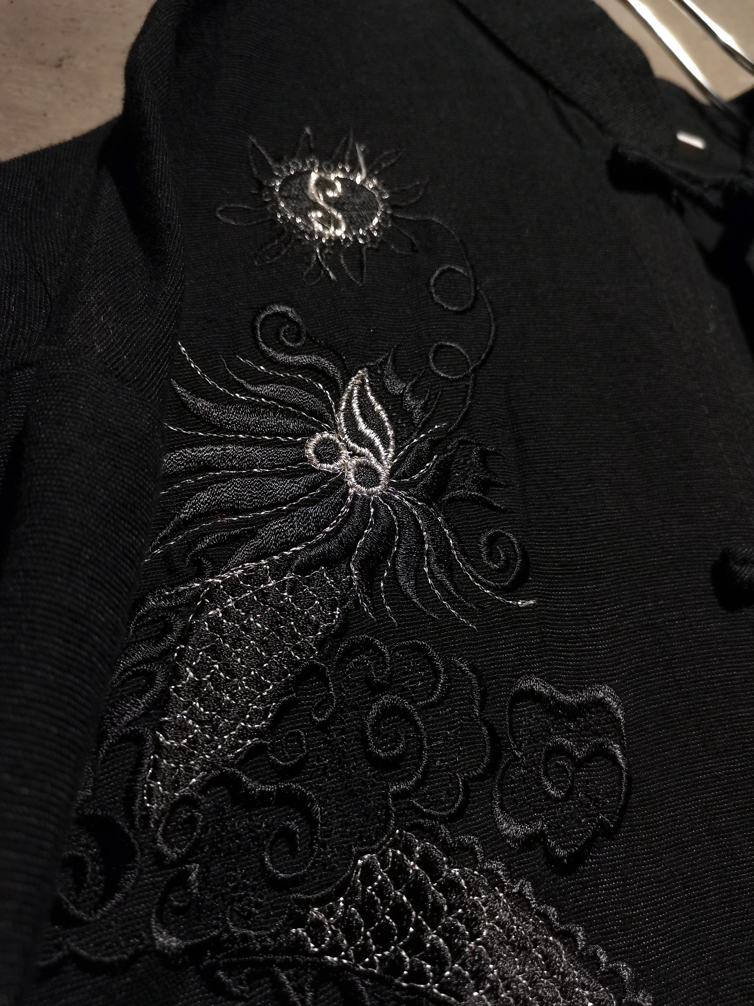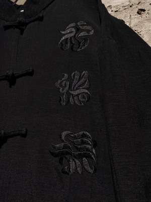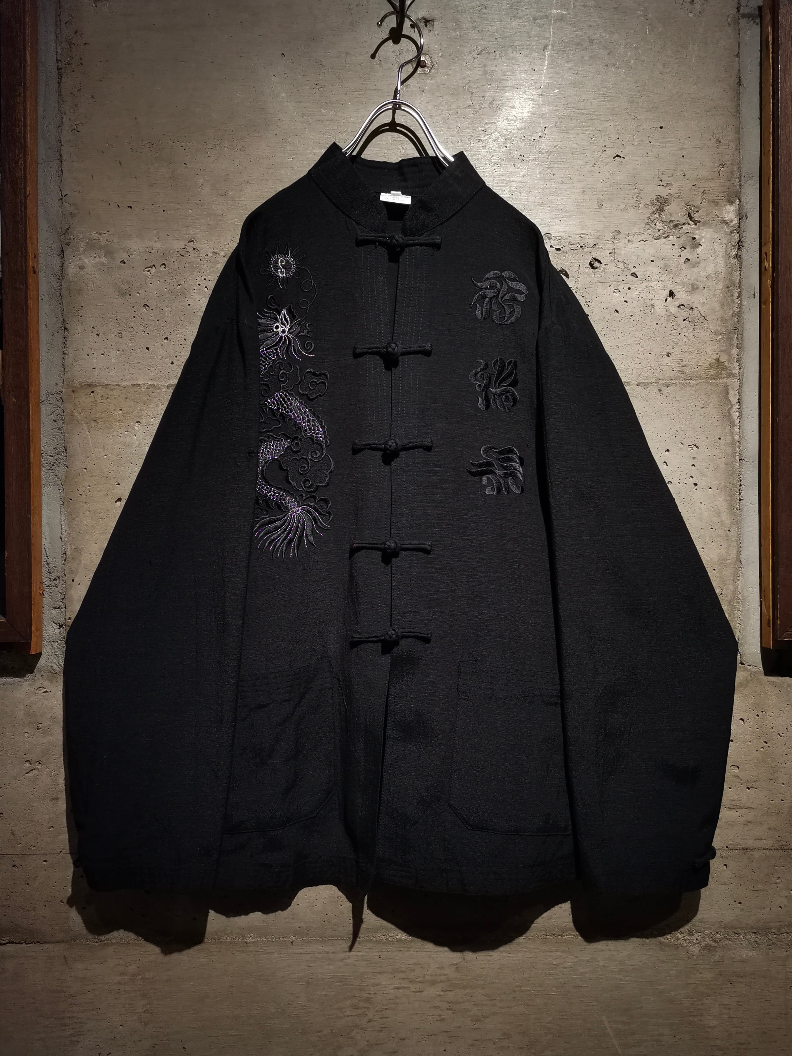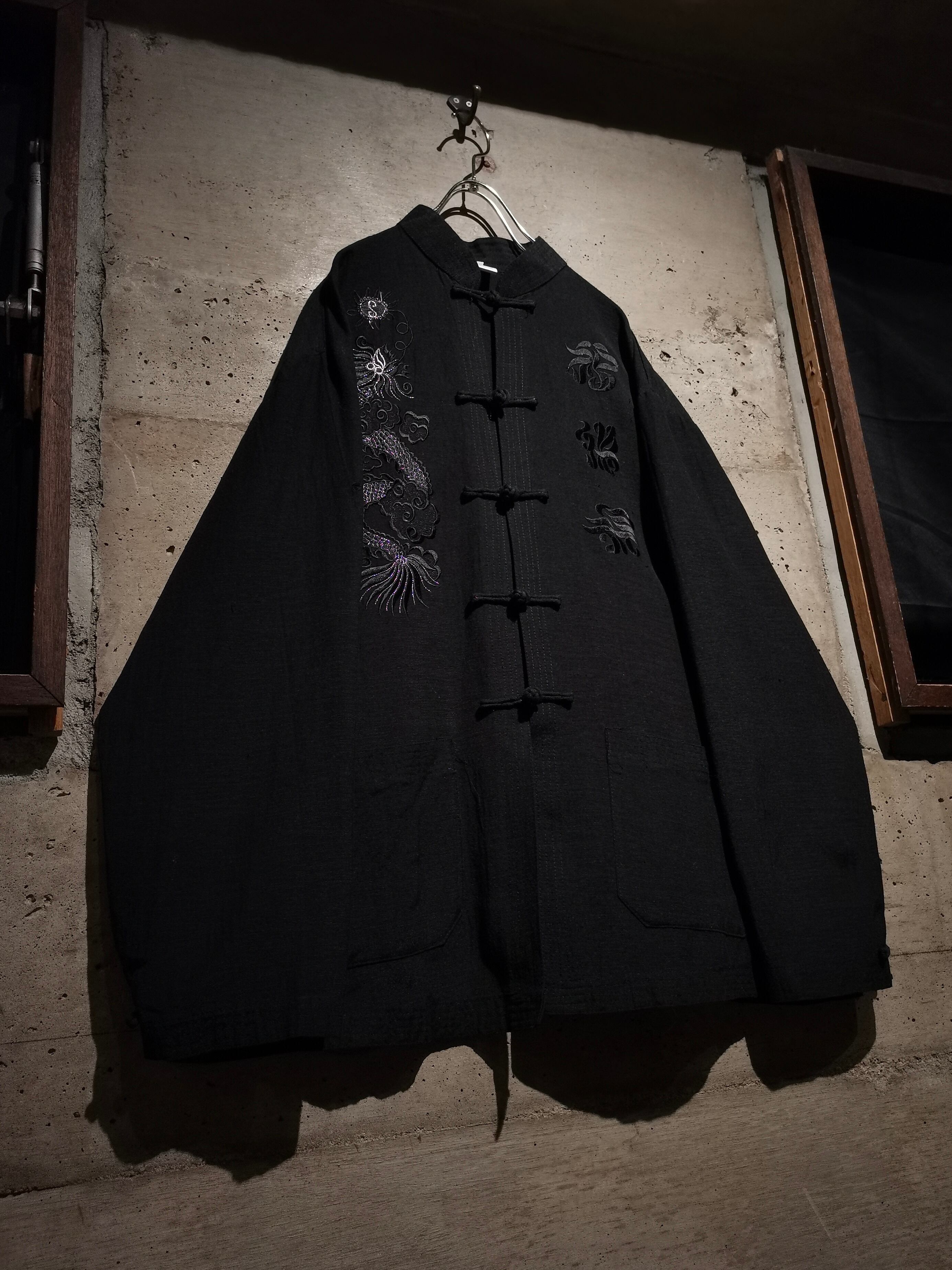 フロントに龍と中華文字の刺繍を施した、モードな雰囲気漂う1着。黒のチャイナ最近なかなか見つかりません、、