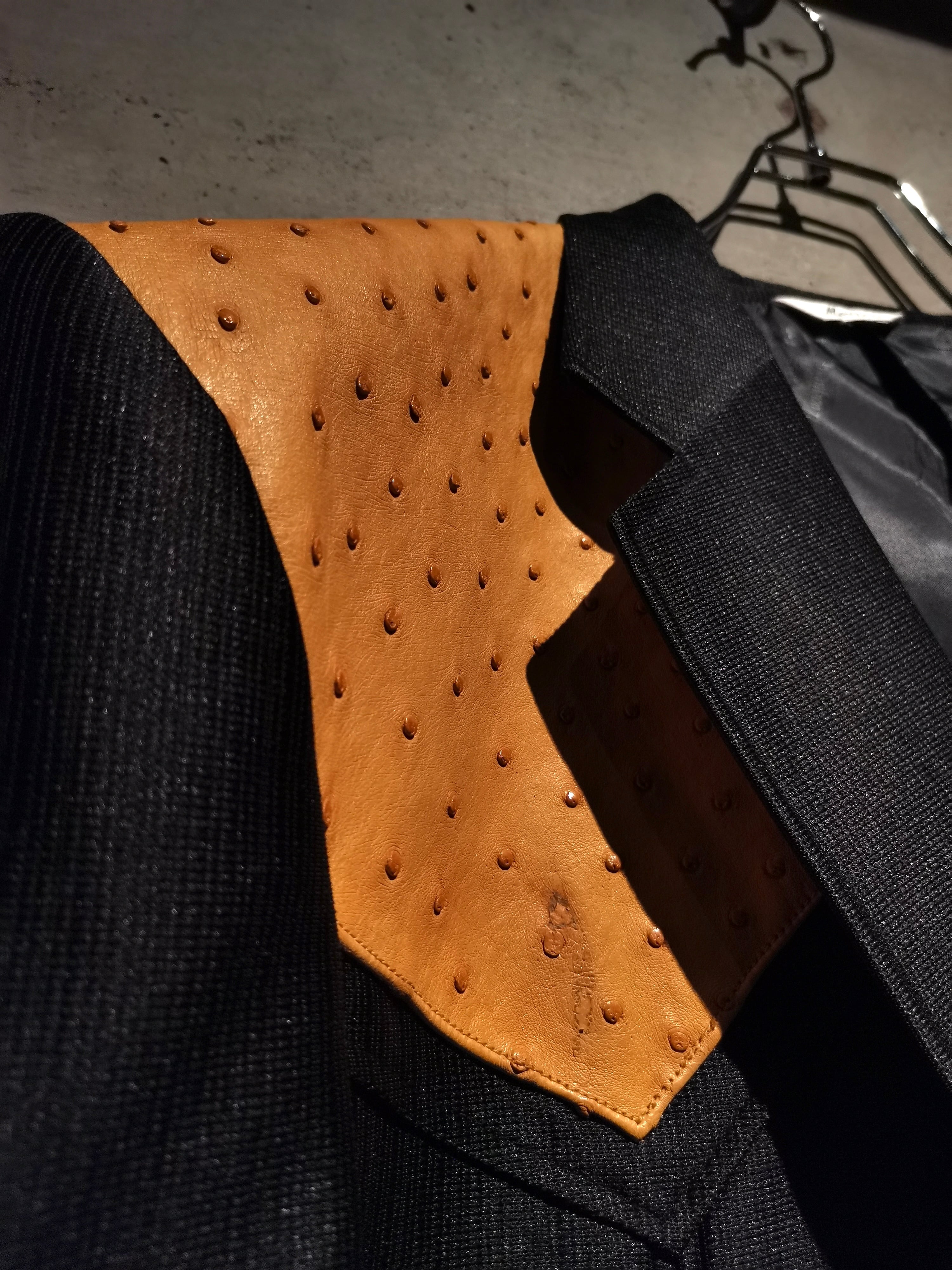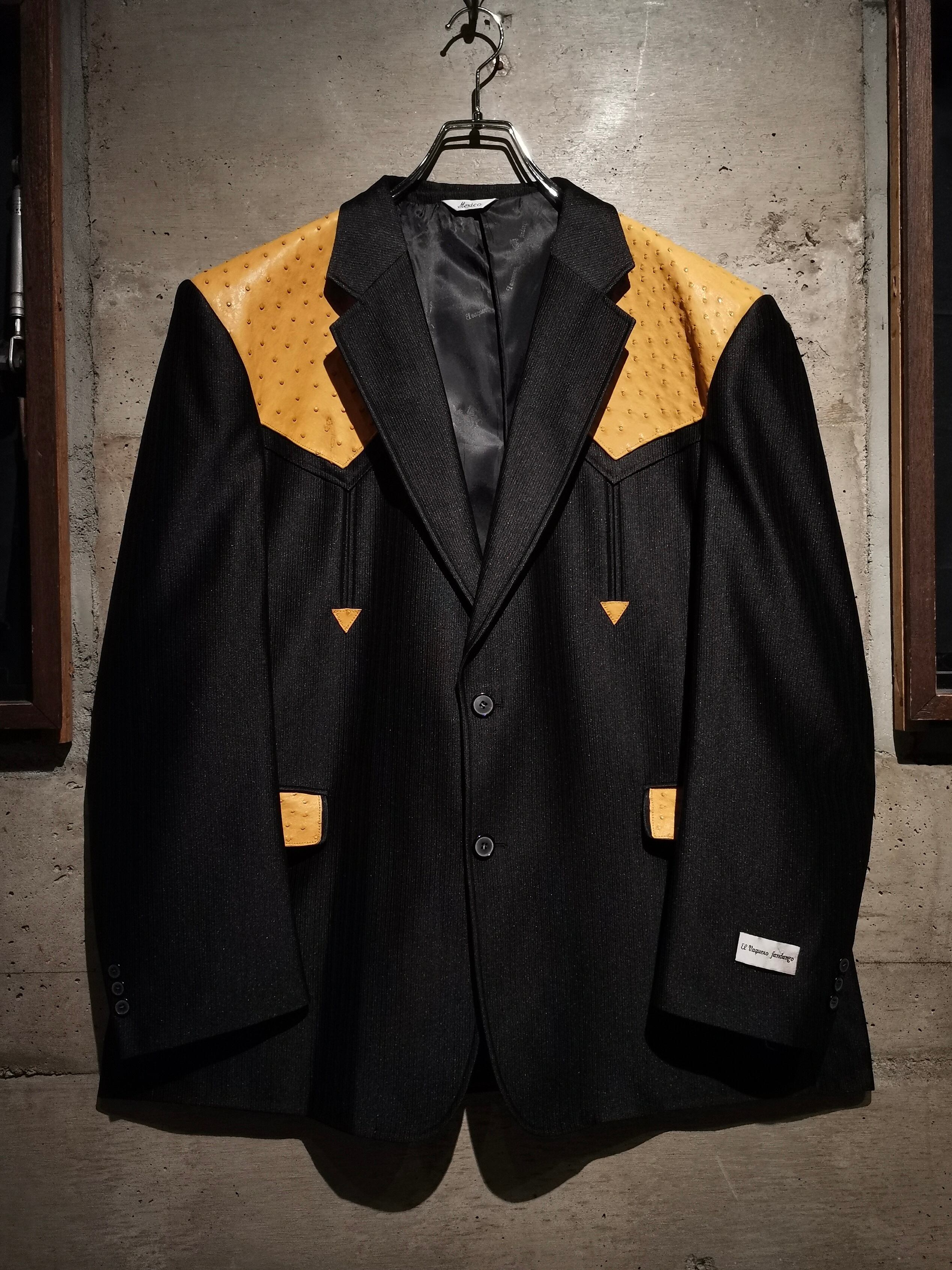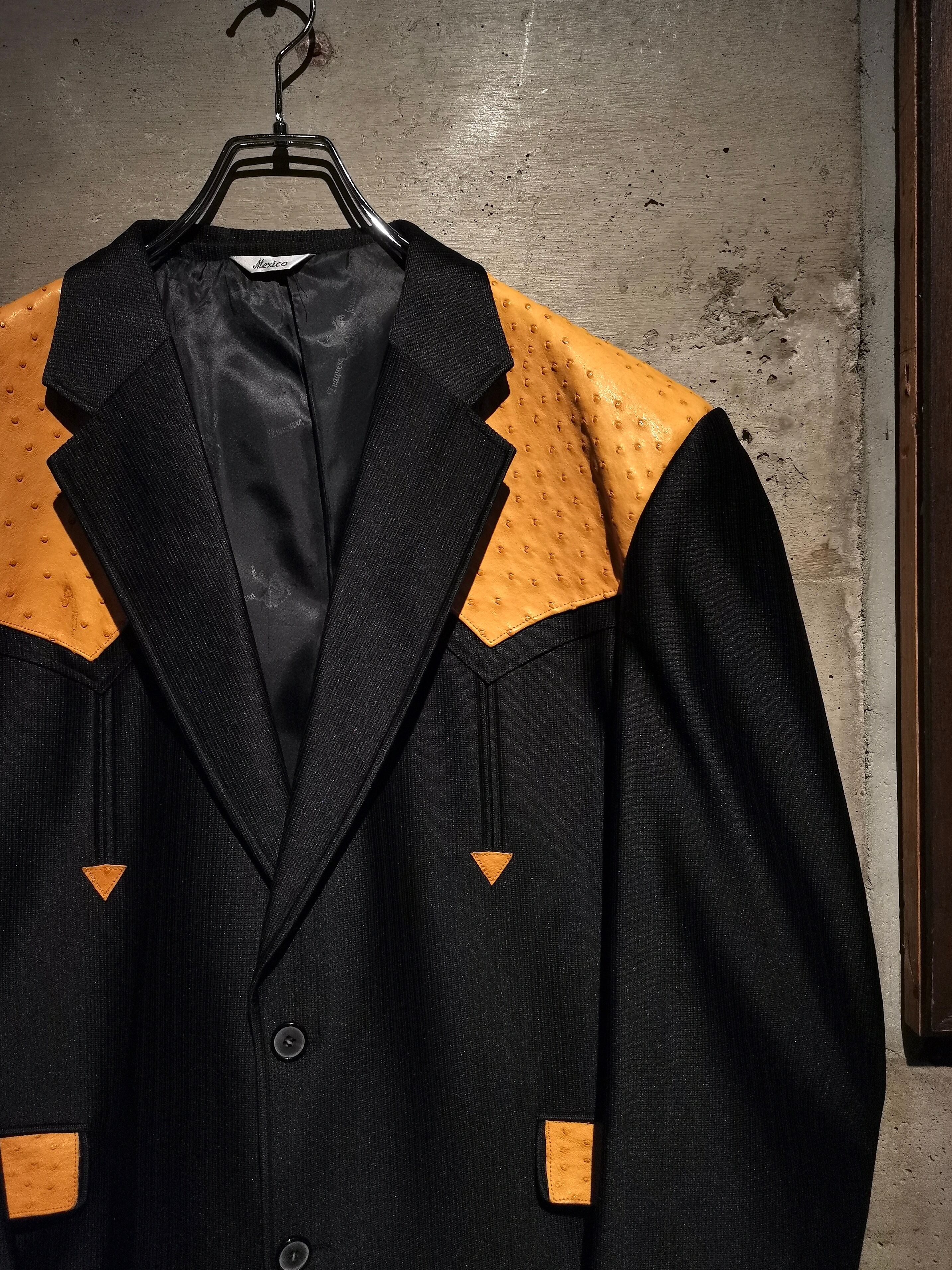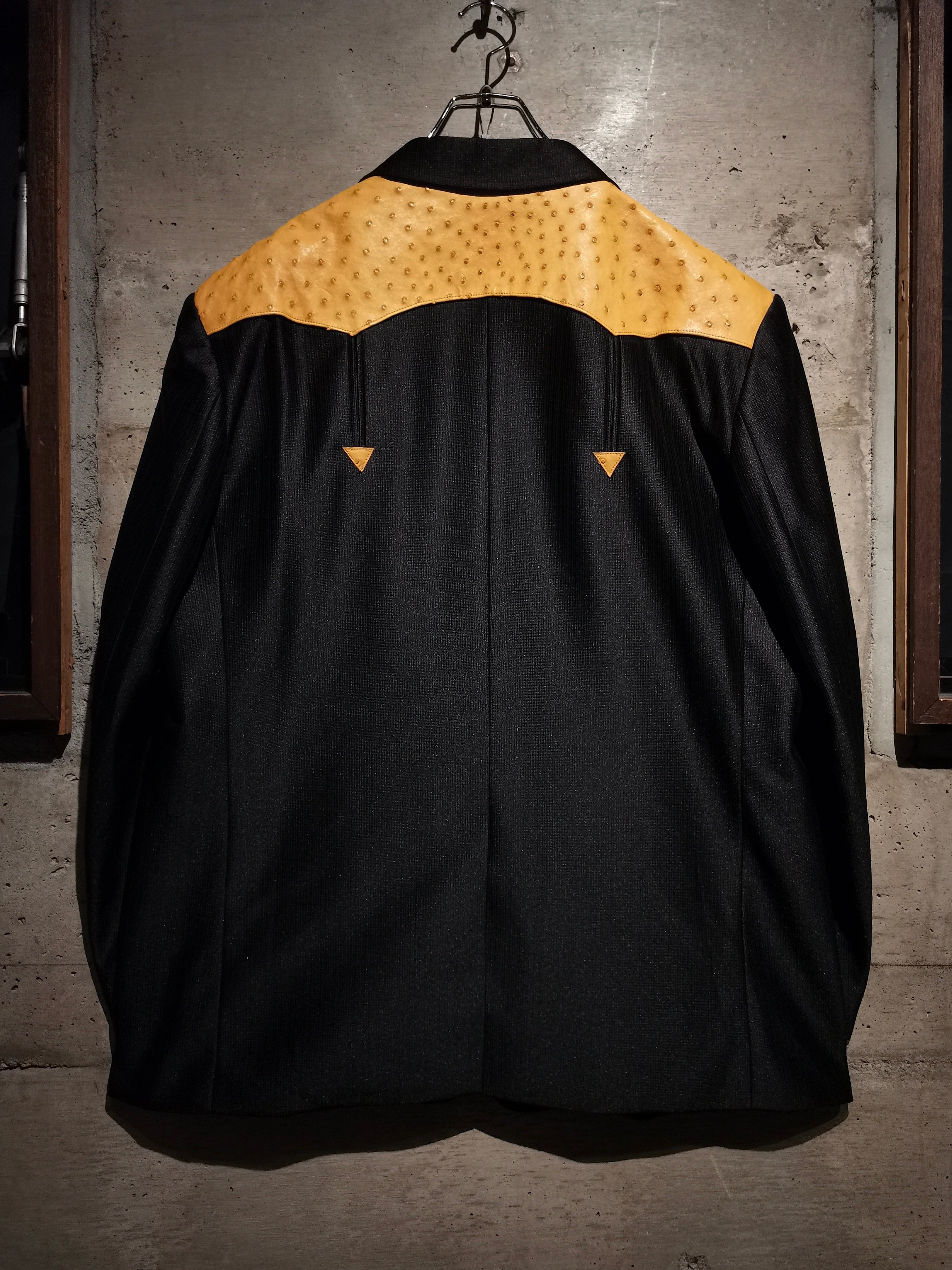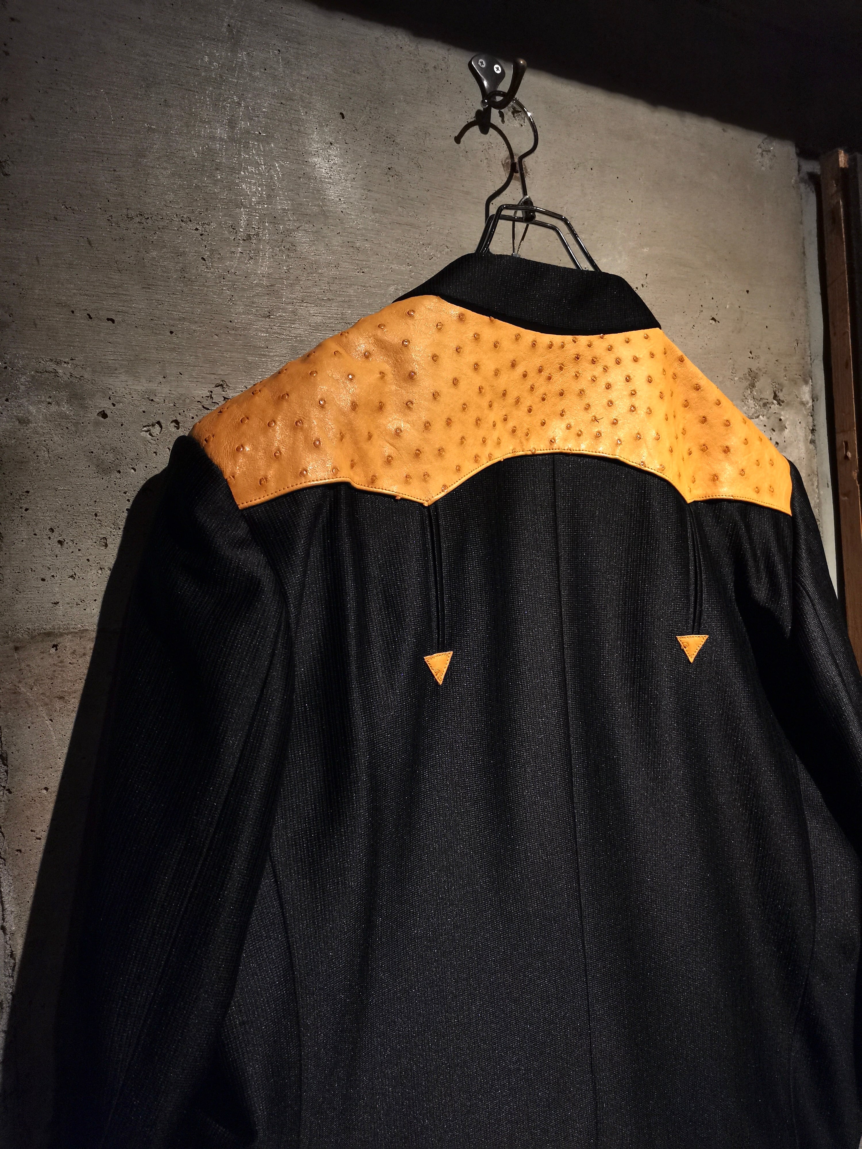 稀有なブラックウエスタン仕様のテーラードジャケットに、オーストリッチ(ダチョウ革) を切り替えた1着。ボディは鈍く光沢を帯びながらもしっとりとした深みのある上質な素材で着用感も軽い為、高級感を漂わせながらもラフに身に纏えます。