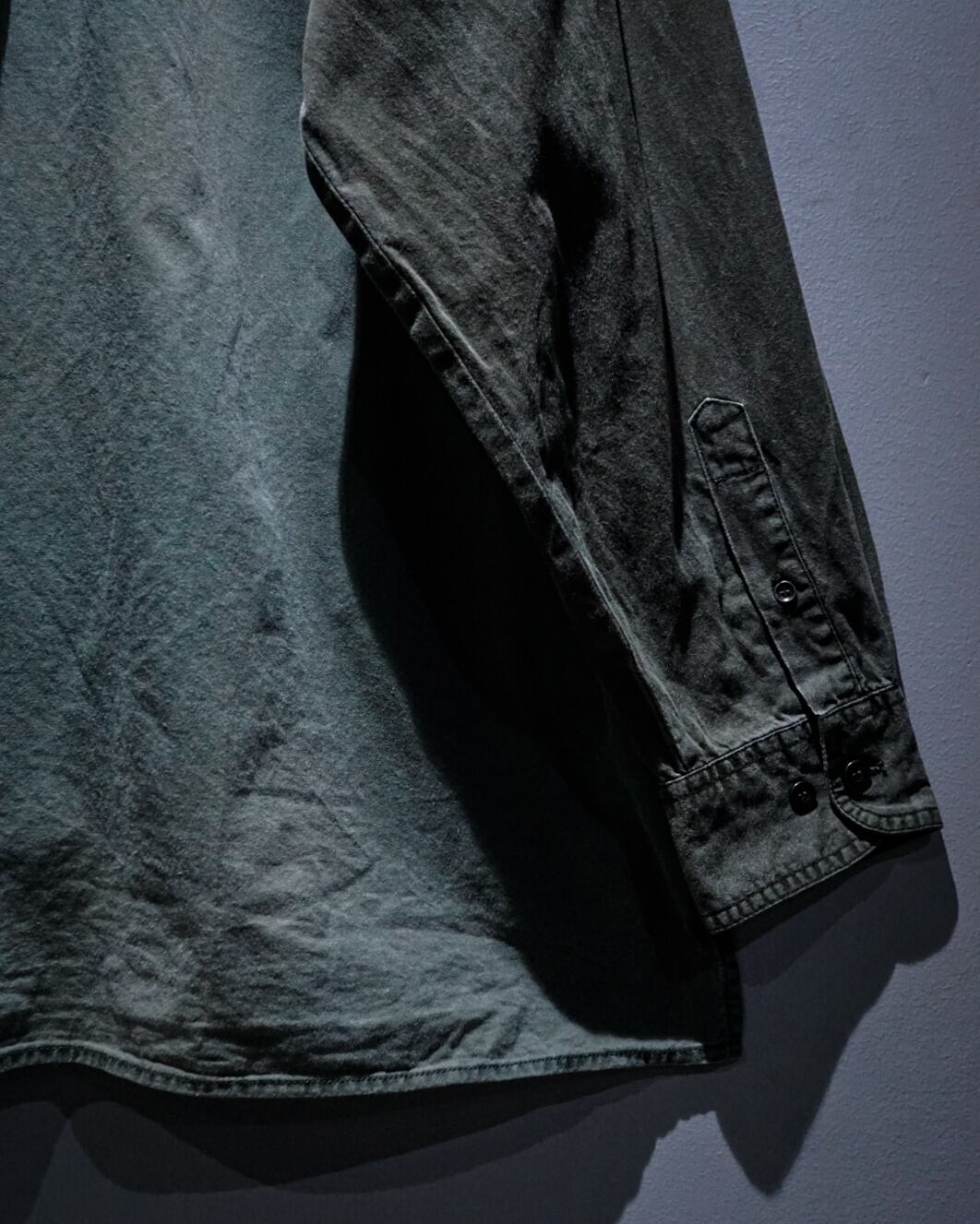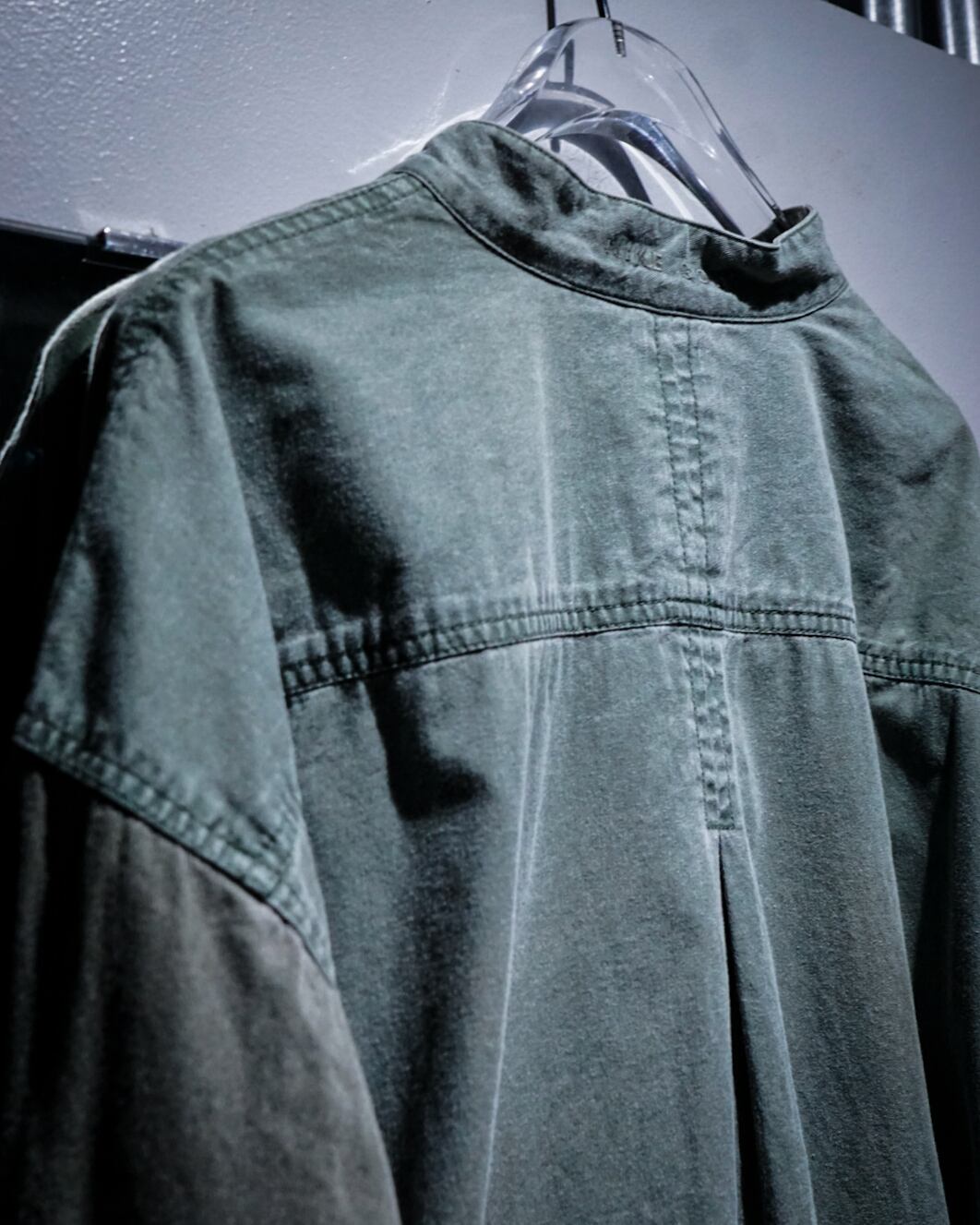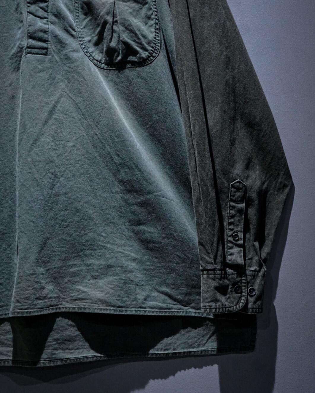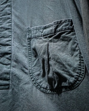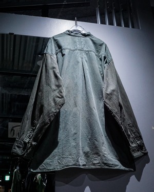 薄らとグラデーションがかったフェードが美しい、、、ハーフボタンに左胸のパッチポケットとミニマルなデザインによって、ボディのフェード、全体のヤレ感など、古着ならではの風合い豊かな表情が引き立つ仕上がりとなっています。