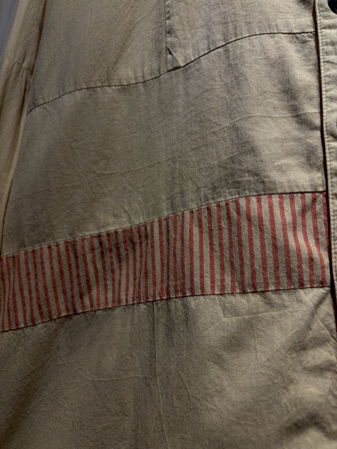 柔らかな黄色とストライプをパッチワーク風に切り替えた長袖シャツです。