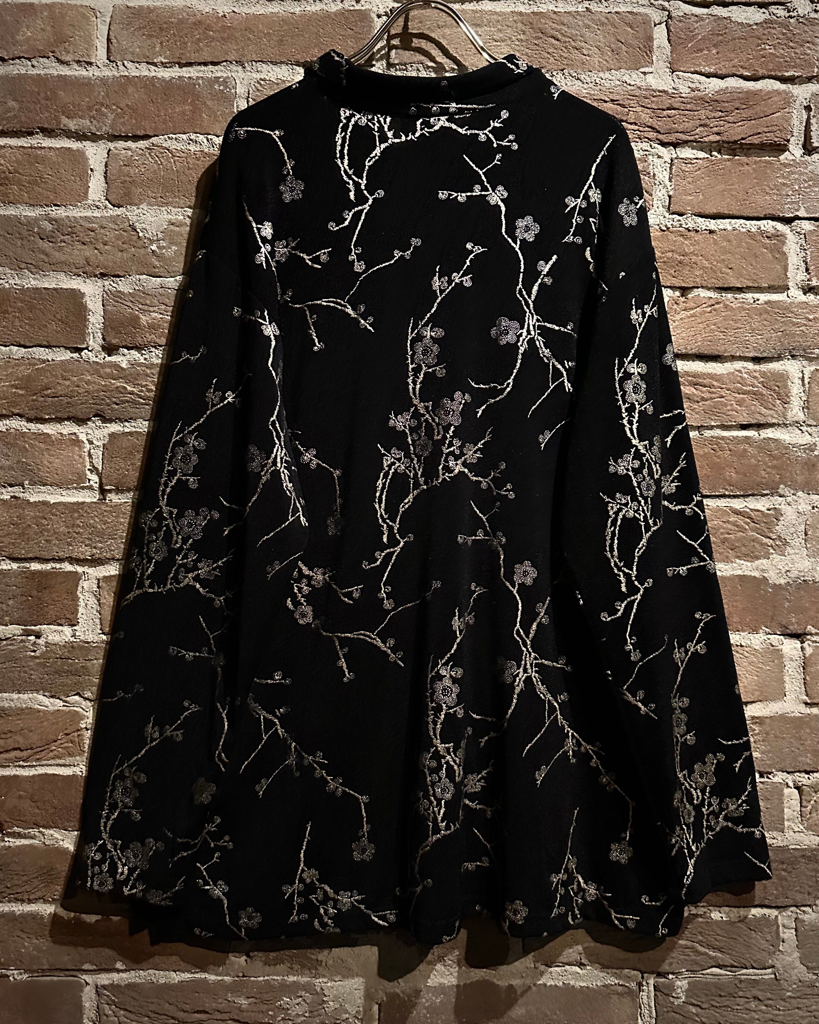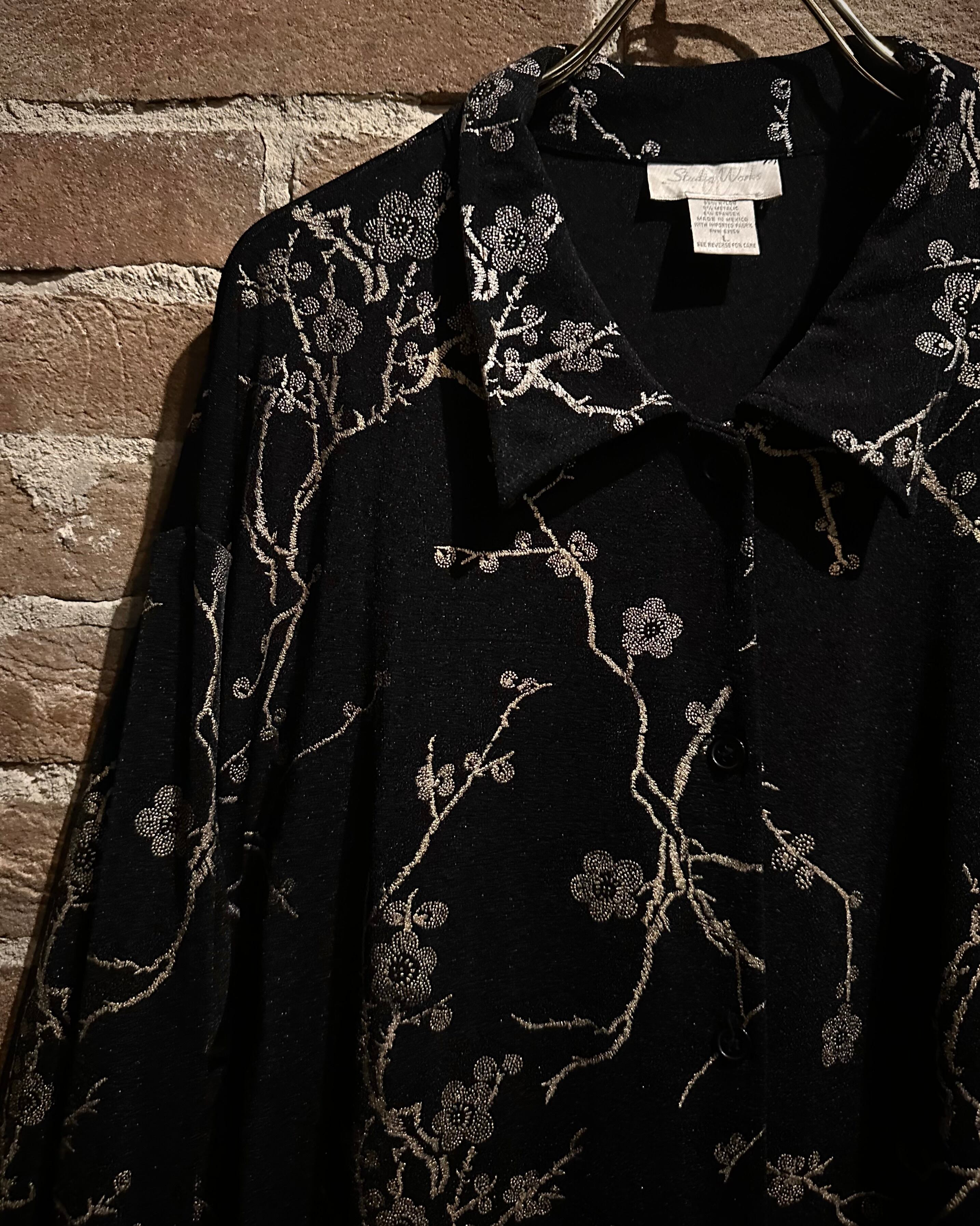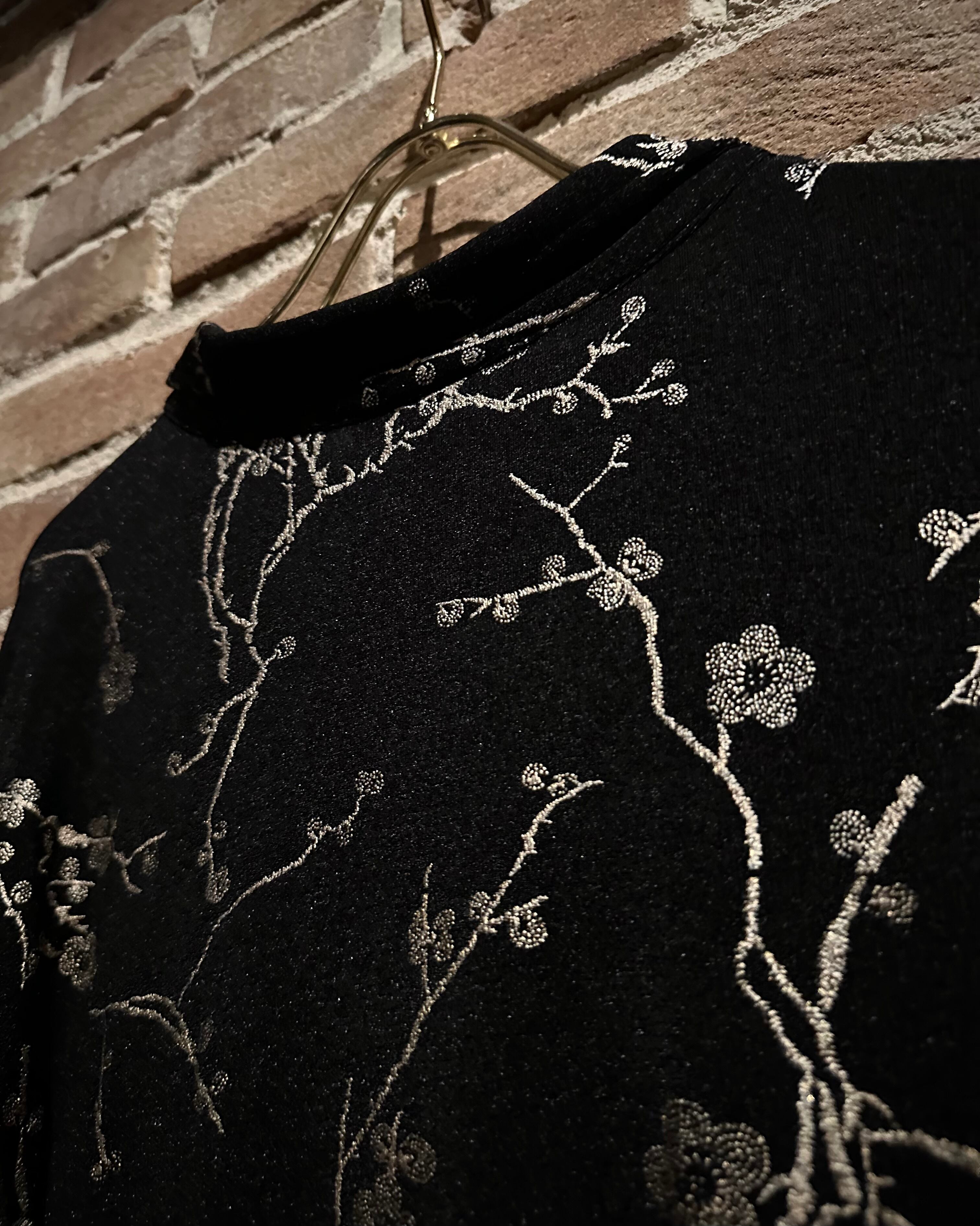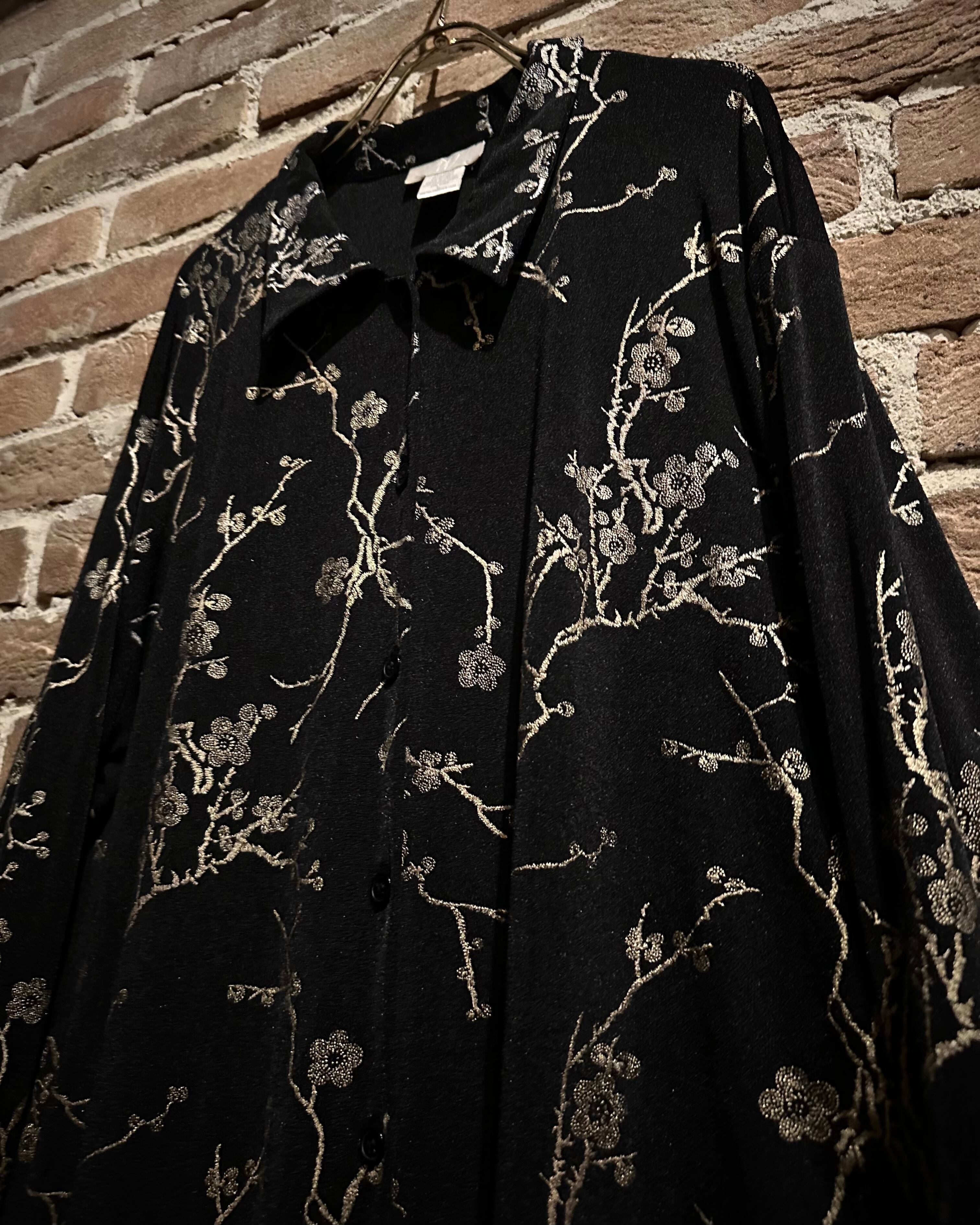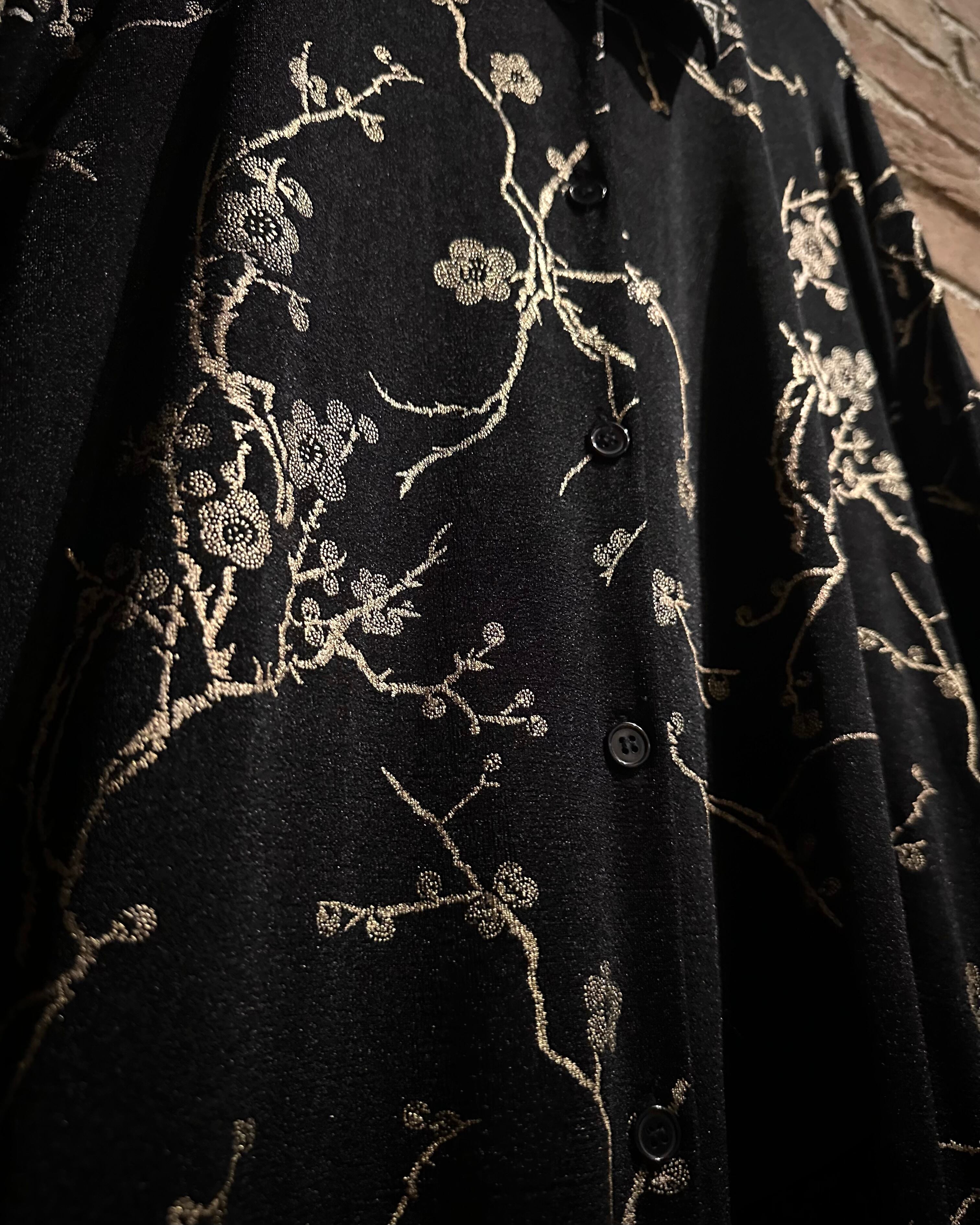 グリッターを織り込んだブラックのボディに、銀糸で美しい花を刻んだ長袖シャツ。
