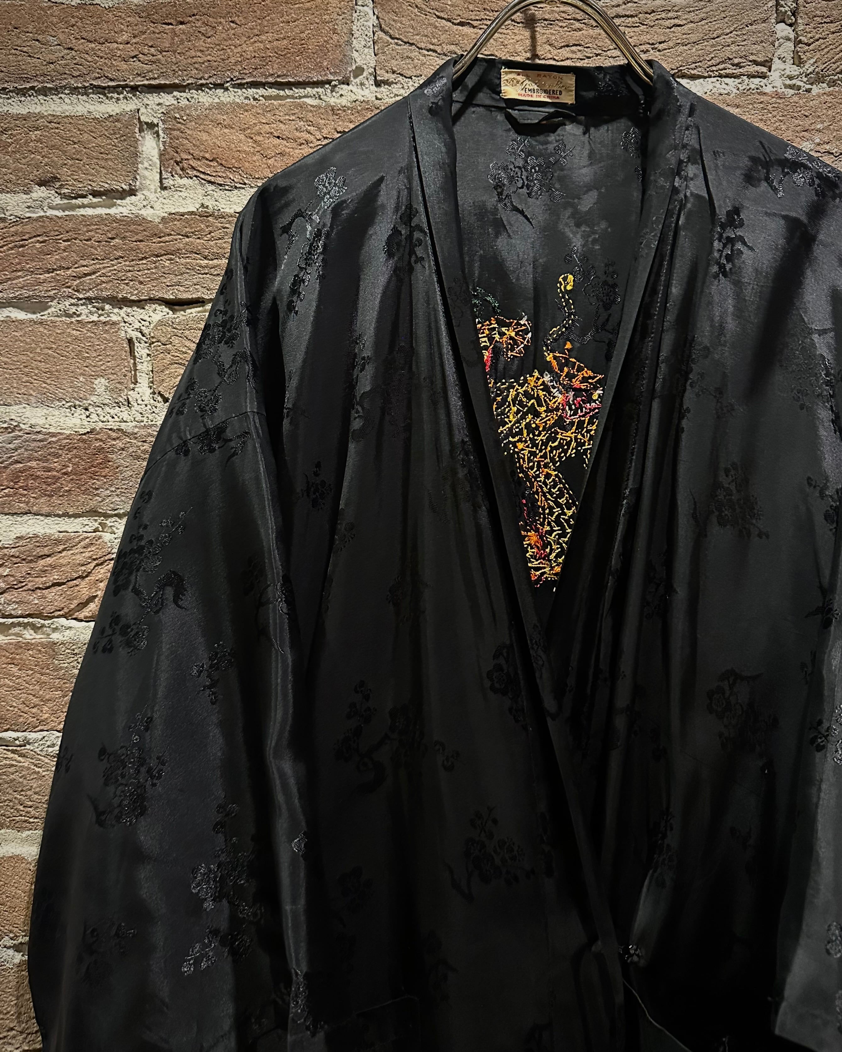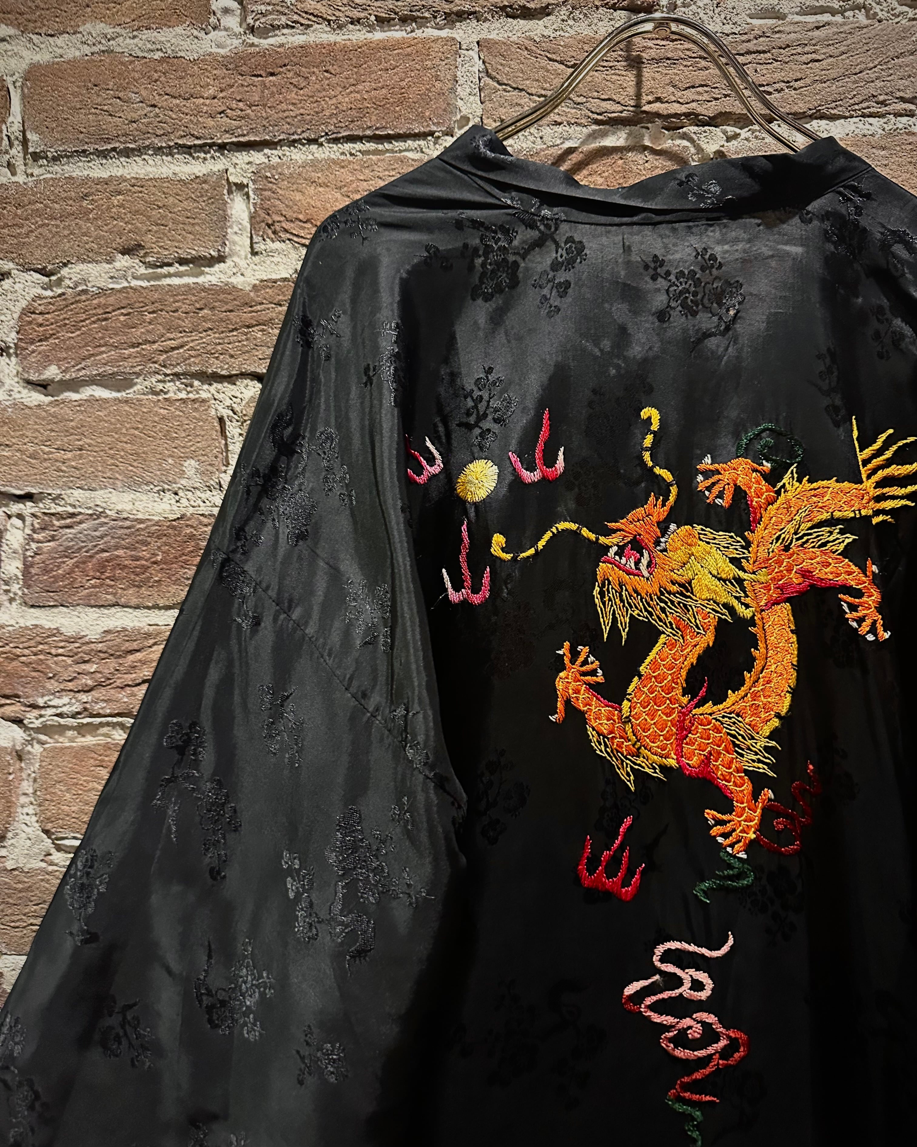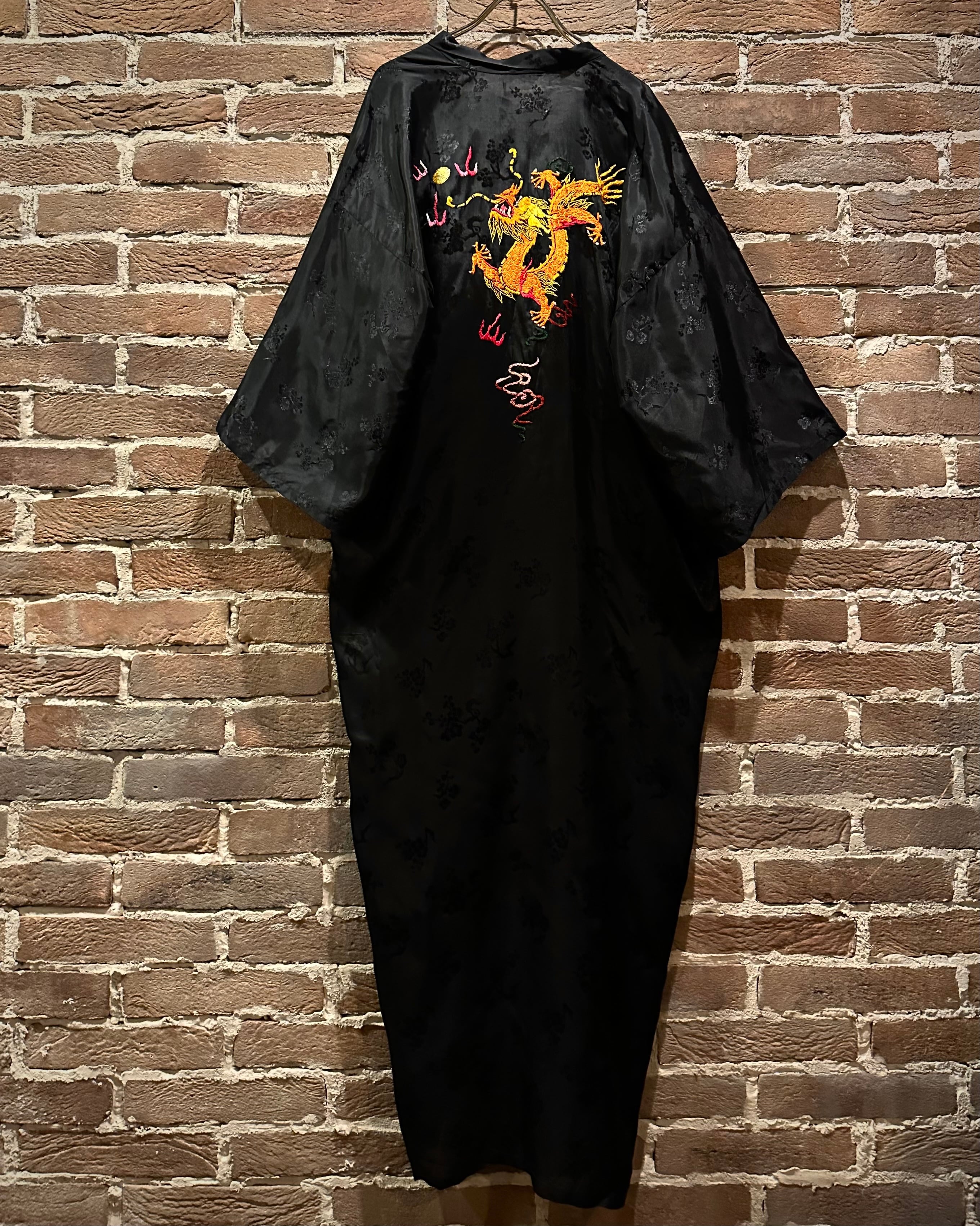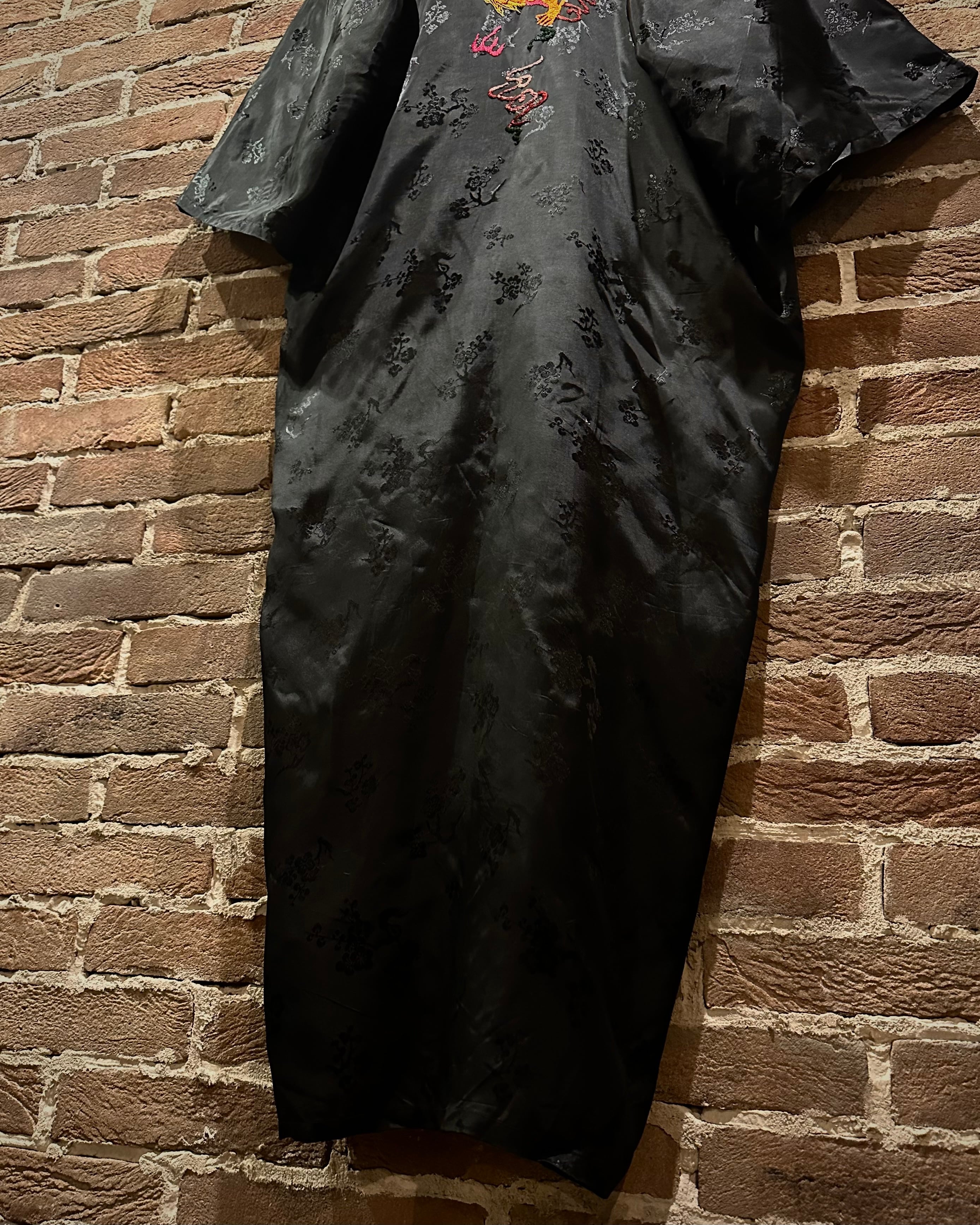 ツルッと滑らかな素材をベースに、花柄を織りで表現、背面にオリエンタルな雰囲気漂う龍の刺繍を刻んだチャイナガウン。
