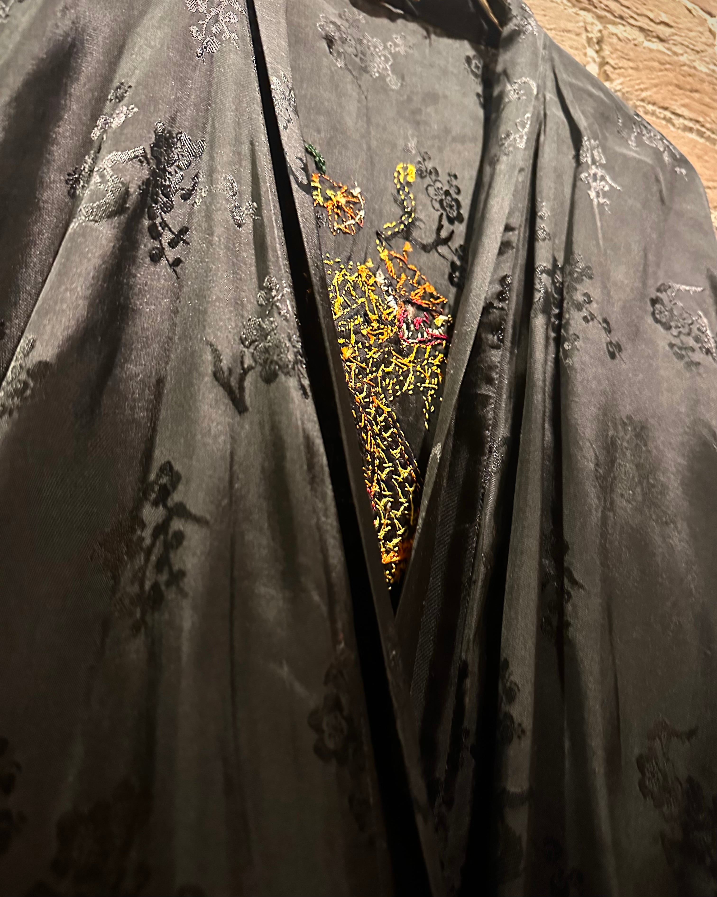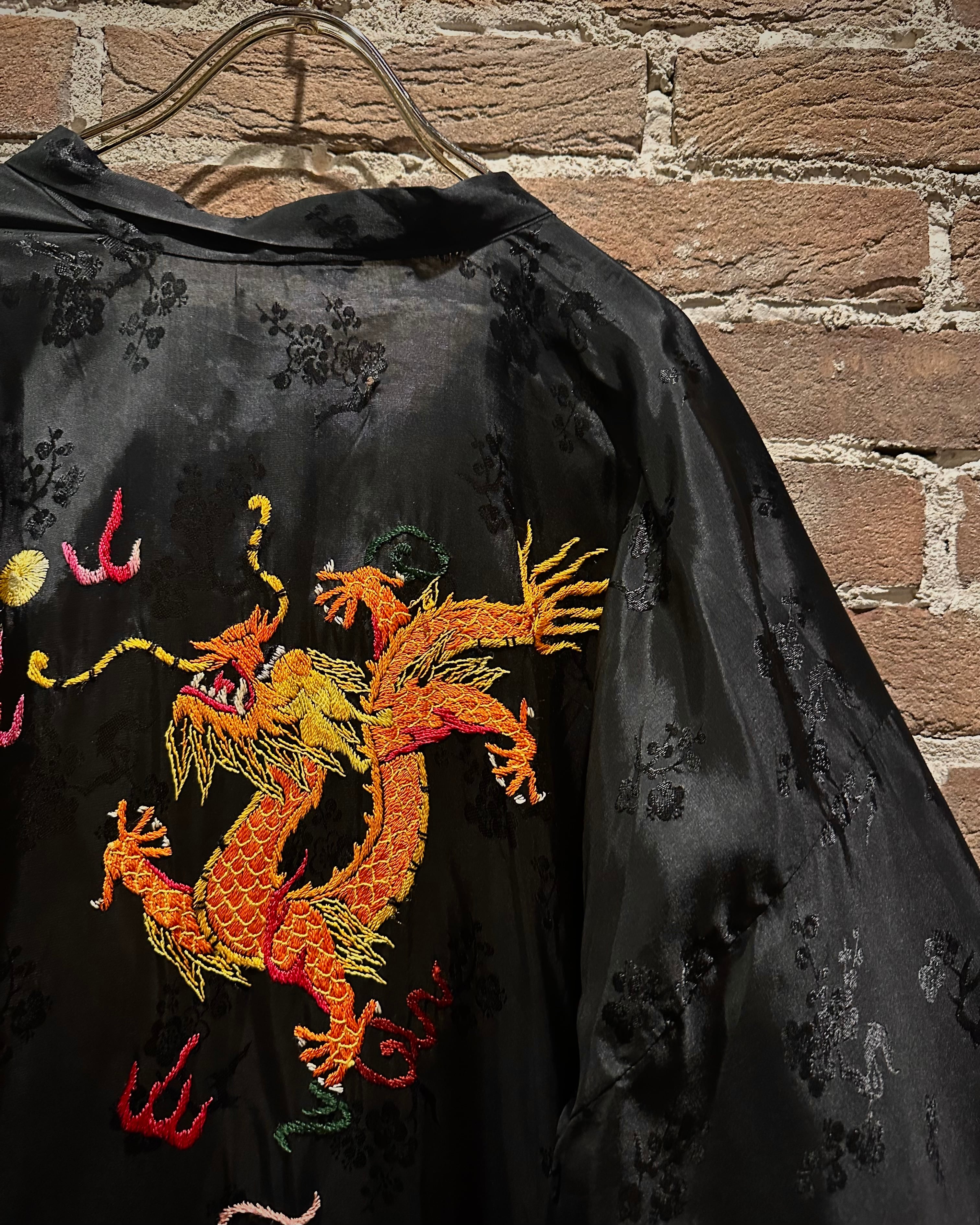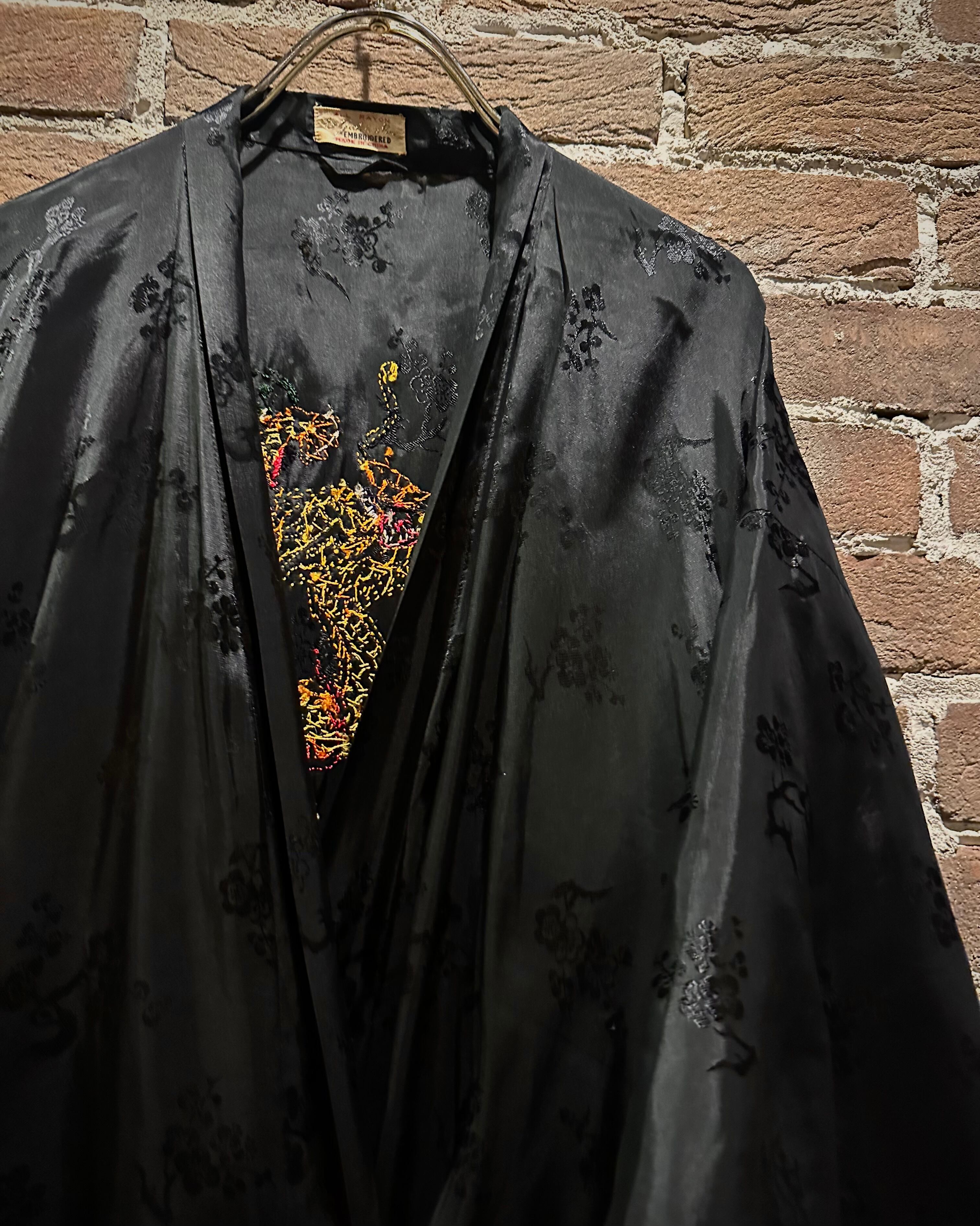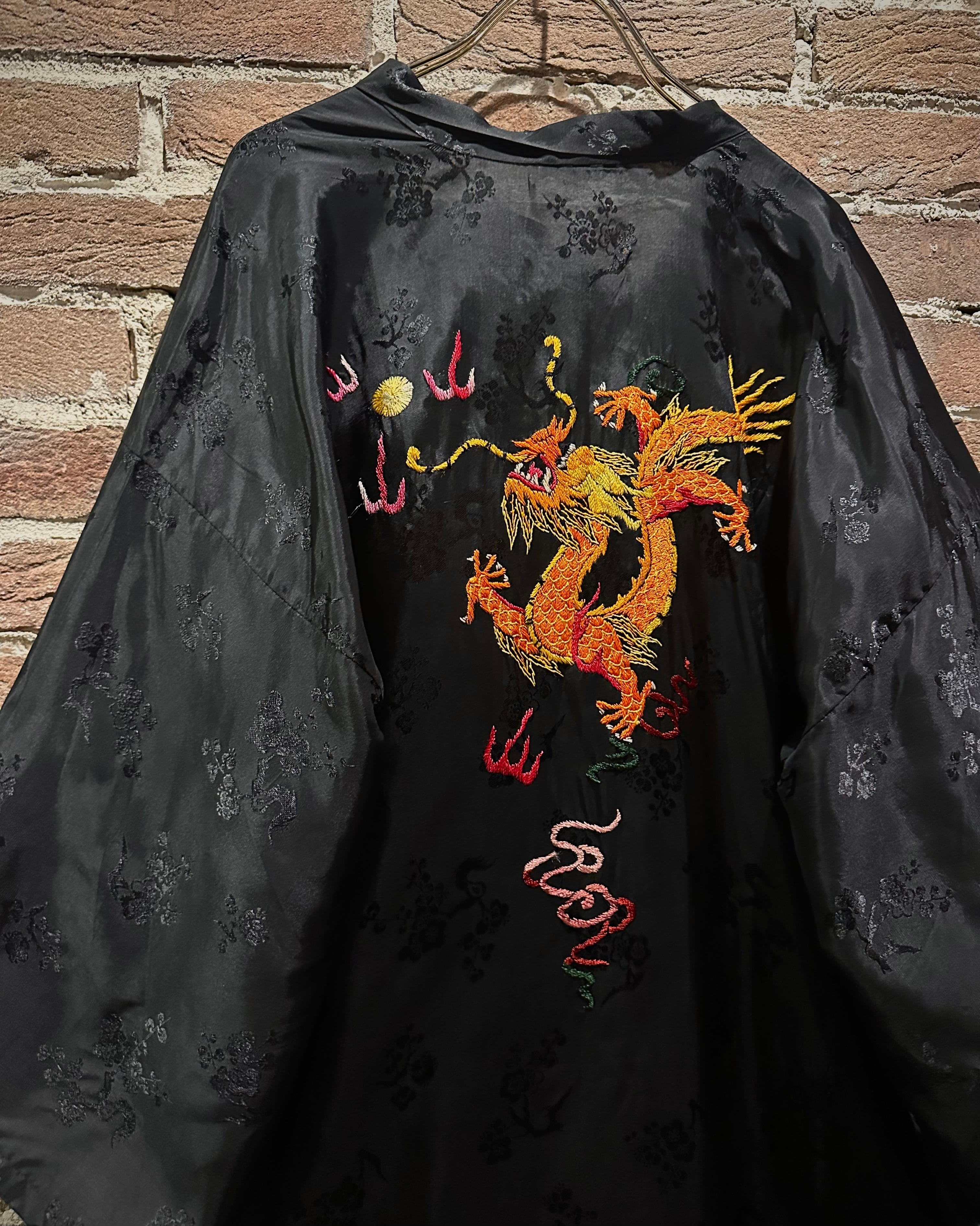 ツルッと滑らかな素材をベースに、花柄を織りで表現、背面にオリエンタルな雰囲気漂う龍の刺繍を刻んだチャイナガウン。