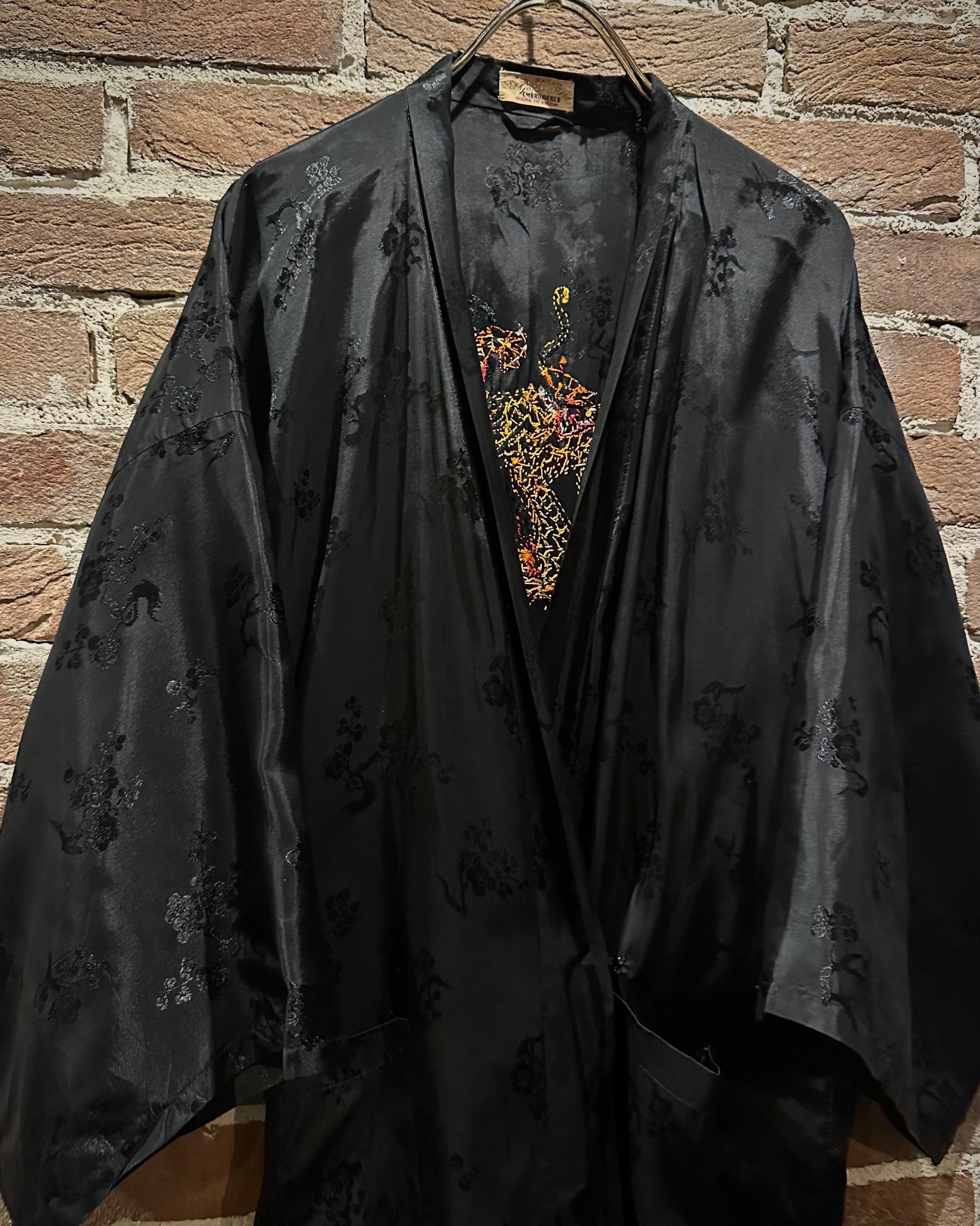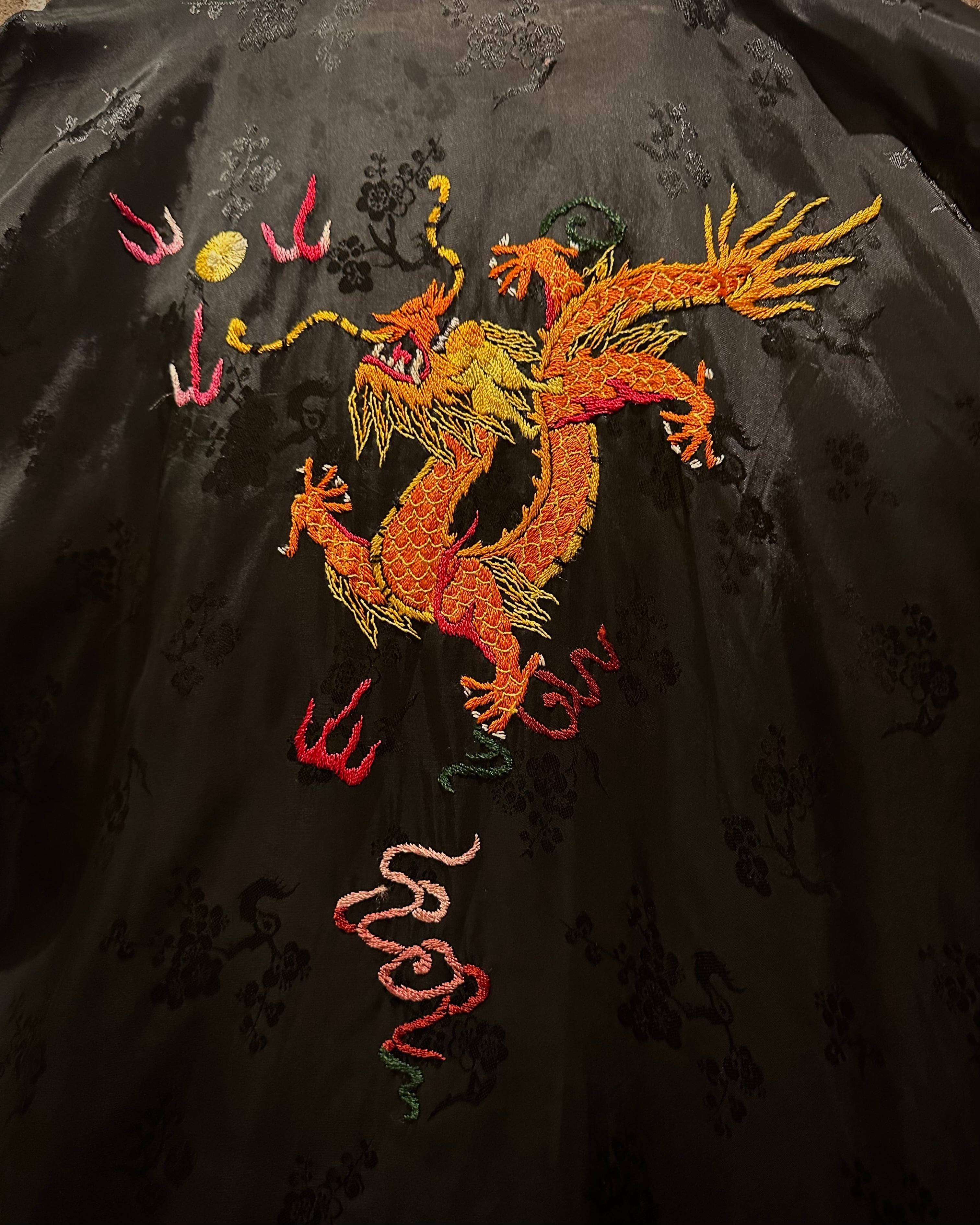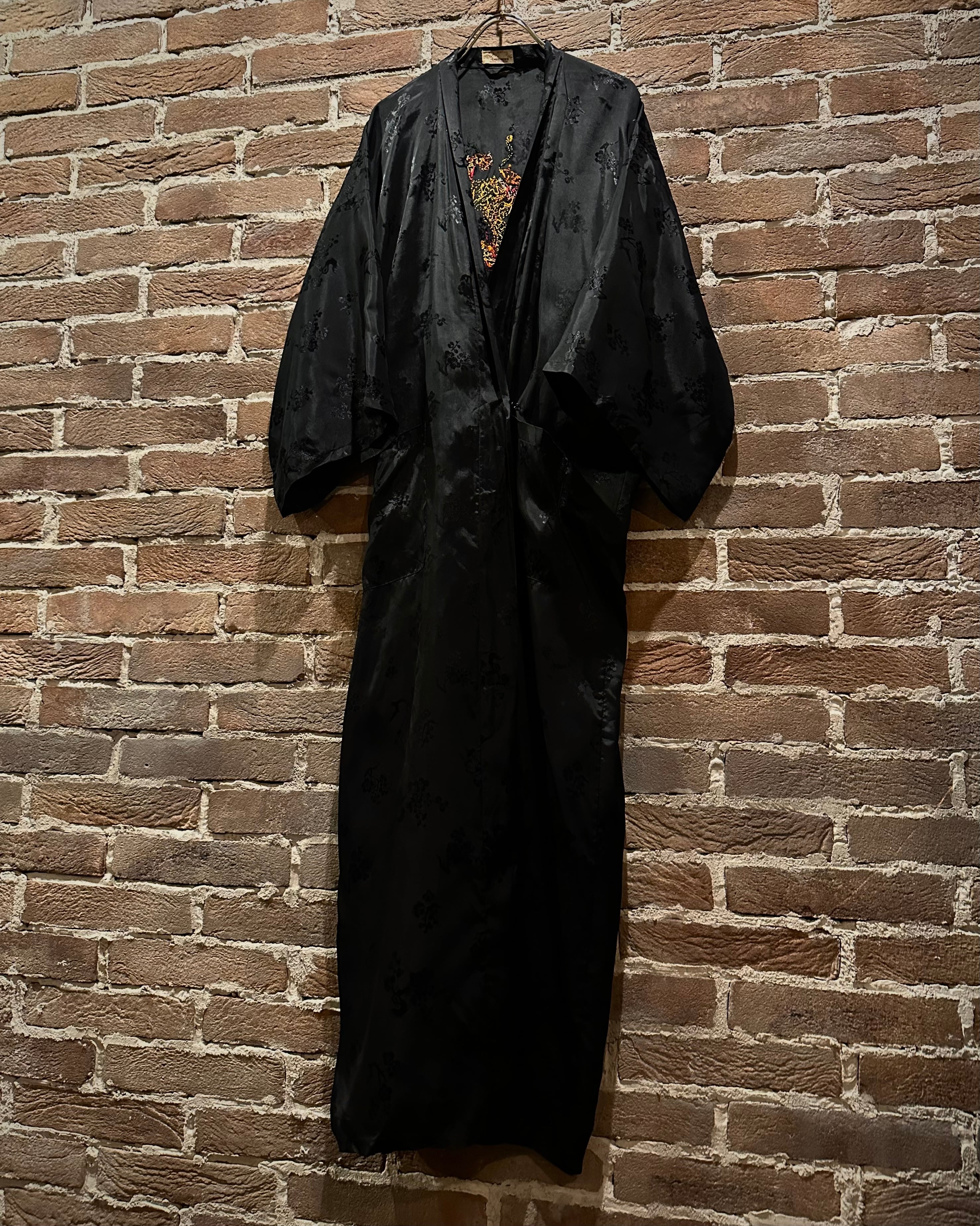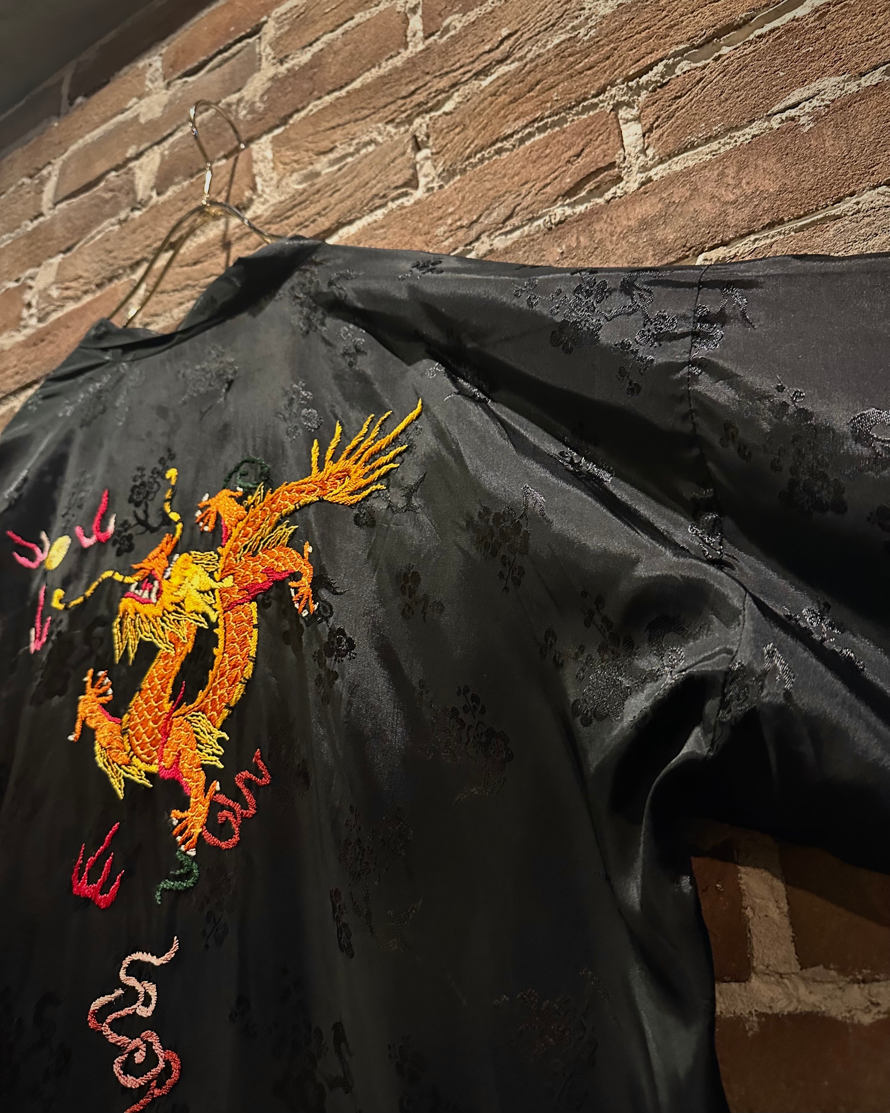 ツルッと滑らかな素材をベースに、花柄を織りで表現、背面にオリエンタルな雰囲気漂う龍の刺繍を刻んだチャイナガウン。