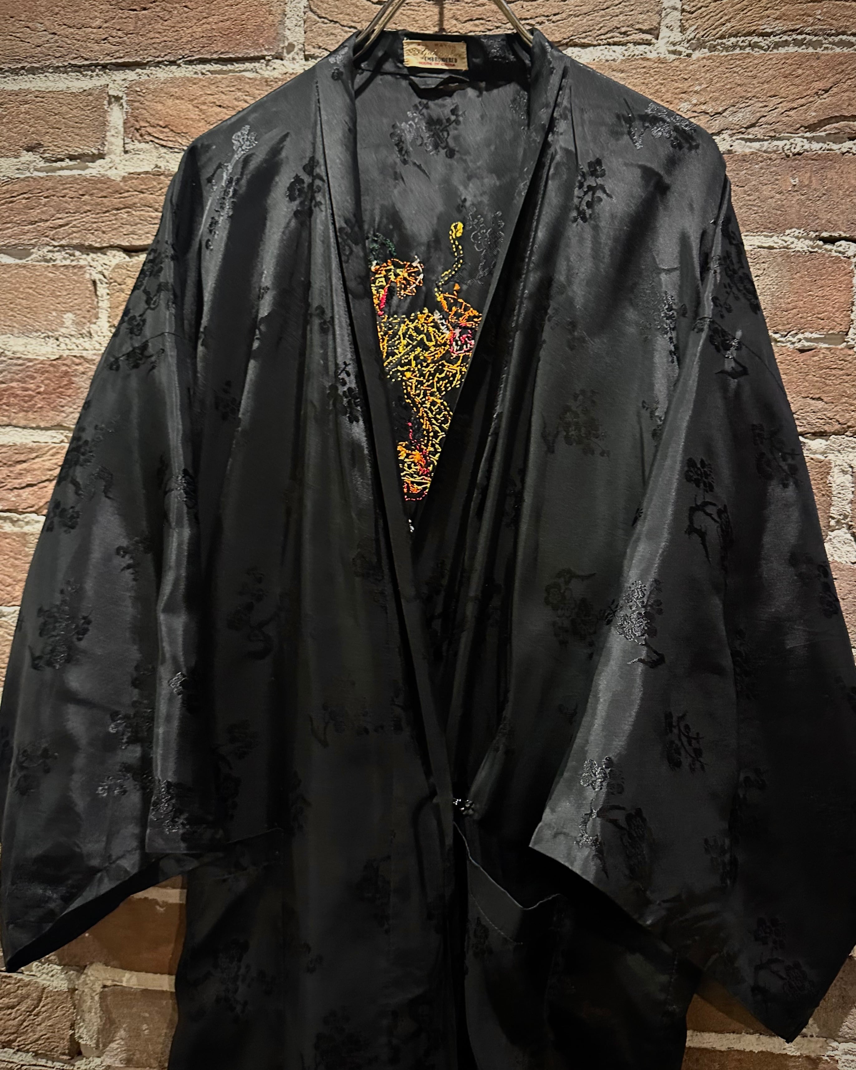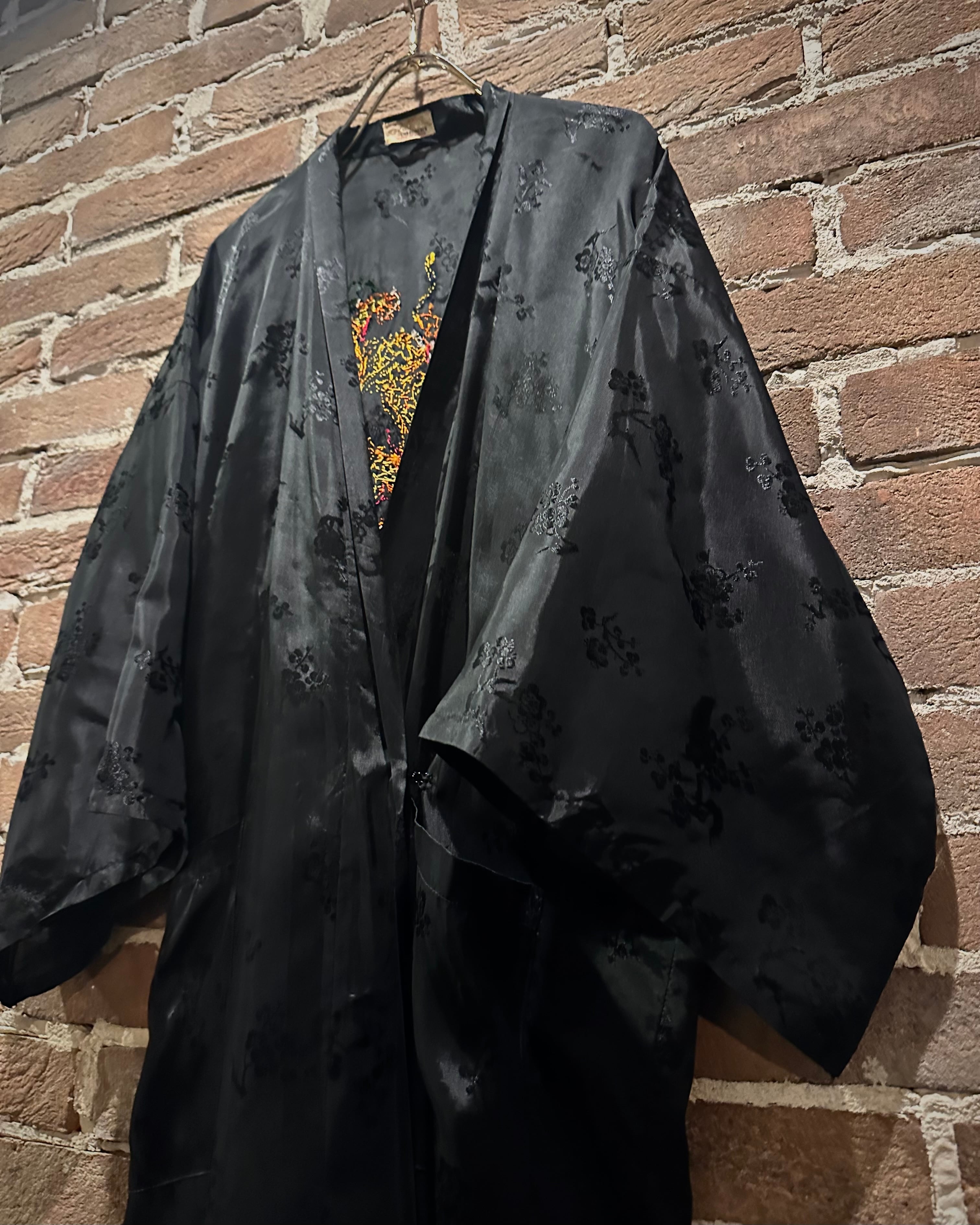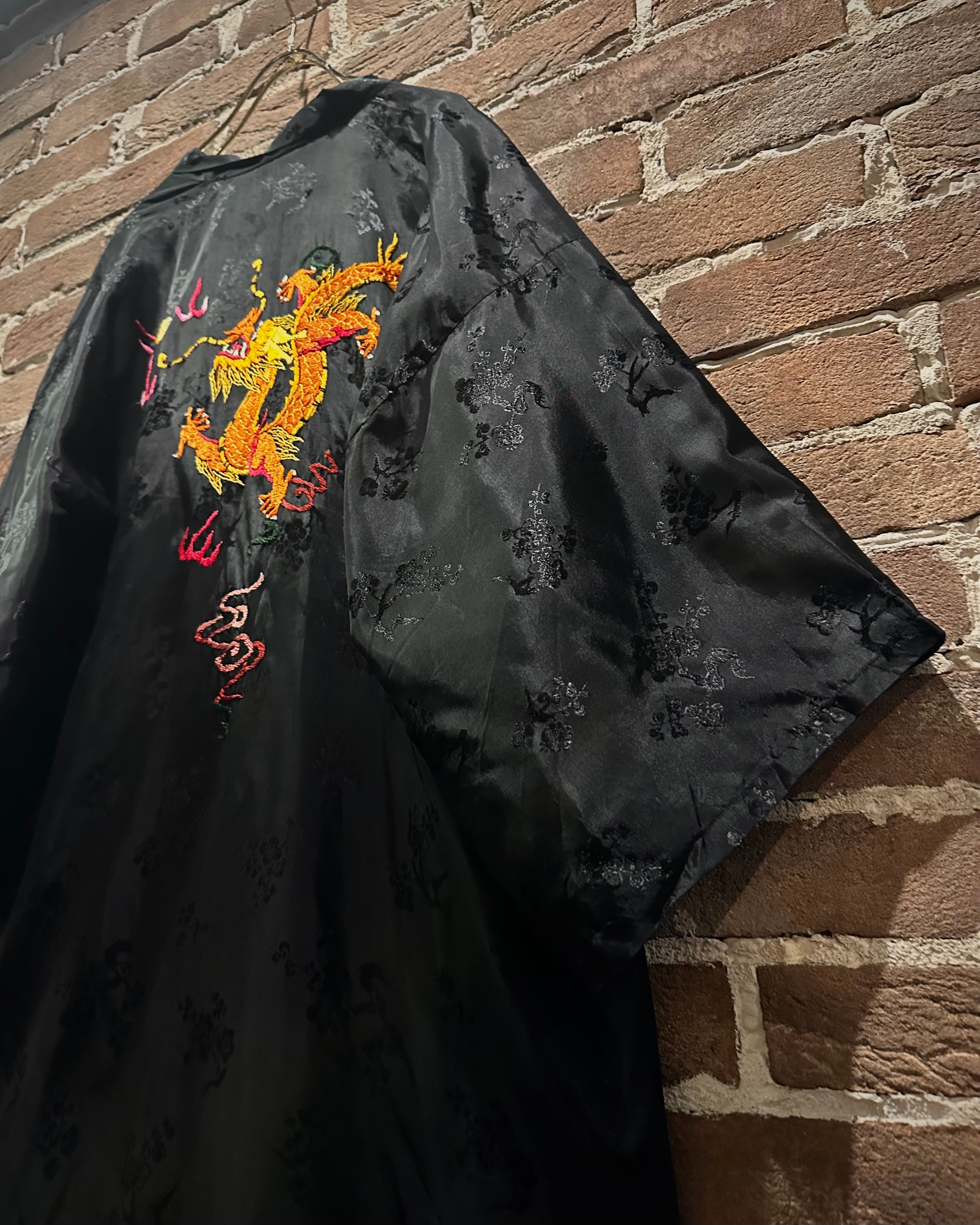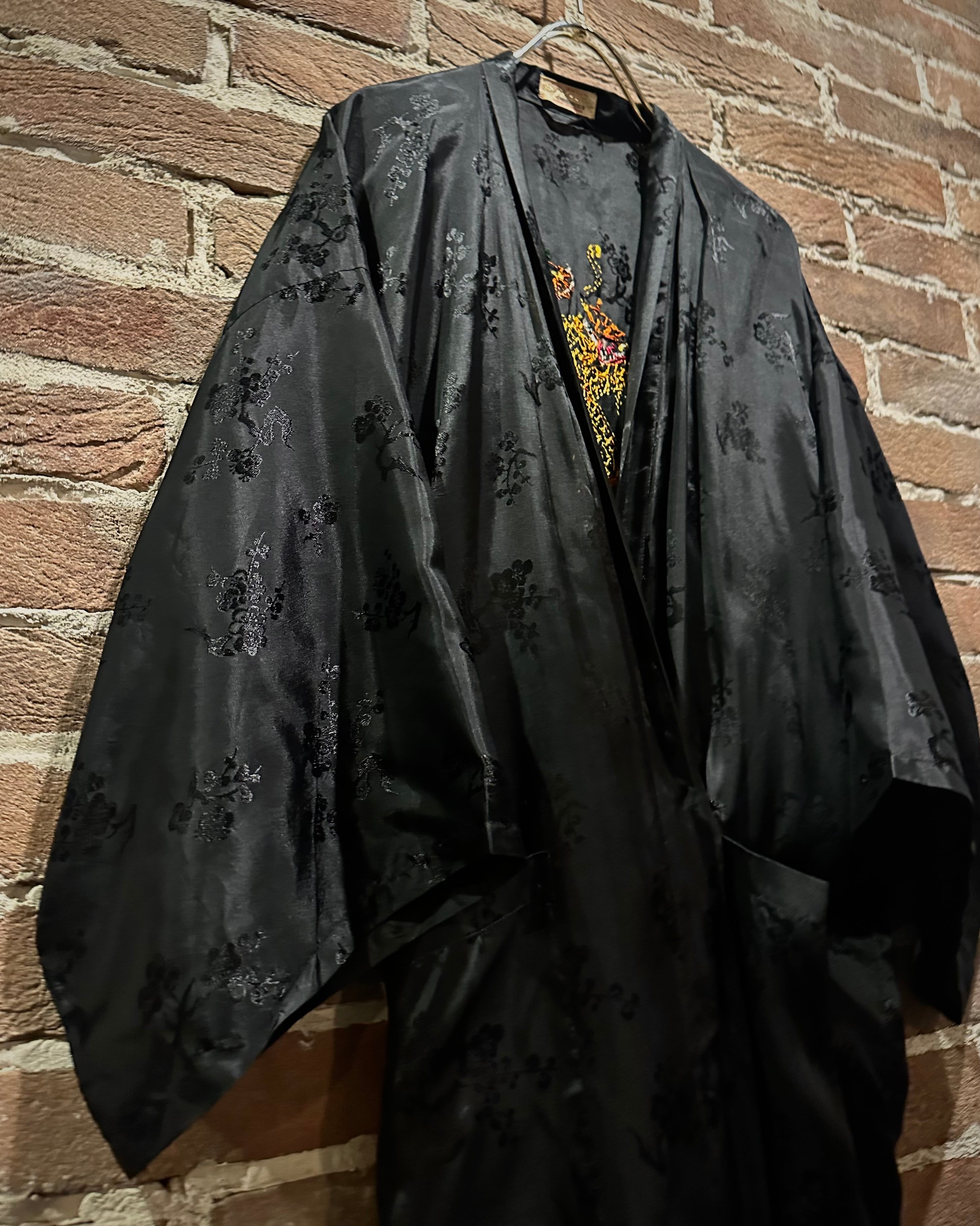 ツルッと滑らかな素材をベースに、花柄を織りで表現、背面にオリエンタルな雰囲気漂う龍の刺繍を刻んだチャイナガウン。