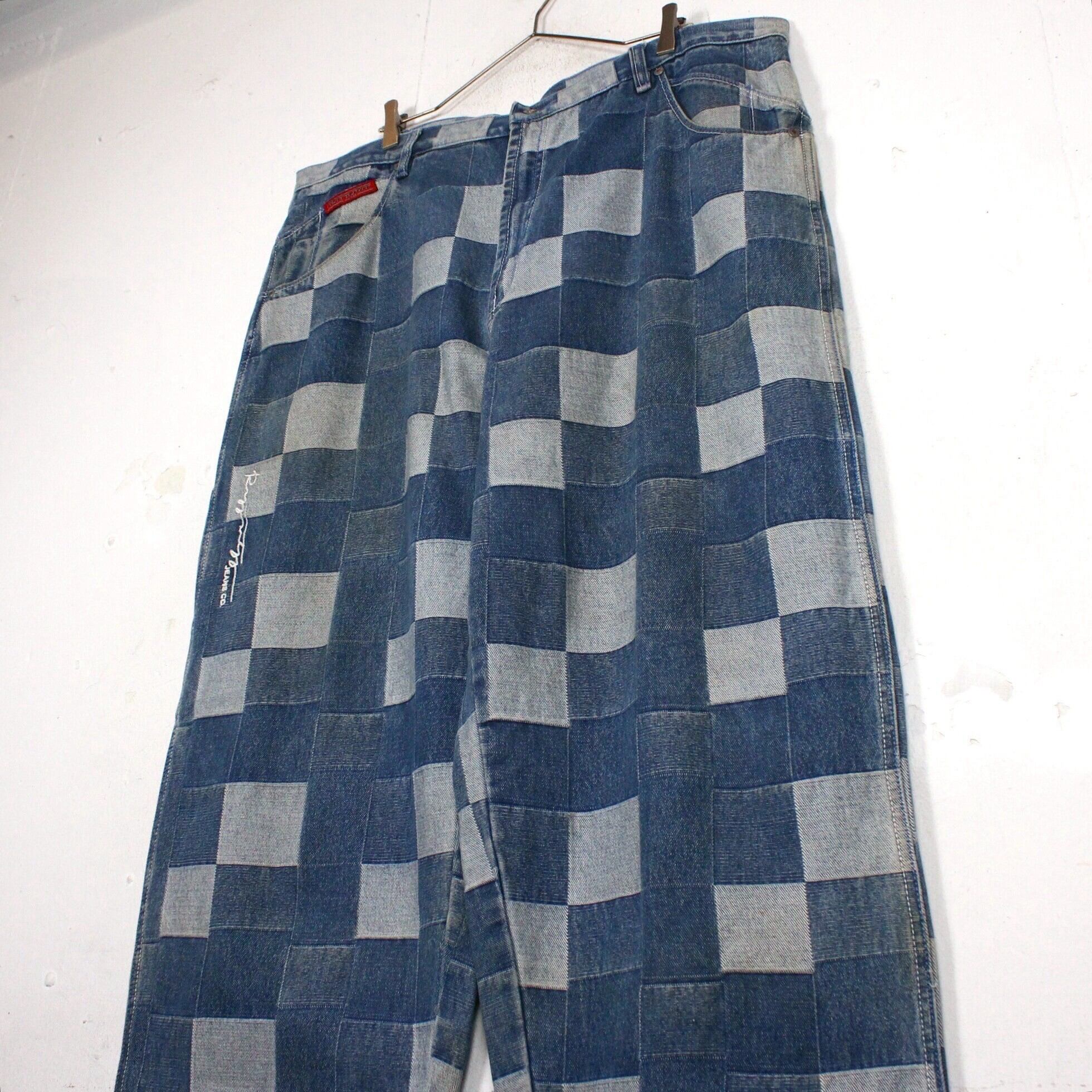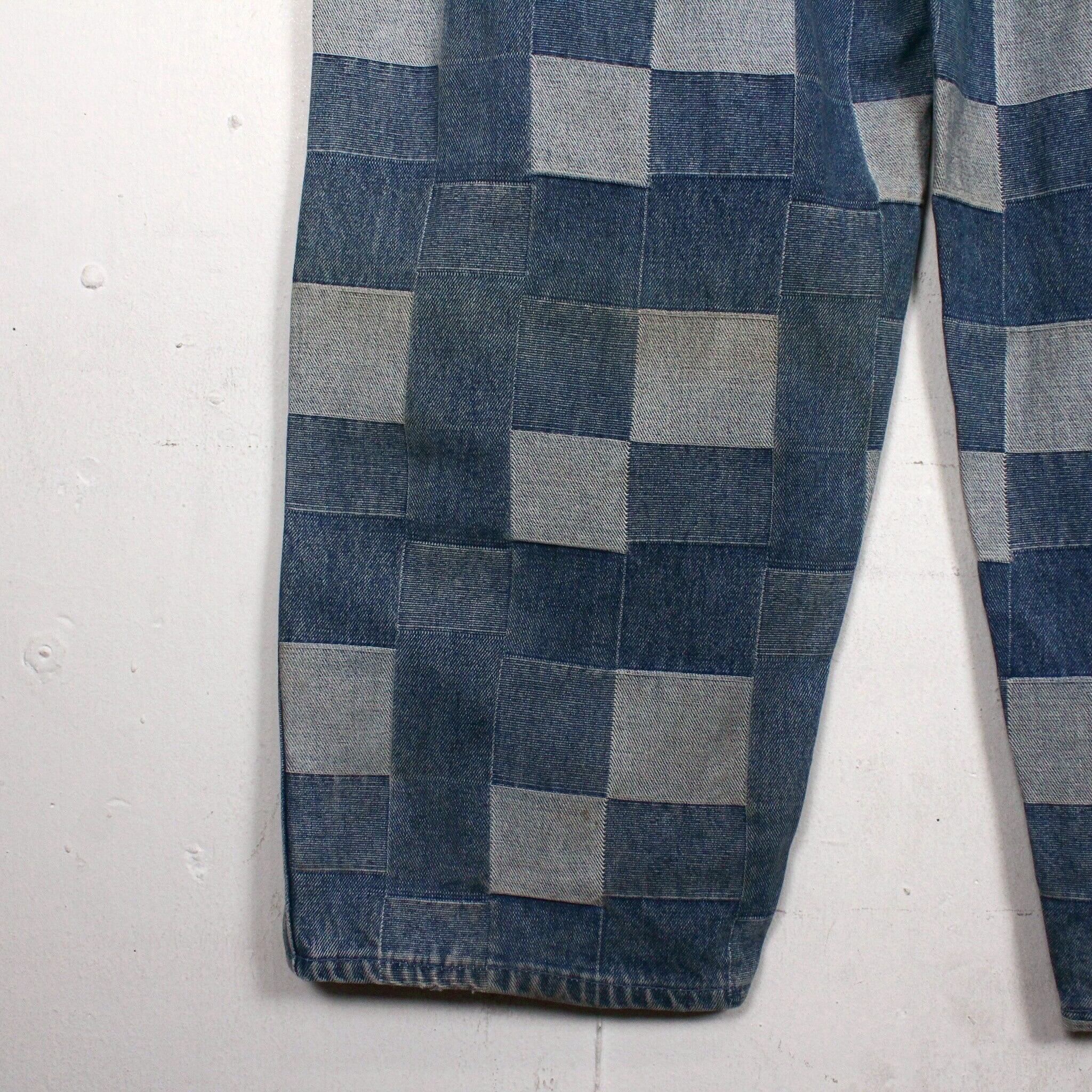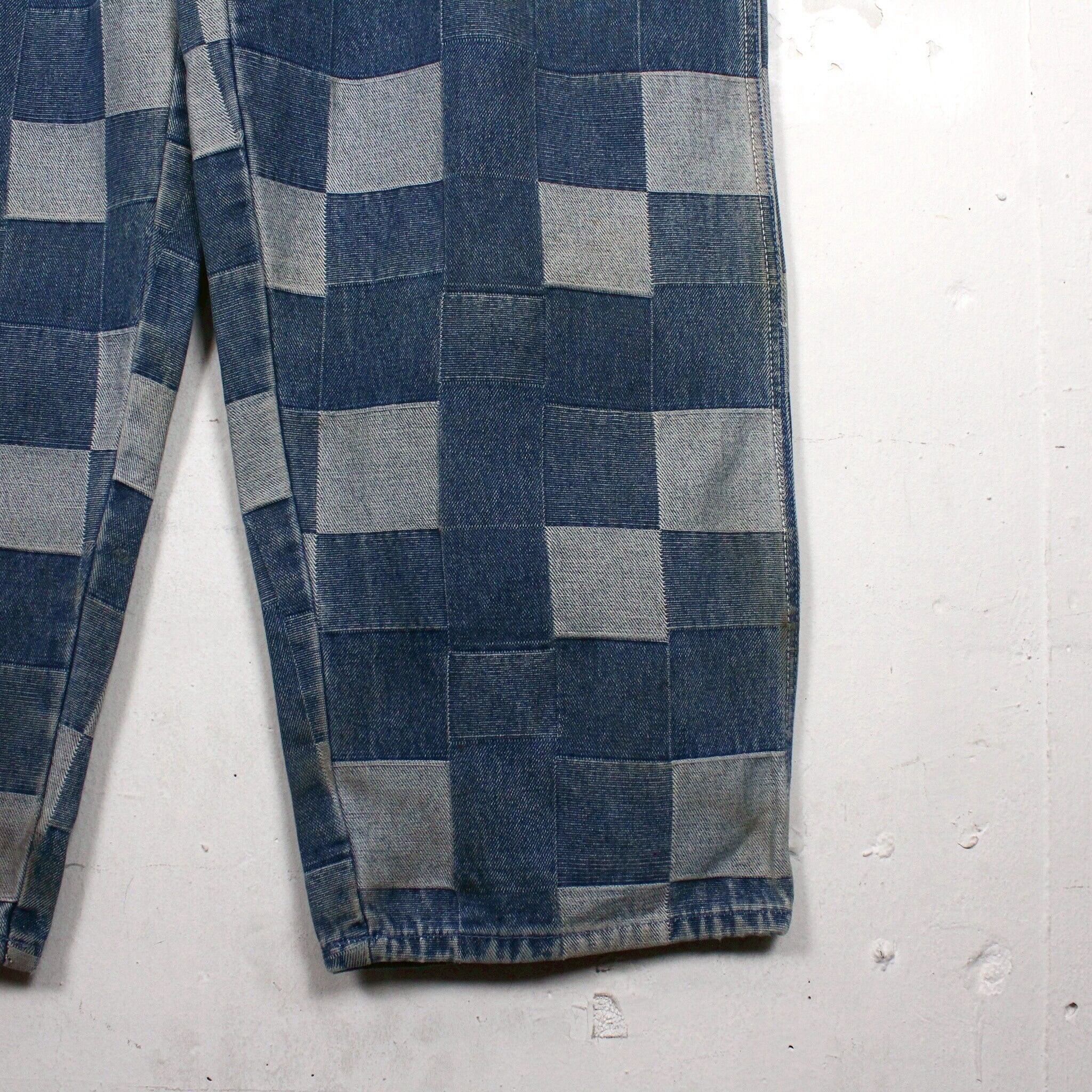 トーンの異なるデニムをパッチワークで繋ぎ合わせたワイドデニムパンツ。