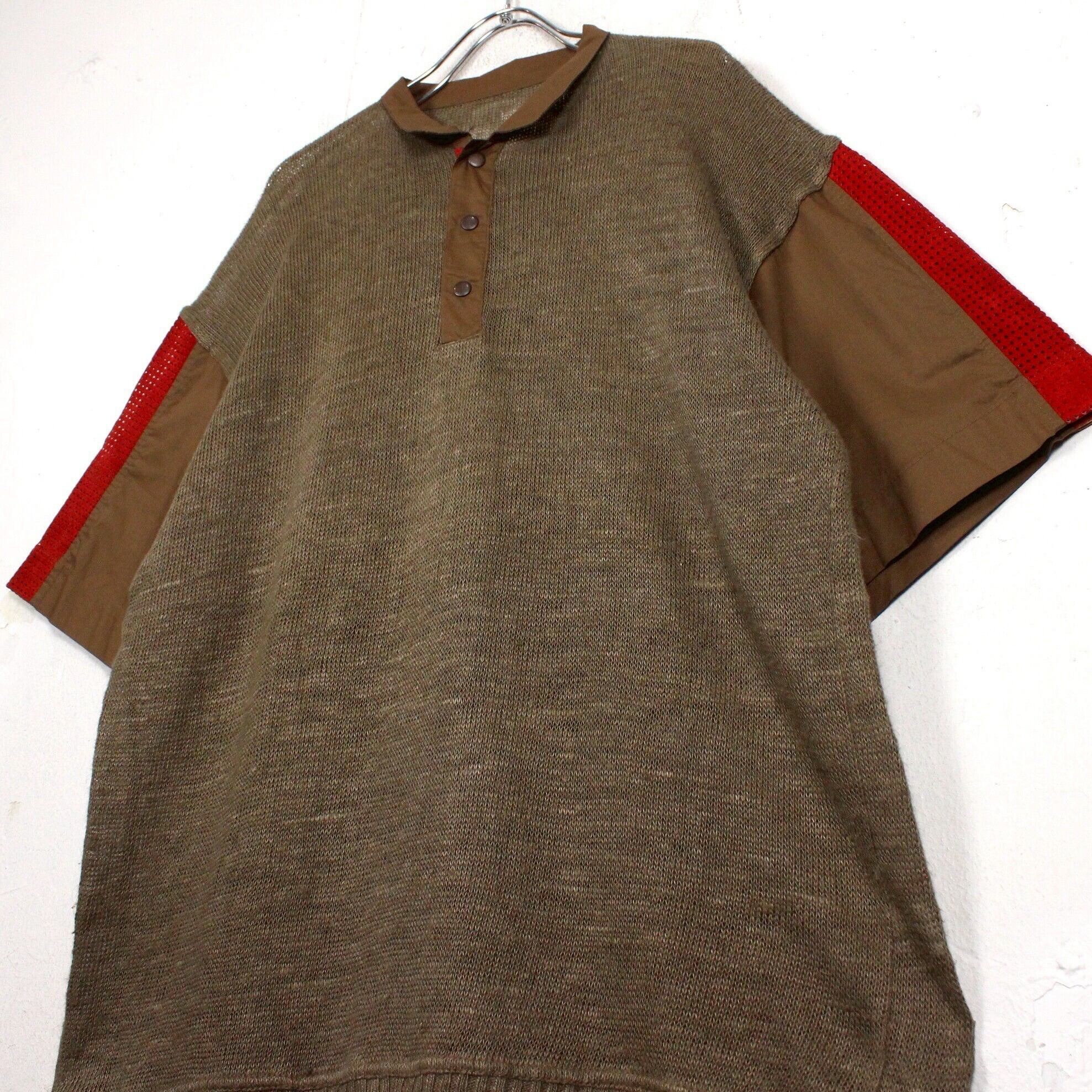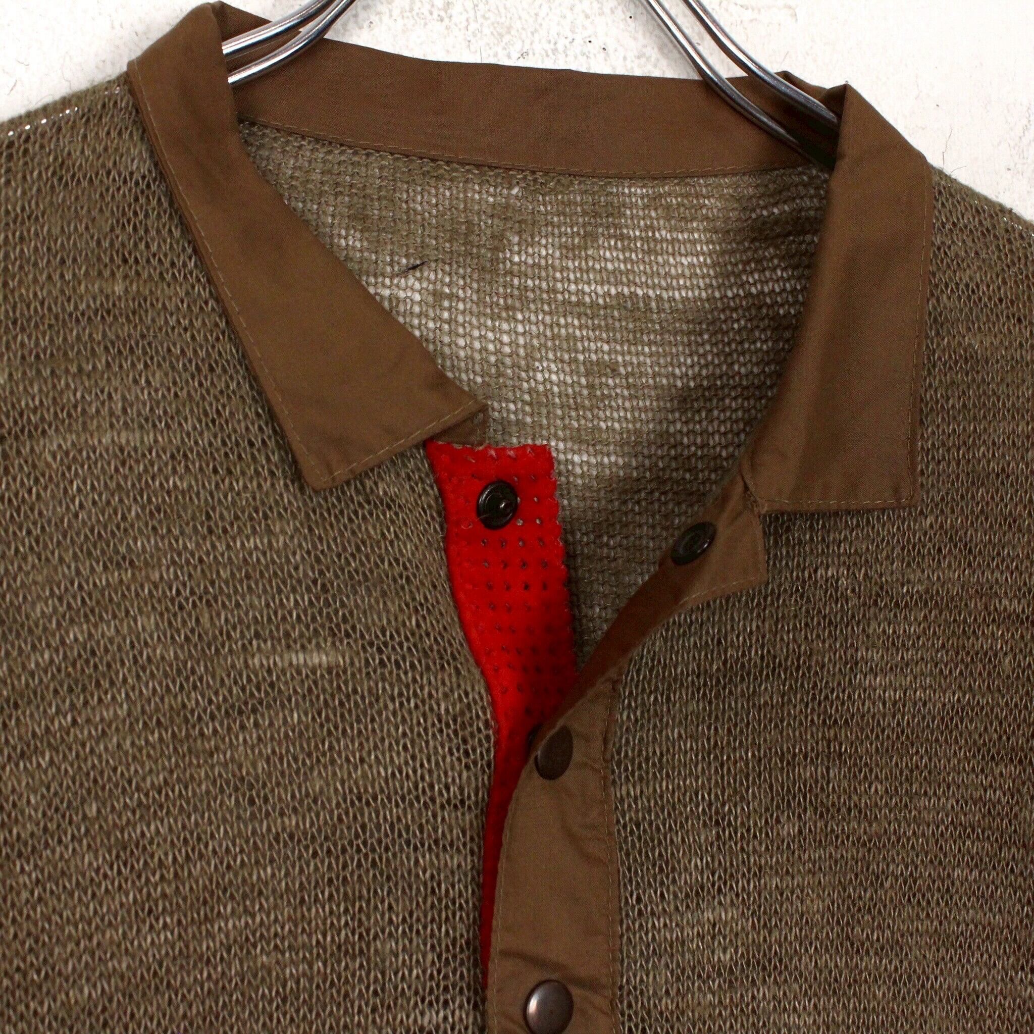 リネンを用いた柔らかく、ハリのあるサマーニットのボディに、袖、フロントのボタン部分に真紅のパンチングレザーを切り替えたイタリーメイドのニットポロ。