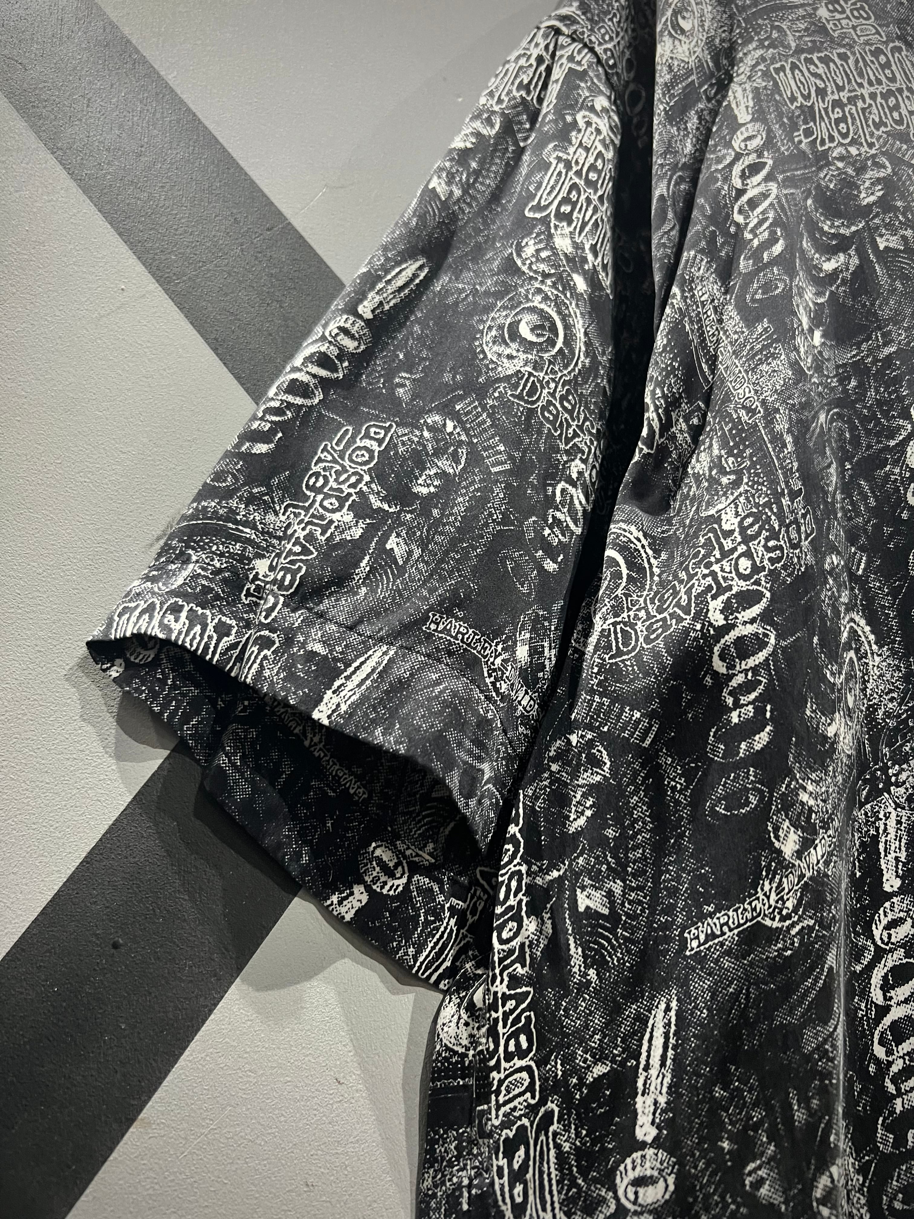 手触り滑らかなボディに、バイクのパーツやブランドロゴをボディ全体に載せた総柄半袖シャツ。