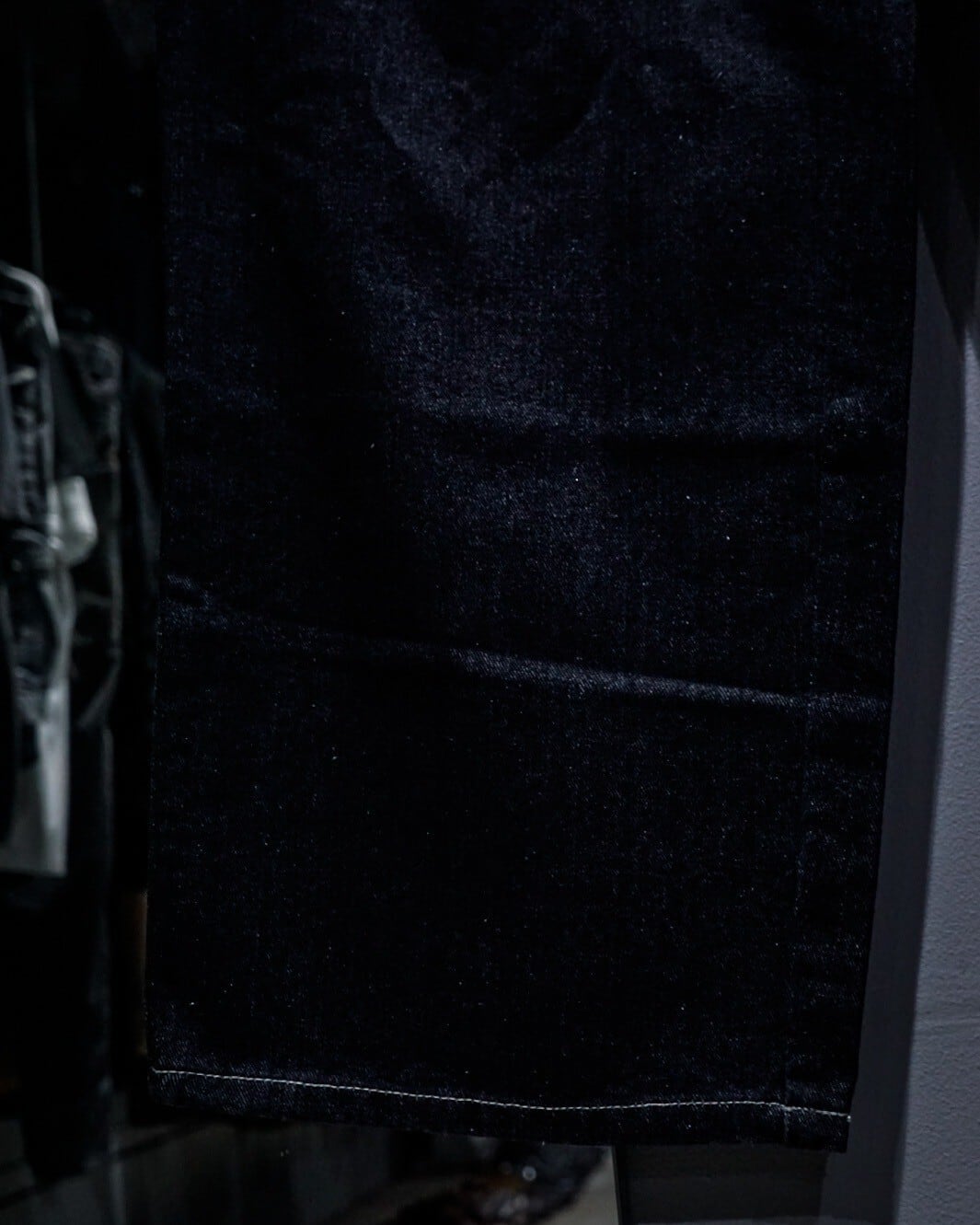 青×白の2色を用いて走らせたステッチや、ロゴの刻印が刻まれたリベット、ウエストのレザーパッチ等々、造り込みのクオリティの高さも当ブランドならでは。