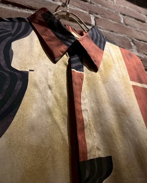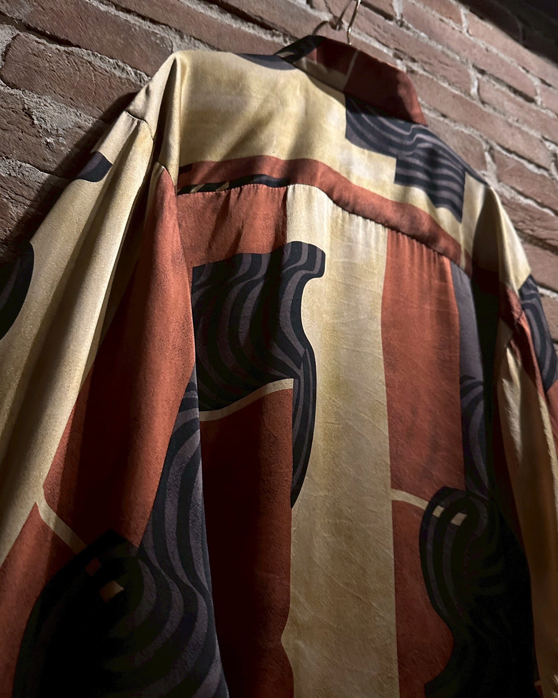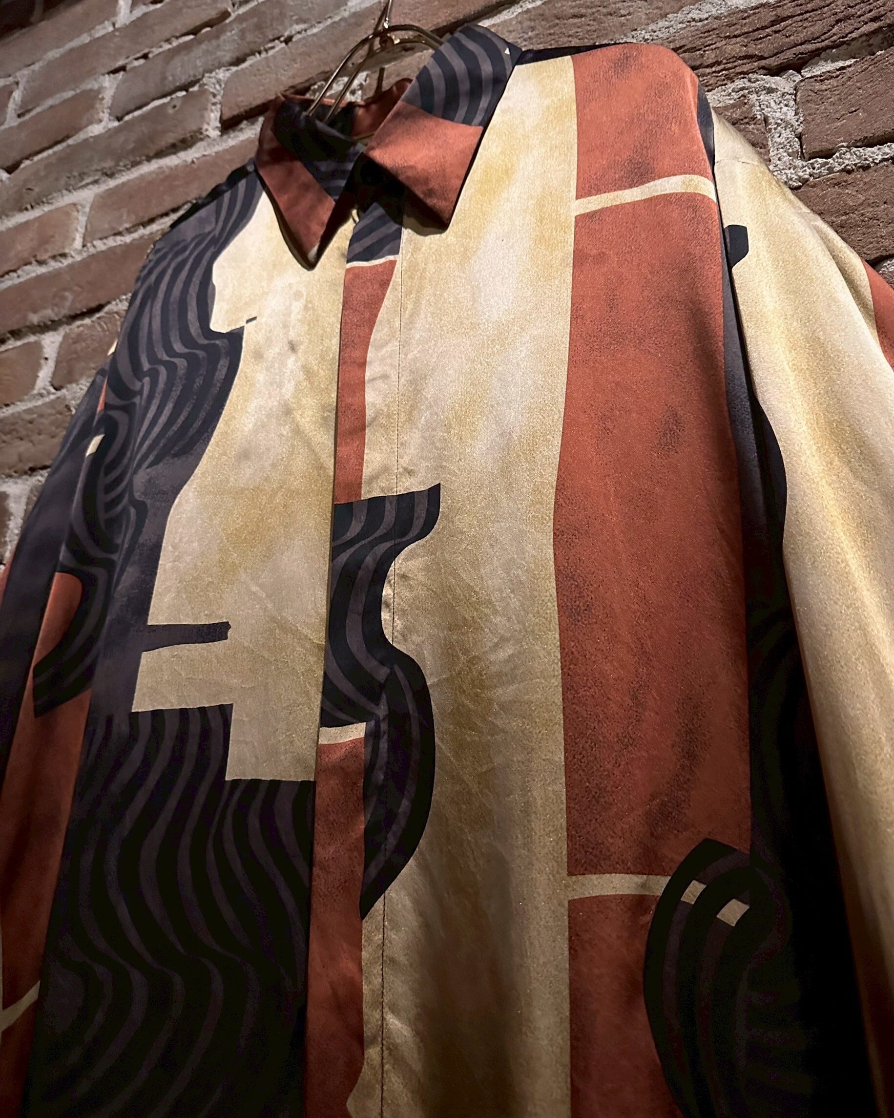 ツルッと滑らかなシルクを用いたボディに、アーティスティックかつ幾何学的なデザインを載せた長袖シャツ。