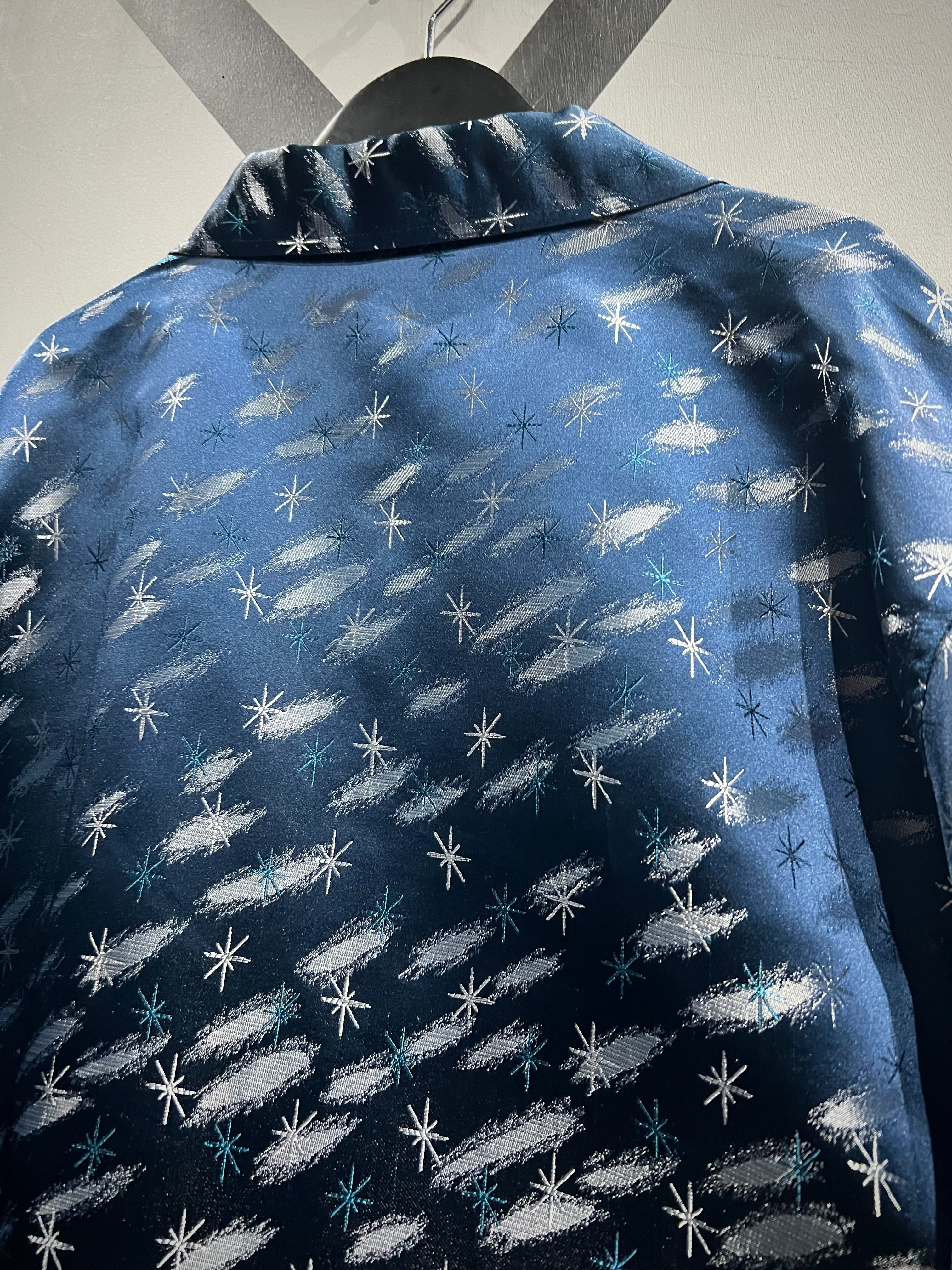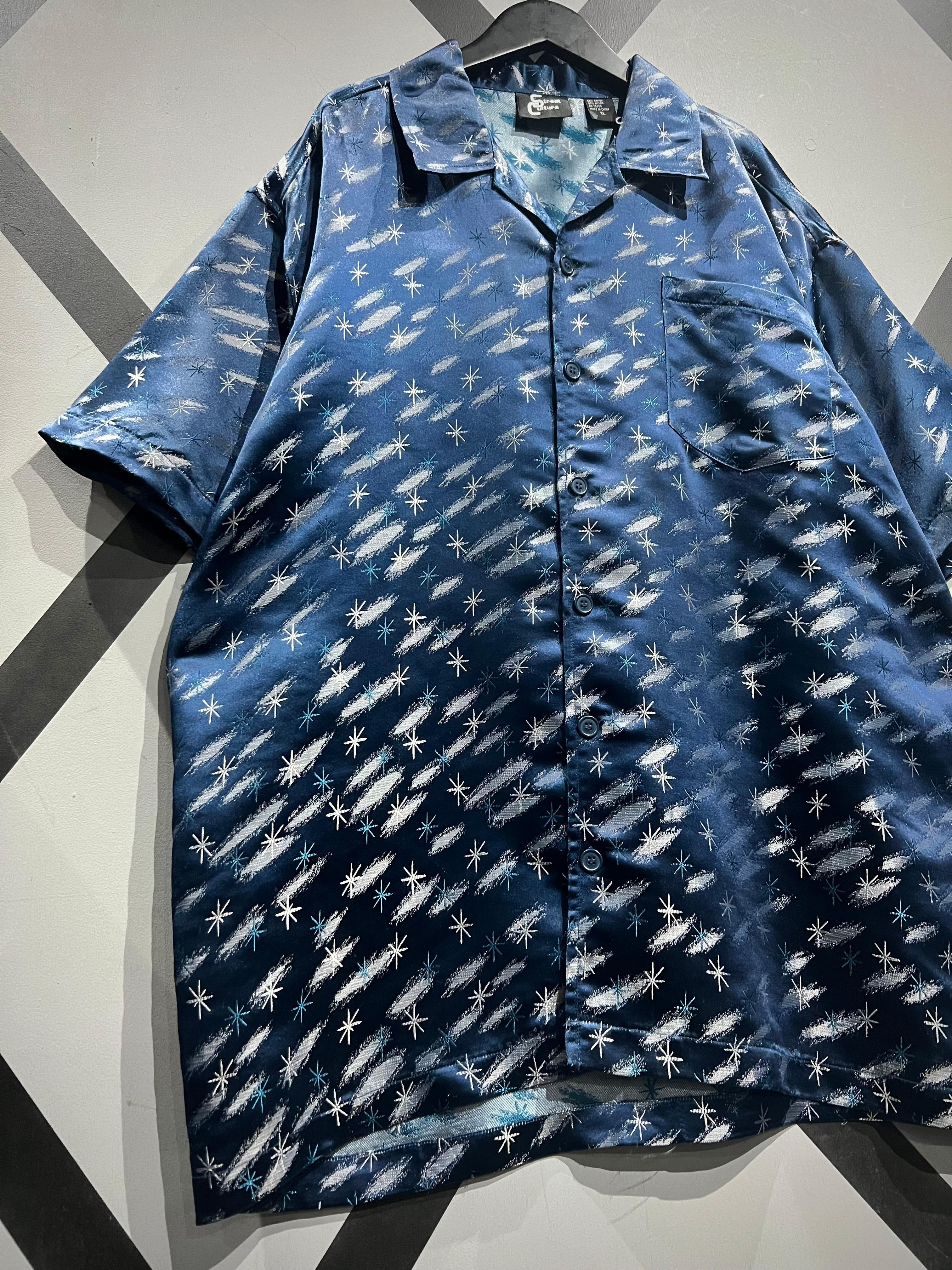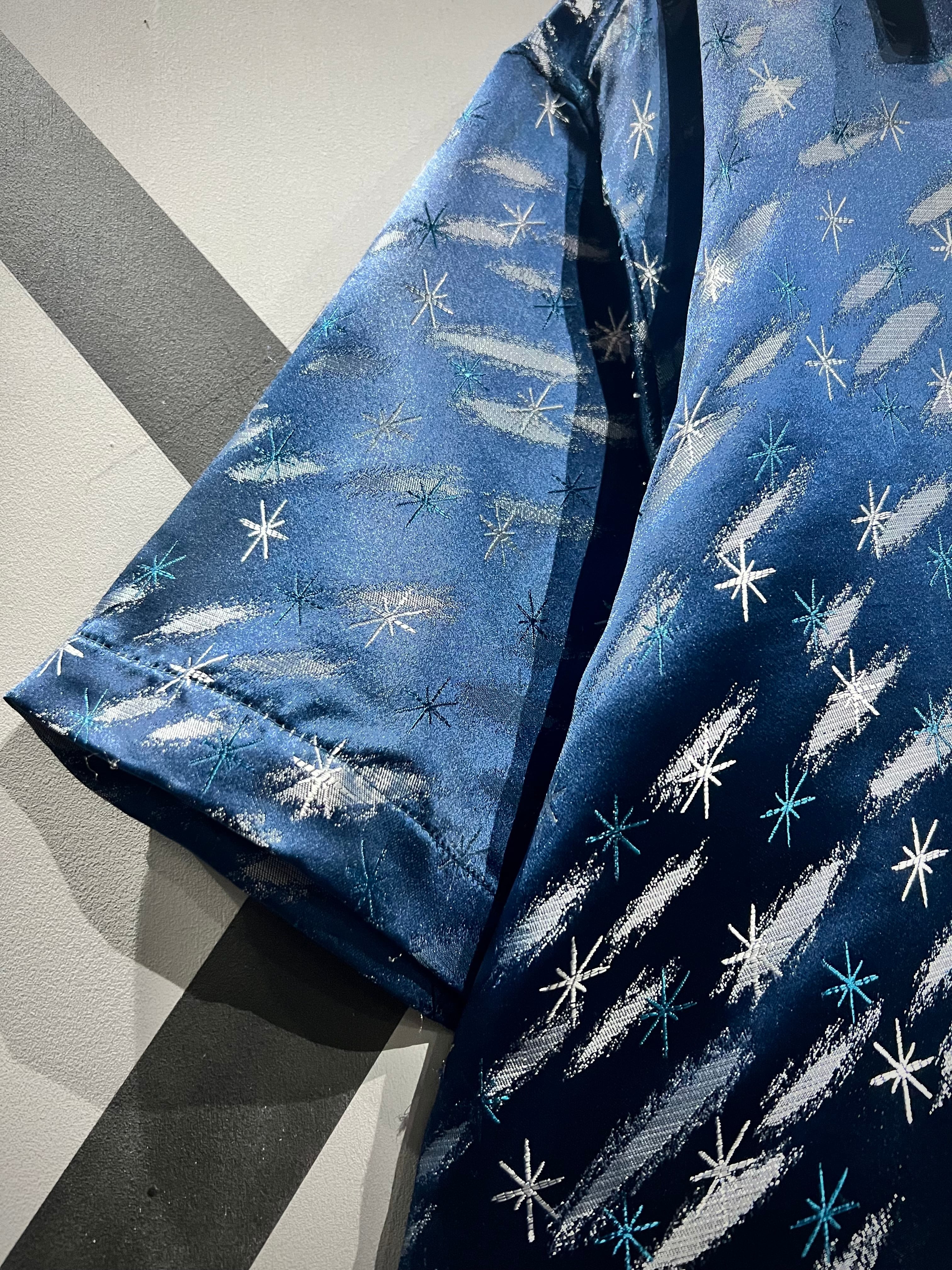 糸の織りによってアトミック調の柄模様をボディ全面に散りばめた半袖オープンカラーシャツ。