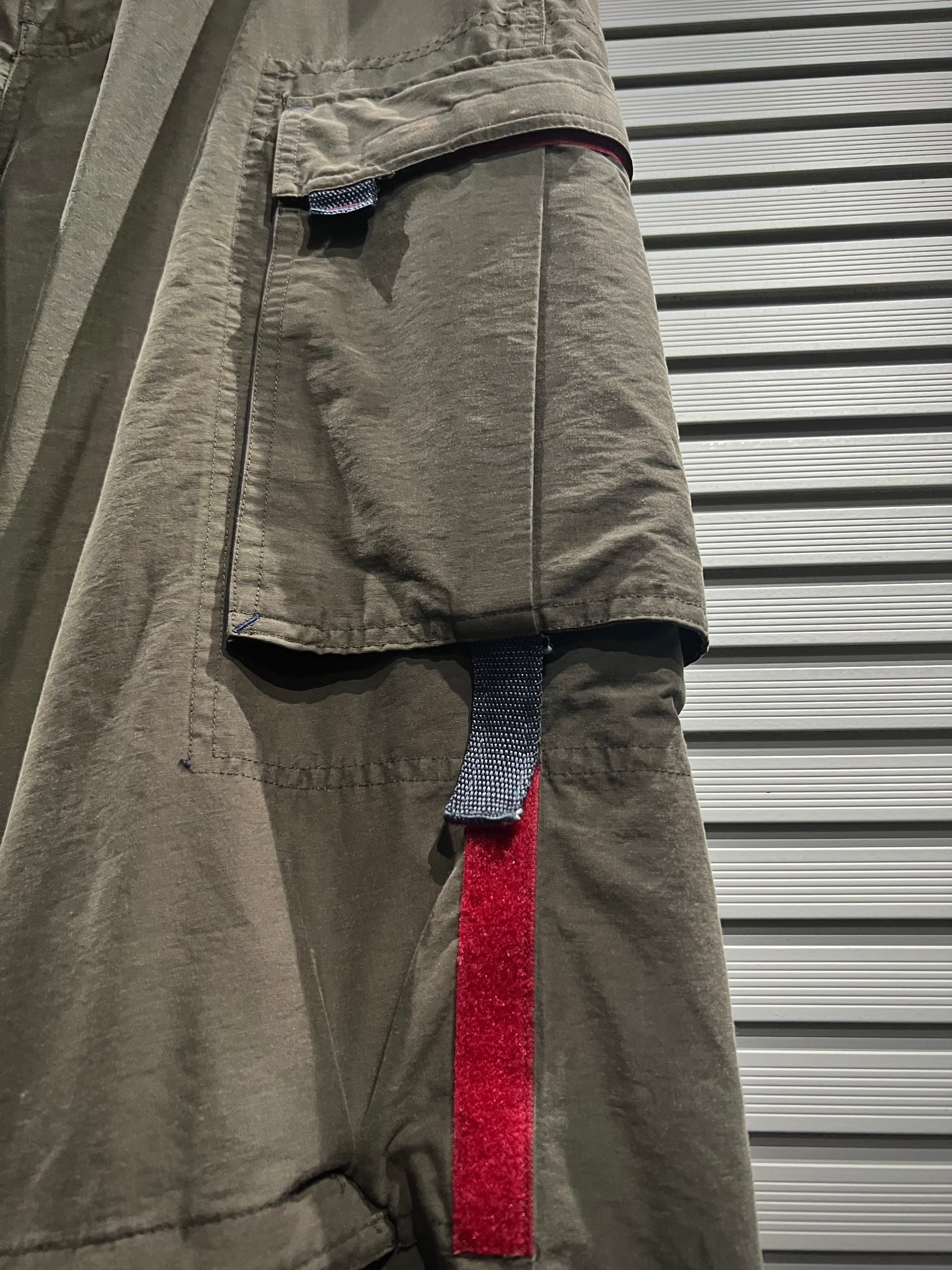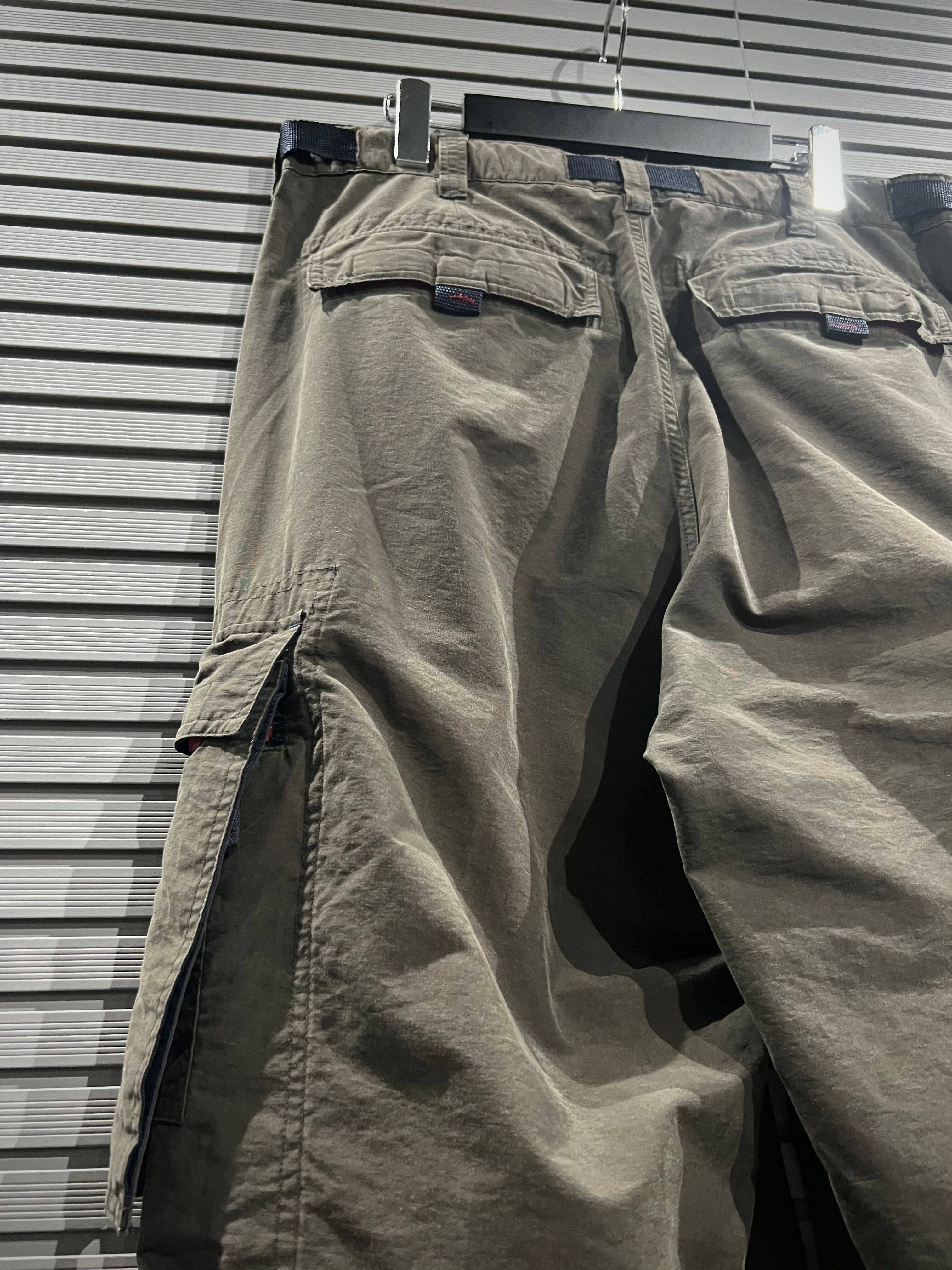 大きなカーゴポケットに加え、随所に施されたベルクロギミックが目を引く一本。ボディサイドのマチ付きポケットは立体感があり、収納力はもちろん、無骨さと洒落感を両立したデザインアクセントに。