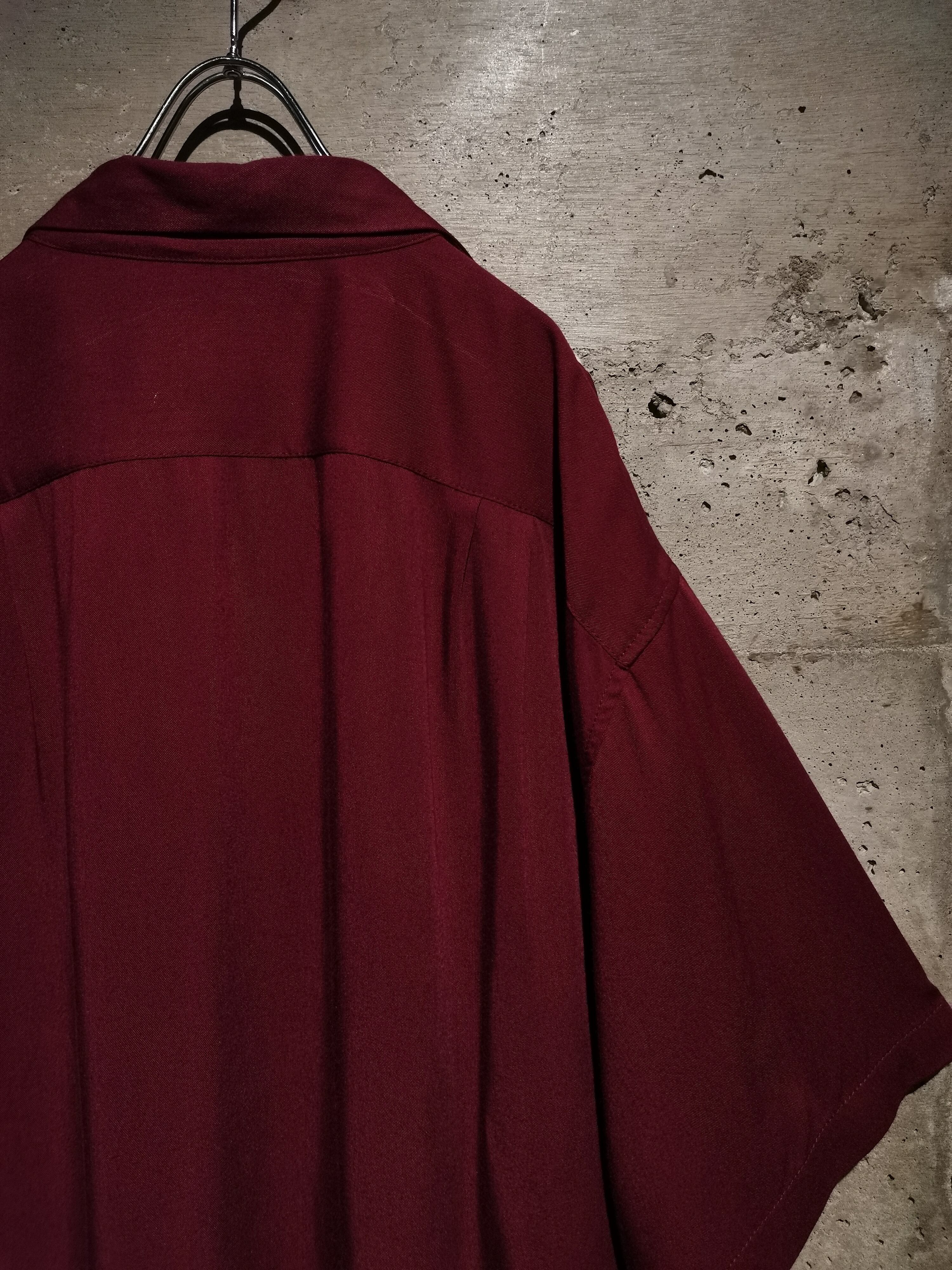ボルドーカラーのボディに、レオパード柄をあしらったフェイクファーを、フロントに縦線状に切り替えた半袖オープンカラーシャツシャツ。