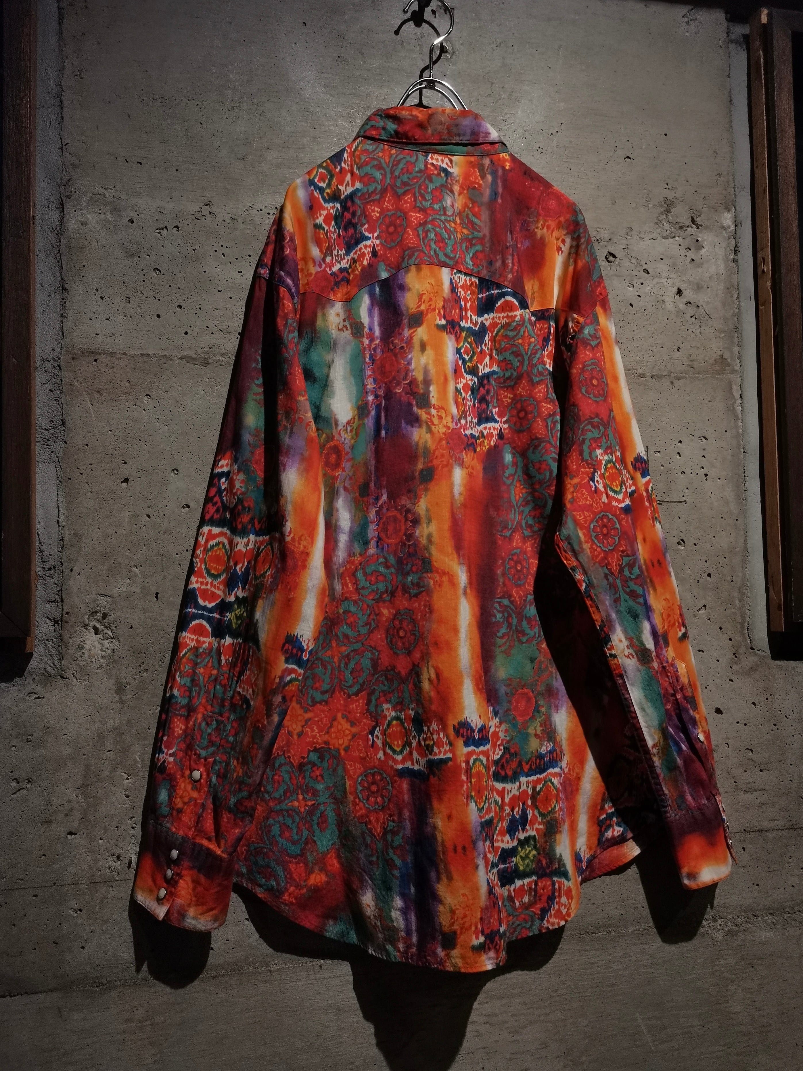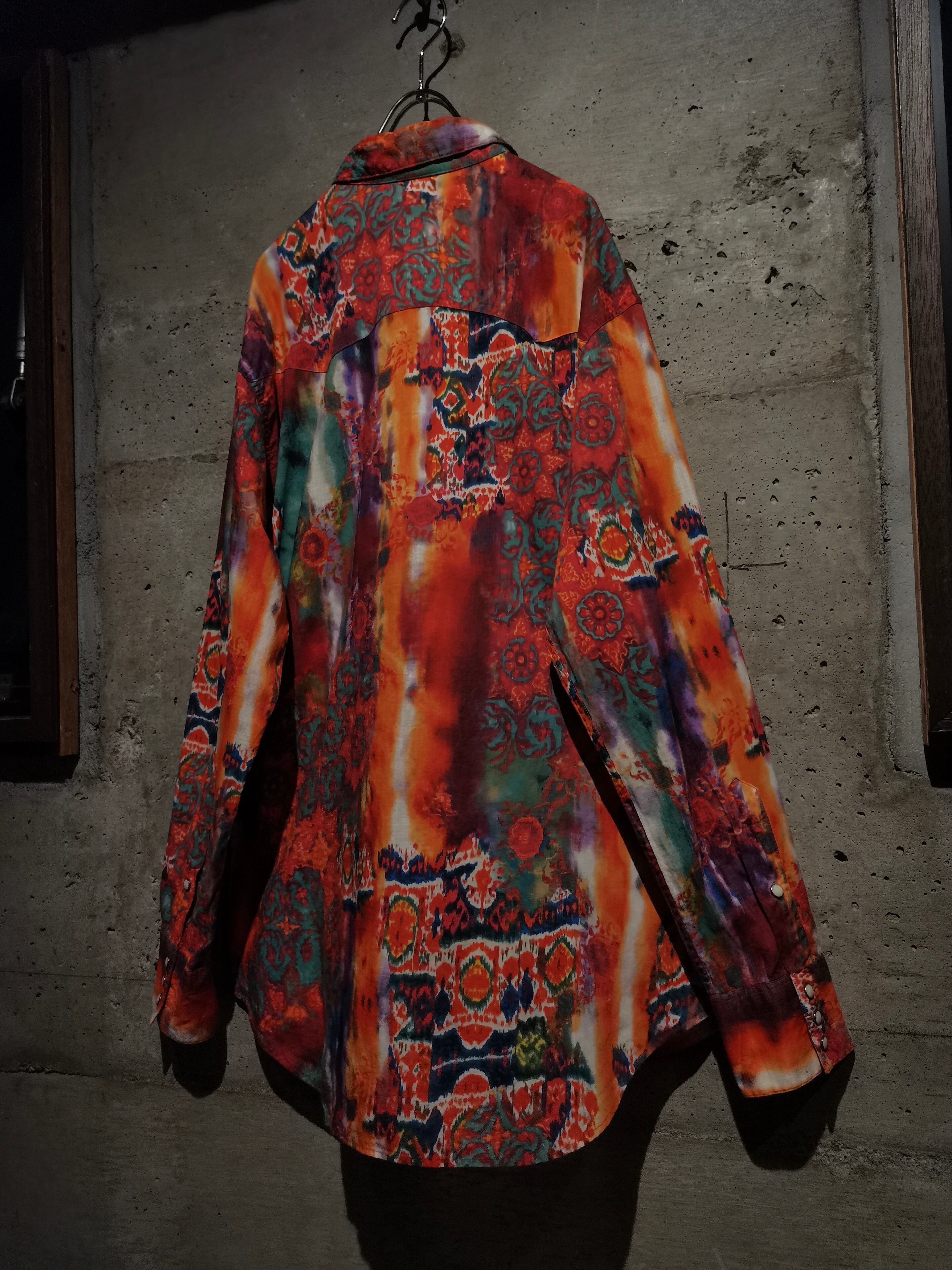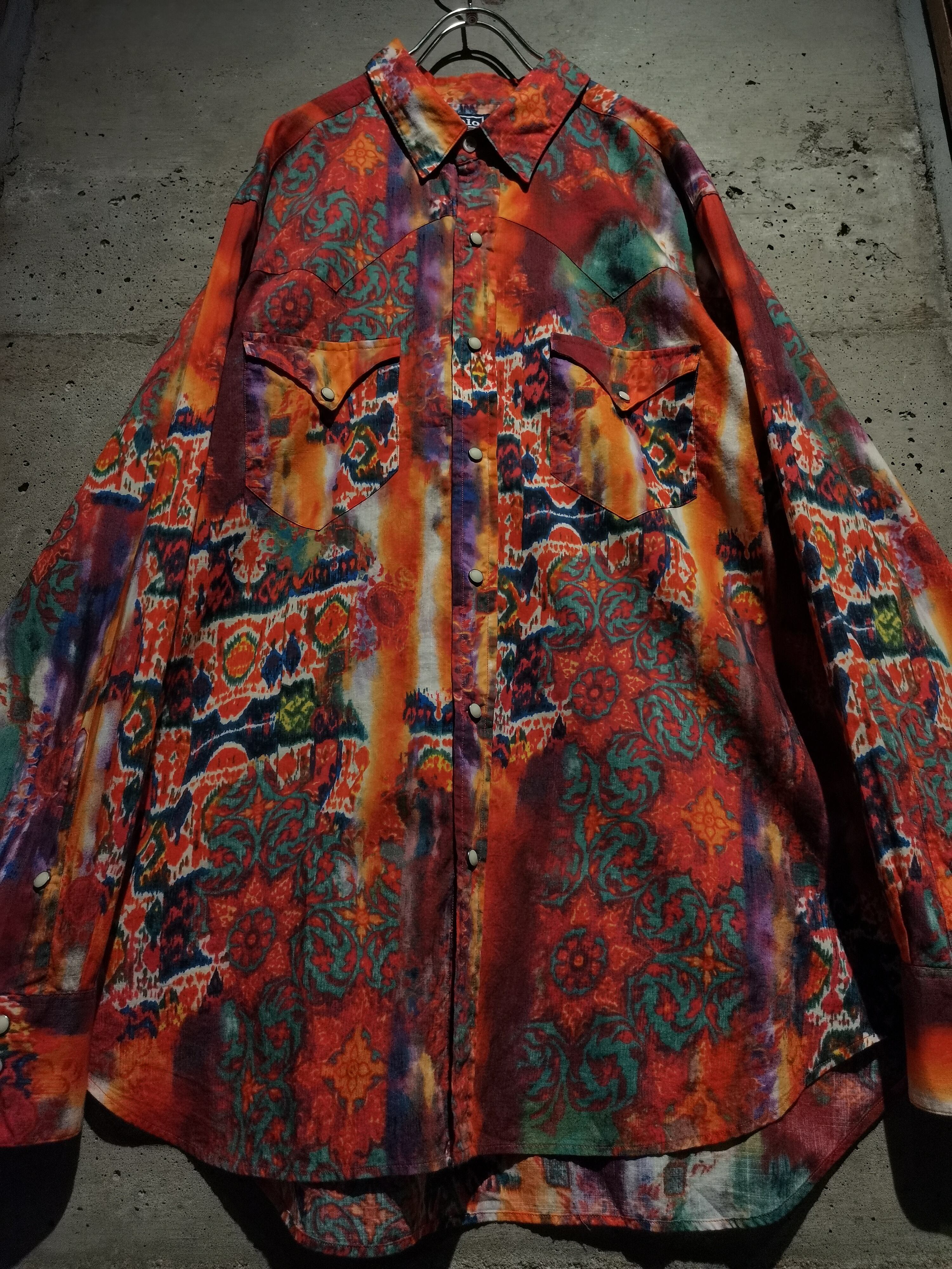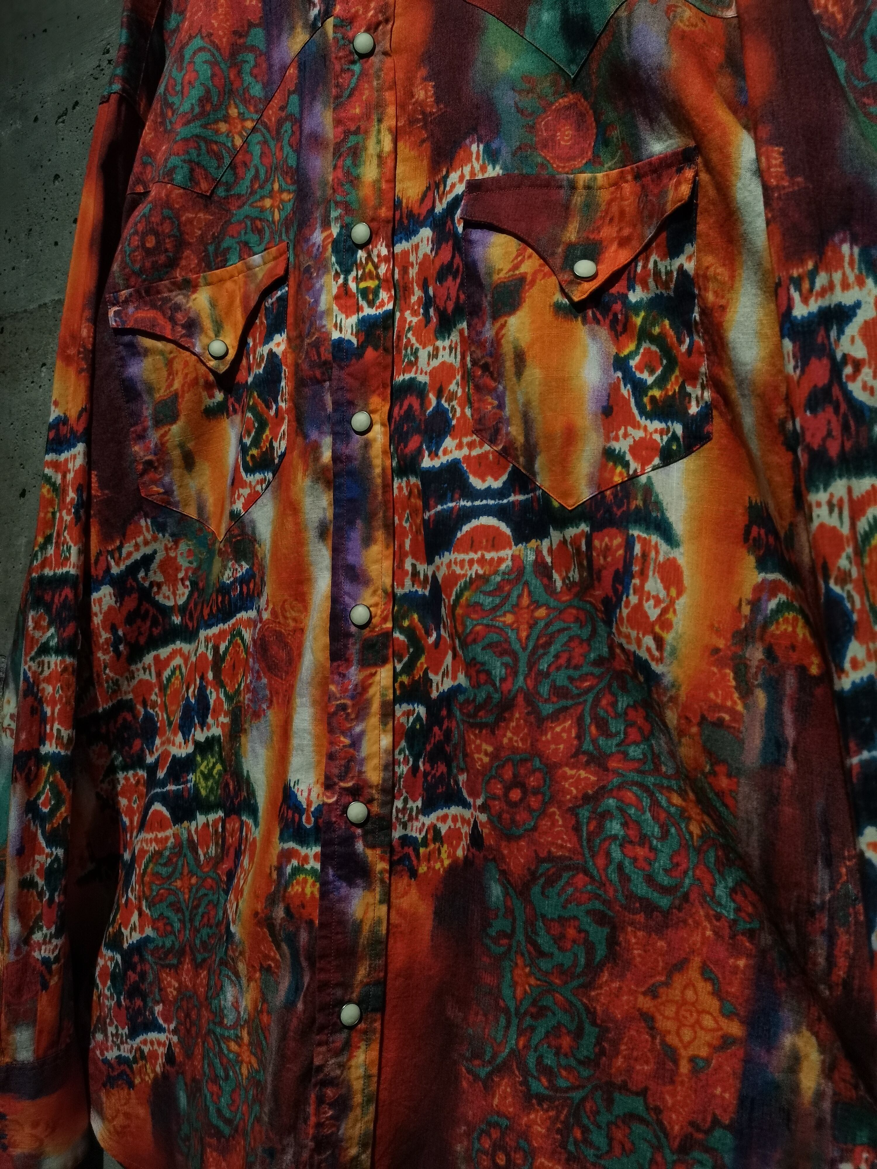 サラッと柔らかな質感のコットン素材をボディに使用。エスニックな柄をアーティスティックなタッチでボディ全体にあしらったウエスタンシャツ。