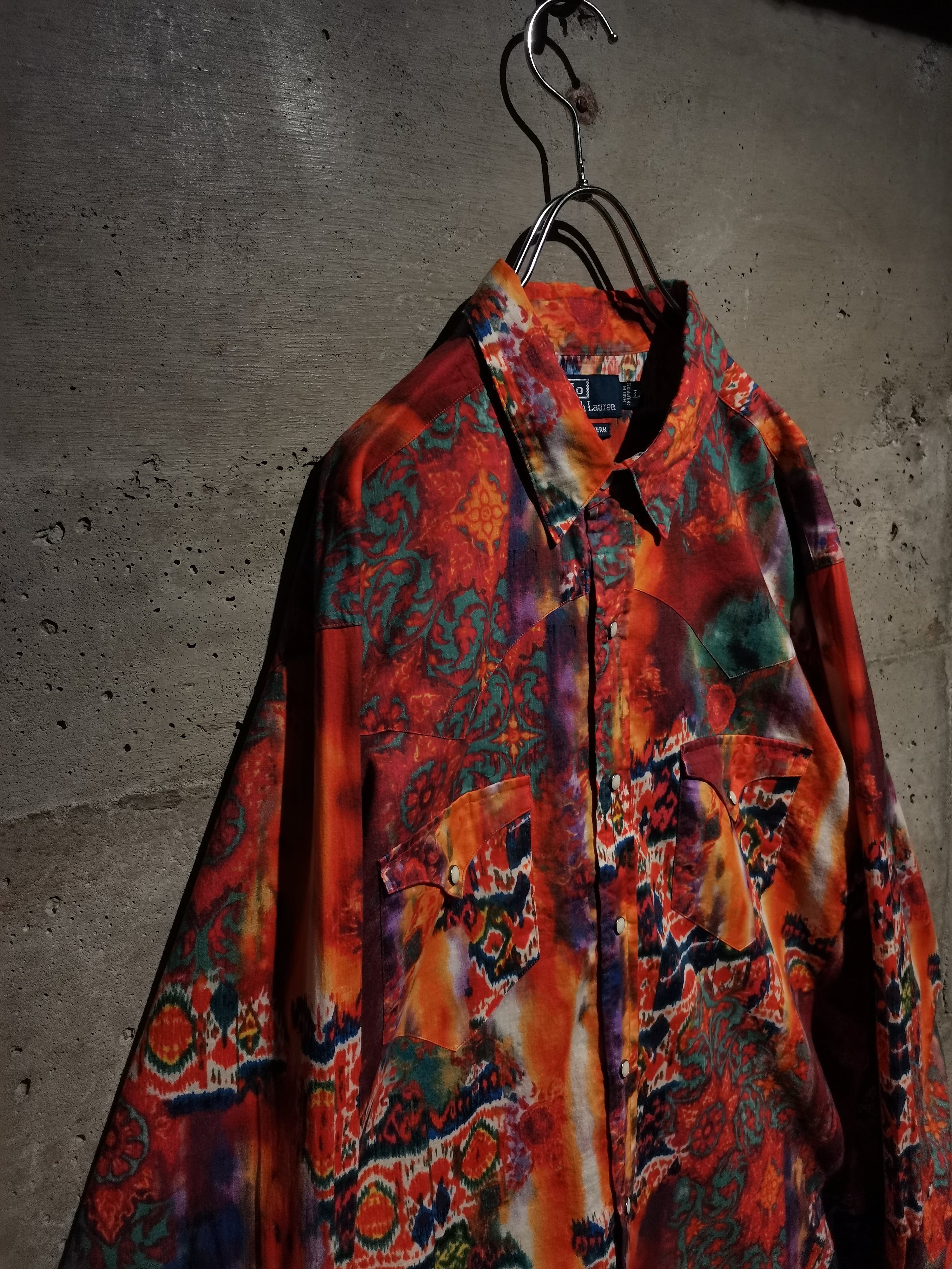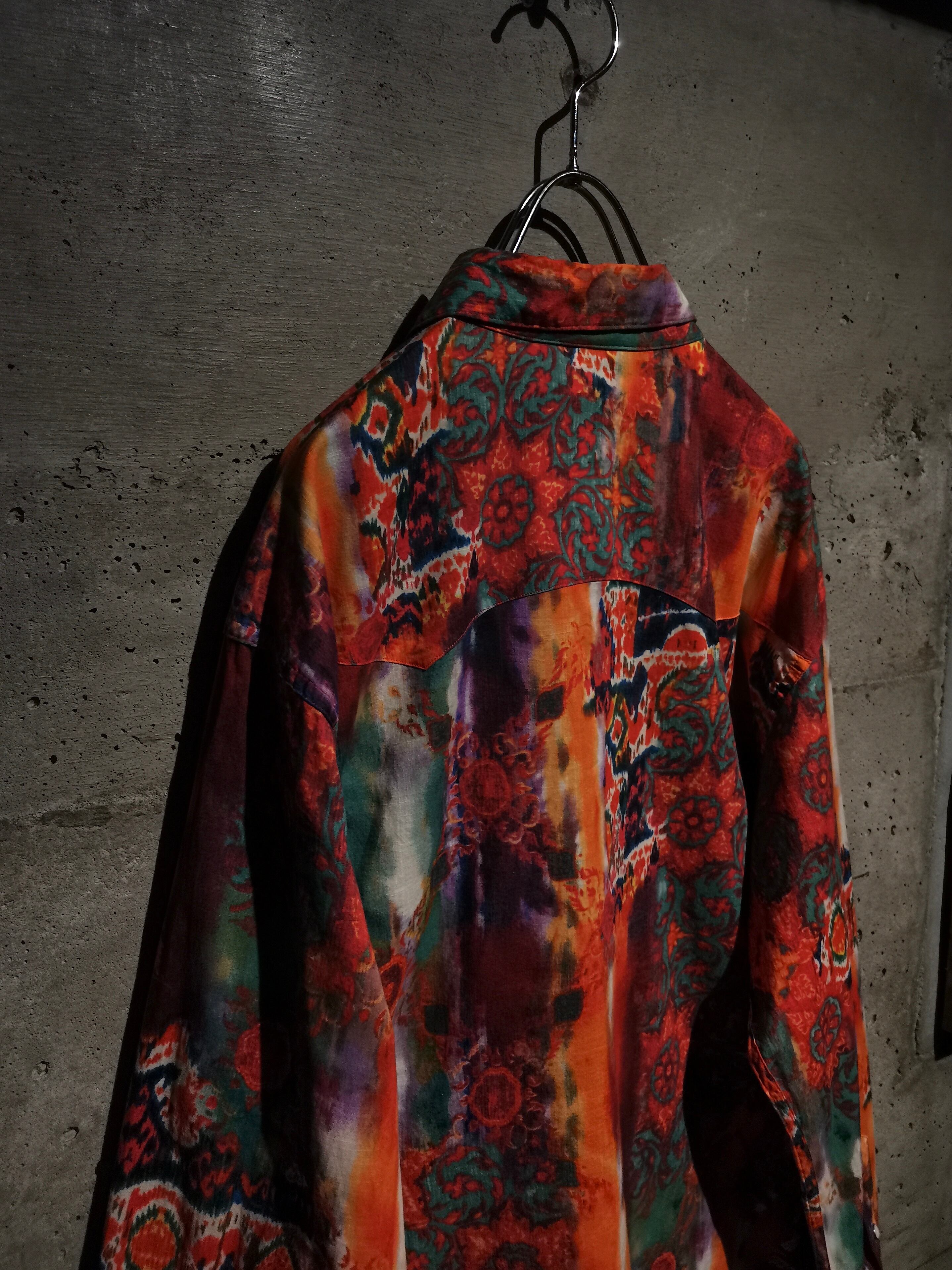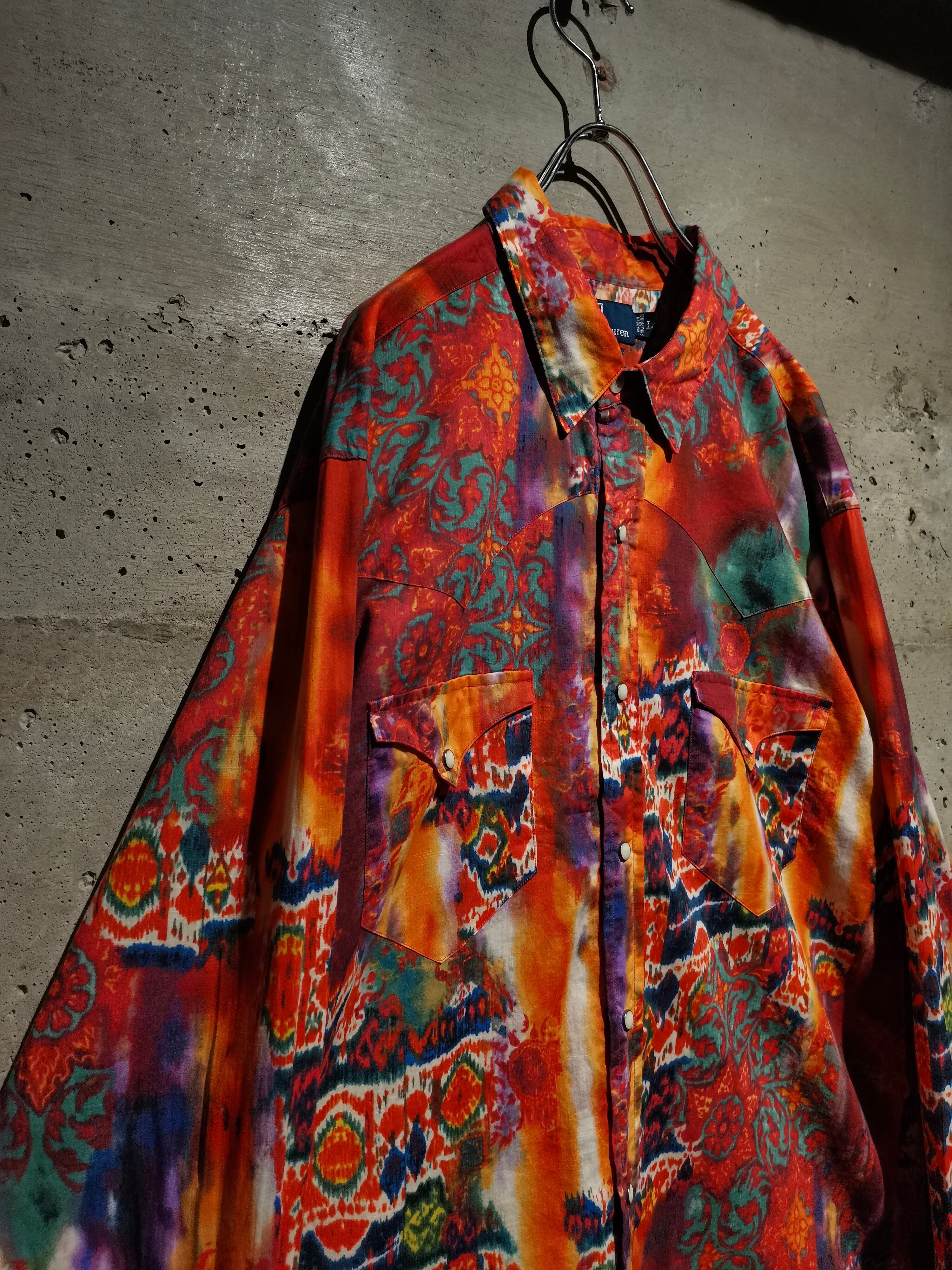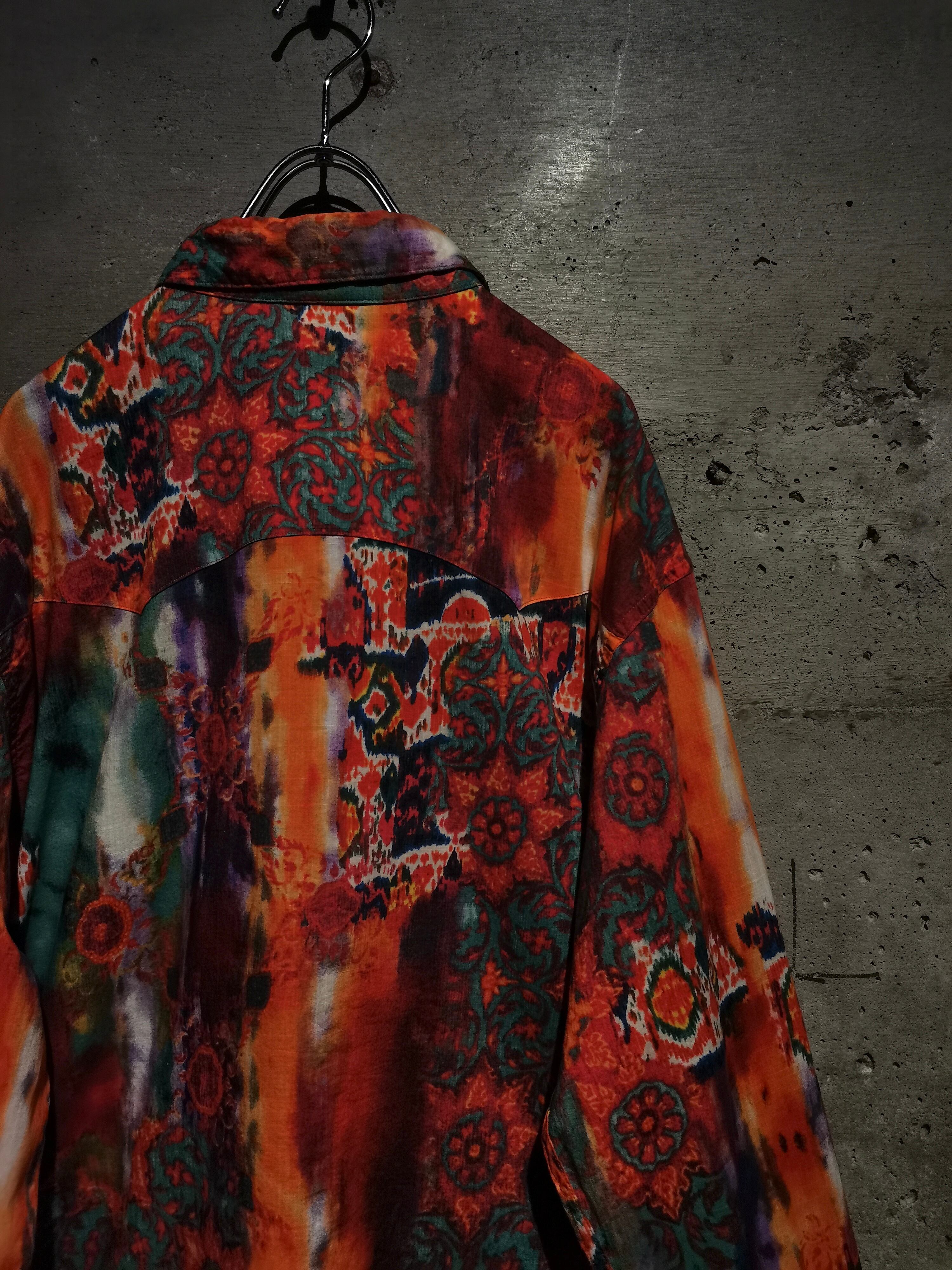 サラッと柔らかな質感のコットン素材をボディに使用。エスニックな柄をアーティスティックなタッチでボディ全体にあしらったウエスタンシャツ。