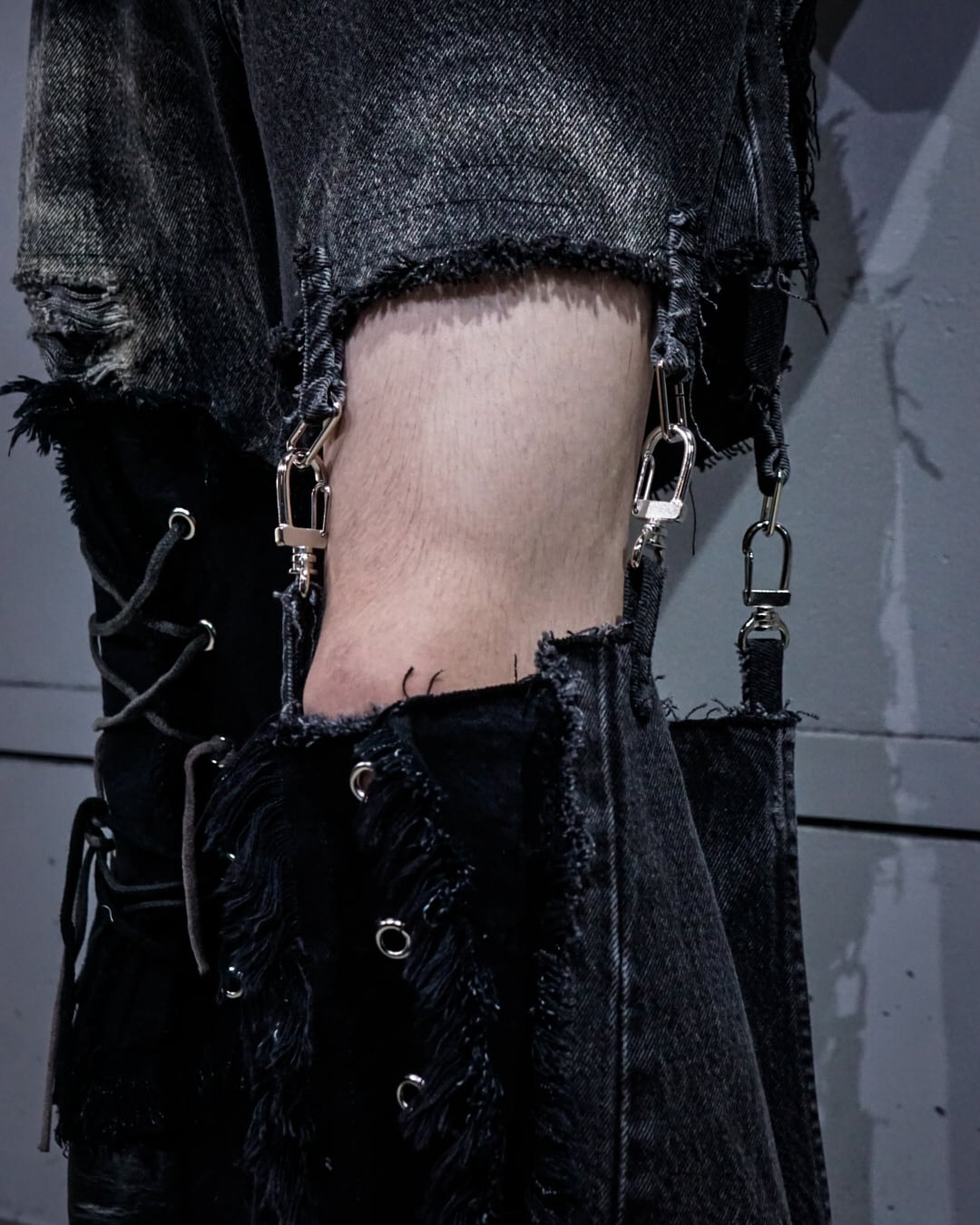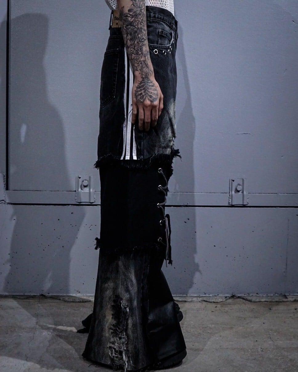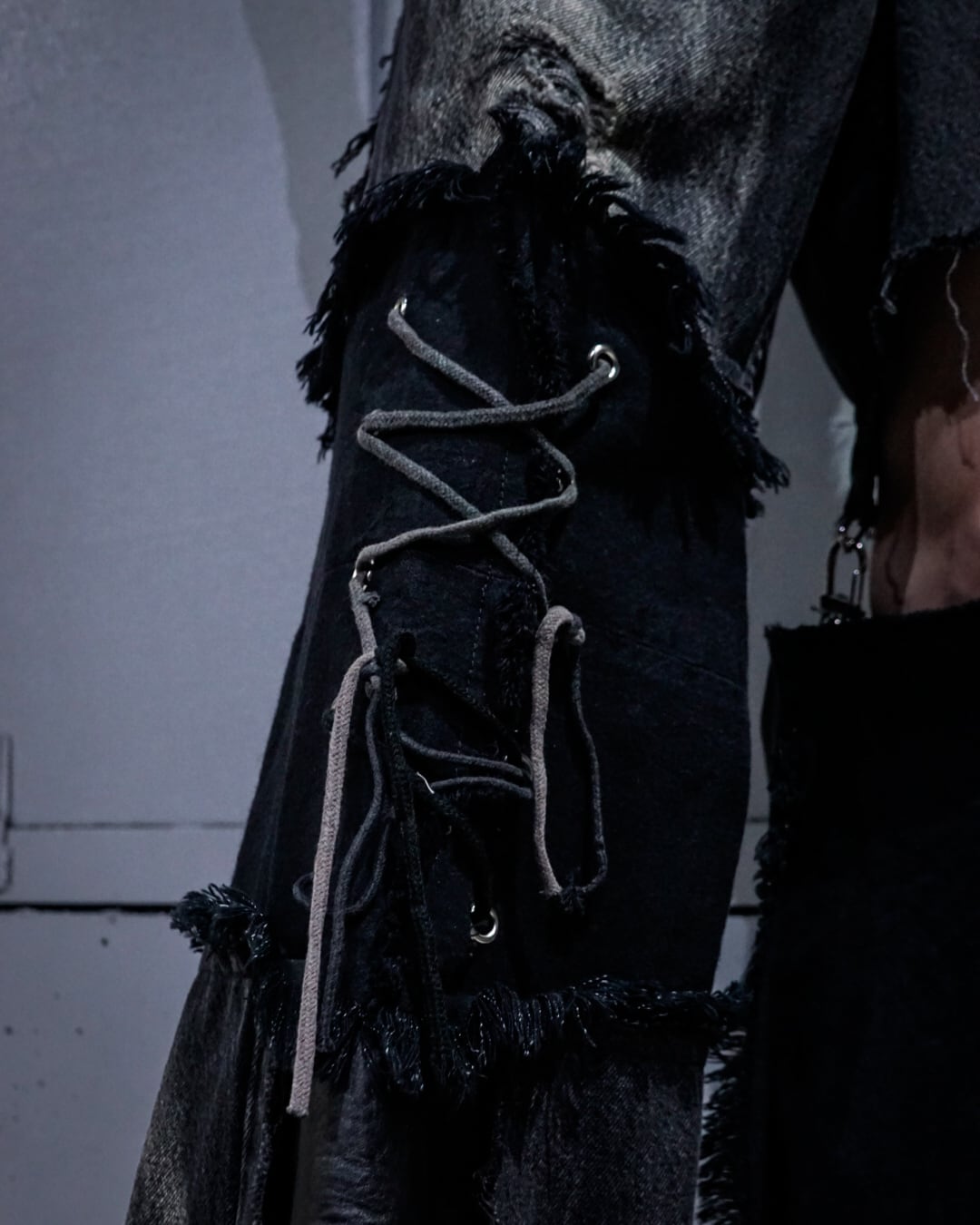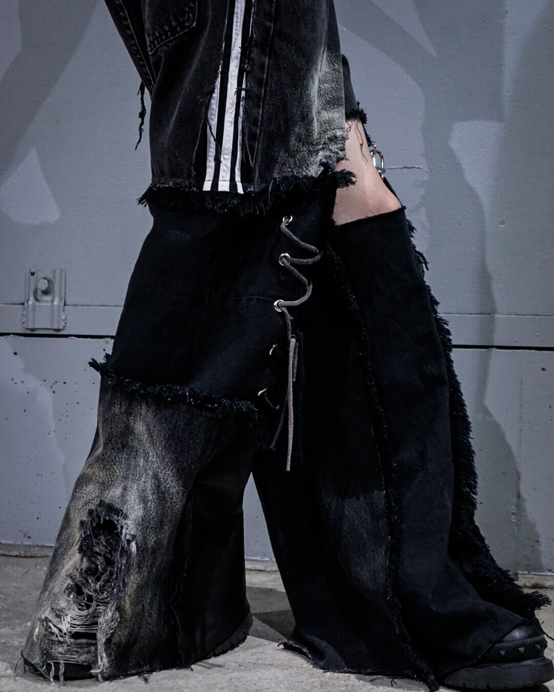 色残りがしっかりとあるブラックのデニムを切り替え、外縫い代にした部分をほどきフリンジにデザイン。右足部分にはレースアップを施し、ギュッと絞る事でシルエットにメリハリをつける事ができます。