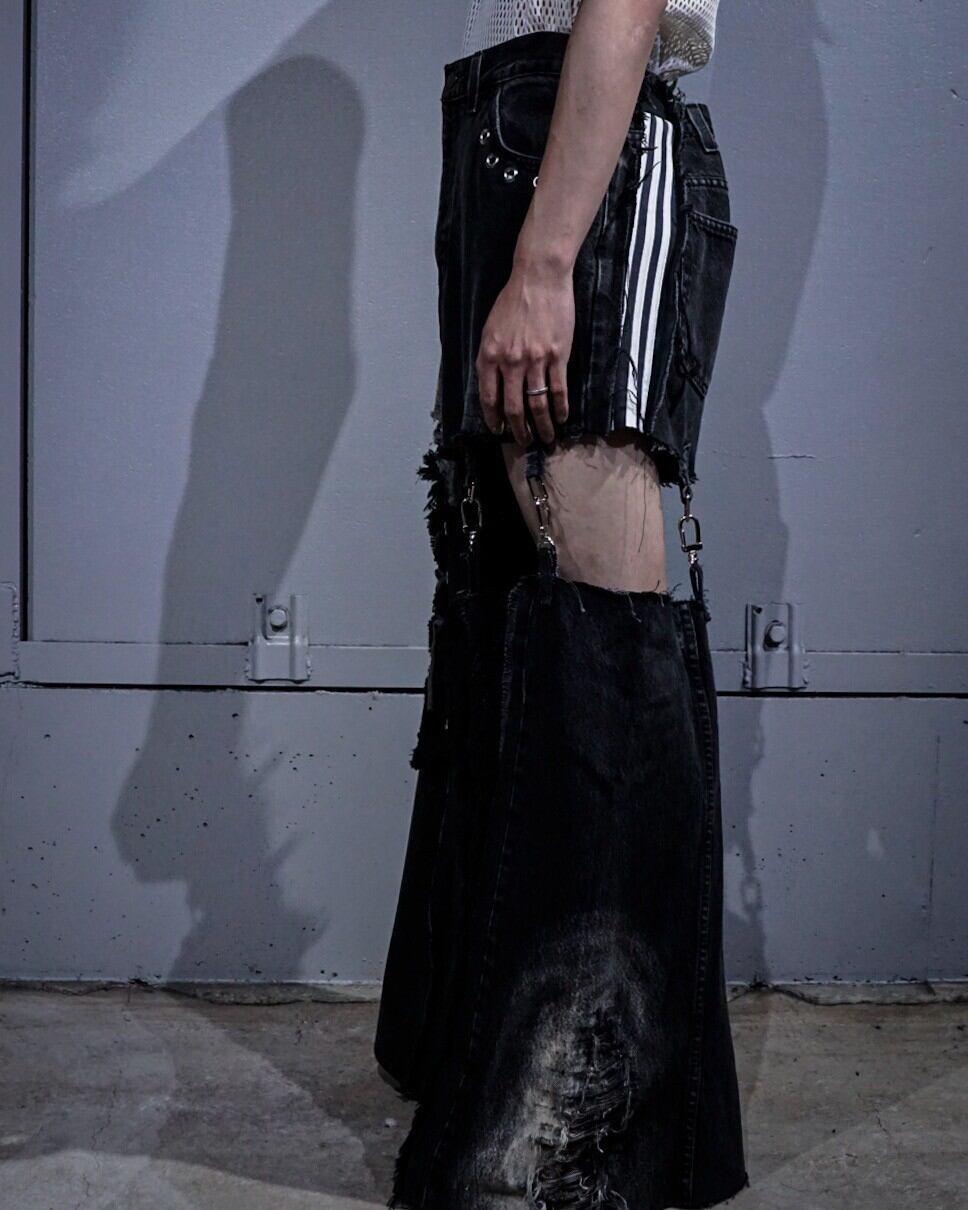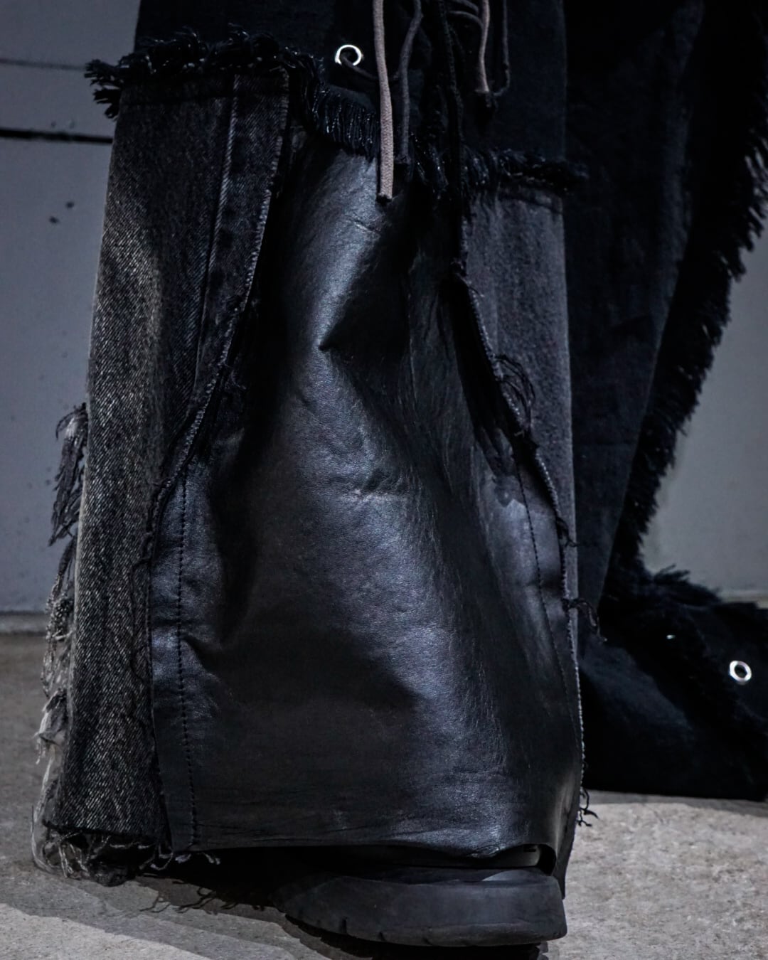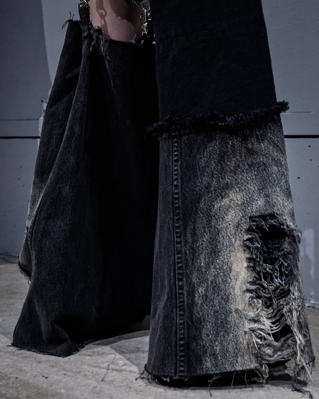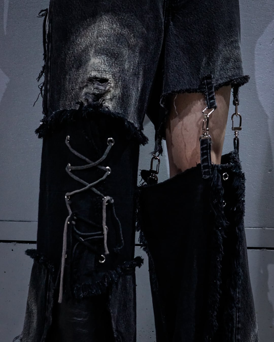 色残りがしっかりとあるブラックのデニムを切り替え、外縫い代にした部分をほどきフリンジにデザイン。右足部分にはレースアップを施し、ギュッと絞る事でシルエットにメリハリをつける事ができます。