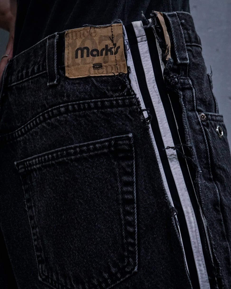 当店が誇る"Original Remake"シリーズより、ブリーチでデザインを施したフェードブラックのボディに、様々なテキスタイルをドッキングしたパンツをご紹介致します。